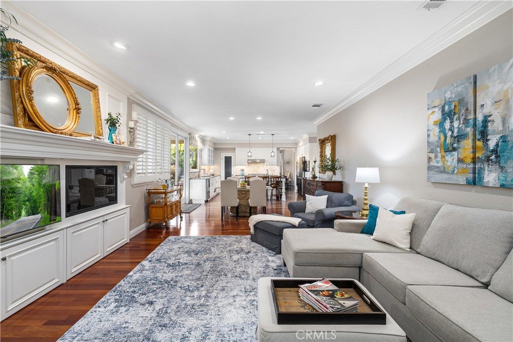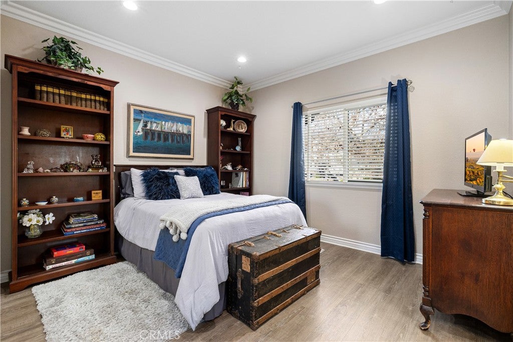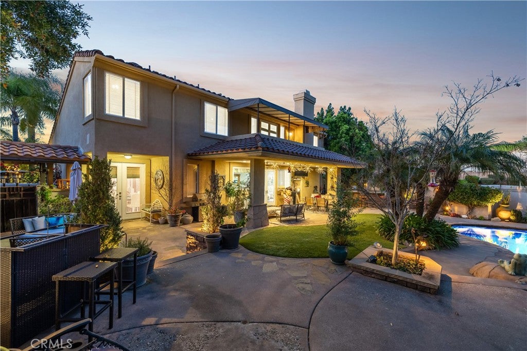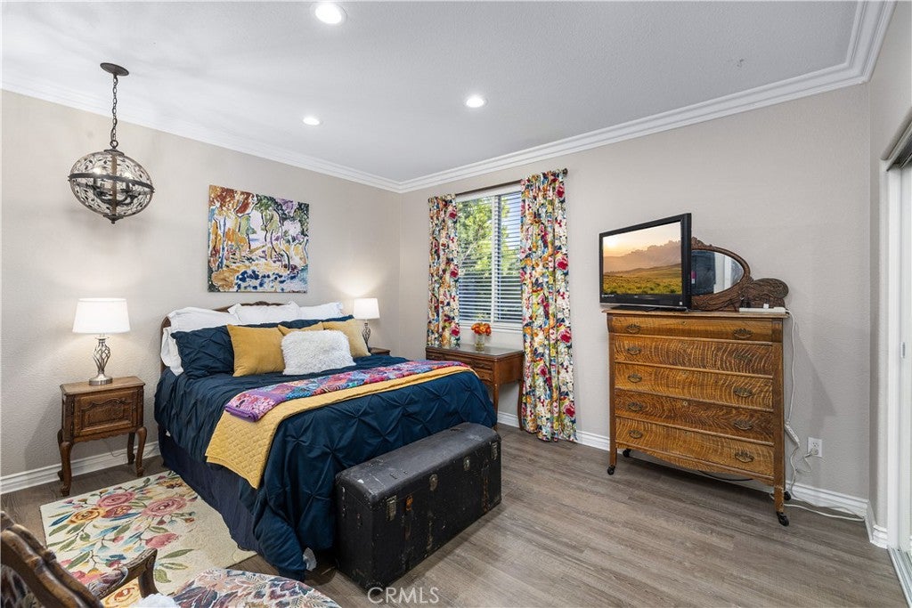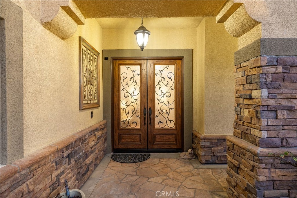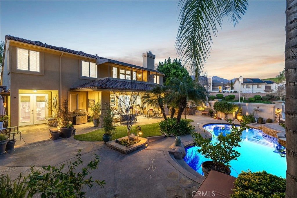 Positioned at the end of a cul-de-sac within the gated La Verne Heights community, this expansive residence blends architectural scale, refined detailing, and resort-inspired outdoor living. A four-car garage, dedicated RV parking, and approx. ten additional uncovered parking spaces provide exceptional flexibility. An artificial turf front lawn and a walkway lead through manicured landscaping with a fountain, and to a private front courtyard. The covered entry is framed by stone columns and double wood doors with iron and glass inlays. Inside, a two-story foyer showcases soaring ceilings, a chandelier, rich hardwood flooring, and a staircase with wood handrails and iron balusters. The formal living room features vaulted ceilings and a large window overlooking the front yard. The adjacent dining room offers crown molding, French doors to the backyard, and direct access to the kitchen. The remodeled kitchen is appointed with classic white cabinetry, granite countertops with full tile backsplash, stainless steel appliances, a center island with pendant lighting and seating, a walk-in pantry, a breakfast nook and a corner butlers pantry. The family room includes LED lighting, crown molding, an elevated fireplace with custom carpentry detail, plantation shutters, and French doors providing backyard access. A downstairs bedroom, currently used as an office with double doors, offers direct access to the guest bathroom. The laundry room features cabinetry, a folding counter, utility sink, and garage access. Upstairs, a large bonus room offers vaulted ceilings, LVP flooring, and mountain views. The primary suite features French doors to a private view balcony and a two-sided fireplace shared with a retreat. The primary bath is separated by a barn door and includes dual sinks, a vanity counter, a custom tiled shower with frameless glass enclosure, a separate soaking tub, and two walk-in closets. Two secondary bedrooms share a remodeled Jack-and-Jill bathroom, while a third bedroom has direct access to an additional bath that also serves the loft. The private backyard is designed for entertaining, featuring a pool and spa with custom stone and tile work, a spa with an elevated spillway, a spanning covered patio with tongue-and-groove ceiling and recessed lighting, a built-in BBQ with seating and stone finish, an outdoor fireplace with matching stone, concrete decking with stone inlay, mature perimeter landscaping, turf, lighting, privacy hedges, and stucco walls.