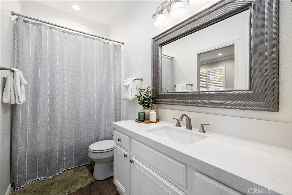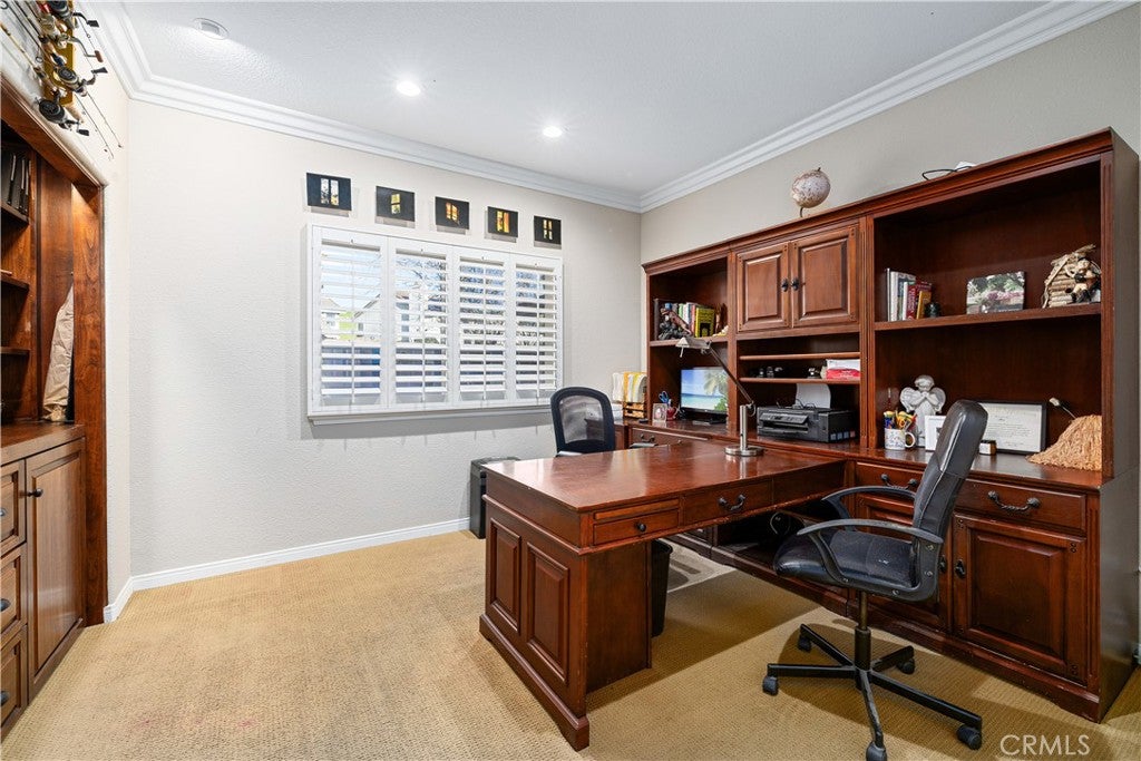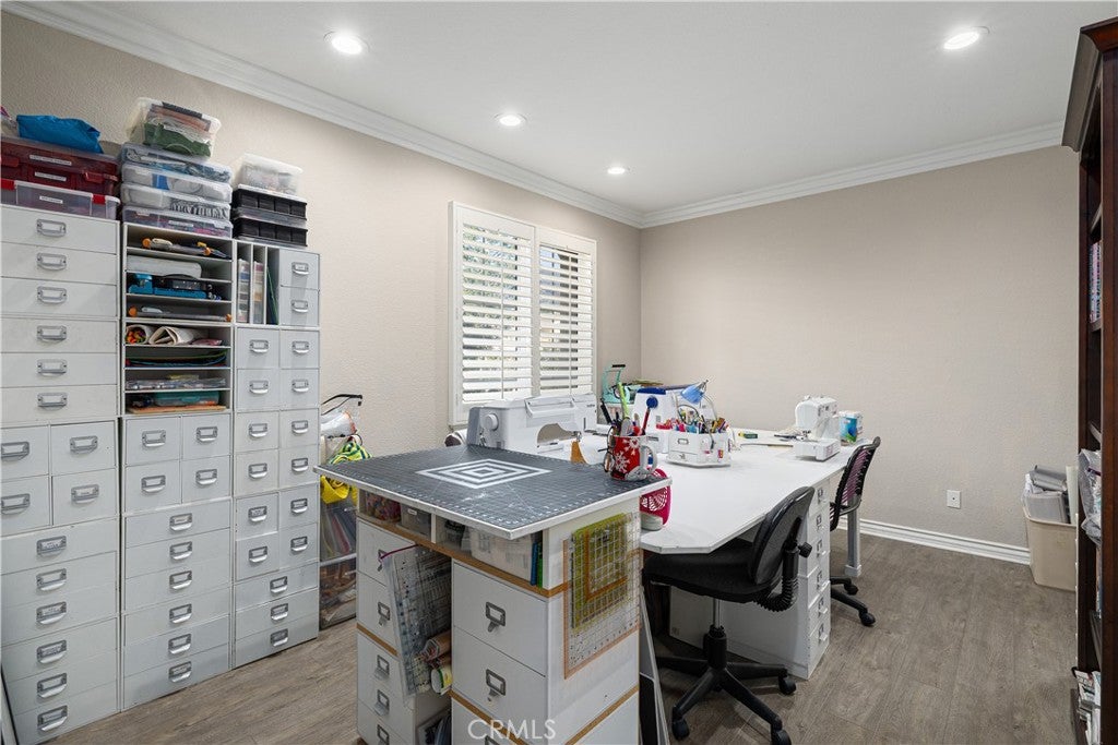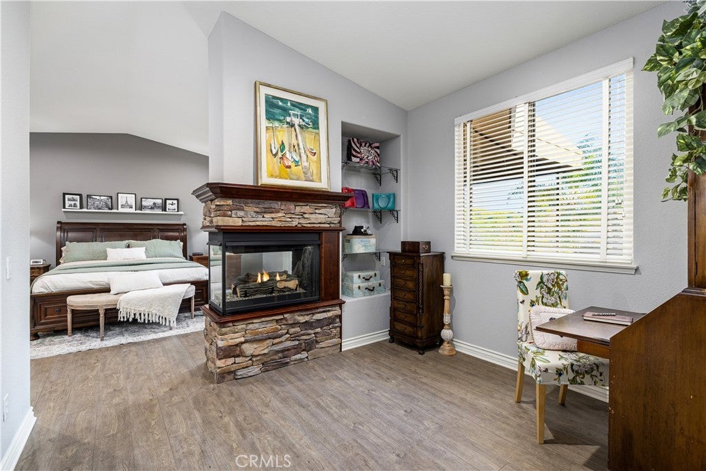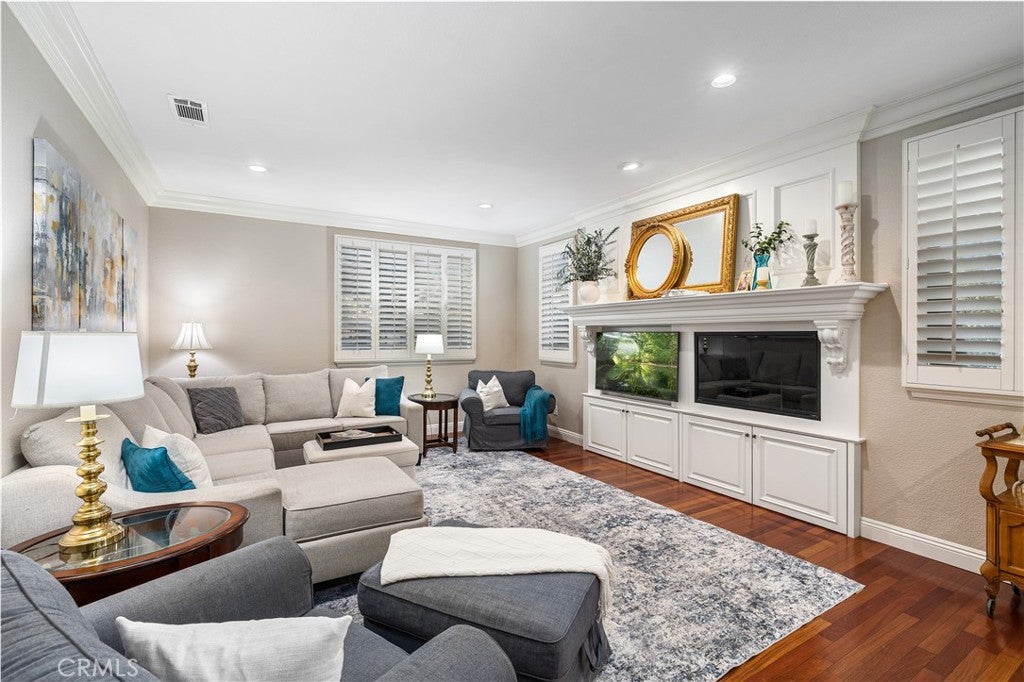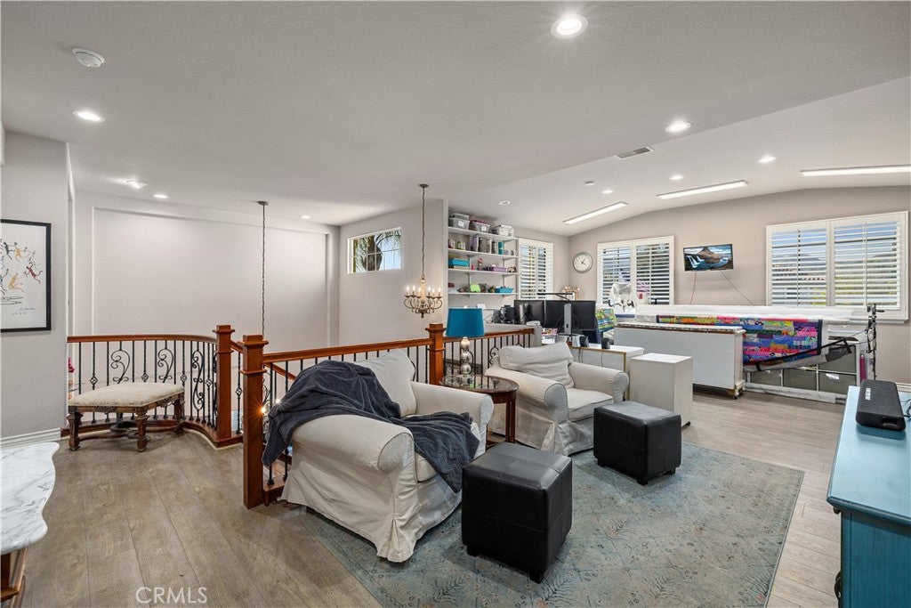 Positioned at the end of a cul-de-sac within the gated La Verne Heights community, this expansive residence blends architectural scale, refined detailing, and resort-inspired outdoor living. A four-car garage, dedicated RV parking, and approx. ten additional uncovered parking spaces provide exceptional flexibility. An artificial turf front lawn and a walkway lead through manicured landscaping with a fountain, and to a private front courtyard. The covered entry is framed by stone columns and double wood doors with iron and glass inlays. Inside, a two-story foyer showcases soaring ceilings, a chandelier, rich hardwood flooring, and a staircase with wood handrails and iron balusters. The formal living room features vaulted ceilings and a large window overlooking the front yard. The adjacent dining room offers crown molding, French doors to the backyard, and direct access to the kitchen. The remodeled kitchen is appointed with classic white cabinetry, granite countertops with full tile backsplash, stainless steel appliances, a center island with pendant lighting and seating, a walk-in pantry, a breakfast nook and a corner butlers pantry. The family room includes LED lighting, crown molding, an elevated fireplace with custom carpentry detail, plantation shutters, and French doors providing backyard access. A downstairs bedroom, currently used as an office with double doors, offers direct access to the guest bathroom. The laundry room features cabinetry, a folding counter, utility sink, and garage access. Upstairs, a large bonus room offers vaulted ceilings, LVP flooring, and mountain views. The primary suite features French doors to a private view balcony and a two-sided fireplace shared with a retreat. The primary bath is separated by a barn door and includes dual sinks, a vanity counter, a custom tiled shower with frameless glass enclosure, a separate soaking tub, and two walk-in closets. Two secondary bedrooms share a remodeled Jack-and-Jill bathroom, while a third bedroom has direct access to an additional bath that also serves the loft. The private backyard is designed for entertaining, featuring a pool and spa with custom stone and tile work, a spa with an elevated spillway, a spanning covered patio with tongue-and-groove ceiling and recessed lighting, a built-in BBQ with seating and stone finish, an outdoor fireplace with matching stone, concrete decking with stone inlay, mature perimeter landscaping, turf, lighting, privacy hedges, and stucco walls.