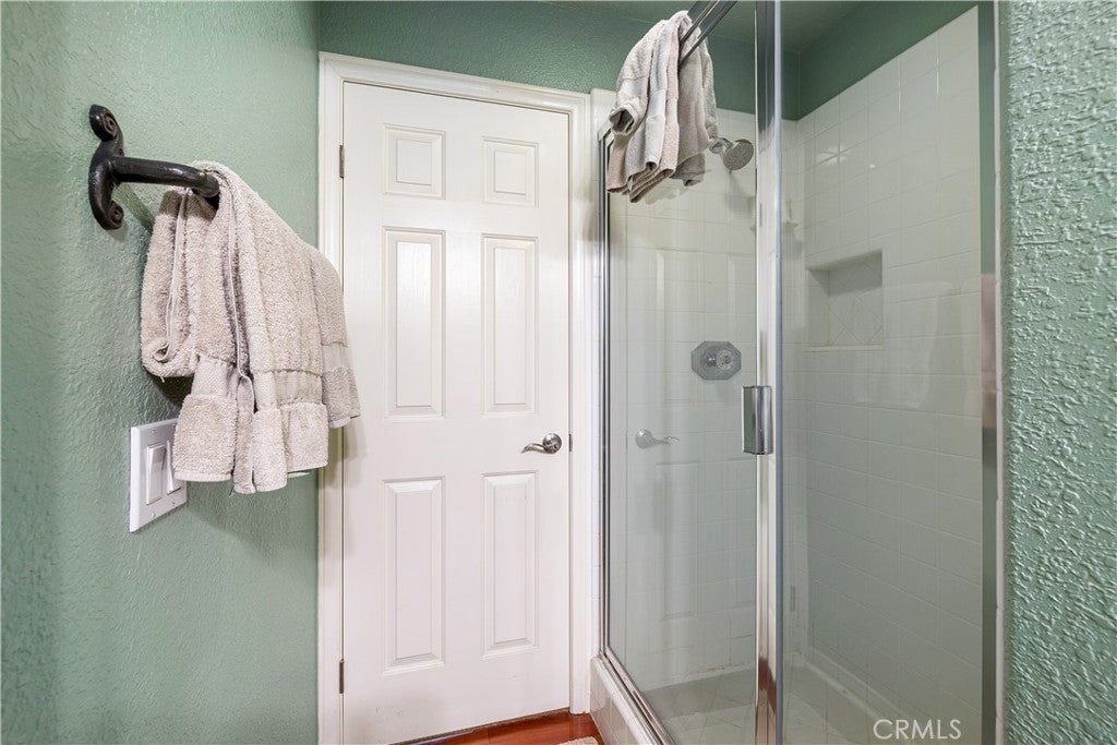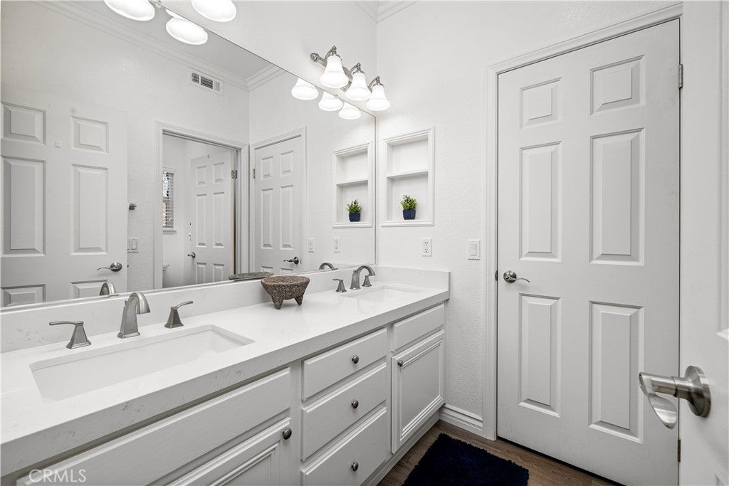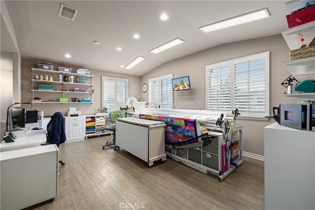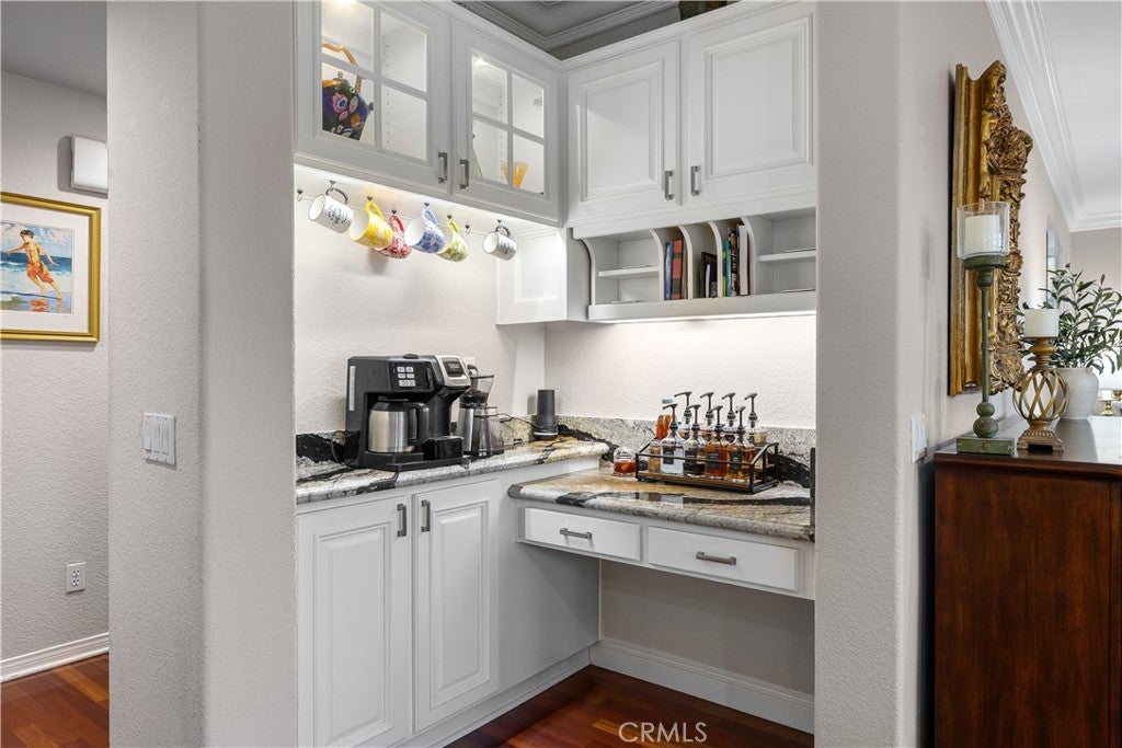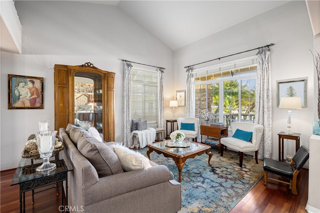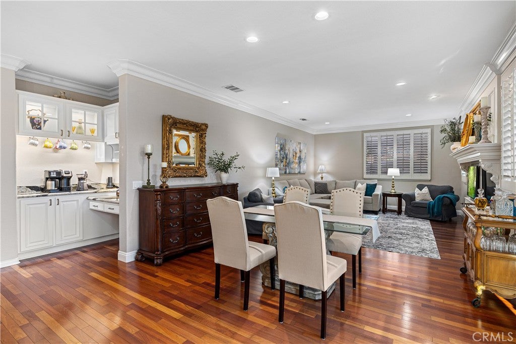 Positioned at the end of a cul-de-sac within the gated La Verne Heights community, this expansive residence blends architectural scale, refined detailing, and resort-inspired outdoor living. A four-car garage, dedicated RV parking, and approx. ten additional uncovered parking spaces provide exceptional flexibility. An artificial turf front lawn and a walkway lead through manicured landscaping with a fountain, and to a private front courtyard. The covered entry is framed by stone columns and double wood doors with iron and glass inlays. Inside, a two-story foyer showcases soaring ceilings, a chandelier, rich hardwood flooring, and a staircase with wood handrails and iron balusters. The formal living room features vaulted ceilings and a large window overlooking the front yard. The adjacent dining room offers crown molding, French doors to the backyard, and direct access to the kitchen. The remodeled kitchen is appointed with classic white cabinetry, granite countertops with full tile backsplash, stainless steel appliances, a center island with pendant lighting and seating, a walk-in pantry, a breakfast nook and a corner butlers pantry. The family room includes LED lighting, crown molding, an elevated fireplace with custom carpentry detail, plantation shutters, and French doors providing backyard access. A downstairs bedroom, currently used as an office with double doors, offers direct access to the guest bathroom. The laundry room features cabinetry, a folding counter, utility sink, and garage access. Upstairs, a large bonus room offers vaulted ceilings, LVP flooring, and mountain views. The primary suite features French doors to a private view balcony and a two-sided fireplace shared with a retreat. The primary bath is separated by a barn door and includes dual sinks, a vanity counter, a custom tiled shower with frameless glass enclosure, a separate soaking tub, and two walk-in closets. Two secondary bedrooms share a remodeled Jack-and-Jill bathroom, while a third bedroom has direct access to an additional bath that also serves the loft. The private backyard is designed for entertaining, featuring a pool and spa with custom stone and tile work, a spa with an elevated spillway, a spanning covered patio with tongue-and-groove ceiling and recessed lighting, a built-in BBQ with seating and stone finish, an outdoor fireplace with matching stone, concrete decking with stone inlay, mature perimeter landscaping, turf, lighting, privacy hedges, and stucco walls.