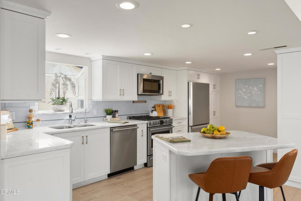 Welcome to Mandalay Shores, a beautifully remodeled coastal home with ocean views just steps from the sand. Designed for the ultimate Oxnard beach lifestyle, the home offers multiple decks for relaxing or entertaining while enjoying the spectacular sunsets that make this community so special.The first level is designed for flexible living and features two bedrooms, an updated bathroom, and a secondary kitchenette with living space -- ideal for guests, multi-generational living, entertaining, or even a private movie room.Upstairs, the primary suite offers a private balcony, walk-in closet, and a beautifully remodeled Carrara marble bathroom. The family room features a gas fireplace, built-in storage, and a deck with ocean views, creating the perfect space for sunset gatherings or quiet mornings by the sea.The chefs kitchen showcases all-new appliances, Carrara marble countertops, a center island, and thoughtful design that opens to the living room, family room, and oversized dining area, creating seamless indoor-outdoor flow for everyday living and entertaining.Recent upgrades include new flooring throughout, recessed lighting, ceiling fans, tankless water heater, mini-split HVAC system, upgraded electrical panel, and a new roof.Outside, the landscaped front and side yards provide space for outdoor dining, entertaining, or adding a spa, while the two-car garage offers convenience and additional storage.Located near Channel Islands Harbor, the home provides easy access to boating, kayaking, paddleboarding, golf, shopping, and local dining. Here, coastal charm, modern comfort, and Ventura Countys natural beauty come together to create a true beach retreat.