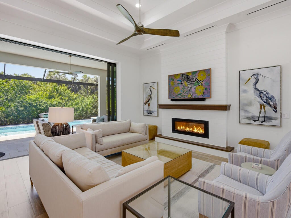 Gorgeous, custom built home (2024) features luxurious finishes throughout and a prime location near Tigertail Beach. This magnificent home boasts 4 bedrooms, 3 baths, 3 car garage, and an extended lanai. The main living space offers a desirable open floor plan with tile flooring throughout and ample natural light. The living room provides a relaxing coastal atmosphere with shiplap wall detail and fireplace. The spacious kitchen is complete with a large center island, beautiful tile backsplash, white cabinetry, gas cooktop, and walk-in pantry. The master suite is a private oasis with access to the lanai, walk-in closet, and spa-like ensuite bath with double vanities, walk-in shower, and free standing soaking tub. The three additional guest bedrooms provide ample space for family and friends. The interior of the home opens seamlessly to the large, extended lanai boasting pool, spa, firepit water fountain feature, panoramic screen cage, and summer kitchen. The lanai offers plenty of space to relax poolside or enjoy a meal alfresco in the beautiful Southwest Florida weather. This stunning home is located only a short stroll away from the entrance to Tigertail Beach, have your toes in the sand within minutes of leaving your front door. Do not hesitate to make this phenomenal home your coastal island oasis.