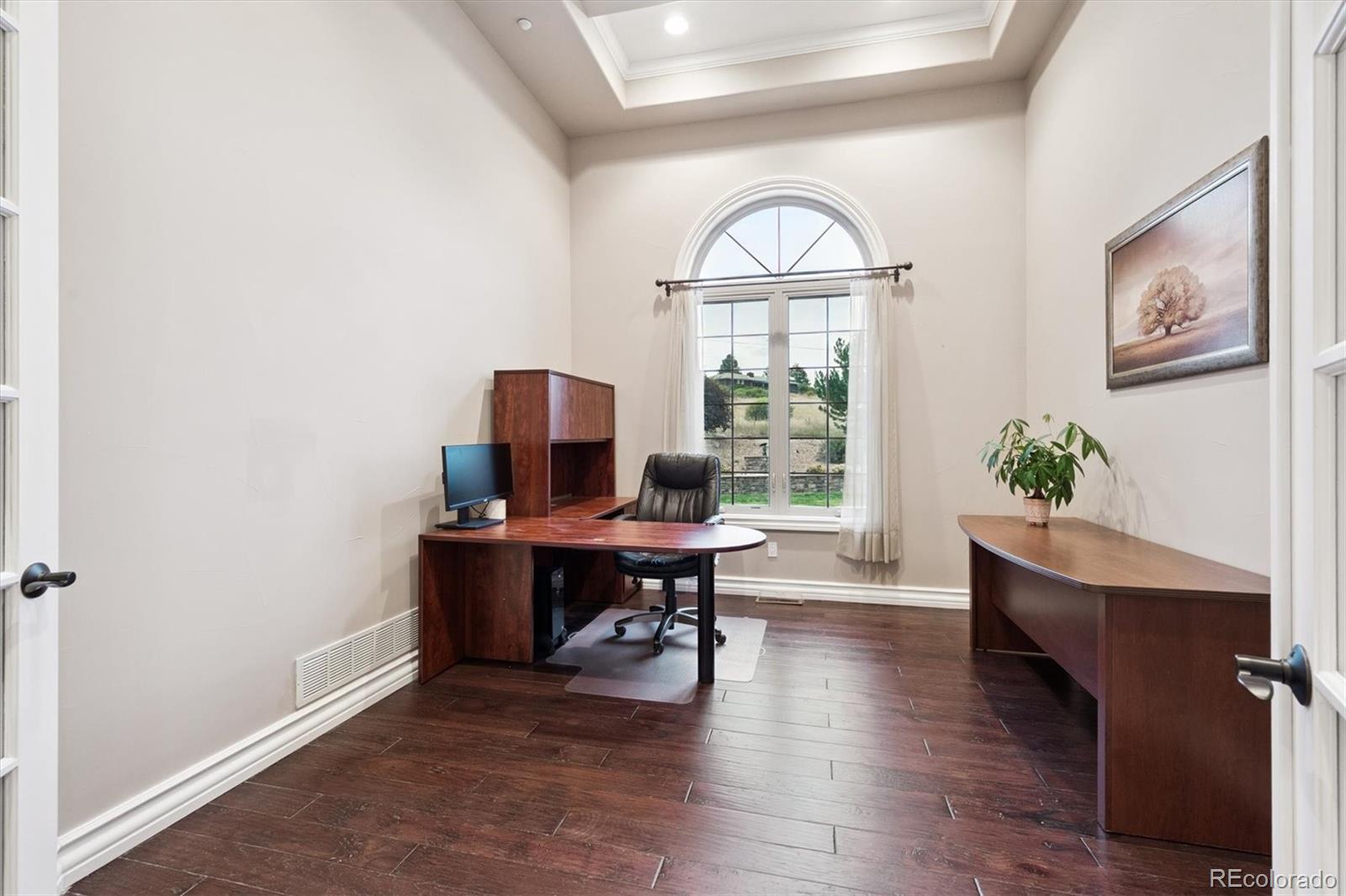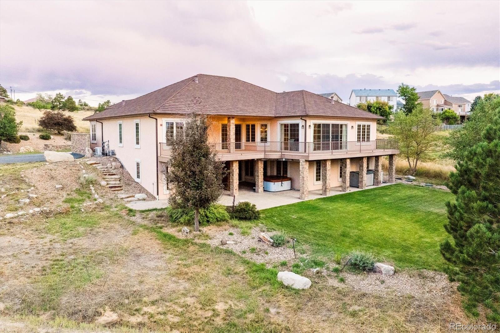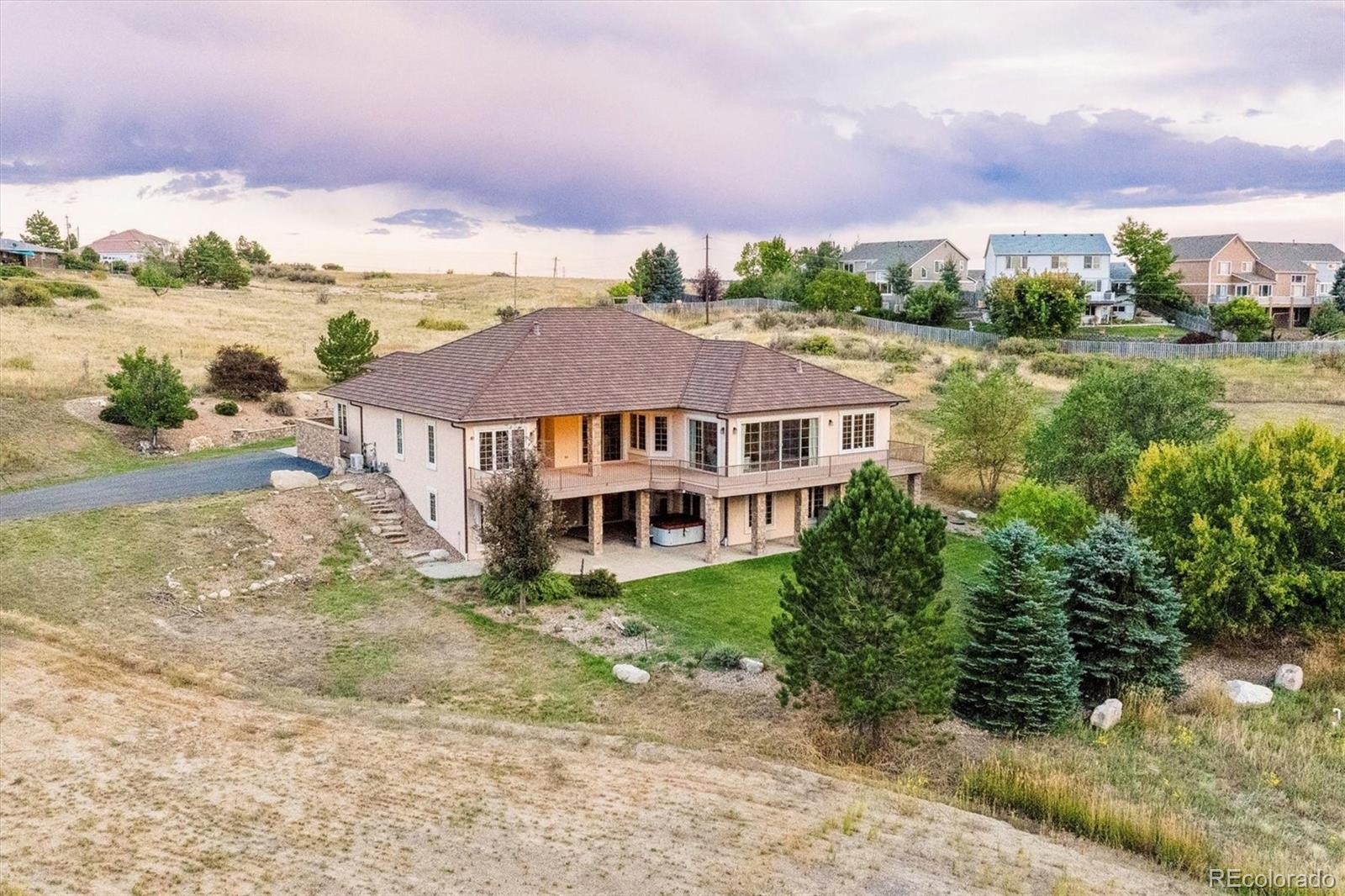 Welcome home to serene country living situated on nearly 5.5 acres with breathtaking mountain views and the best part is that the property is only a mile from Downtown Parker! A private, quarter-mile drive arrives at 7372 Talon Trail; a sprawling ranch residence defined by intentional design, seamless flow, and refined finishes throughout. A newer steel-coated roof and professional landscaping greet you from outside and unfold to 12 ceilings with coffered detail, tile-inlay hardwood floors, and over 6,800 sqft of functional living and entertaining space. The main level features formal living and dining spaces, a spacious family room anchored by a dual-sided gas fireplace, and a well-appointed kitchen with granite countertops, a stainless-steel GE Monogram appliance package, a center island, and custom cabinetry. Retreat to the main-level primary suite, complete with deck access, a private sitting area, dual walk-in closets, and a spa-like 5-piece bath. Step outside to a sizable composite deck to take in sunset and mountain views. The finished lower level is an entertainers dream, featuring a spacious recreation room, a sleek wet bar, a game area, and a state-of-the-art home theater with a projector and tiered seating. A secluded guest suite or mother-in-law suite rounds out the lower level and offers easy access to the outdoors. Step outside to the stamped concrete patio to relax under the stars in the hot tub while overlooking mature professional landscaping. Additional features of this turnkey residence include a designated home office, a private well and septic, newer dual furnaces, upgraded Daikin AC, and a 4-car finished garage with epoxy flooring and integrated LED lighting. Just minutes from Downtown Parkers extensive dining, shopping, and entertainment, along with award-winning Douglas County Schools, this location offers the perfect balance of convenience and country living.