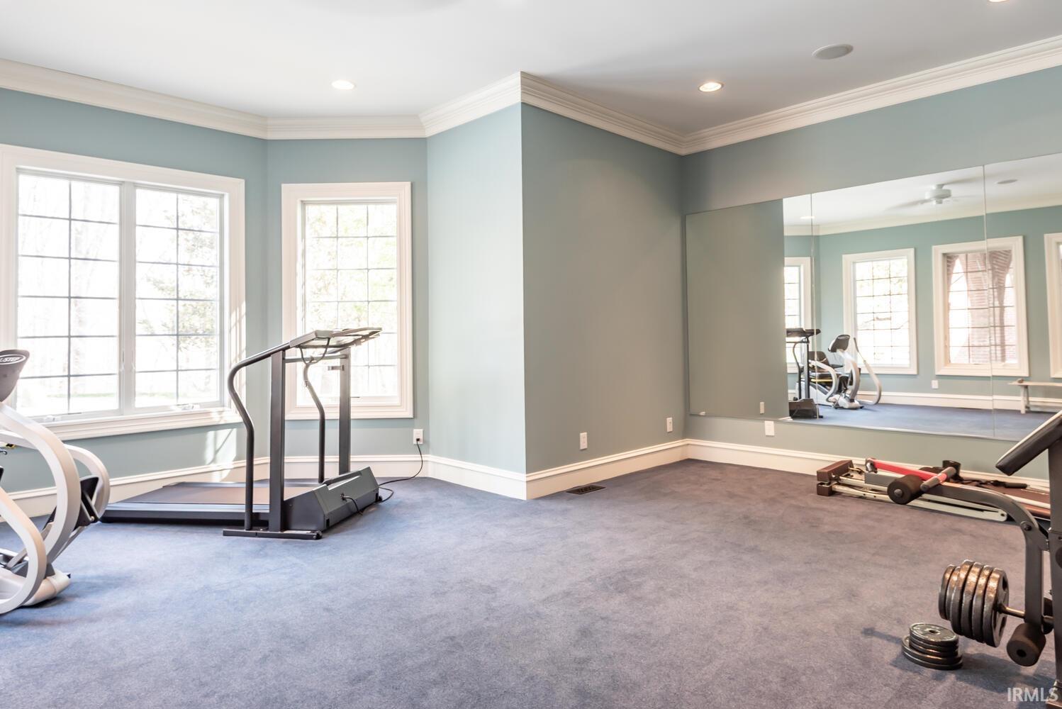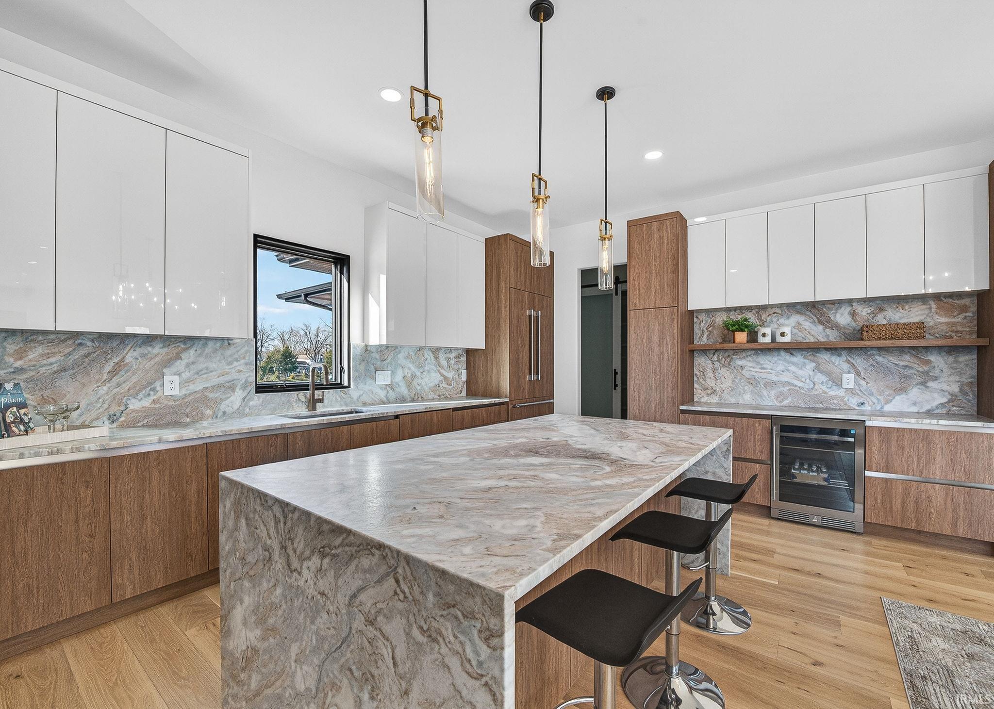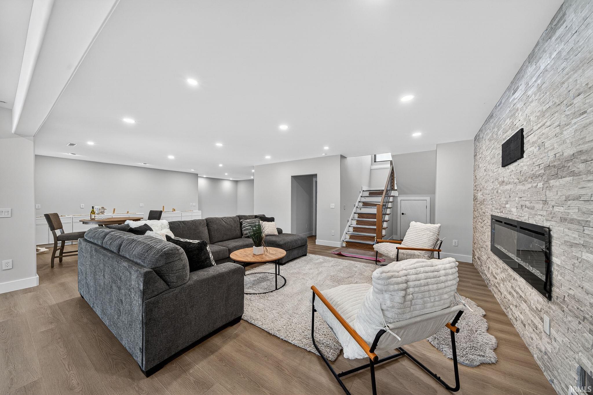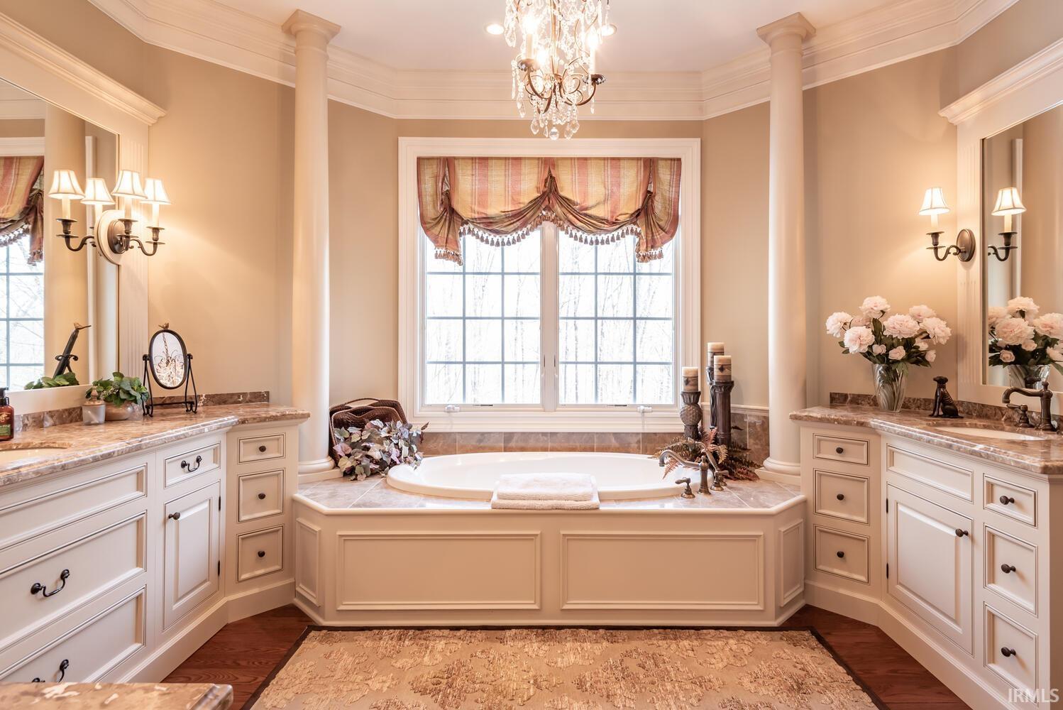 Experience timeless elegance and unparalleled craftsmanship in this all-brick estate, ideally located situated on a quiet cul-de-sac in Sterling Woods. Set on 8 secluded, wooded acres, this stunning home is designed for both grand entertaining and everyday comfort. Features include soaring 2-story ceilings, a 9 ceiling height minimum throughout, finely crafted detailed woodwork throughout (craftmanship seldom seen in homes of this era), white oak floors, 3 fireplaces, & rich architectural details like fluted door jambs, wainscoting, and custom cabinetry by Ferree. The heart of the home is a gourmet kitchen with mahogany cabinetry, Viking appliances, a copper prep sink, double ovens, pot filler, butlers pantry, and walk-in pantryall open to an inviting breakfast nook. Natural light floods the home through large Andersen windows framing serene wooded views, a rear veranda the width of the house, and overlooking the pool and recreation area. The main-level owners suite is a true retreat with lounge space, a coffee bar, two walk-in closets, luxurious spa-style bath, and veranda access. Upstairs features three large bedroom suites, a second laundry, and a spacious recreation room. The walkout lower level boasts a beautiful custom bar, billiards area, family room, fitness center, and flex space perfect for a guest suite. The gathering and recreation area is accented with a full interior brick wall and opens directly to the covered patio and beautiful pool area. Additional highlights include an authentic curved staircase, back staircase, integrated sound system, oversized three-car garage, an additional equipment garage for pool and lawn equipment, and a 50-year roof. Manicured landscaping, mature woods, and a park-like setting complete this exquisite property a rare opportunity to own one of Bloomingtons finest homes.