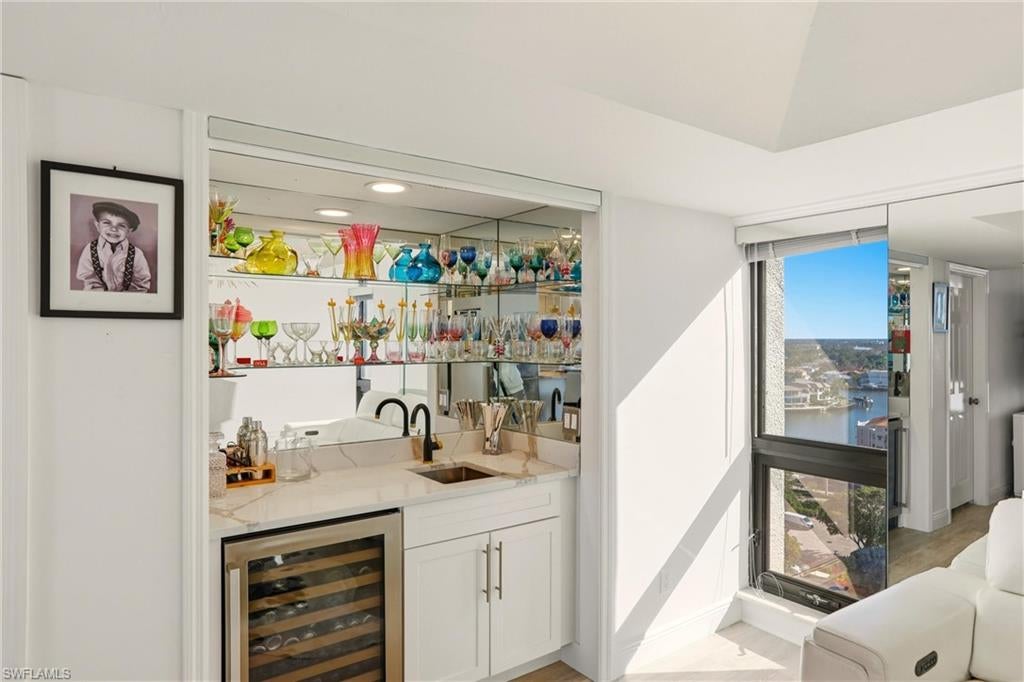 Experience the pinnacle of Gulf-front luxury in this exquisitely renovated 15th-floor residence at the esteemed Esplanade Club in Park Shore. Elevated above the shoreline with sweeping, unobstructed views of the Gulf and Venetian Bay area, this sophisticated retreat offers an extraordinary backdrop for both serene coastal living and elegant entertaining. A spacious wraparound balcony embraces the residence, capturing dazzling vistas to the west and north. Inside, natural light fills the open-concept living and dining areas, where refined finishes and thoughtful design create an atmosphere of effortless elegance. The beautifully reimagined kitchen features a waterfall quartz countertop, breakfast bar seating, a smart oven with electric cooktop and built-in air fryer. A wine refrigerator, and a stylish barperfect for hosting with ease enhance the living area. Designer touches throughout the home elevate every detail.The tranquil primary suite offers a walk-in closet and dual vanities, while the private guest suite includes its own full bath. Both bedrooms open directly to the balcony, ensuring breathtaking water views from sunrise to sunset. Additional enhancements include impact-rated windows and doors, in-residence laundry, a leak detection system, private storage, and a dedicated covered parking space.Residents of the Esplanade Club enjoy an exceptional array of resort-style amenities: a 24-hour front desk attendant, electric vehicle charging, bicycle, kayak and paddleboard storage, a beautifully updated social room with catering kitchen, a fitness center, and a stunning beachside pool and spa with an expansive sun deck. Outdoor gathering spaces include a fireplace lounge, gas grilling area, and a rooftop sports deck offering pickleball, tennis, bocce, shuffleboard, and a golf chipping net. The pet-friendly community even features its own dog park, enhancing its warm and active coastal lifestyle.Perfectly positioned just steps from the boutiques and waterfront dining of Venetian Village and minutes from Fifth Avenue South, ArtisNaples, Naples Botanical Garden, the Naples Zoo, Mercato, Waterside Shops, and countless family-friendly attractions, this residence embodies the very best of Naples beachfront living.