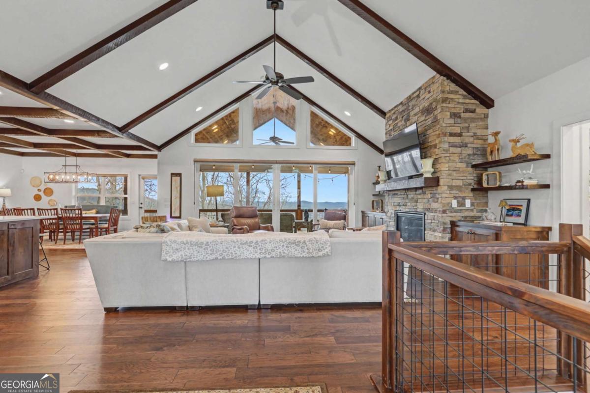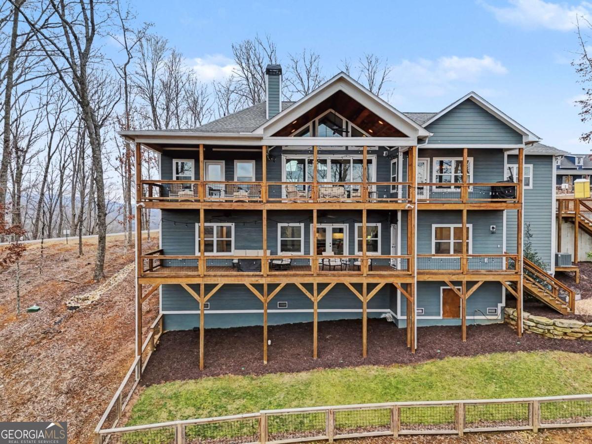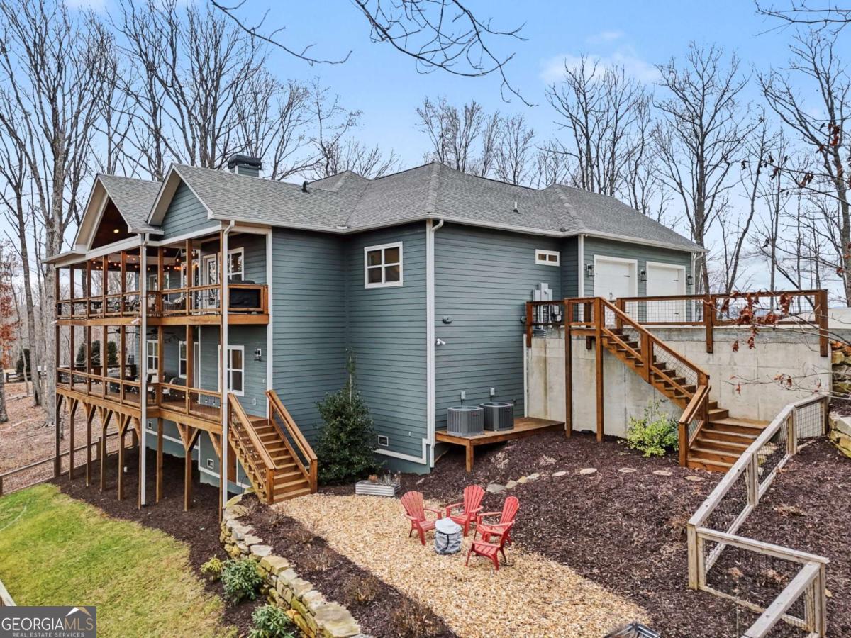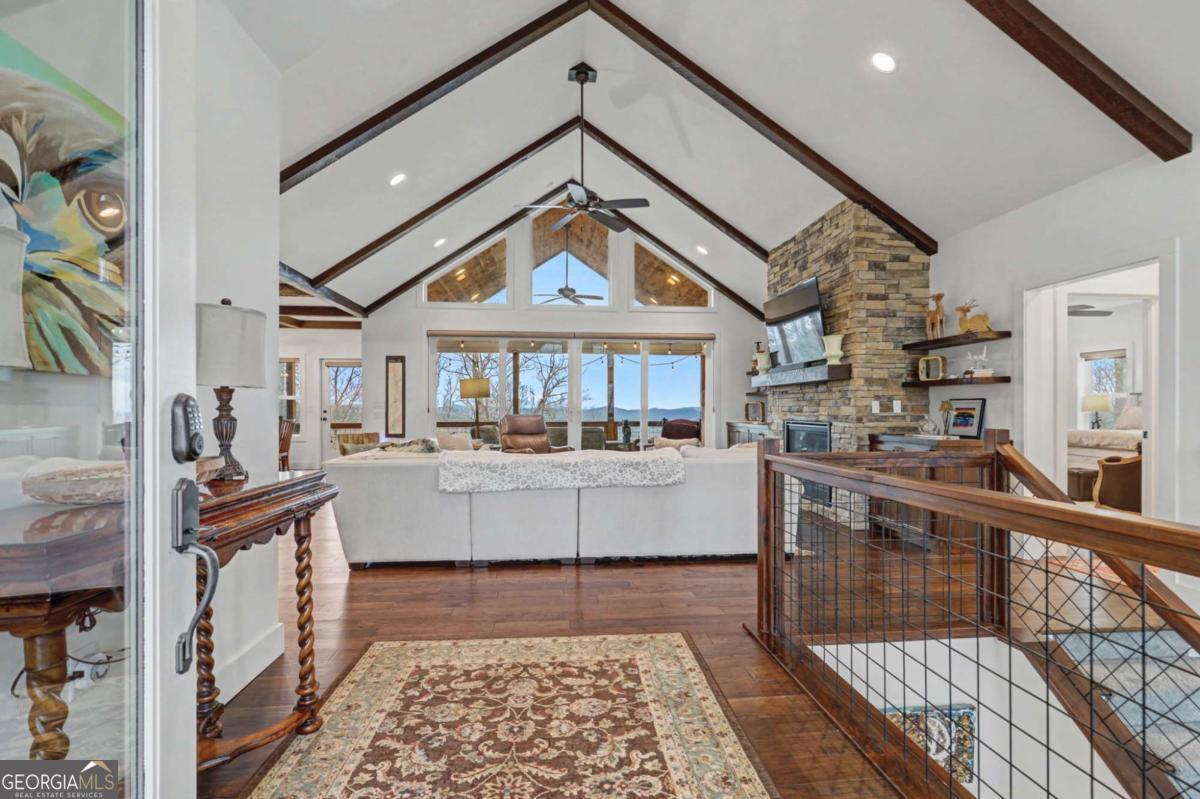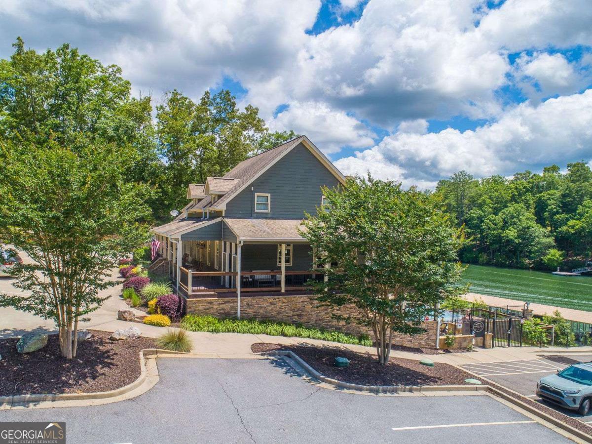 Welcome to refined mountain and lake living in the prestigious Crown Point enclave of Highland Park, complete with a deeded boat slip with lift at the community marina on Lake Nottely. This exceptional residence blends upscale finishes, thoughtful architecture, and natural surroundings to create a true retreat or an executive home worthy of its setting. Every detail reflects comfort, quality, and timeless design, with the boat slip providing an exceptional bonus for owners who value premium care and protection for their vessel. Step inside the home to experience unparalleled craftsmanship at every turn, from the stately coffered ceilings to the expansive picture windows that capture sweeping, panoramic views from nearly every angle. Natural light fills the open living spaces, creating a warm atmosphere. The chefs kitchen features a generous center island, gas range with vent hood, and a dedicated pantry, serving as the heart of the home for entertaining or everyday living. The spacious floor plan offers 4 bedrooms and 3.5 baths, including the refined luxury of two main-level ensuite bedroom sanctuaries, with the primary suite enjoying private access to the deck. This rare configuration allows for effortless one-level living while providing comfort and privacy for guests. The finished terrace level adds versatility to the home with an additional living area, 2 bedrooms, and a full bath-ideal for a private retreat. Outdoor living is equally impressive. Covered rear porches on every level deliver outstanding, layered views of Lake Nottely and the surrounding mountains. Perfectly positioned to face west, the home captures unforgettable sunset skies that transform each evening into a private show. Residents of Highland Park enjoy a gated, amenity-rich lifestyle with a beautifully appointed clubhouse, theater room, fitness center, childrens area, and a striking infinity-edge pool overlooking the lake, all within one of Blairsvilles most sought-after gated communities.