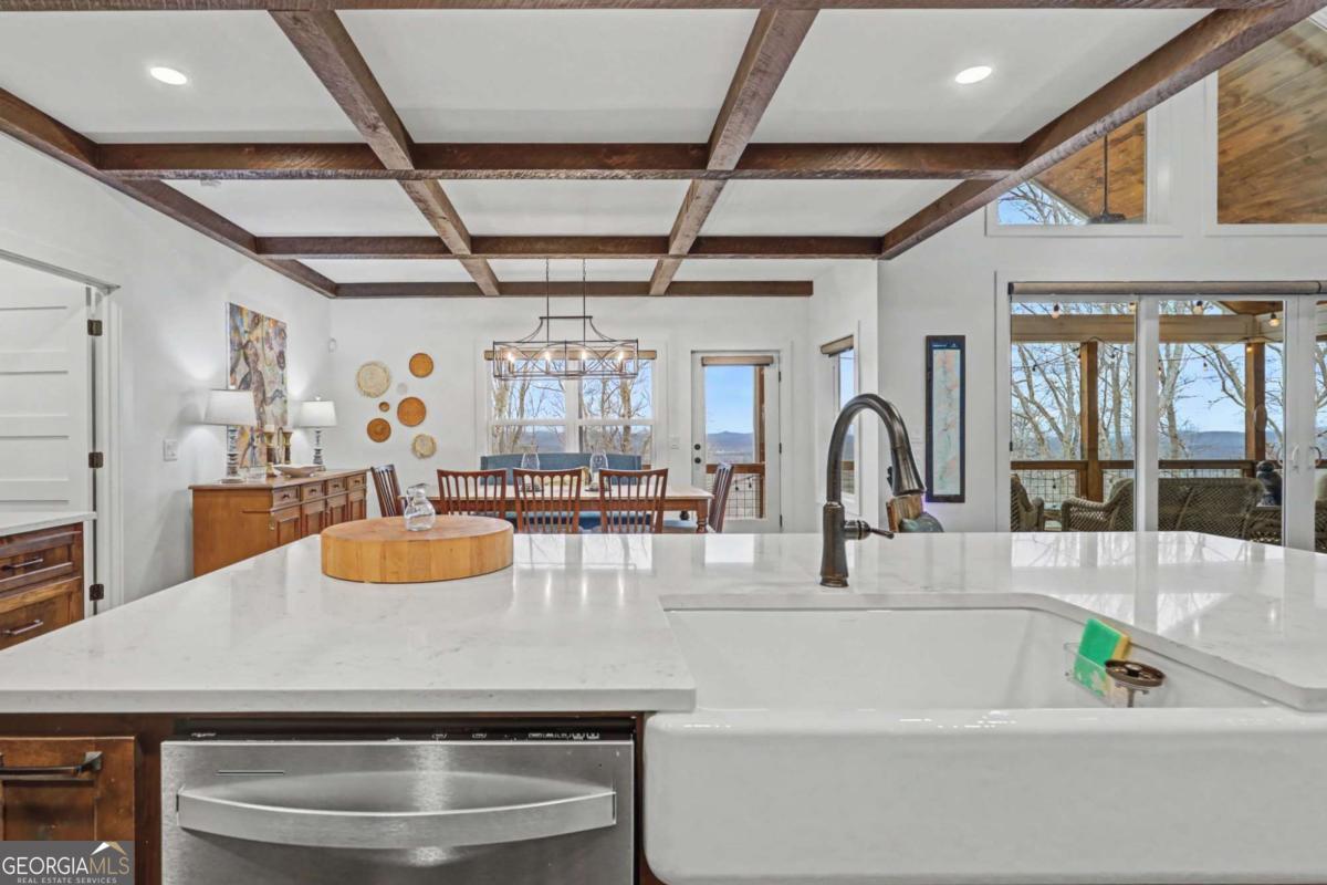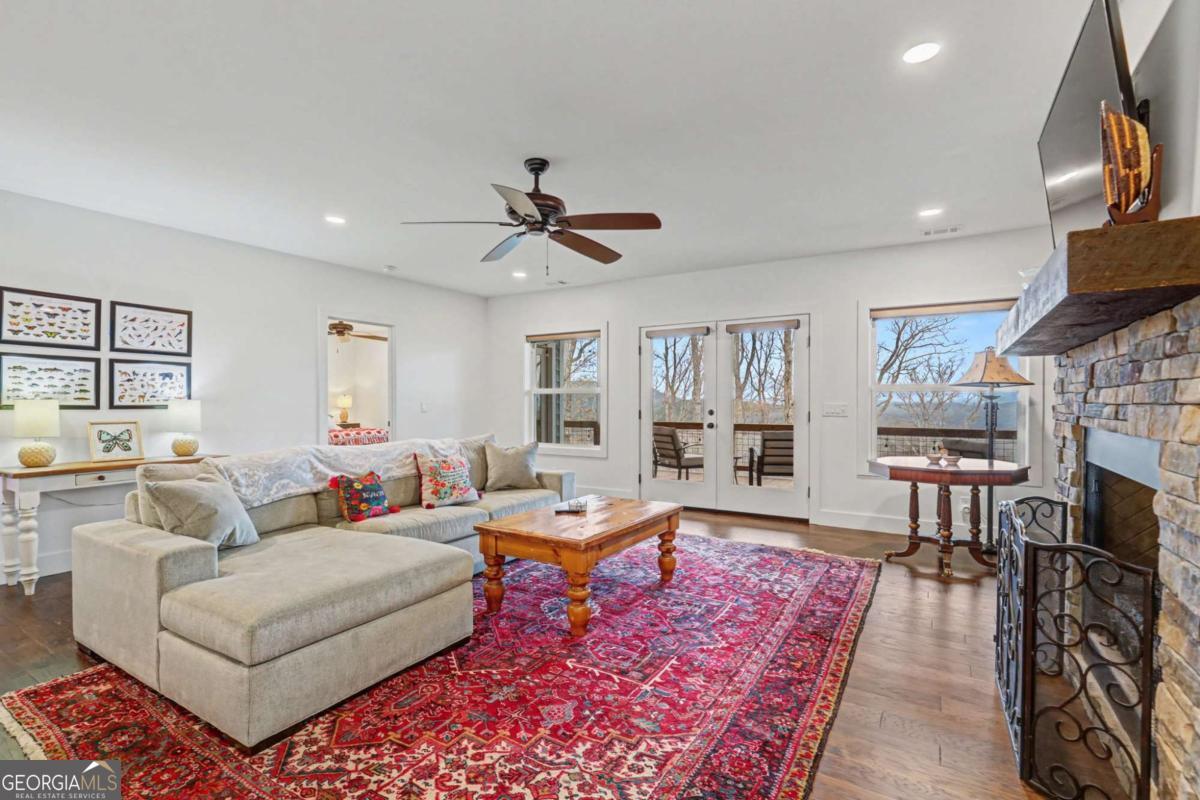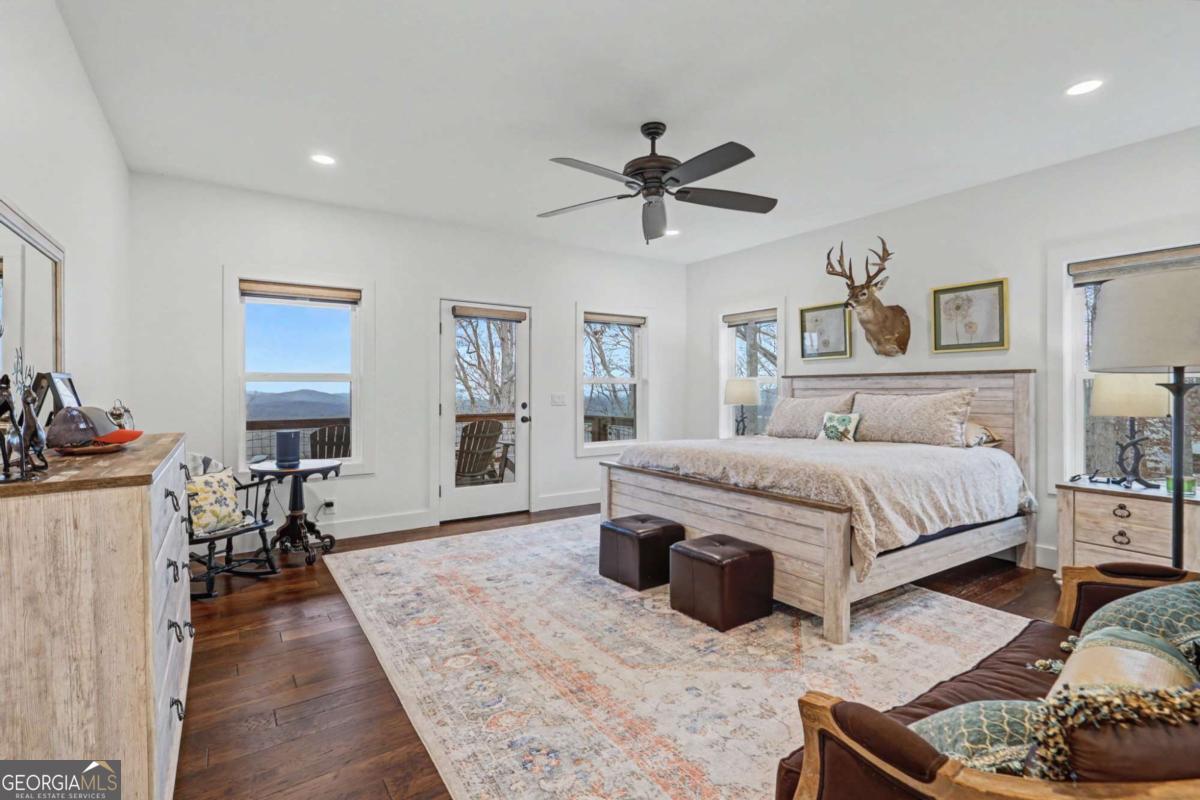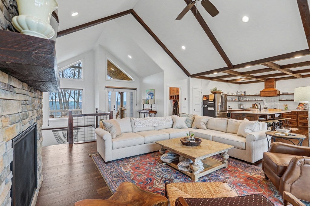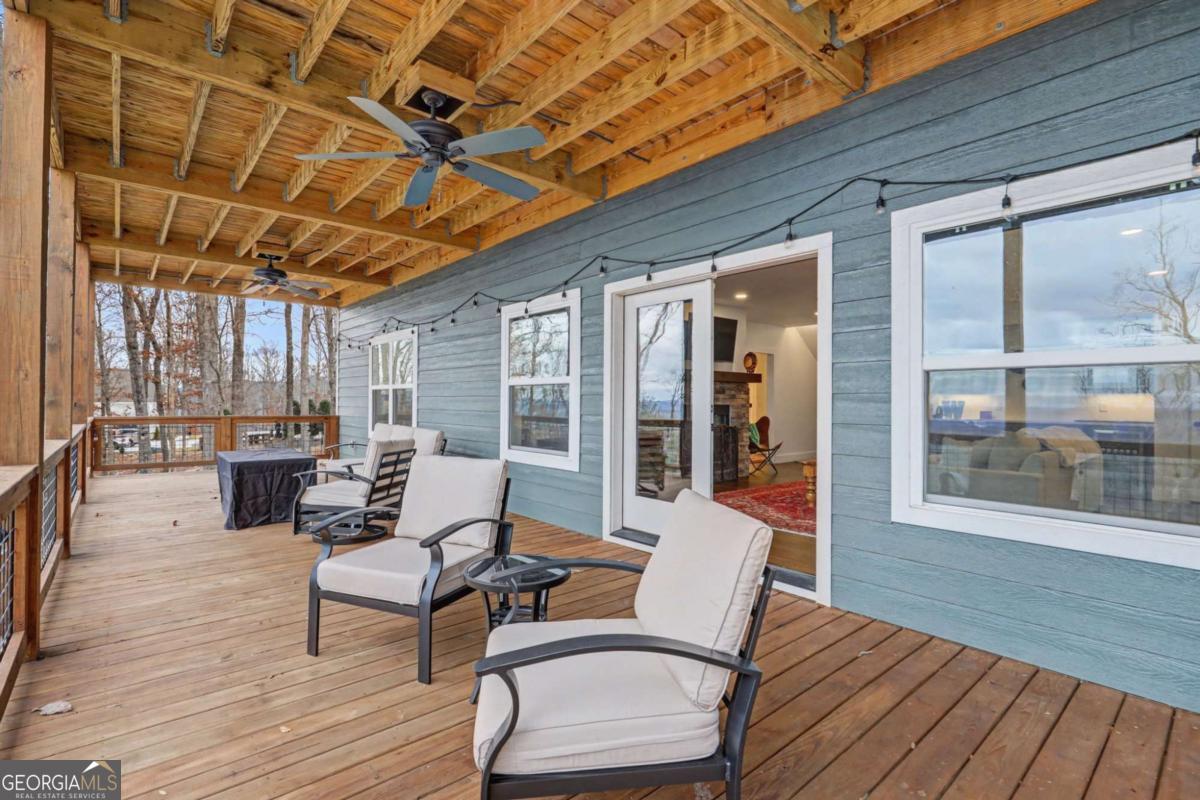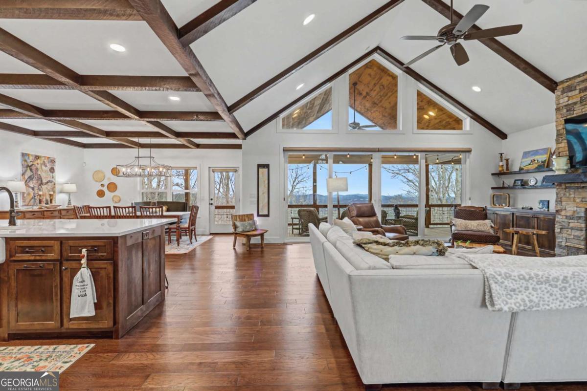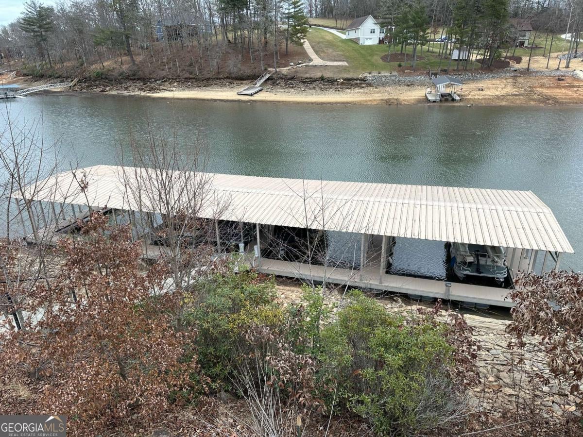 Welcome to refined mountain and lake living in the prestigious Crown Point enclave of Highland Park, complete with a deeded boat slip with lift at the community marina on Lake Nottely. This exceptional residence blends upscale finishes, thoughtful architecture, and natural surroundings to create a true retreat or an executive home worthy of its setting. Every detail reflects comfort, quality, and timeless design, with the boat slip providing an exceptional bonus for owners who value premium care and protection for their vessel. Step inside the home to experience unparalleled craftsmanship at every turn, from the stately coffered ceilings to the expansive picture windows that capture sweeping, panoramic views from nearly every angle. Natural light fills the open living spaces, creating a warm atmosphere. The chefs kitchen features a generous center island, gas range with vent hood, and a dedicated pantry, serving as the heart of the home for entertaining or everyday living. The spacious floor plan offers 4 bedrooms and 3.5 baths, including the refined luxury of two main-level ensuite bedroom sanctuaries, with the primary suite enjoying private access to the deck. This rare configuration allows for effortless one-level living while providing comfort and privacy for guests. The finished terrace level adds versatility to the home with an additional living area, 2 bedrooms, and a full bath-ideal for a private retreat. Outdoor living is equally impressive. Covered rear porches on every level deliver outstanding, layered views of Lake Nottely and the surrounding mountains. Perfectly positioned to face west, the home captures unforgettable sunset skies that transform each evening into a private show. Residents of Highland Park enjoy a gated, amenity-rich lifestyle with a beautifully appointed clubhouse, theater room, fitness center, childrens area, and a striking infinity-edge pool overlooking the lake, all within one of Blairsvilles most sought-after gated communities.