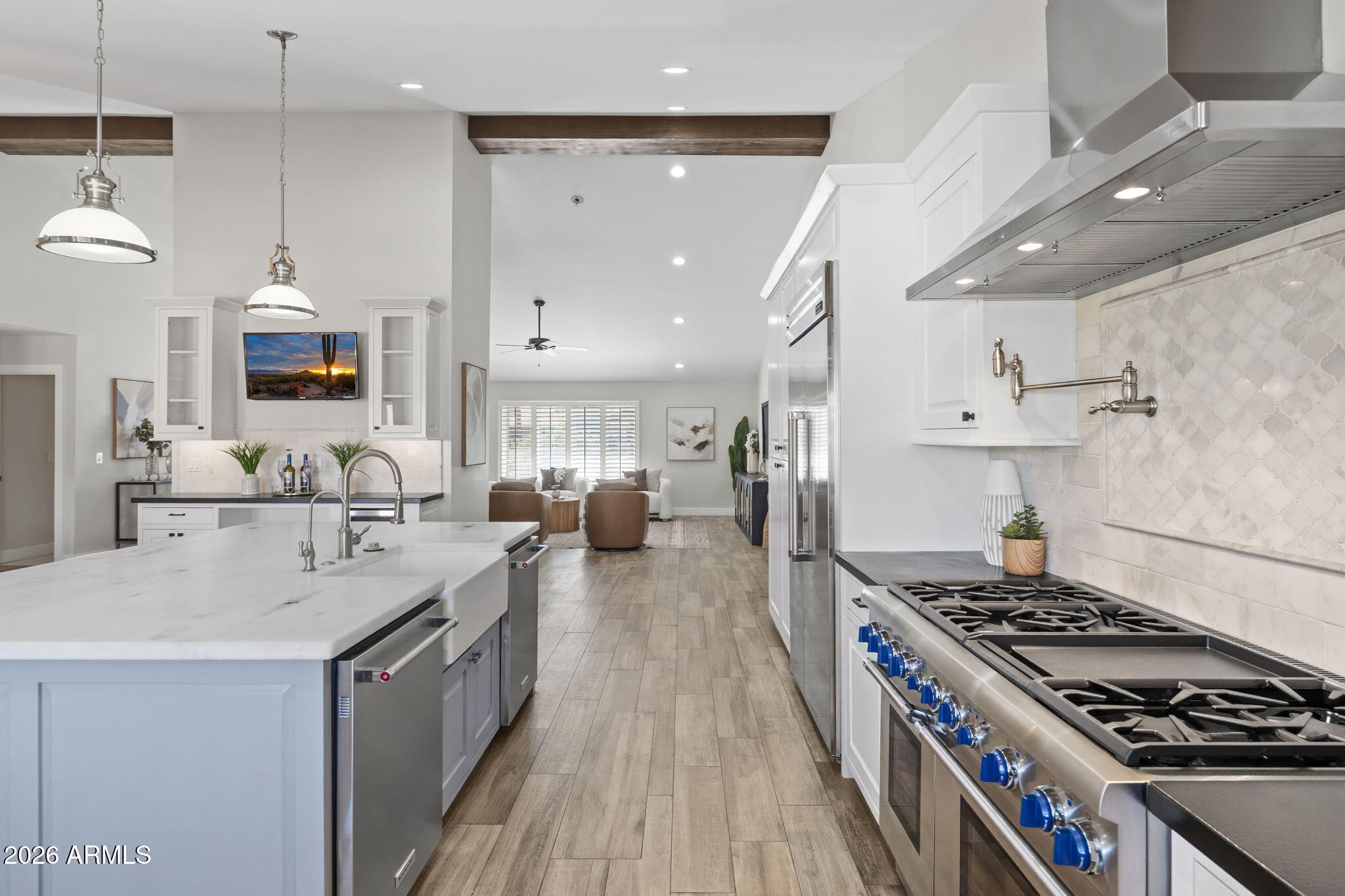 Step into a truly one-of-a-kind North Scottsdale residence offering refined desert luxury in one of the areas most sought-after communities. This beautifully updated home spans 4,461 sq ft with 5 bedrooms, 3.5 baths, and a 3-car garage, blending timeless elegance with modern comfort.The expansive open floor plan is ideal for both entertaining and everyday living. At its center is a designer kitchen featuring quartz countertops, white shaker cabinetry, a Sub-Zero refrigerator, Wolf 5-burner gas cooktop and Wolf double ovens, and an oversized island. The adjacent family room includes a gas fireplace and a custom entertainment bar, perfect for hosting and gathering. A private guest suite with en-suite bath and a spacious laundry room complete the main level. Upstairs, the primary suite offers dual walk-in closets, a two-way fireplace, and a spa-inspired bath with soaking tub, glass shower, and dual vanities. Three additional bedrooms, a shared bath with double sinks, and a versatile loft with built-ins provide flexible living space.Completed in 2023, the resort-style backyard was fully remodeled to create a private outdoor retreat designed for both relaxation and entertaining. Highlights include a new PebbleTec pool with Baja shelf, integrated fire features, and a swim-up bar, complemented by a sunken outdoor kitchen featuring a built-in Wolf grill, Blackstone griddle, dual grilling stations, full bar, pergola, multiple TVs, LED accent lighting, and expansive lounge areas. The outdoor transformation also includes artificial turf, travertine pavers with non-slip sealant, upgraded pool equipment, a new sprinkler system, and professionally refreshed front yard landscaping with matching travertine, delivering a cohesive, turnkey outdoor living experience.