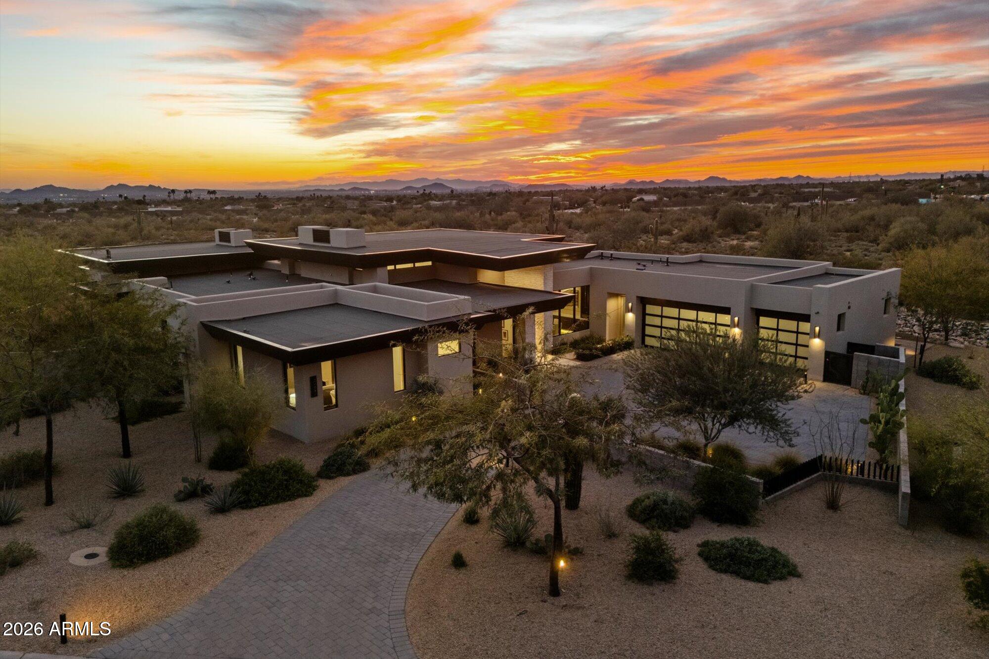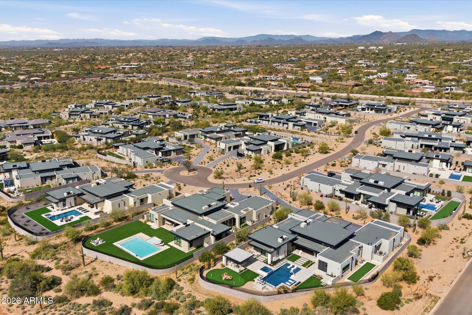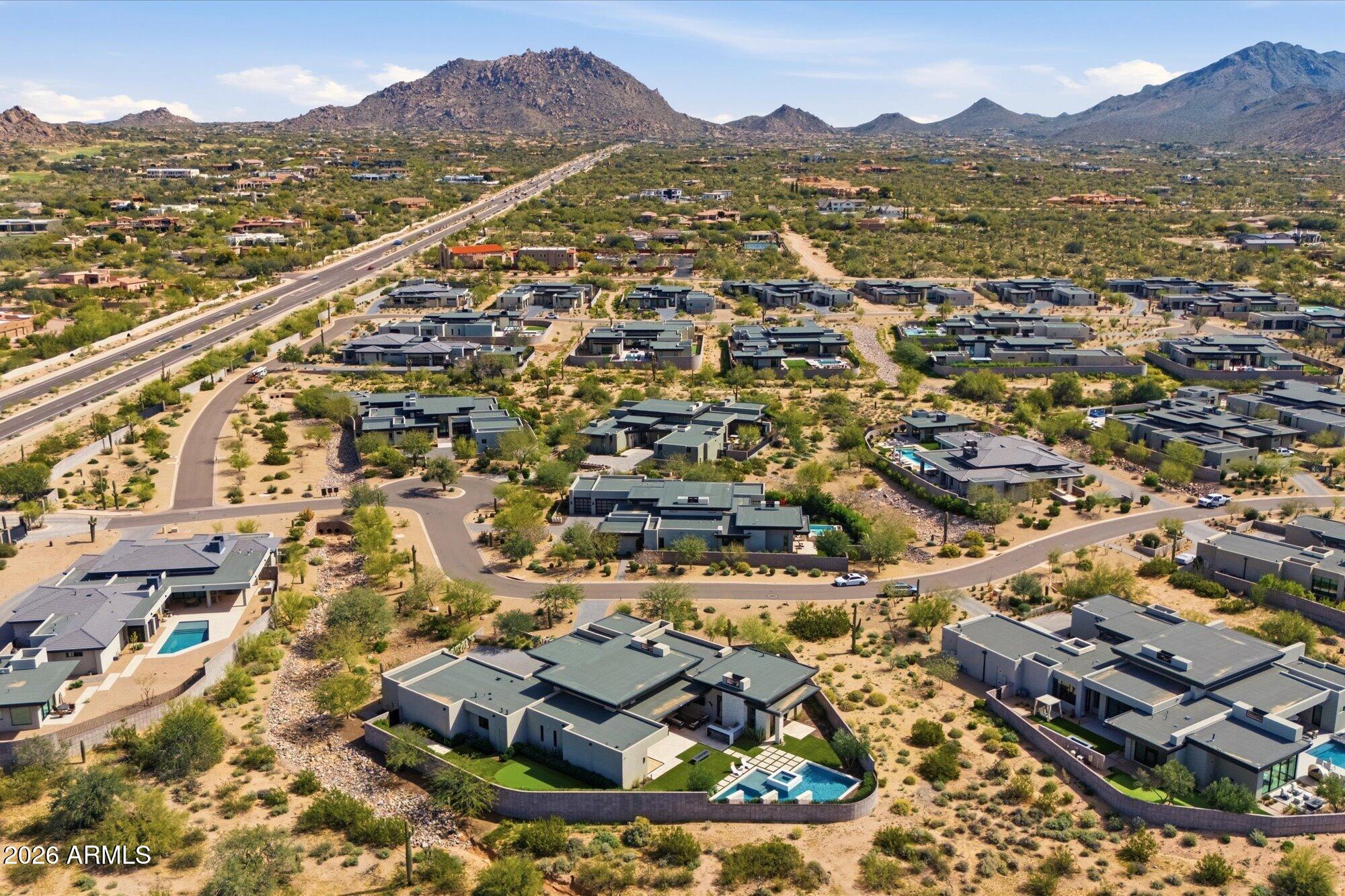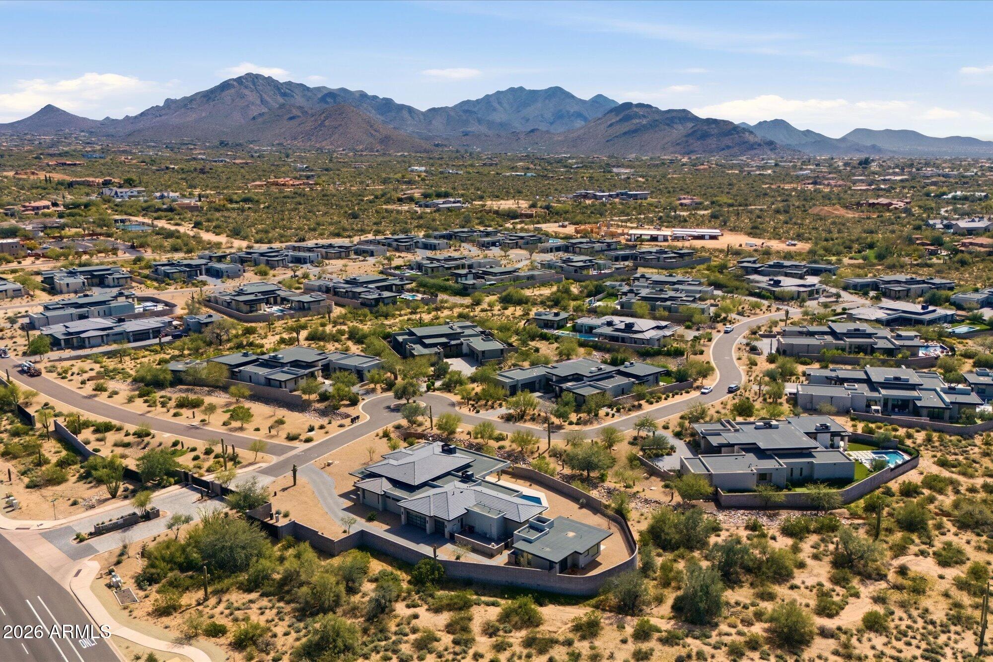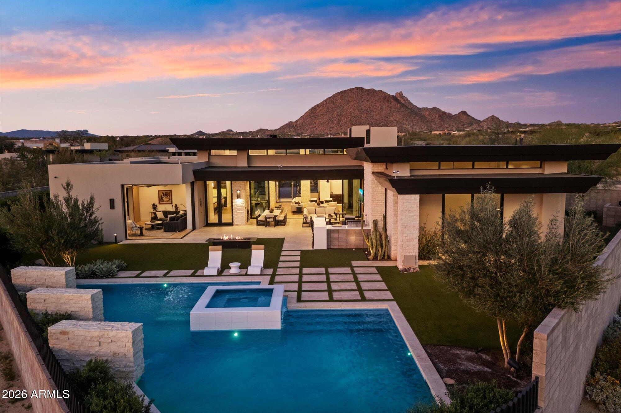 Luxury in Solitude! Gated enclave of just 33 contemporary homes by Swaback Architects & Sonora West Development, North Scottsdale. This stunning single-level residence, built 2021, offers 5,358 sq ft of sophisticated living on a premium acre lot with unobstructed views of Pinnacle Peak, Camelback Mountain, and twinkling valley lights. Open great room with soaring wood-plank ceilings, fireplace, gourmet kitchen with Sub-Zero/Wolf appliances, two massive islands, granite leather-finished counters. Serene primary suite with spa bath, soaking tub, rain shower. Den/office boasts dramatic open-corner disappearing sliding glass doors; large sliders open the resort-style backyard with ceiling-heated patio. Minutes to Troon golf, Kierland, trails. Prime booming location. Move-in ready elegance.