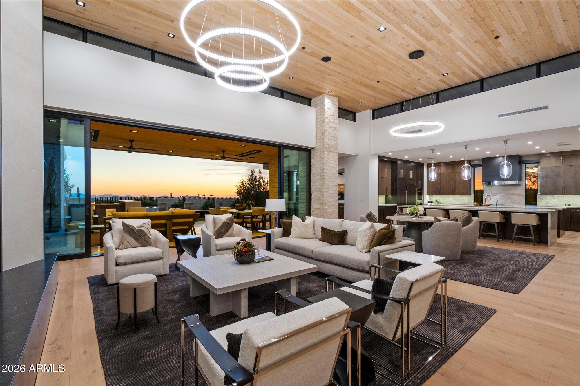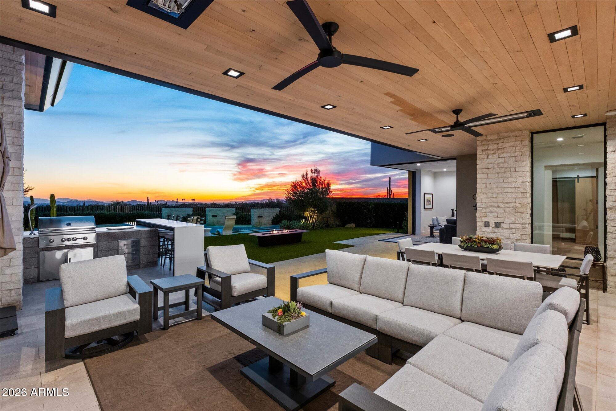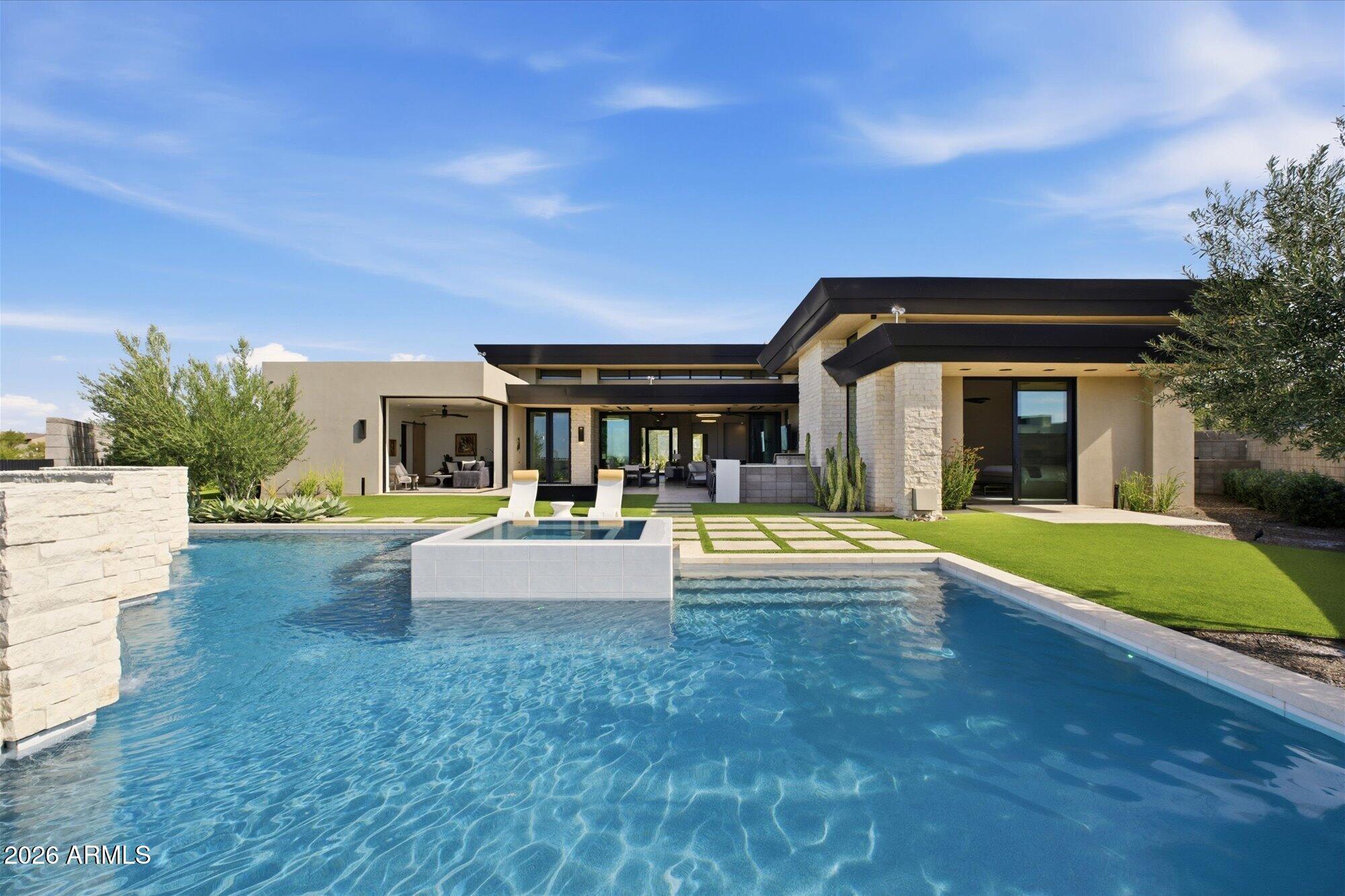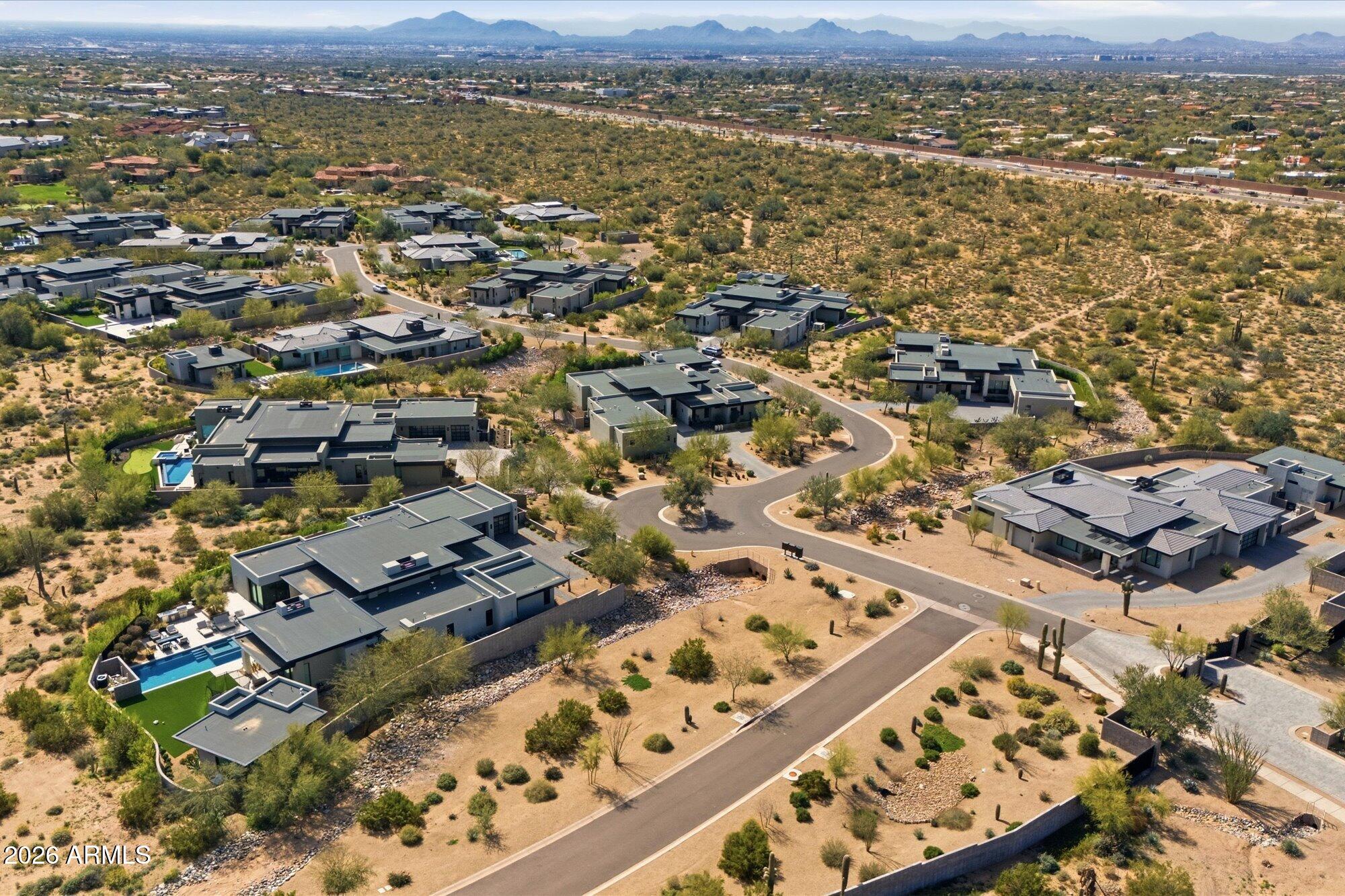Luxury in Solitude! Gated enclave of just 33 contemporary homes by Swaback Architects & Sonora West Development, North Scottsdale. This stunning single-level residence, built 2021, offers 5,358 sq ft of sophisticated living on a premium acre lot with unobstructed views of Pinnacle Peak, Camelback Mountain, and twinkling valley lights. Open great room with soaring wood-plank ceilings, fireplace, gourmet kitchen with Sub-Zero/Wolf appliances, two massive islands, granite leather-finished counters. Serene primary suite with spa bath, soaking tub, rain shower. Den/office boasts dramatic open-corner disappearing sliding glass doors; large sliders open the resort-style backyard with ceiling-heated patio. Minutes to Troon golf, Kierland, trails. Prime booming location. Move-in ready elegance.