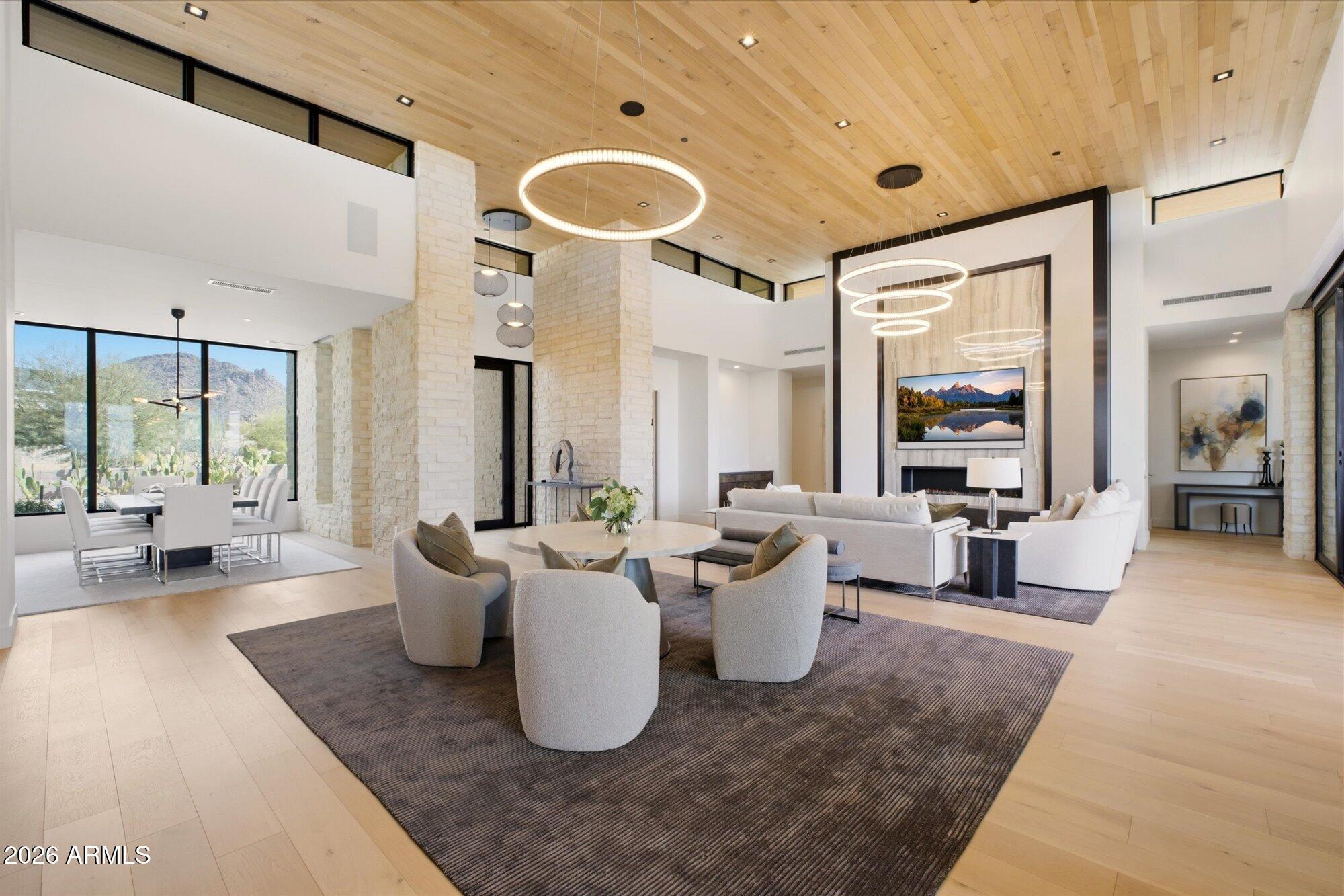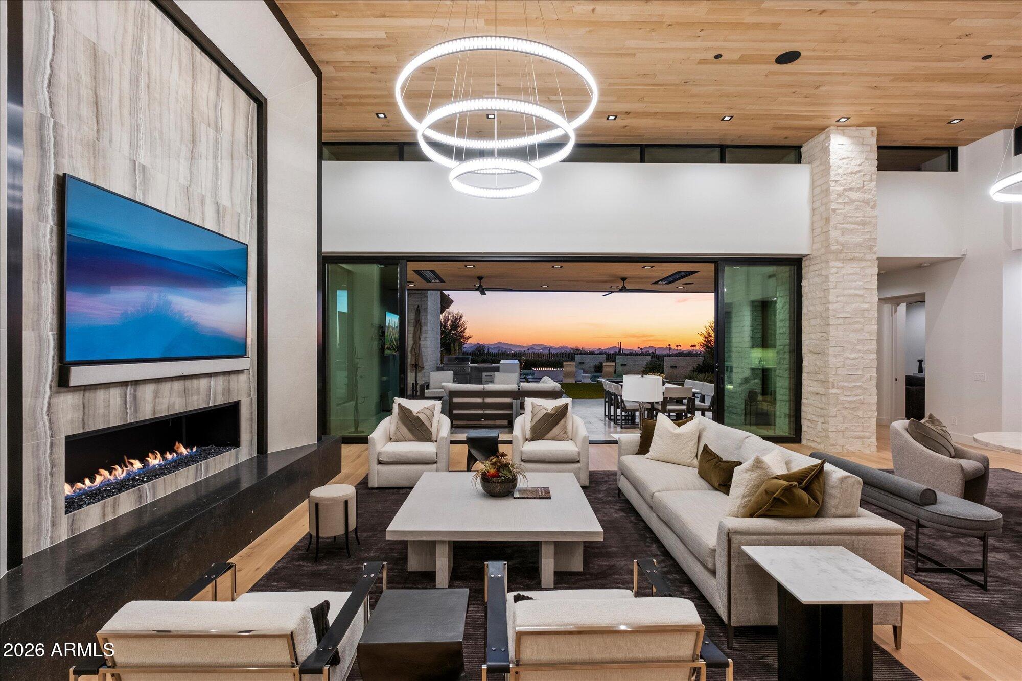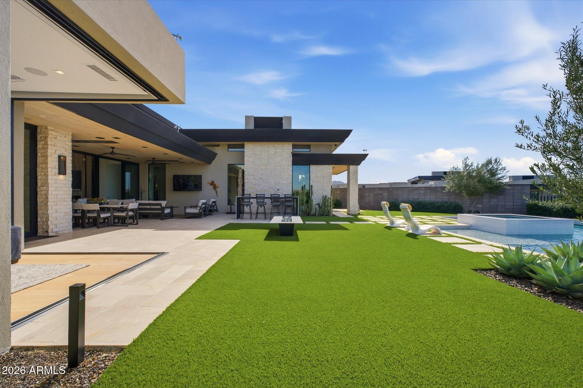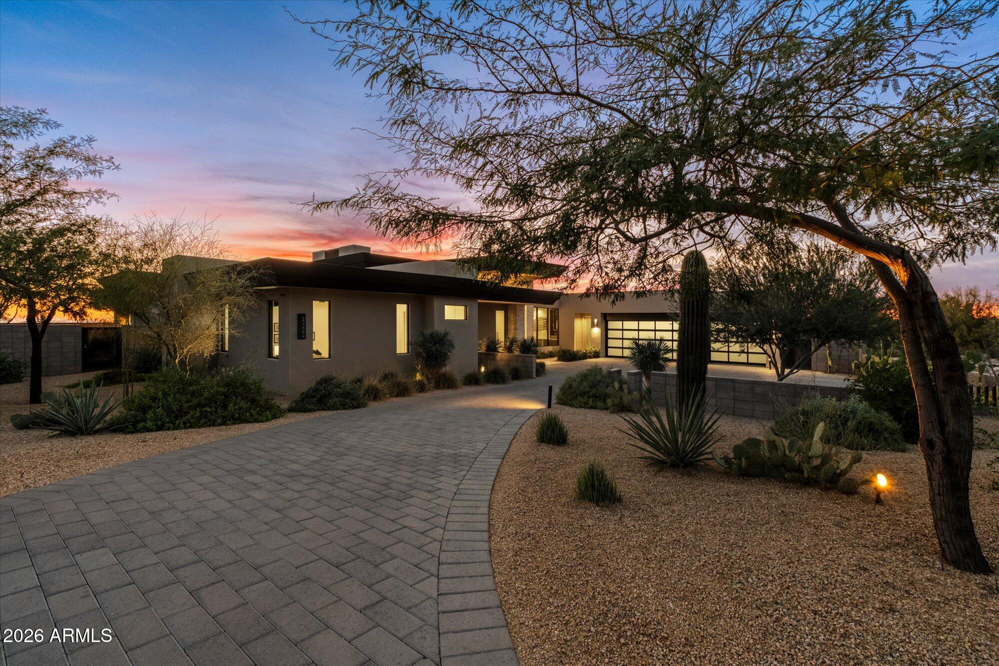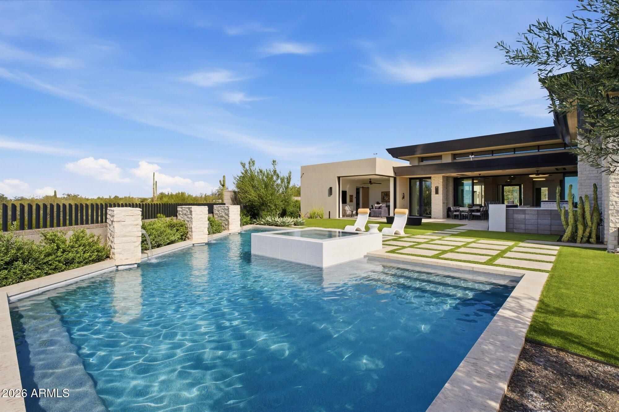 Luxury in Solitude! Gated enclave of just 33 contemporary homes by Swaback Architects & Sonora West Development, North Scottsdale. This stunning single-level residence, built 2021, offers 5,358 sq ft of sophisticated living on a premium acre lot with unobstructed views of Pinnacle Peak, Camelback Mountain, and twinkling valley lights. Open great room with soaring wood-plank ceilings, fireplace, gourmet kitchen with Sub-Zero/Wolf appliances, two massive islands, granite leather-finished counters. Serene primary suite with spa bath, soaking tub, rain shower. Den/office boasts dramatic open-corner disappearing sliding glass doors; large sliders open the resort-style backyard with ceiling-heated patio. Minutes to Troon golf, Kierland, trails. Prime booming location. Move-in ready elegance.