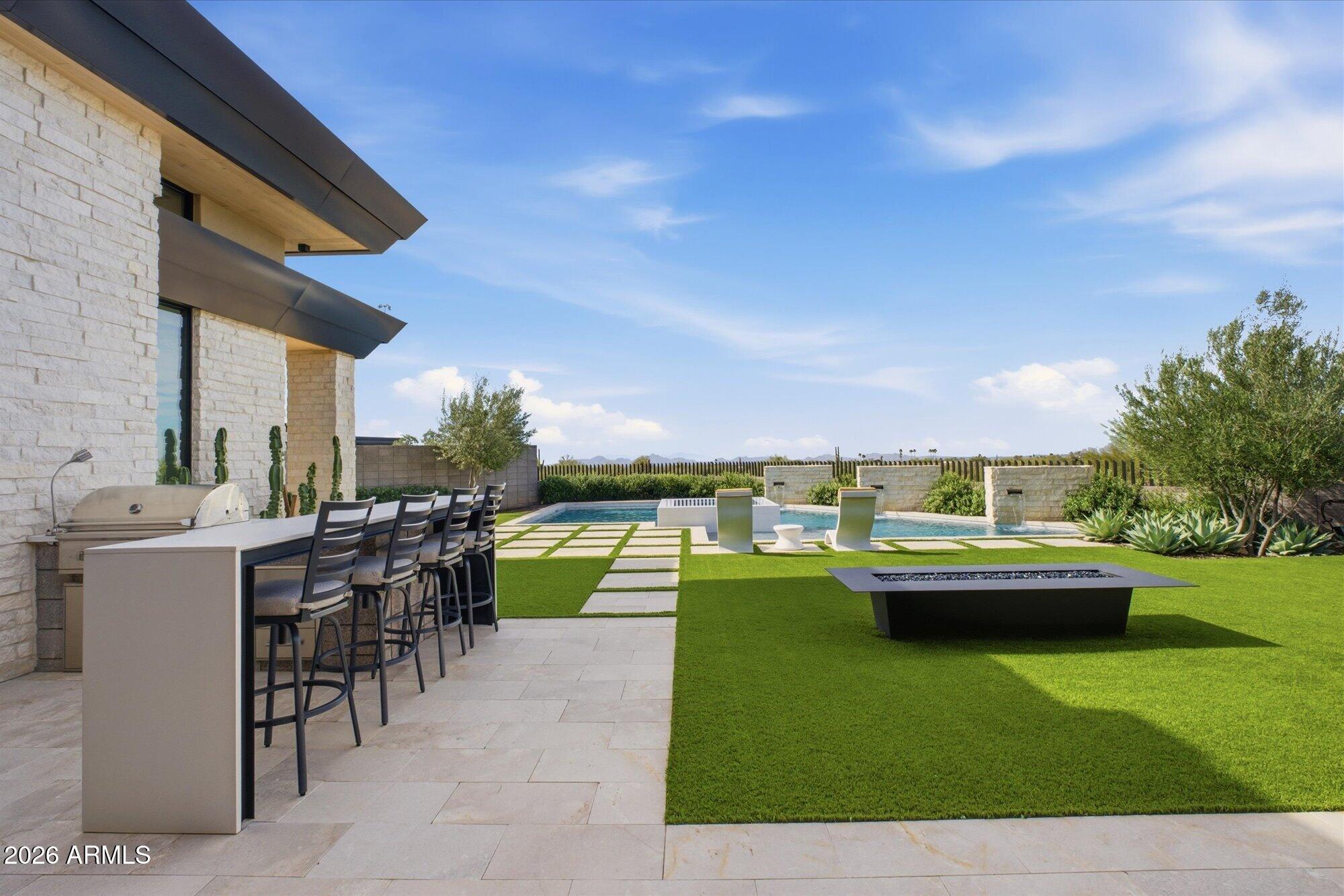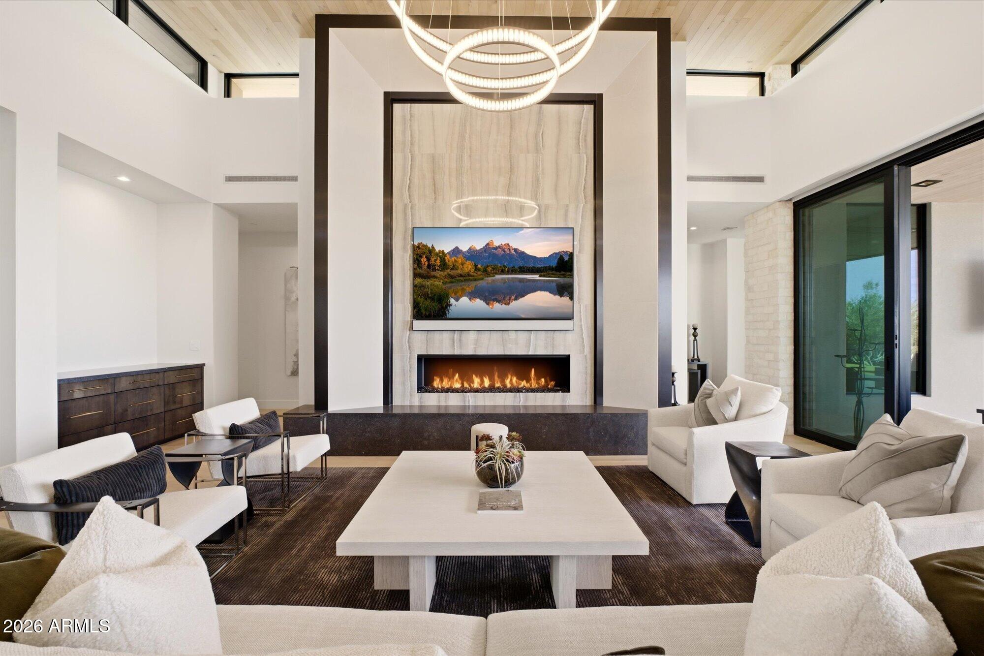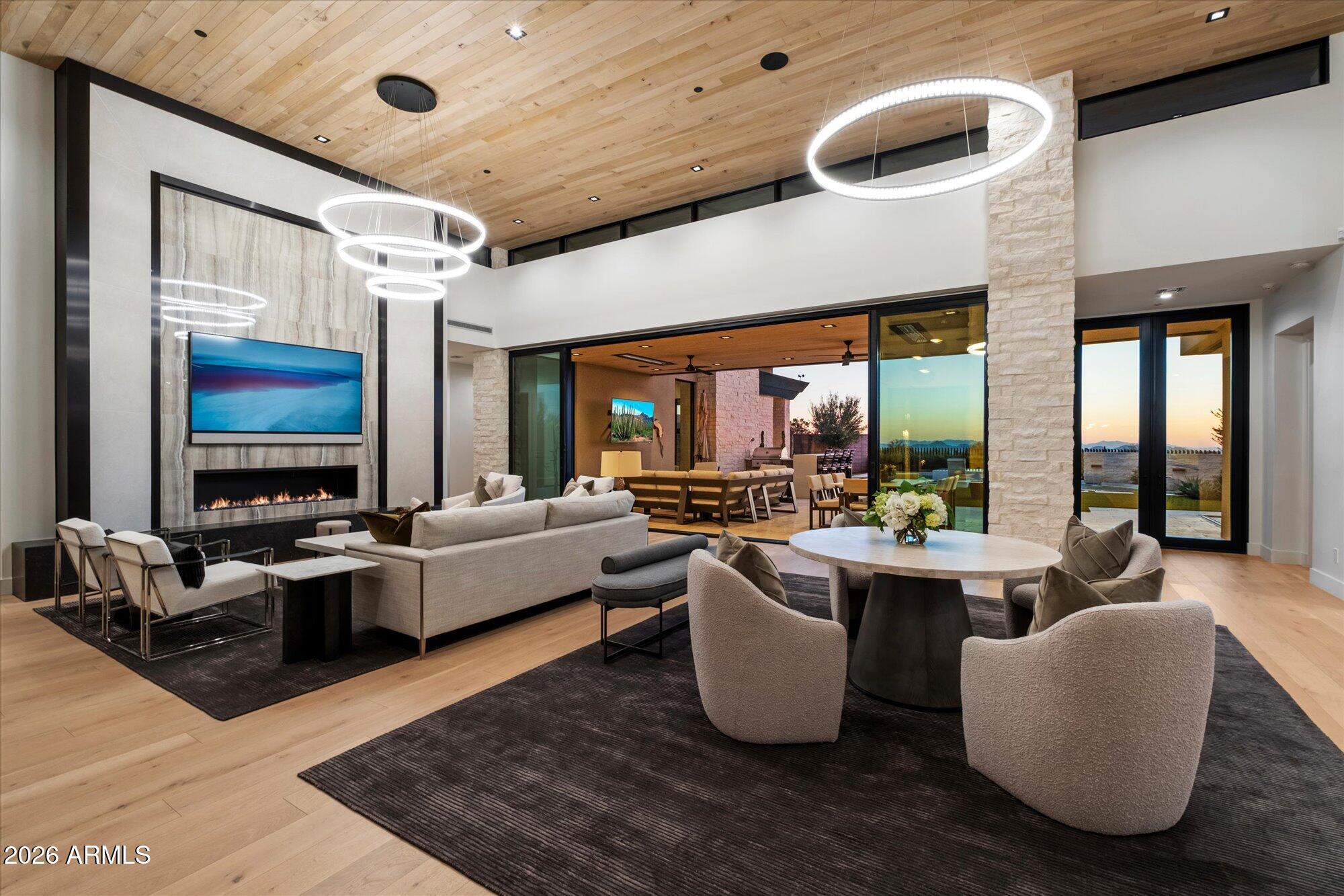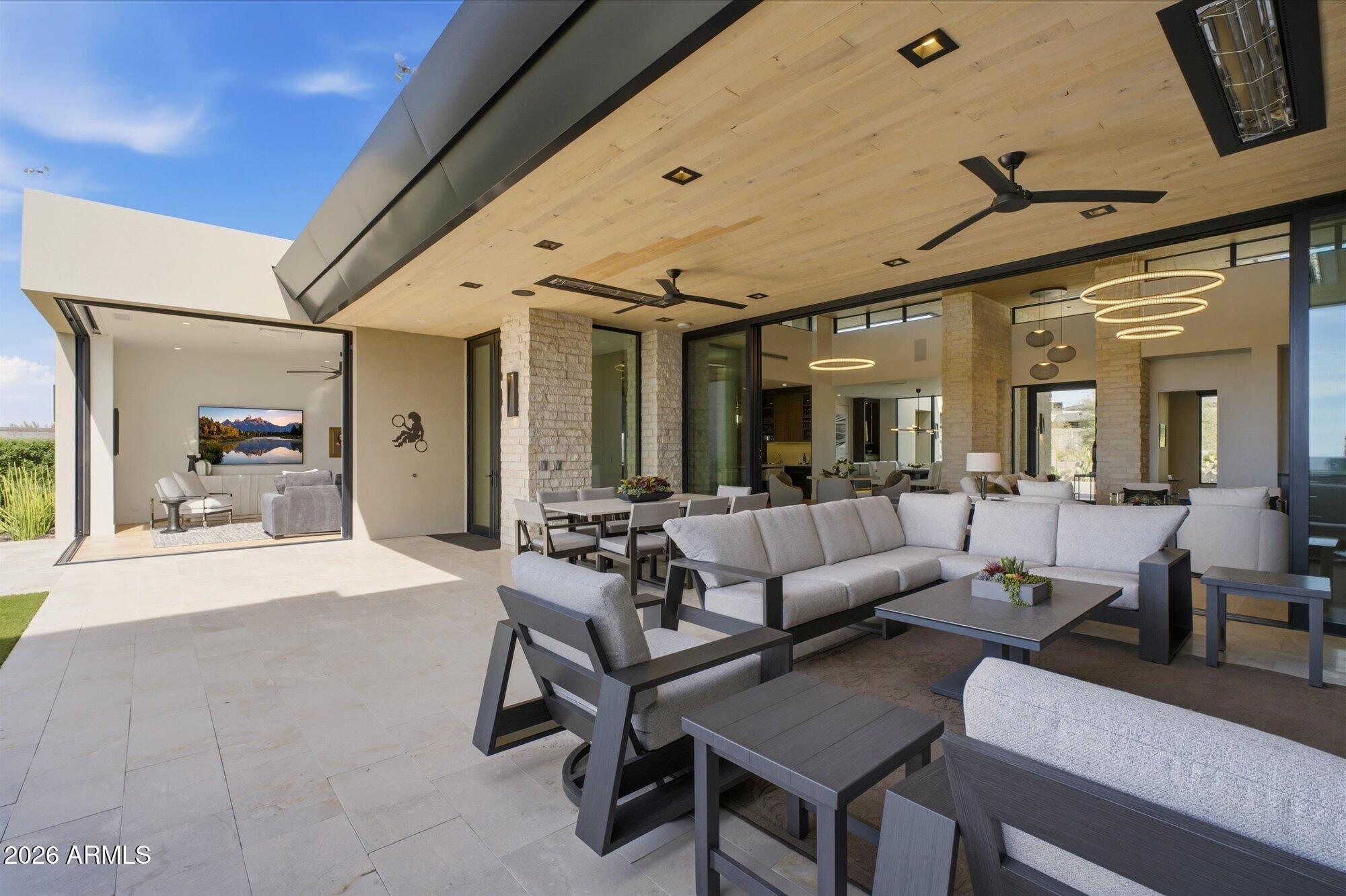 Luxury in Solitude! Gated enclave of just 33 contemporary homes by Swaback Architects & Sonora West Development, North Scottsdale. This stunning single-level residence, built 2021, offers 5,358 sq ft of sophisticated living on a premium acre lot with unobstructed views of Pinnacle Peak, Camelback Mountain, and twinkling valley lights. Open great room with soaring wood-plank ceilings, fireplace, gourmet kitchen with Sub-Zero/Wolf appliances, two massive islands, granite leather-finished counters. Serene primary suite with spa bath, soaking tub, rain shower. Den/office boasts dramatic open-corner disappearing sliding glass doors; large sliders open the resort-style backyard with ceiling-heated patio. Minutes to Troon golf, Kierland, trails. Prime booming location. Move-in ready elegance.