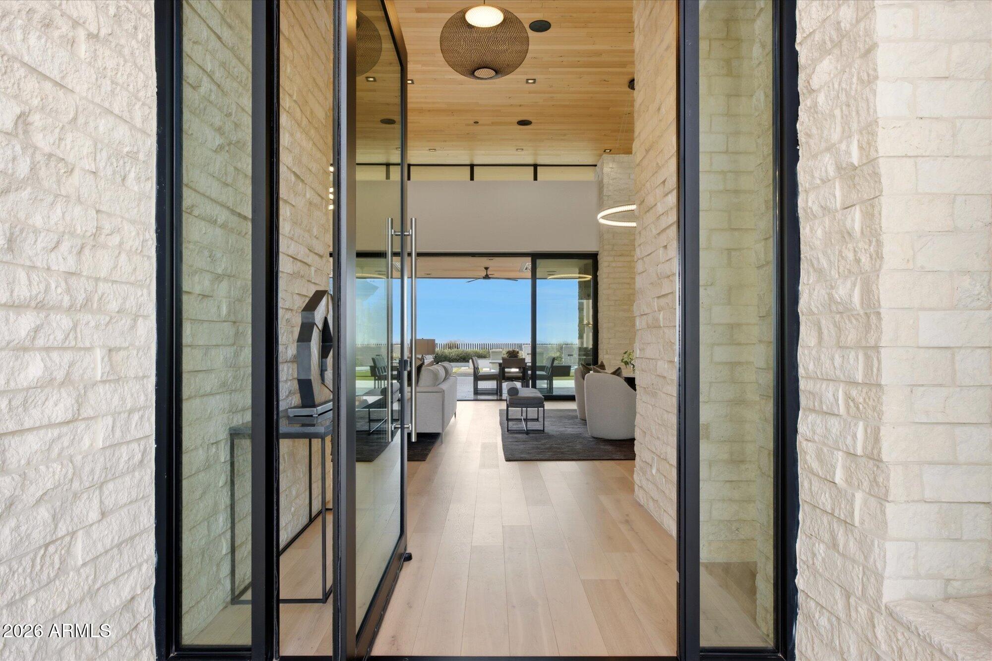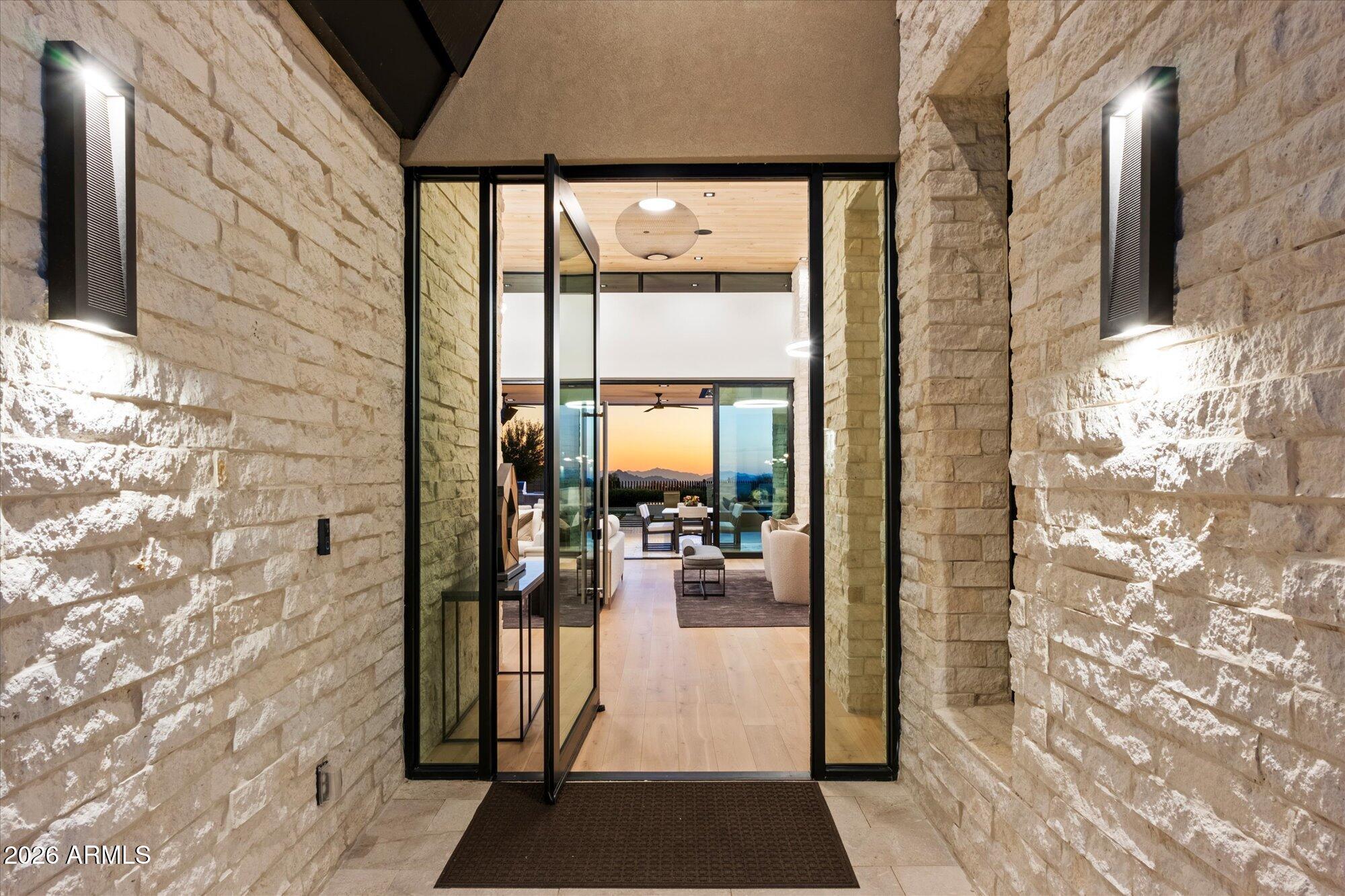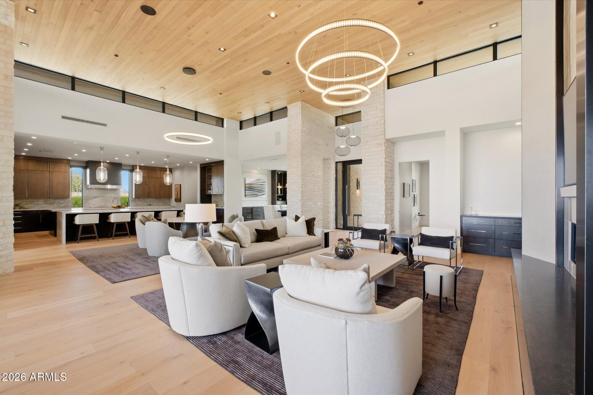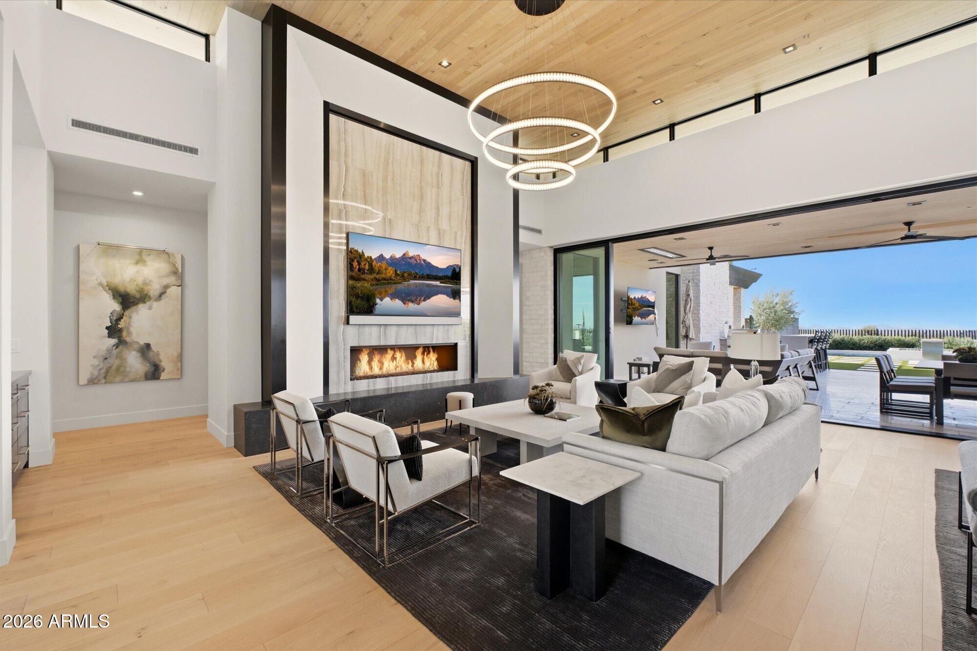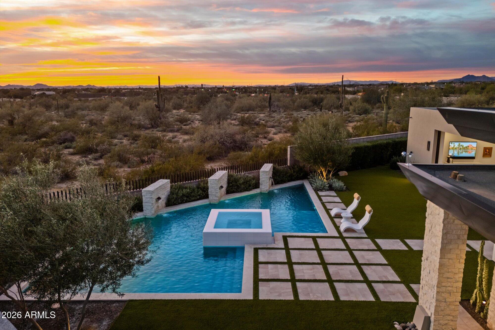 Luxury in Solitude! Gated enclave of just 33 contemporary homes by Swaback Architects & Sonora West Development, North Scottsdale. This stunning single-level residence, built 2021, offers 5,358 sq ft of sophisticated living on a premium acre lot with unobstructed views of Pinnacle Peak, Camelback Mountain, and twinkling valley lights. Open great room with soaring wood-plank ceilings, fireplace, gourmet kitchen with Sub-Zero/Wolf appliances, two massive islands, granite leather-finished counters. Serene primary suite with spa bath, soaking tub, rain shower. Den/office boasts dramatic open-corner disappearing sliding glass doors; large sliders open the resort-style backyard with ceiling-heated patio. Minutes to Troon golf, Kierland, trails. Prime booming location. Move-in ready elegance.