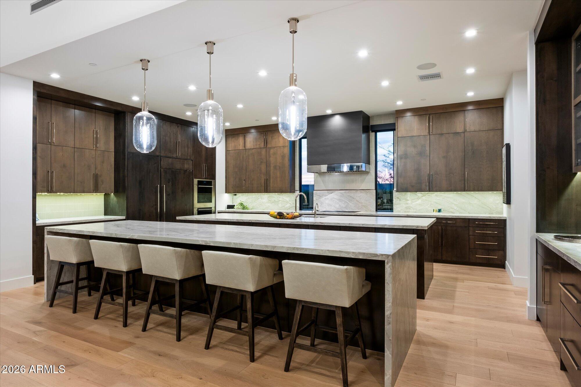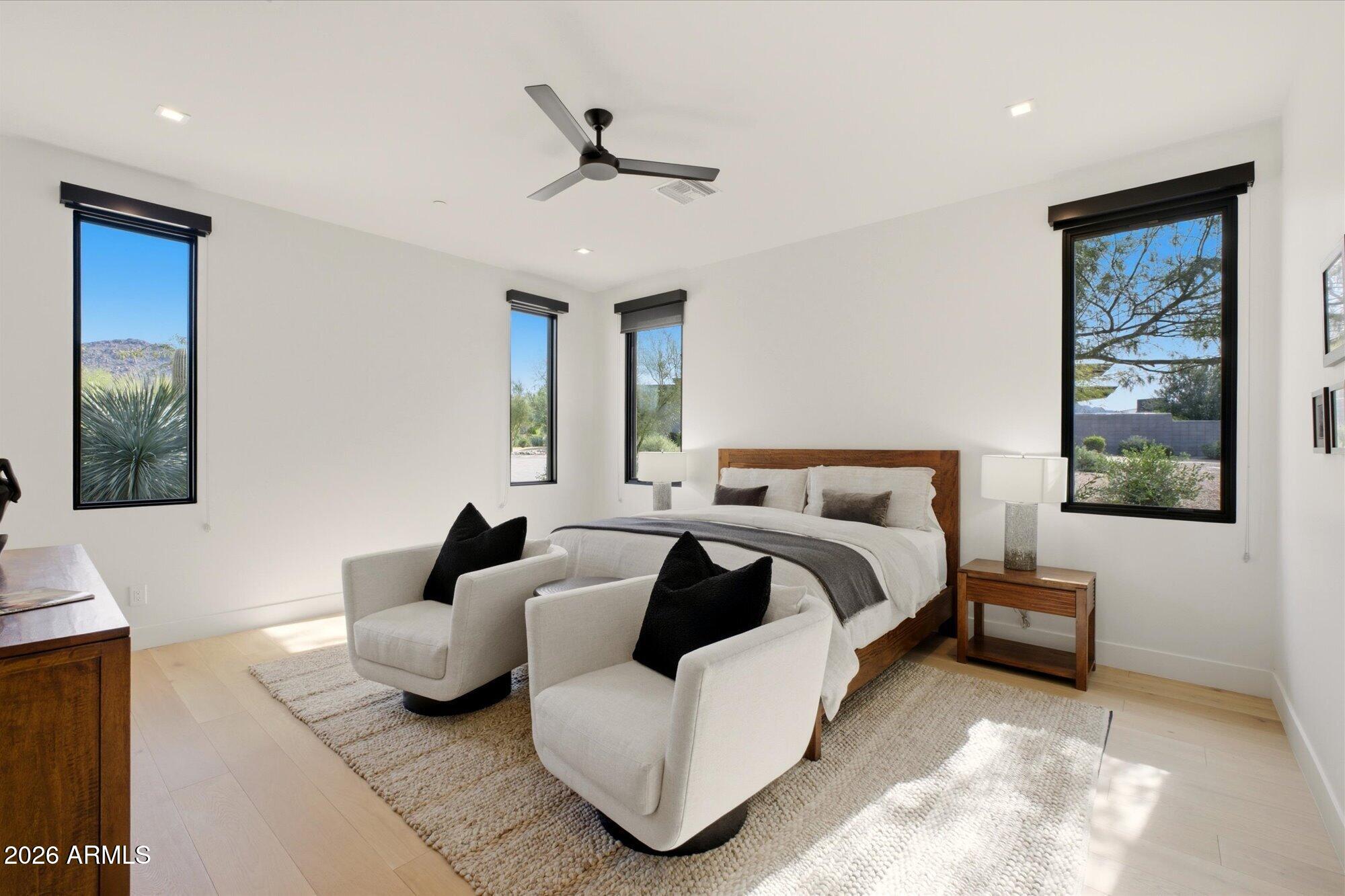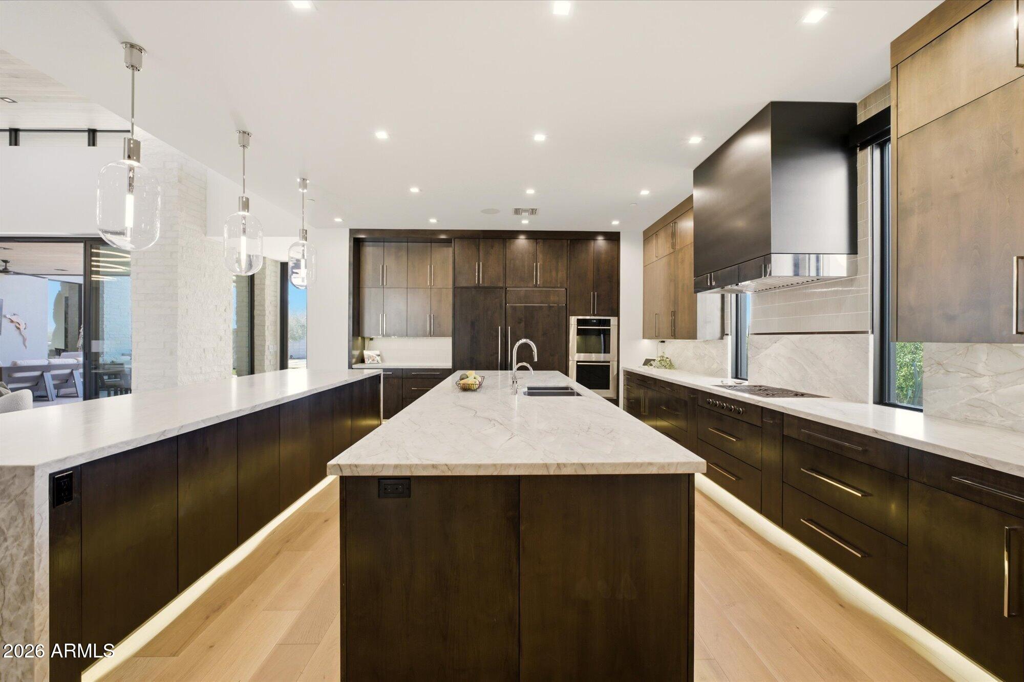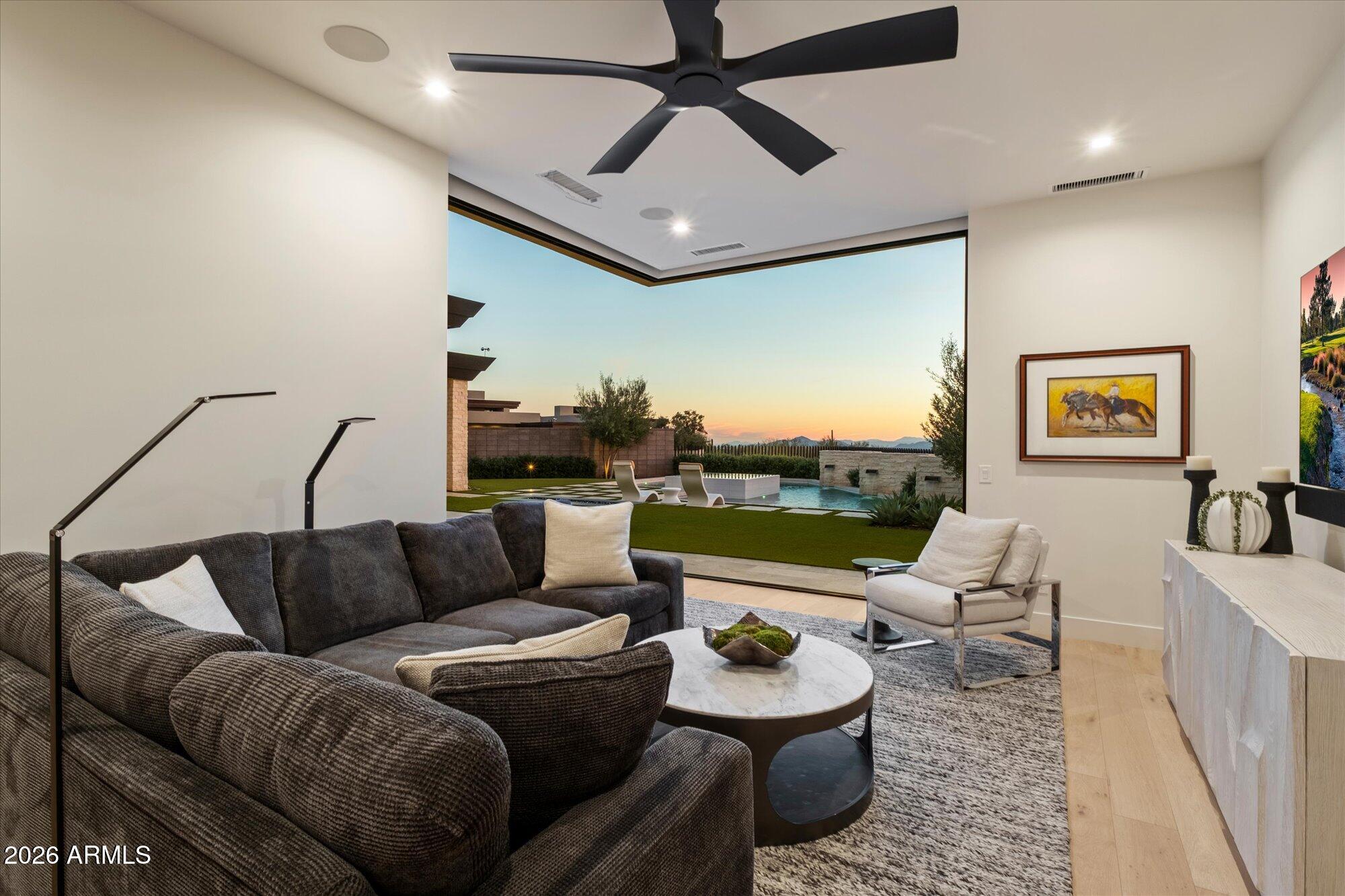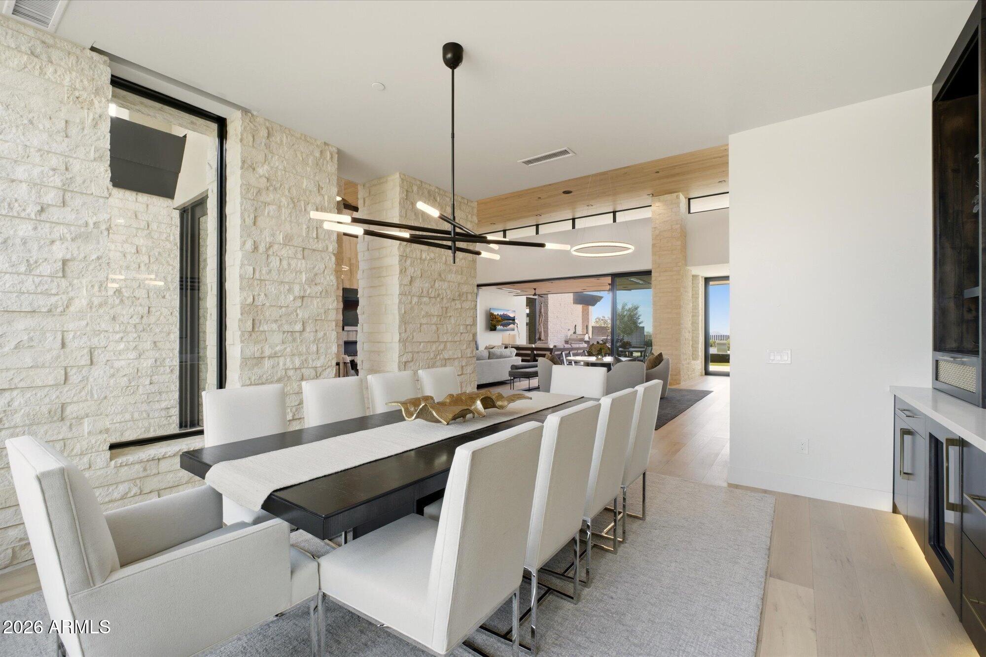 Luxury in Solitude! Gated enclave of just 33 contemporary homes by Swaback Architects & Sonora West Development, North Scottsdale. This stunning single-level residence, built 2021, offers 5,358 sq ft of sophisticated living on a premium acre lot with unobstructed views of Pinnacle Peak, Camelback Mountain, and twinkling valley lights. Open great room with soaring wood-plank ceilings, fireplace, gourmet kitchen with Sub-Zero/Wolf appliances, two massive islands, granite leather-finished counters. Serene primary suite with spa bath, soaking tub, rain shower. Den/office boasts dramatic open-corner disappearing sliding glass doors; large sliders open the resort-style backyard with ceiling-heated patio. Minutes to Troon golf, Kierland, trails. Prime booming location. Move-in ready elegance.