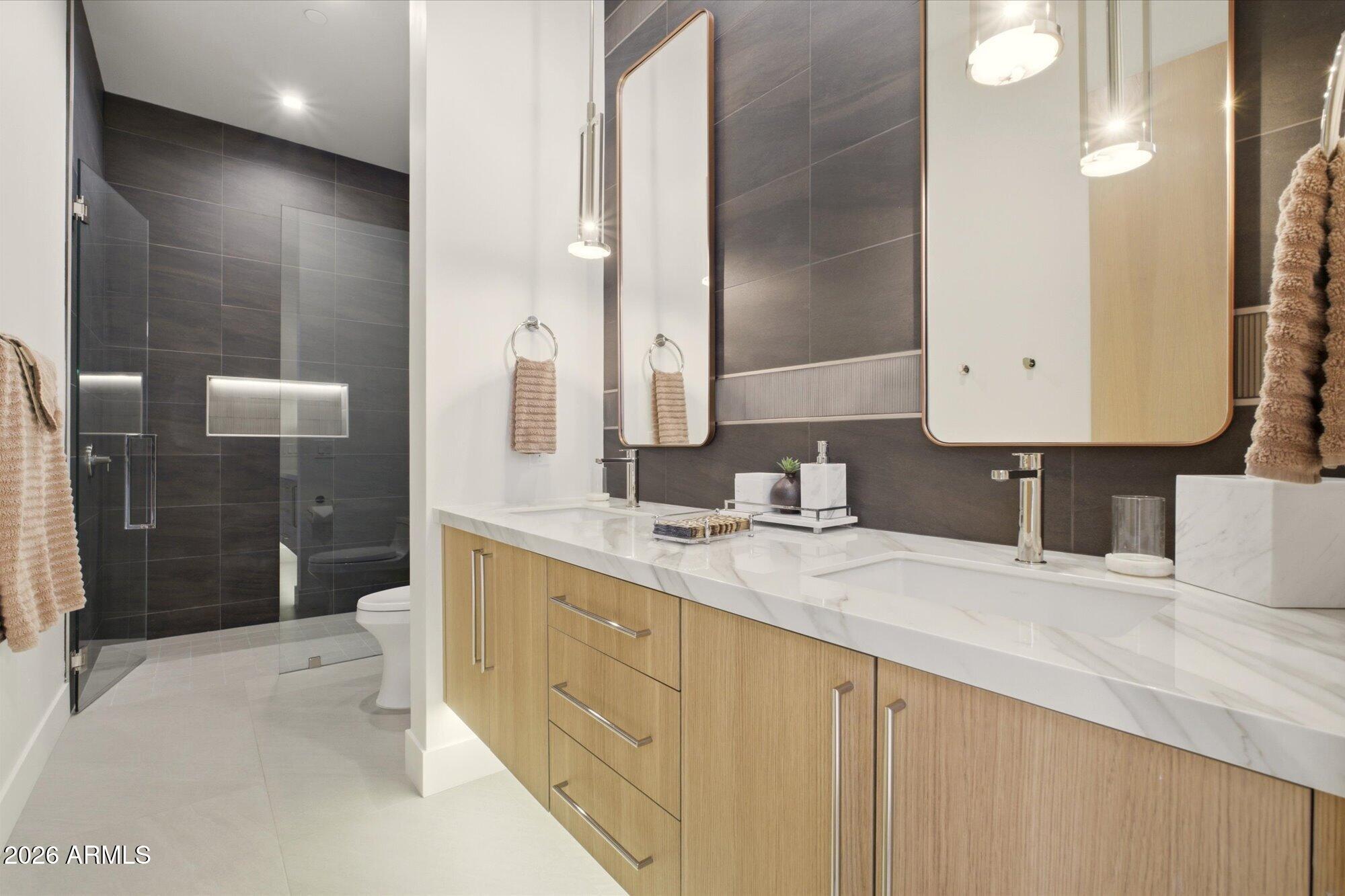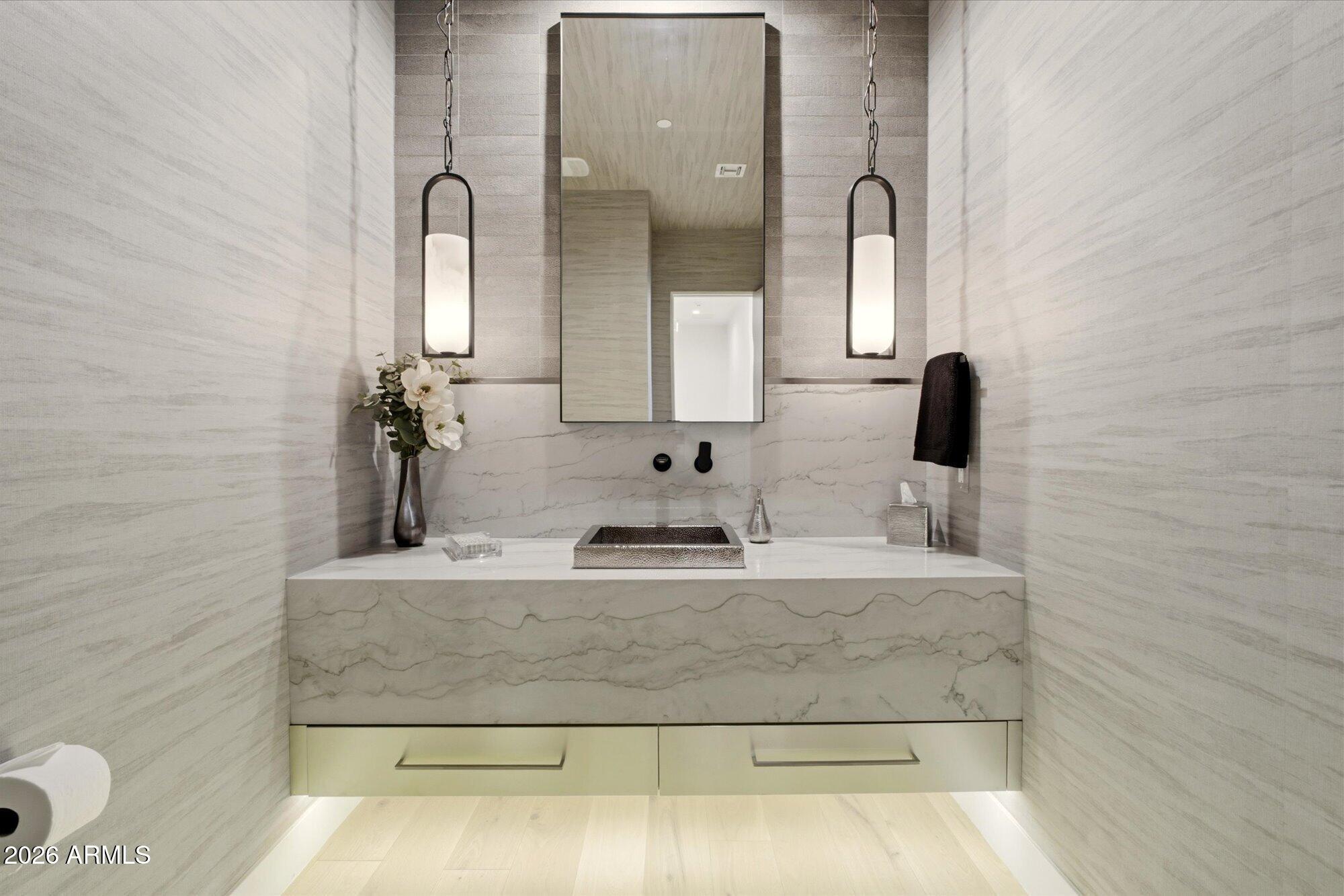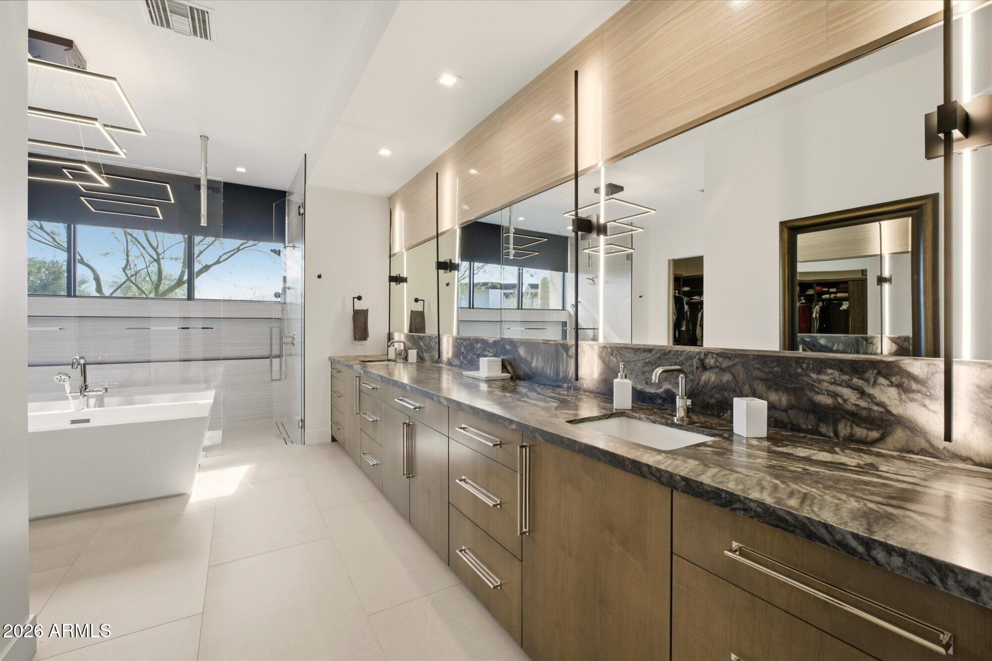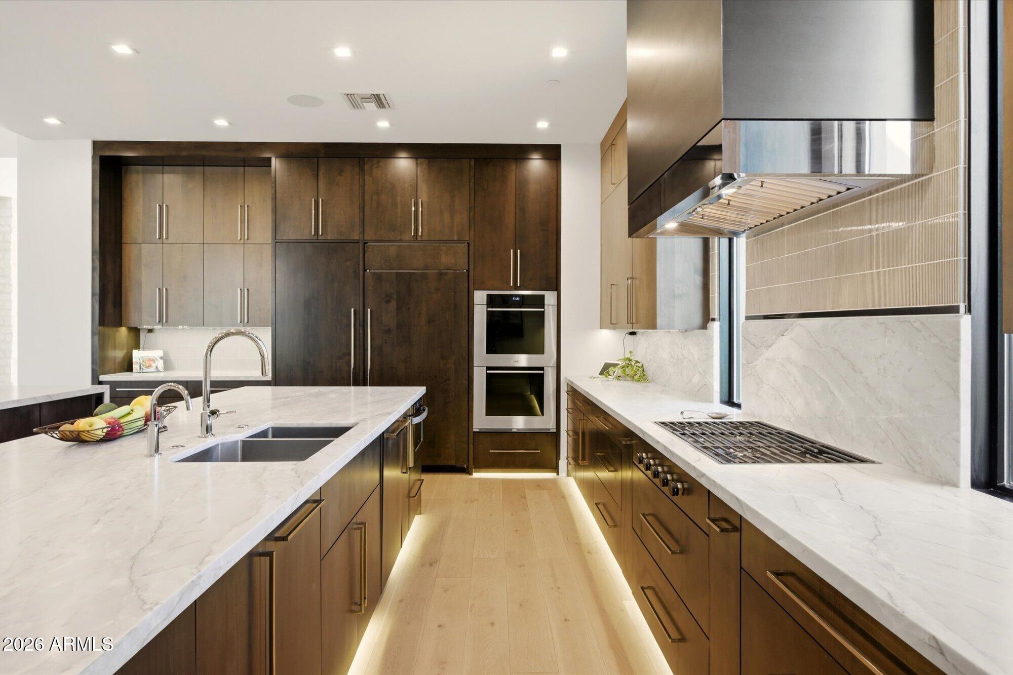 Luxury in Solitude! Gated enclave of just 33 contemporary homes by Swaback Architects & Sonora West Development, North Scottsdale. This stunning single-level residence, built 2021, offers 5,358 sq ft of sophisticated living on a premium acre lot with unobstructed views of Pinnacle Peak, Camelback Mountain, and twinkling valley lights. Open great room with soaring wood-plank ceilings, fireplace, gourmet kitchen with Sub-Zero/Wolf appliances, two massive islands, granite leather-finished counters. Serene primary suite with spa bath, soaking tub, rain shower. Den/office boasts dramatic open-corner disappearing sliding glass doors; large sliders open the resort-style backyard with ceiling-heated patio. Minutes to Troon golf, Kierland, trails. Prime booming location. Move-in ready elegance.
