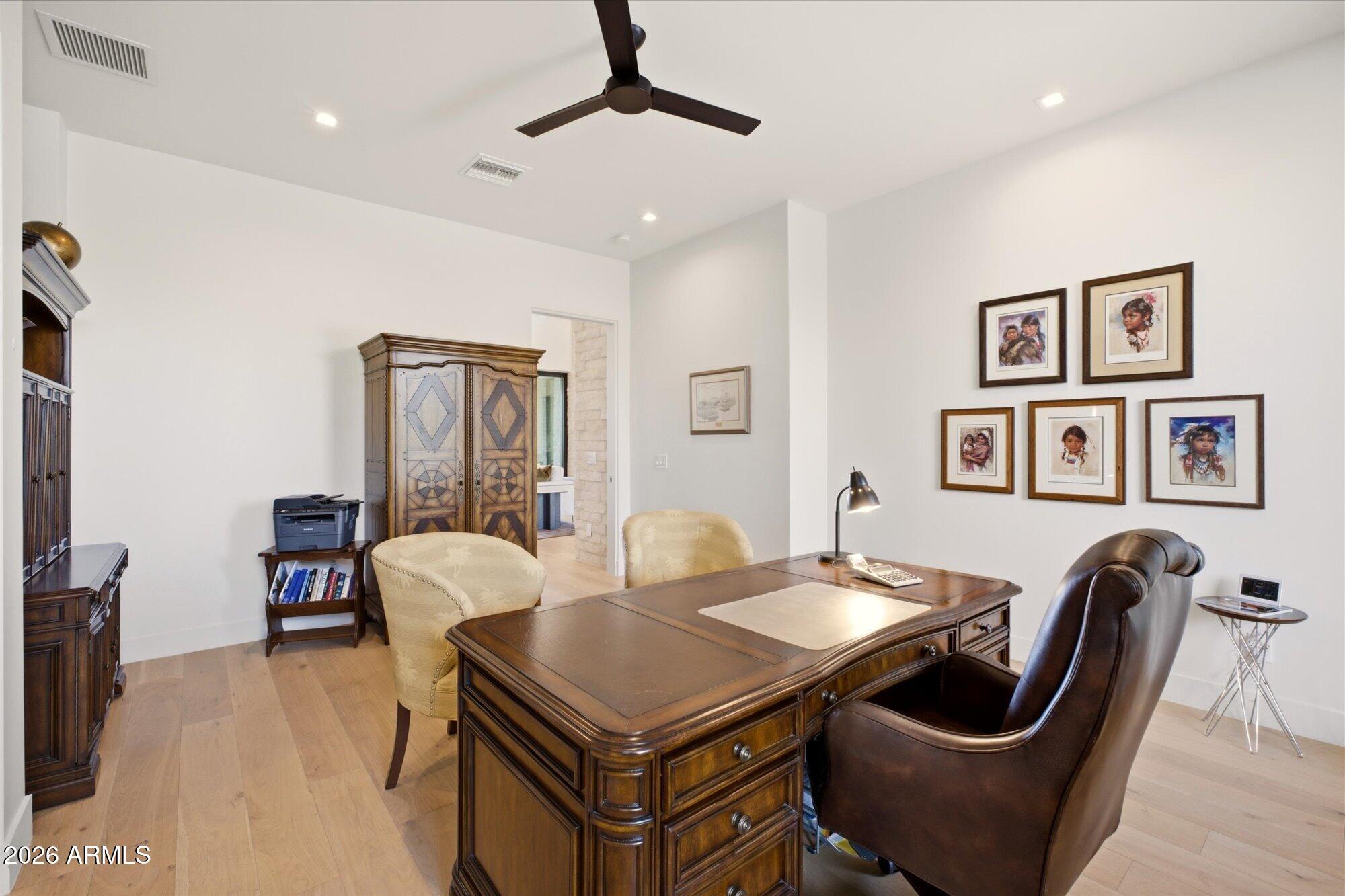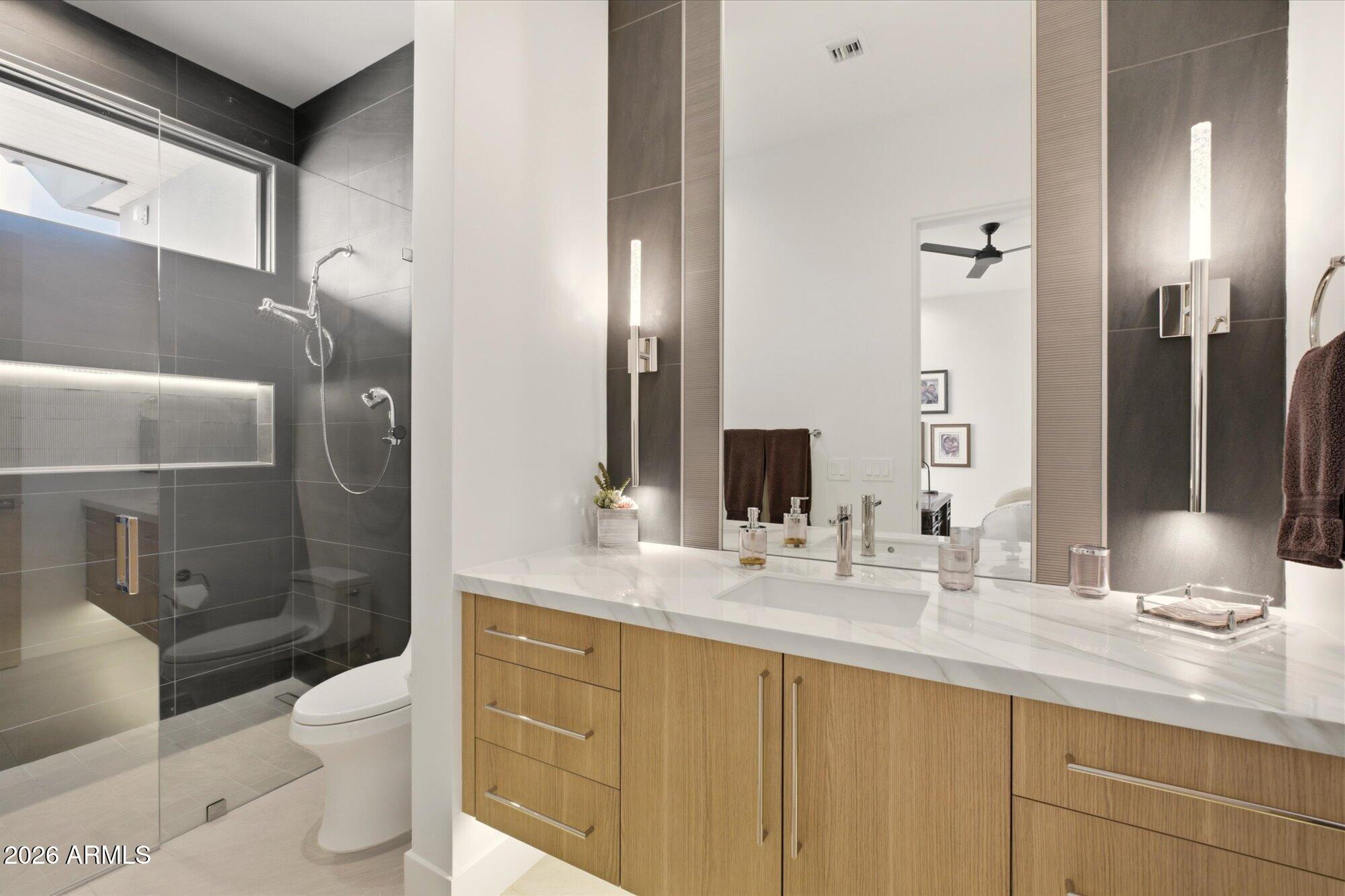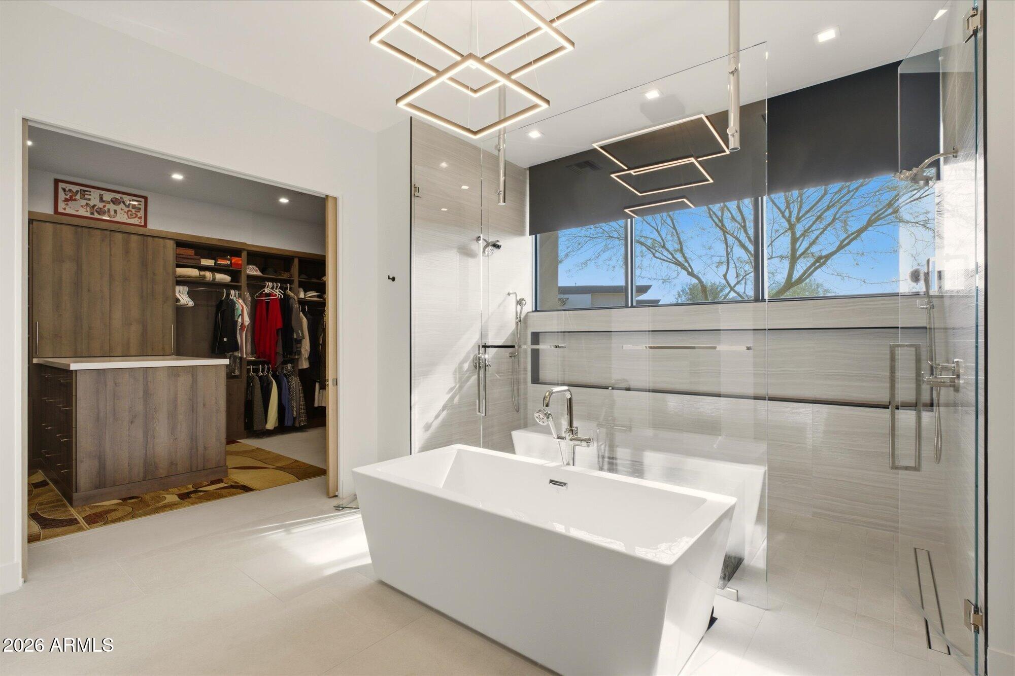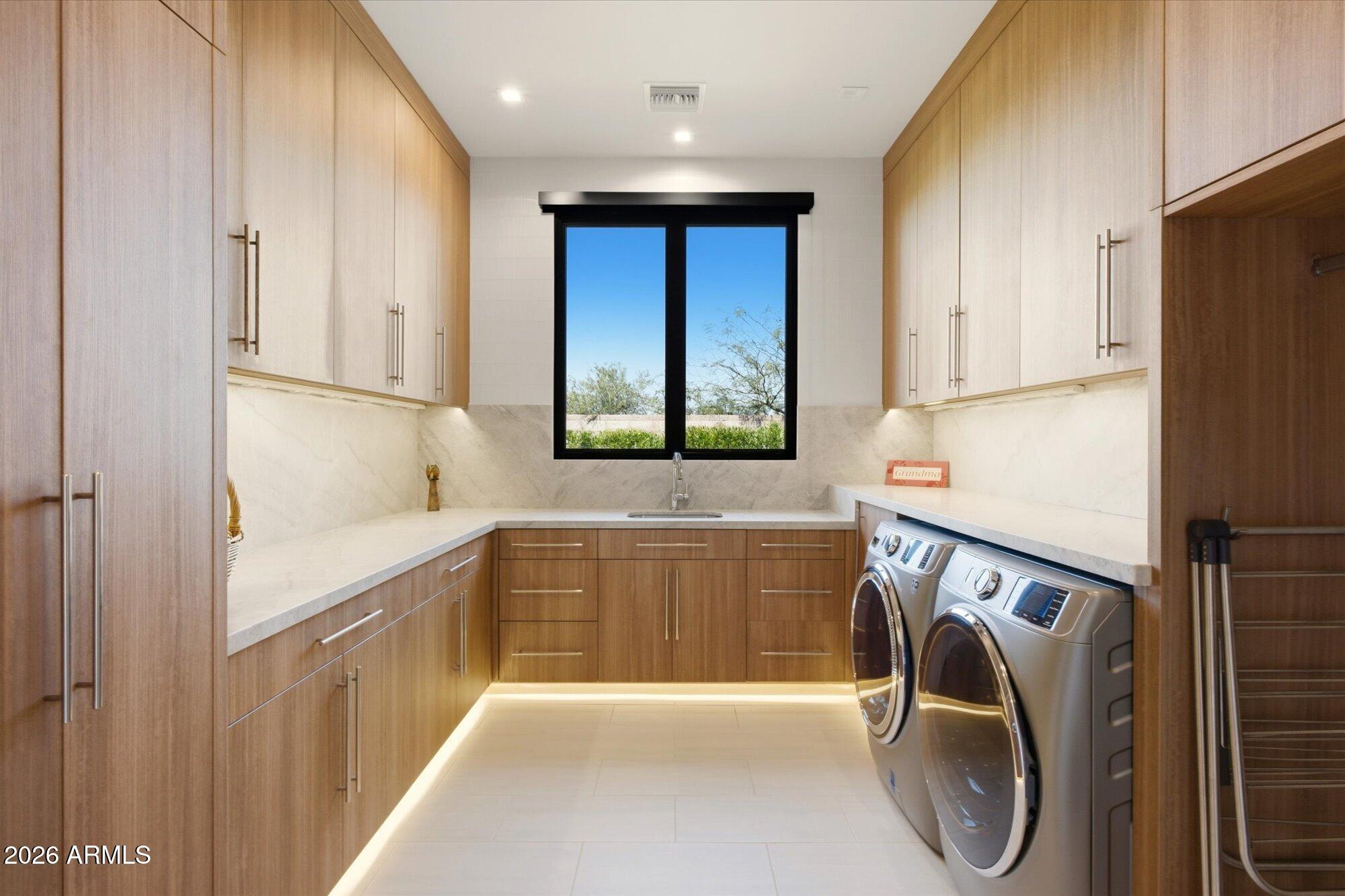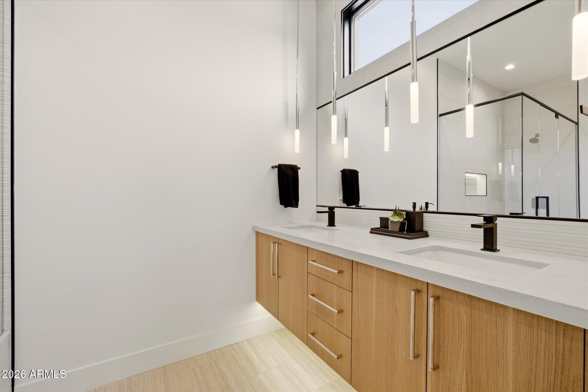 Luxury in Solitude! Gated enclave of just 33 contemporary homes by Swaback Architects & Sonora West Development, North Scottsdale. This stunning single-level residence, built 2021, offers 5,358 sq ft of sophisticated living on a premium acre lot with unobstructed views of Pinnacle Peak, Camelback Mountain, and twinkling valley lights. Open great room with soaring wood-plank ceilings, fireplace, gourmet kitchen with Sub-Zero/Wolf appliances, two massive islands, granite leather-finished counters. Serene primary suite with spa bath, soaking tub, rain shower. Den/office boasts dramatic open-corner disappearing sliding glass doors; large sliders open the resort-style backyard with ceiling-heated patio. Minutes to Troon golf, Kierland, trails. Prime booming location. Move-in ready elegance.