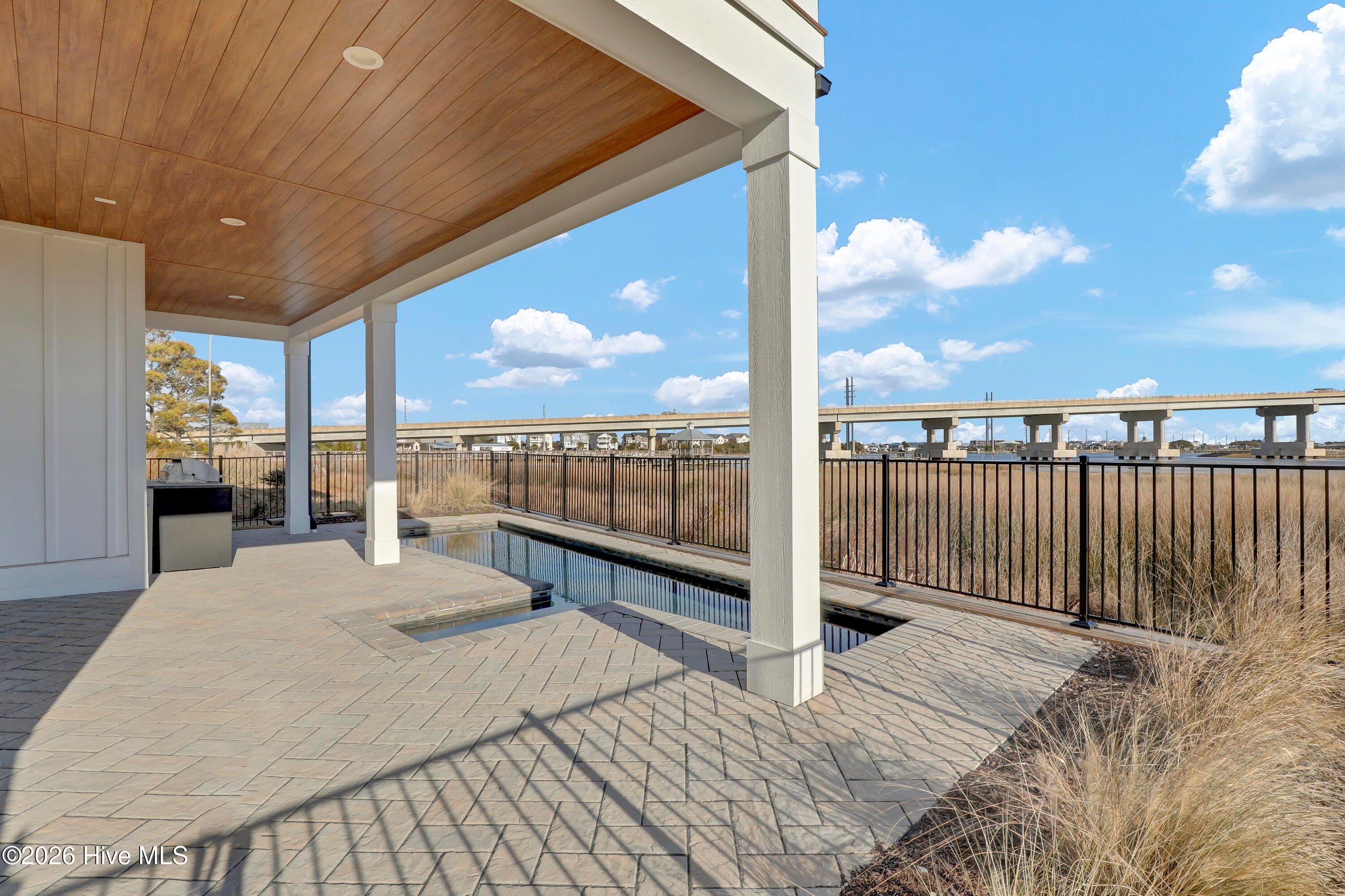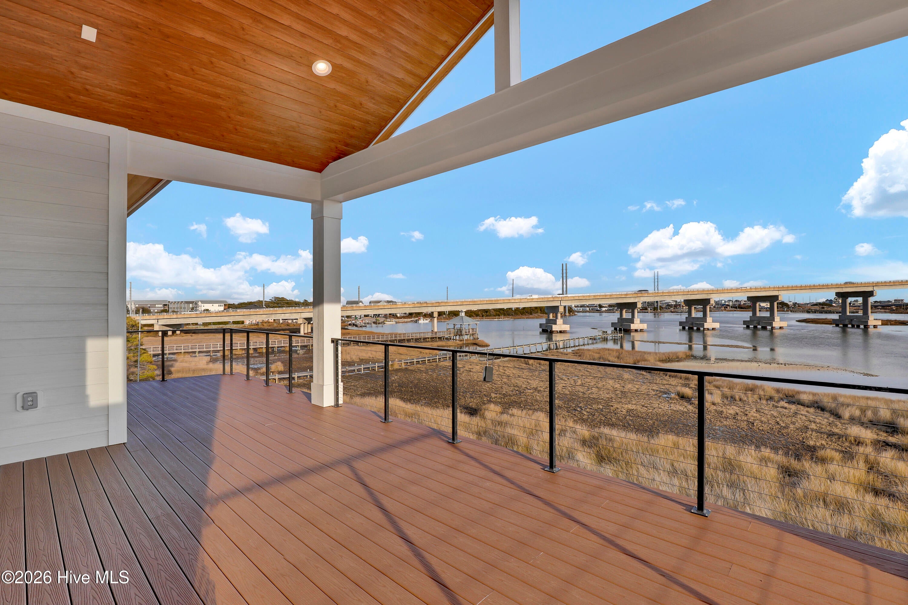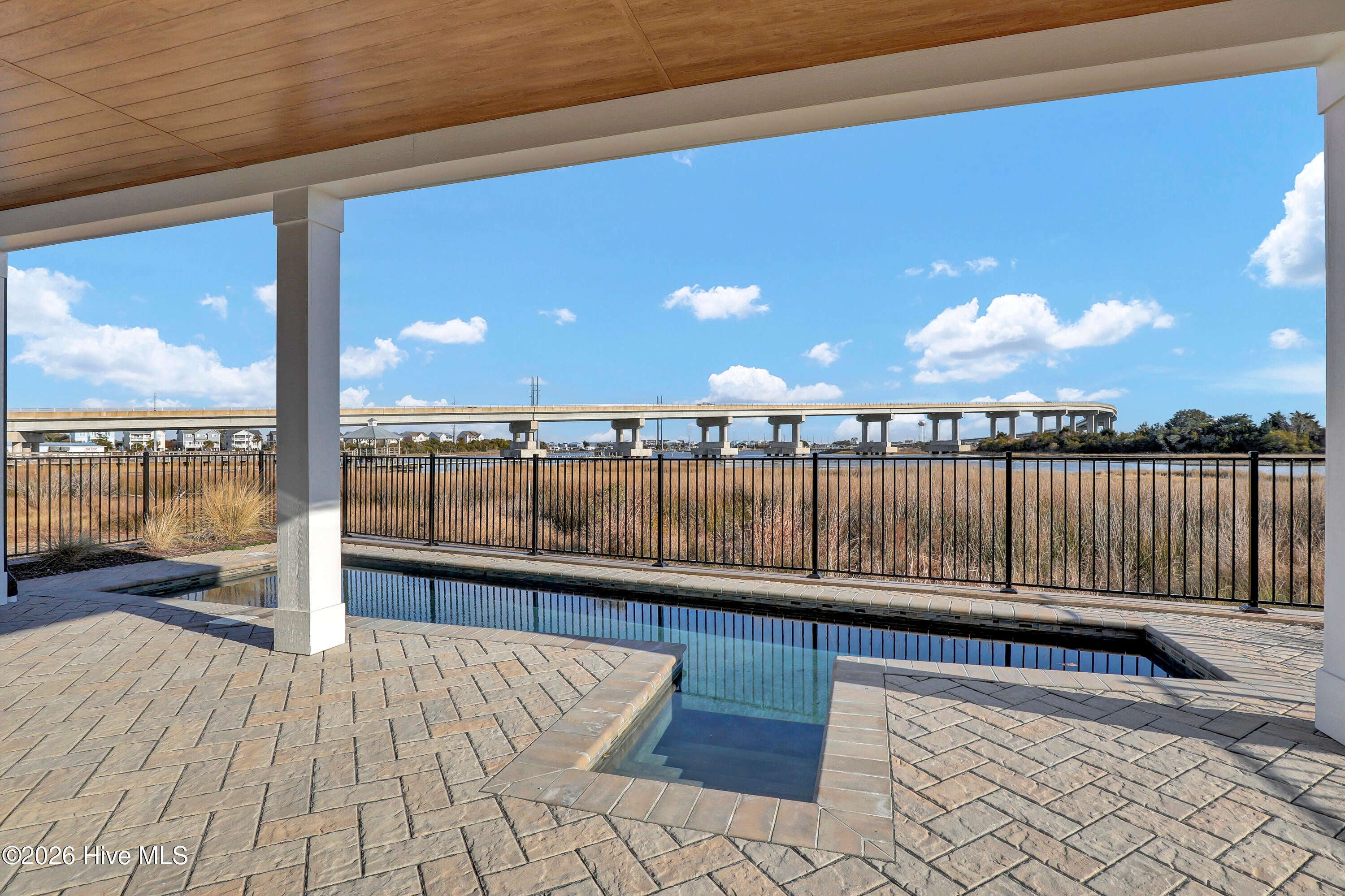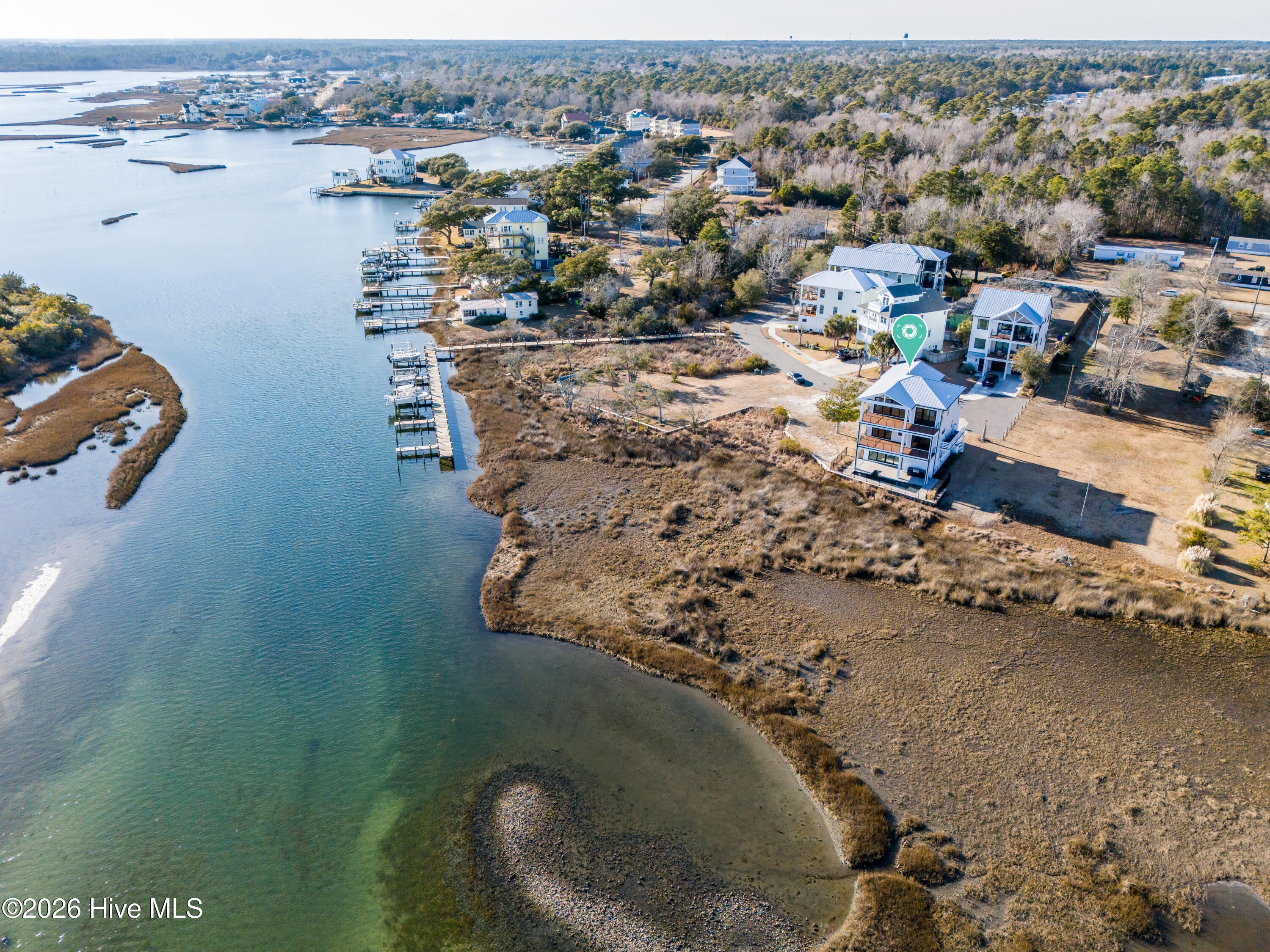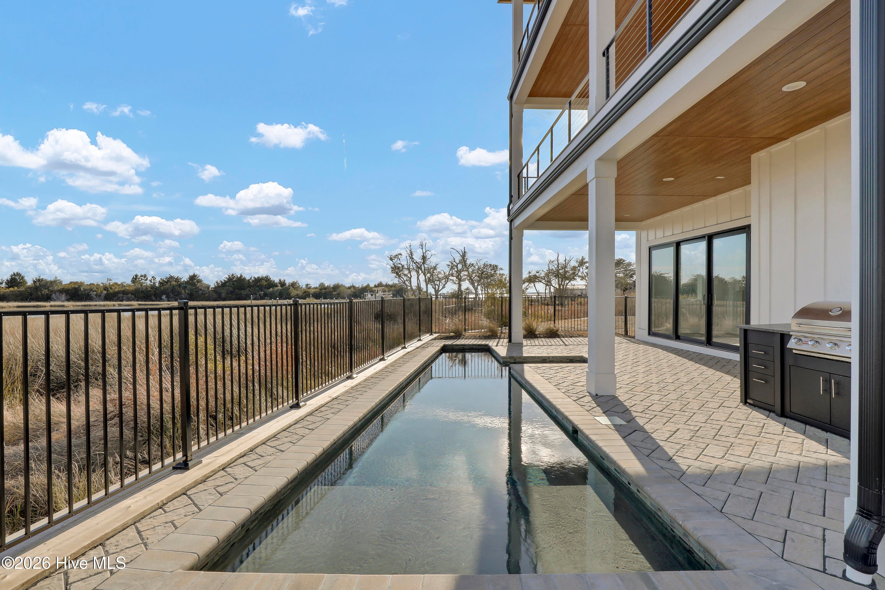 Experience the ultimate Surf City waterfront lifestyle at 113 Diamond Point, featuring panoramic Intracoastal Waterway views, a private boat dock with deeded boat slip, and a custom saline pool. This elevated coastal home offers nearly 2,700 heated square feet with 4 bedrooms and 3 full baths, all within walking distance to the Surf City bridge, shops, and dining. For a limited time, the builder is offering a 50,000 buyer credit that may be applied toward closing costs, a rate buy down, or approved upgrades. Built by Channel Marker Builders, this home showcases their newest floorplan, the Driftwood Cottage, designed with a reverse floorplan to maximize water views and natural light. The open concept layout features an oversized great room with vaulted ceilings, a tiled fireplace chase, and expansive covered porches capturing stunning ICWW views. The chefs kitchen includes upgraded soft close cabinetry, quartz countertops, under cabinet lighting, and a premium ZLINE appliance package with a 36 inch commercial style range, hood, microwave, refrigerator, and dishwasher. Designed for durability and coastal performance, the home is constructed on an engineered piling foundation and features fiber cement siding, Miratek wrapped porch columns, Sagiper wood grain PVC porch ceilings and soffits, Fiberon composite decking, a Galvalume standing seam metal roof, spray foam insulation, Low E windows, and a pervious concrete driveway. Two black steel Clopay Avante garage doors enhance the modern coastal exterior. Interior highlights include 10 foot ceilings on all three levels, HDF laminate flooring throughout main living areas, large 1x8 baseboards, craftsman style trim, 7 inch crown molding, 8 foot interior doors, custom site built closet shelving, and a sand and finish staircase with custom cable railing. The primary suite offers a spa inspired bath with a custom walk in tiled shower, oversized niche, and Moen U four function digital shower system with rain head, standard