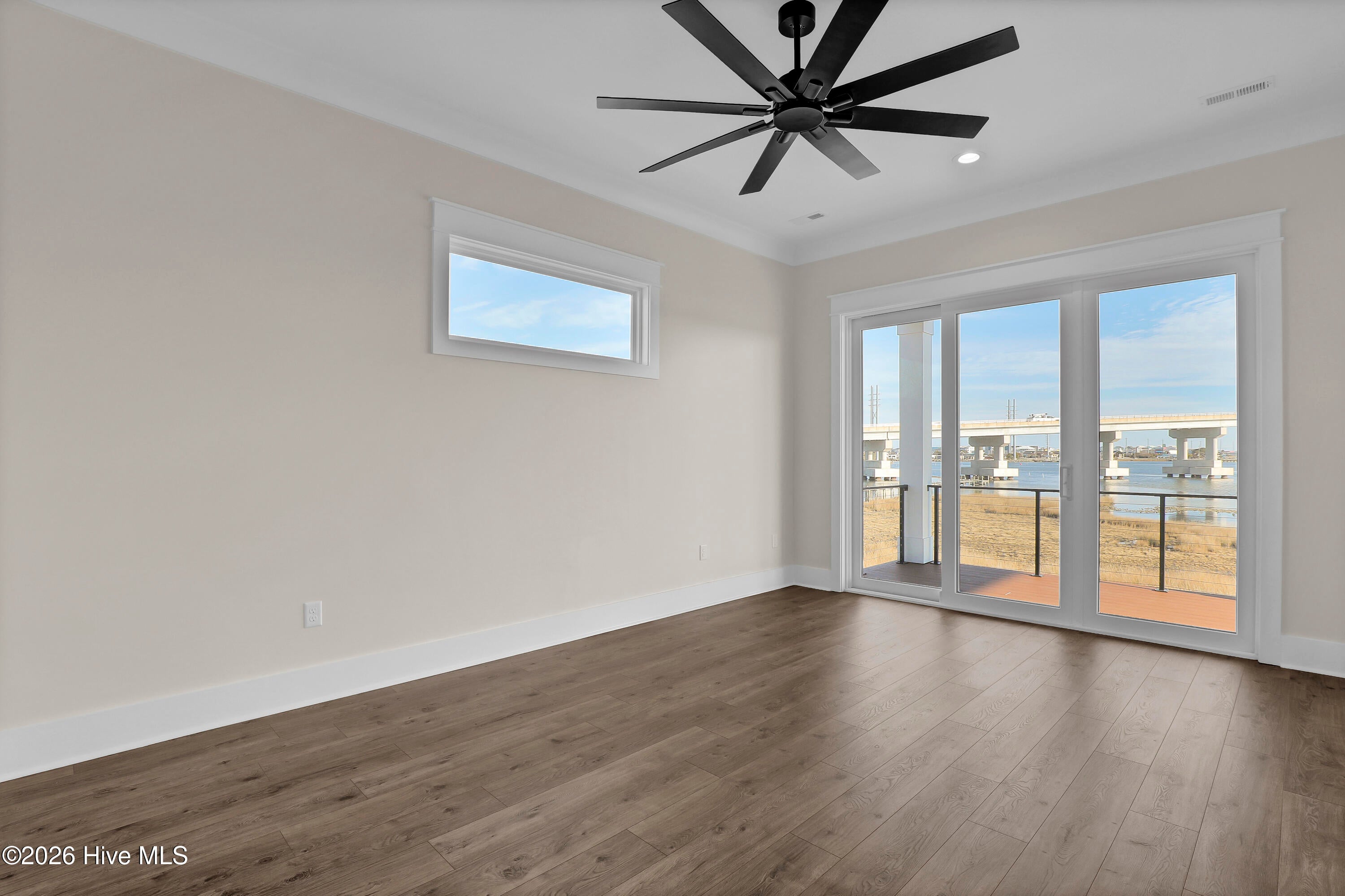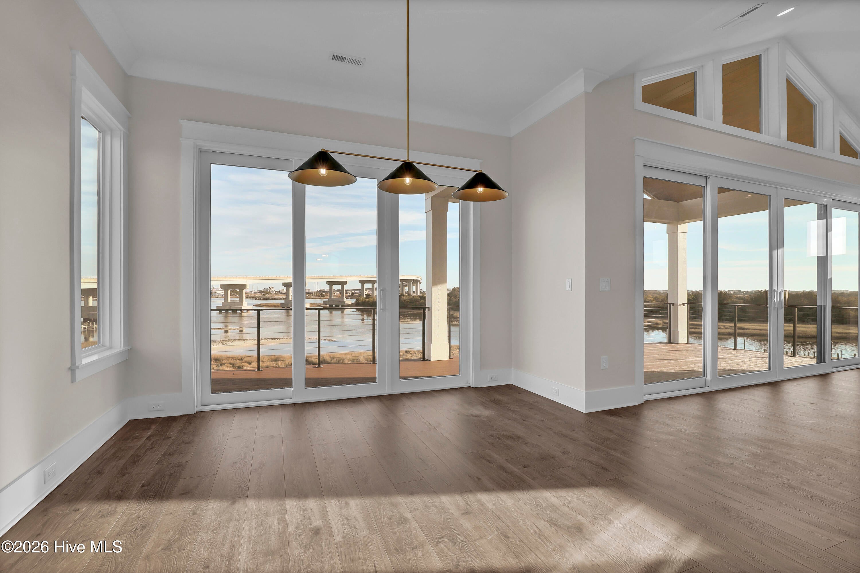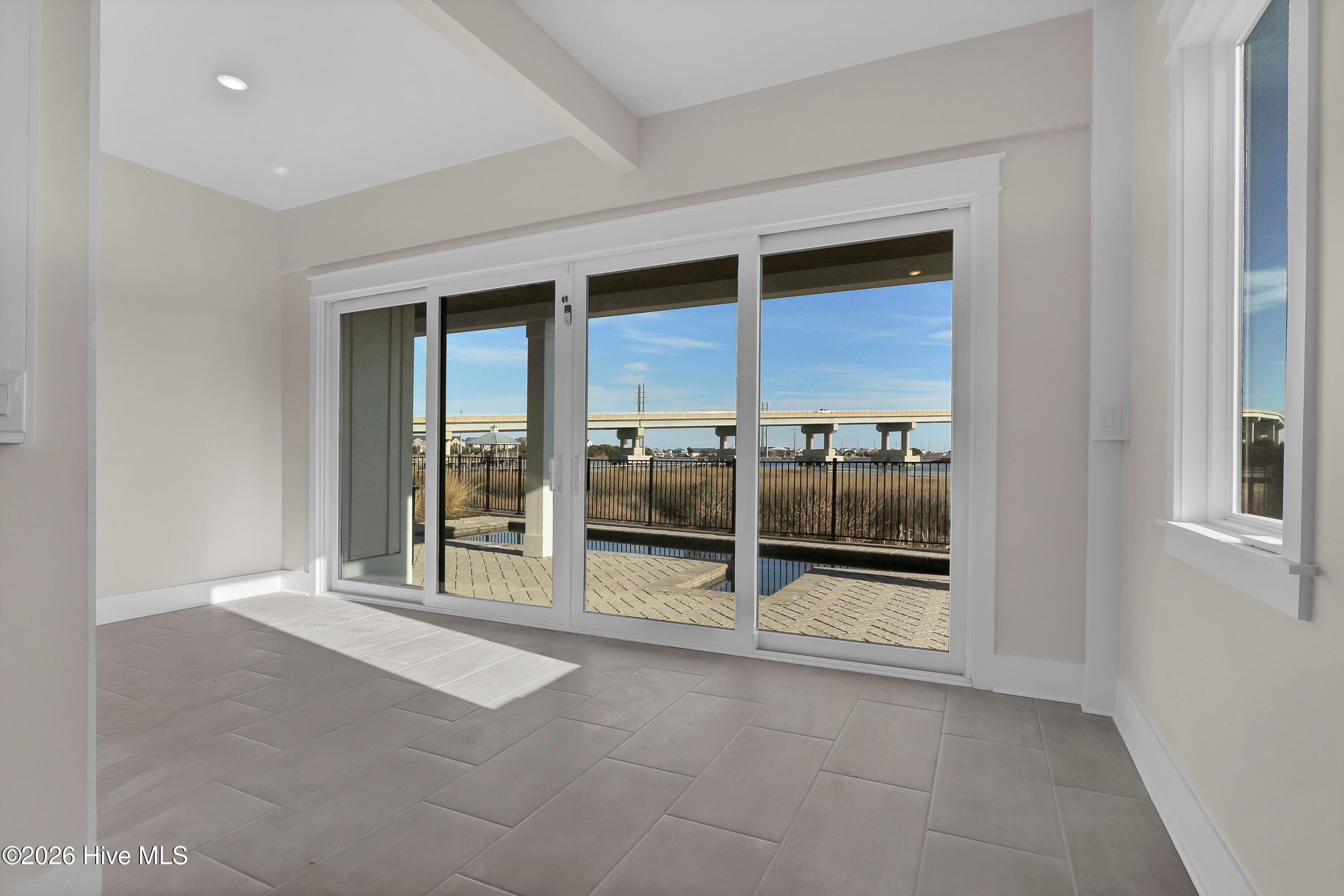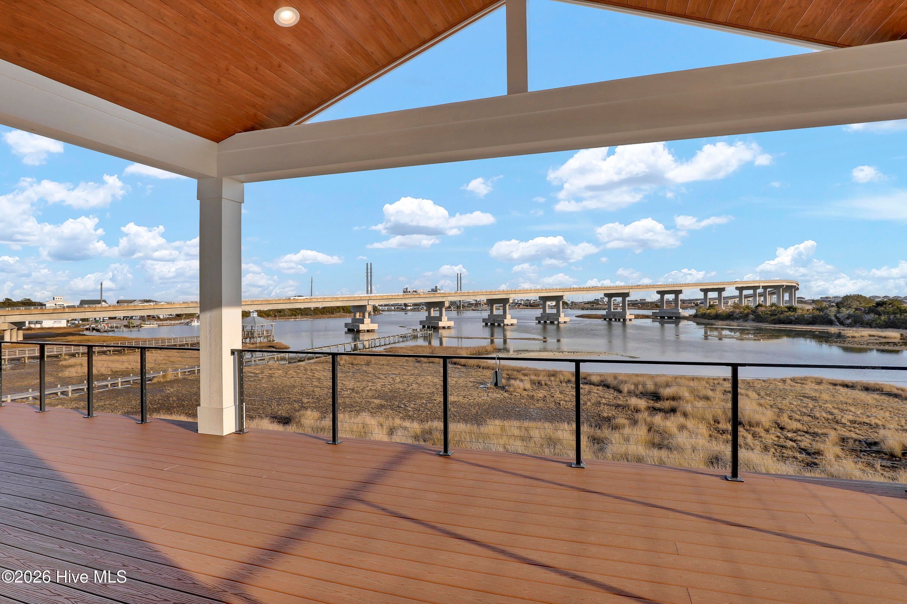 Experience the ultimate Surf City waterfront lifestyle at 113 Diamond Point, featuring panoramic Intracoastal Waterway views, a private boat dock with deeded boat slip, and a custom saline pool. This elevated coastal home offers nearly 2,700 heated square feet with 4 bedrooms and 3 full baths, all within walking distance to the Surf City bridge, shops, and dining. For a limited time, the builder is offering a 50,000 buyer credit that may be applied toward closing costs, a rate buy down, or approved upgrades. Built by Channel Marker Builders, this home showcases their newest floorplan, the Driftwood Cottage, designed with a reverse floorplan to maximize water views and natural light. The open concept layout features an oversized great room with vaulted ceilings, a tiled fireplace chase, and expansive covered porches capturing stunning ICWW views. The chefs kitchen includes upgraded soft close cabinetry, quartz countertops, under cabinet lighting, and a premium ZLINE appliance package with a 36 inch commercial style range, hood, microwave, refrigerator, and dishwasher. Designed for durability and coastal performance, the home is constructed on an engineered piling foundation and features fiber cement siding, Miratek wrapped porch columns, Sagiper wood grain PVC porch ceilings and soffits, Fiberon composite decking, a Galvalume standing seam metal roof, spray foam insulation, Low E windows, and a pervious concrete driveway. Two black steel Clopay Avante garage doors enhance the modern coastal exterior. Interior highlights include 10 foot ceilings on all three levels, HDF laminate flooring throughout main living areas, large 1x8 baseboards, craftsman style trim, 7 inch crown molding, 8 foot interior doors, custom site built closet shelving, and a sand and finish staircase with custom cable railing. The primary suite offers a spa inspired bath with a custom walk in tiled shower, oversized niche, and Moen U four function digital shower system with rain head, standard