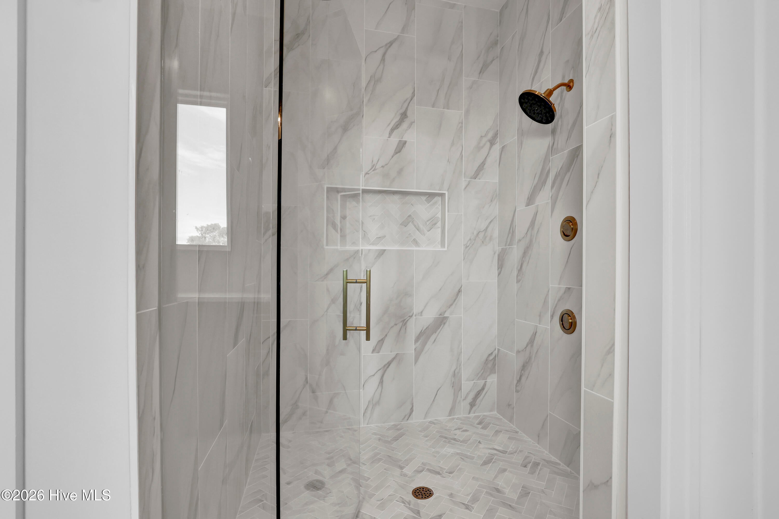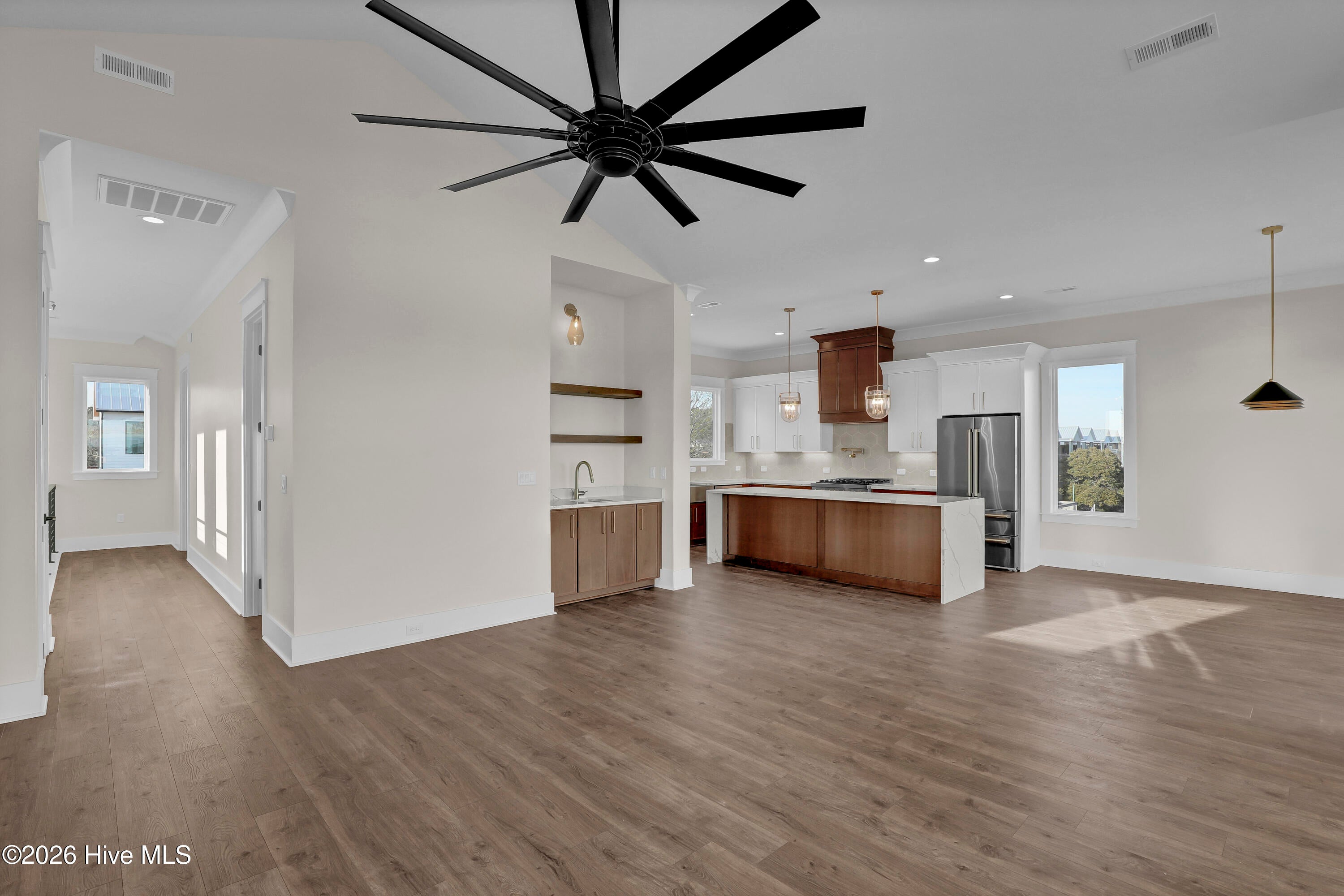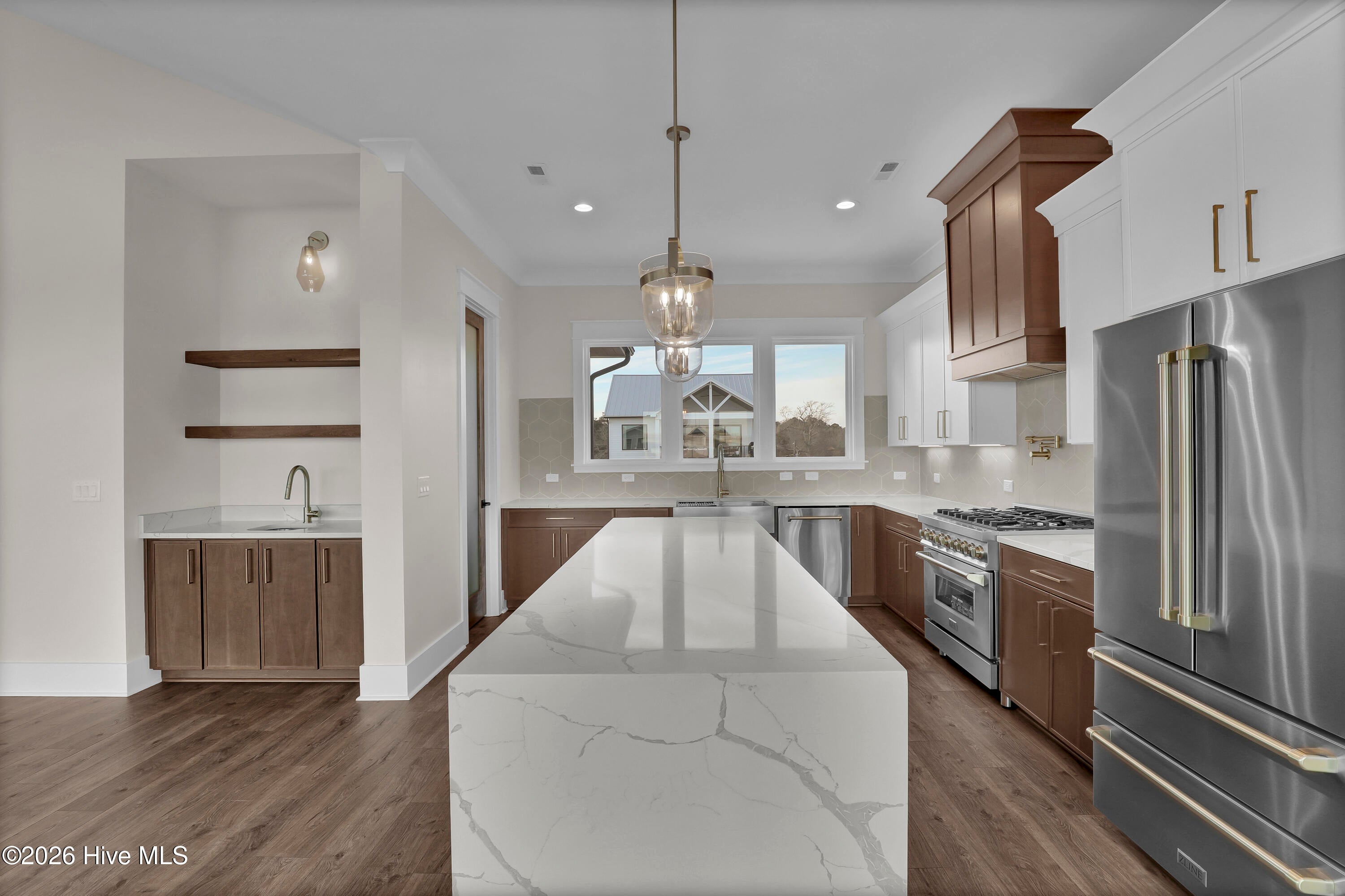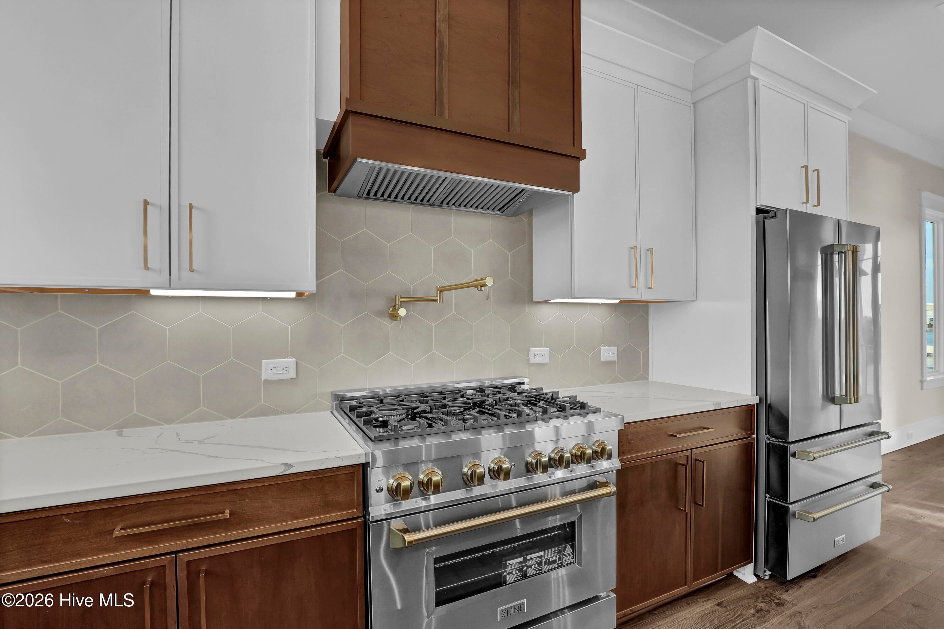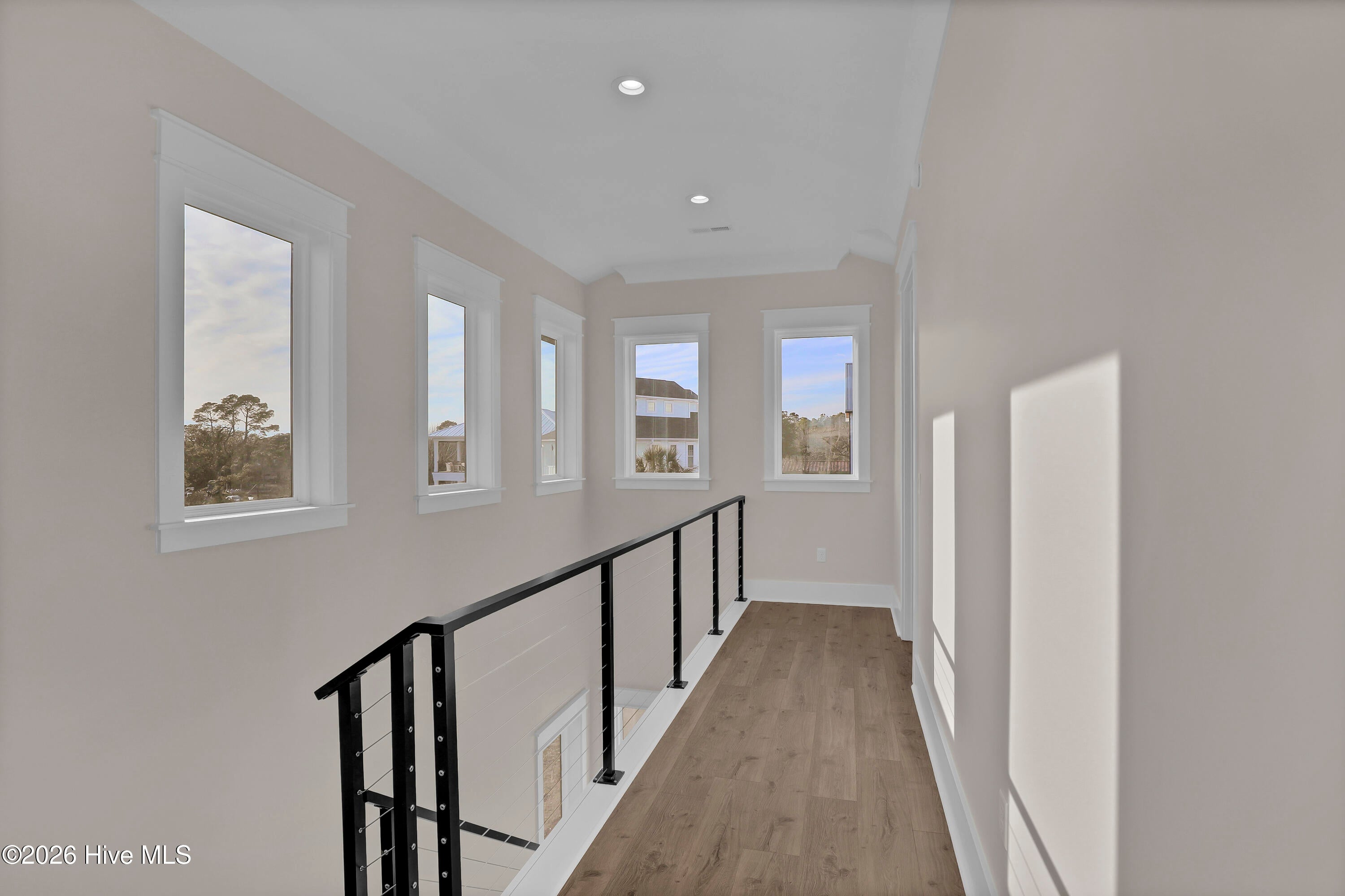 Experience the ultimate Surf City waterfront lifestyle at 113 Diamond Point, featuring panoramic Intracoastal Waterway views, a private boat dock with deeded boat slip, and a custom saline pool. This elevated coastal home offers nearly 2,700 heated square feet with 4 bedrooms and 3 full baths, all within walking distance to the Surf City bridge, shops, and dining. For a limited time, the builder is offering a 50,000 buyer credit that may be applied toward closing costs, a rate buy down, or approved upgrades. Built by Channel Marker Builders, this home showcases their newest floorplan, the Driftwood Cottage, designed with a reverse floorplan to maximize water views and natural light. The open concept layout features an oversized great room with vaulted ceilings, a tiled fireplace chase, and expansive covered porches capturing stunning ICWW views. The chefs kitchen includes upgraded soft close cabinetry, quartz countertops, under cabinet lighting, and a premium ZLINE appliance package with a 36 inch commercial style range, hood, microwave, refrigerator, and dishwasher. Designed for durability and coastal performance, the home is constructed on an engineered piling foundation and features fiber cement siding, Miratek wrapped porch columns, Sagiper wood grain PVC porch ceilings and soffits, Fiberon composite decking, a Galvalume standing seam metal roof, spray foam insulation, Low E windows, and a pervious concrete driveway. Two black steel Clopay Avante garage doors enhance the modern coastal exterior. Interior highlights include 10 foot ceilings on all three levels, HDF laminate flooring throughout main living areas, large 1x8 baseboards, craftsman style trim, 7 inch crown molding, 8 foot interior doors, custom site built closet shelving, and a sand and finish staircase with custom cable railing. The primary suite offers a spa inspired bath with a custom walk in tiled shower, oversized niche, and Moen U four function digital shower system with rain head, standard