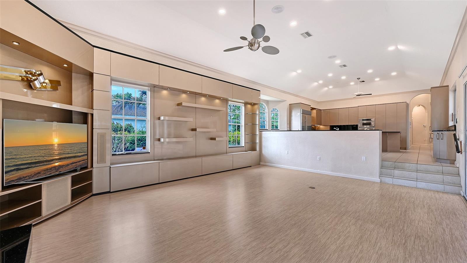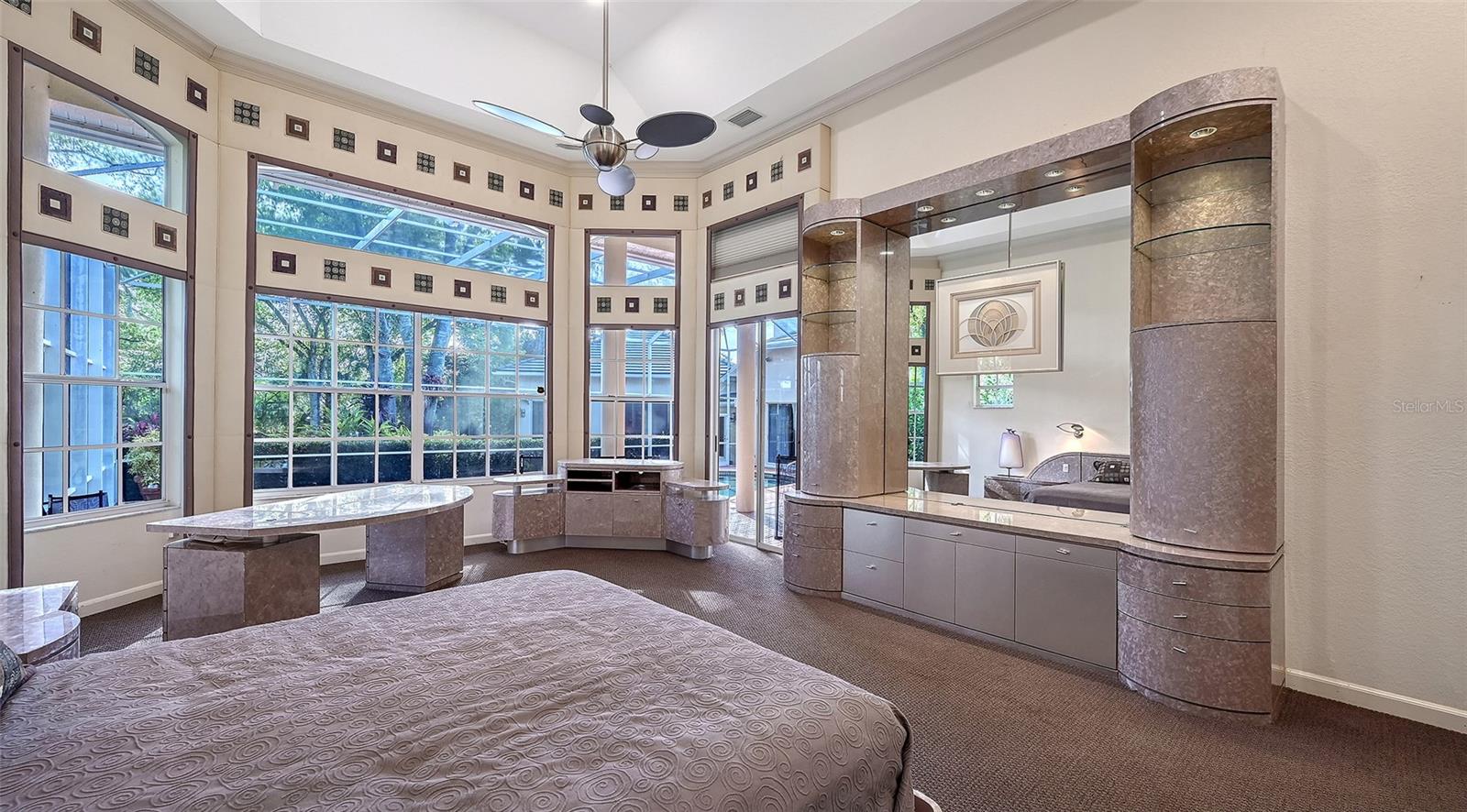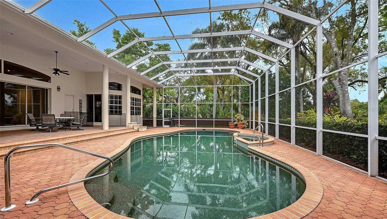 This expansive 6BR, 5.5-bath estate offers 5,154 sq. ft. of luxurious living on nearly an acre, set back from the road with a circular paver driveway, lush landscaping, and a side-entry, climate-controlled three-car garage. The driveway provides ample parking for guests, and a pathway to the private entrance to the 2BR, 2-bath suiteideal for multigenerational living. Step through one-of-a-kind custom art leaded glass doors, into a dramatic open entertaining space, with soaring ceilings that continue throughout the home. Sliding doors across the living room, connecting the indoors to the expansive 2,650sqft lanai and pool (45x17). The formal dining area is highlighted by a stunning Murano glass chandelier. The homes sophisticated finishes reflect a thoughtful collaboration with interior designer Anne Folsom Smith. The kitchen and family room flow seamlessly together, with matching custom cabinetry. Premium stainless steel appliances, including a double oven, warming drawer, Miele dishwasher, and Sub-Zero refrigerator. second prep sink with instant hot water, conveniently located in the spacious stone-top center island alongside a second dishwasher. Custom designer cabinetry includes a large pantry and a built-in bar.Privately located on the far left wing of the home, the primary suite is a true retreat. The bedroom features built-in furnishings, expansive windows, elevated ceilings, and direct private access to the lanai and pool. A hallway with dual walk-in closets leads to a spa-inspired bathroom with oversized jetted tub, dual vanities, multi-head shower with bench, linen closet, private water closet, and a dedicated tankless hot water system. The secondary bedrooms are generously sized, including a flexible room currently set up as an office on the primary wing. A full bathroom provides convenient lanai and pool access. Enhancing the homes versatility is a private two-bedroom, two-bath suite designed as a fully independent living space. Thoughtfully set apart yet seamlessly connected to the main residence by a light-filled vestibule off the family room, this exceptional retreat offers both privacy and ease. The vestibule features dual glass doorsone opening to a private rear entrance with its own patio, the other providing direct access to the screened poolcreating an ideal setting for guests or multigenerational living. Inside, a central living area unites the bedrooms and showcases custom built-ins alongside a well-appointed kitchenette with sink, disposal, generous counter space, and a full-size side-by-side refrigerator. A dedicated laundry and utility closet with washer and dryer, storage, and a separate hot water heater enhances convenience, while an independent HVAC system ensures year-round comfort with complete autonomy. The screened pool area offers a private, resort-style setting with expansive lanai. Sliding glass doors from the living, dining, kitchen, family rooms, and primary suite create seamless indoor-outdoor flow, ideal for both everyday living & large-scale entertaining. The layout easily accommodates sizable seated gatherings, with a natural transition between the homes interior spaces and the lanai.Additional highlights include impact windows in the guest suite, whole-house water filtration and softening, central vacuum, four HVAC systems (including garage), irrigation system with new tank, electric pool heater, propane generator, three garbage disposals, two dishwashers, and a roof replaced in 2020.