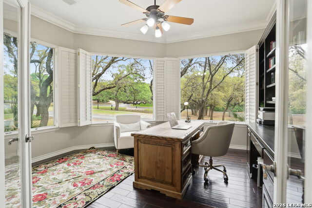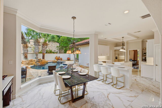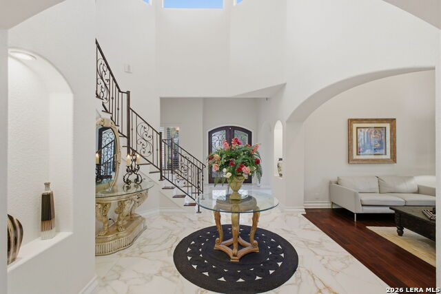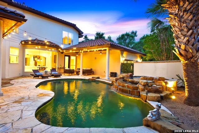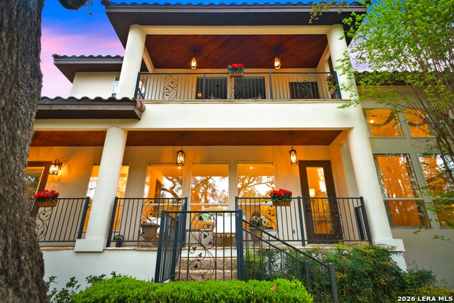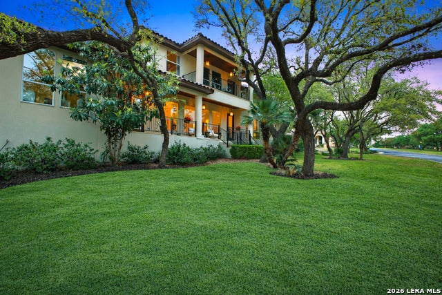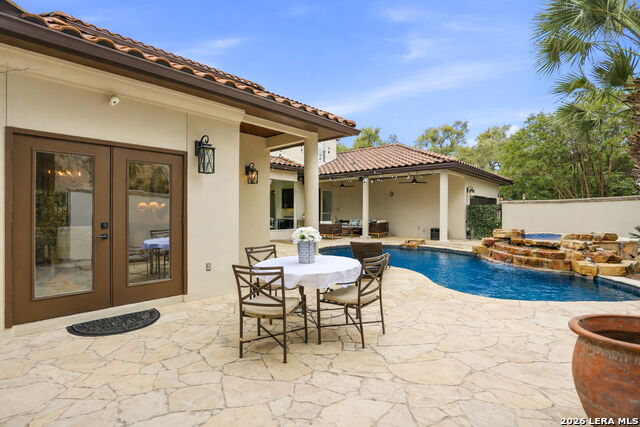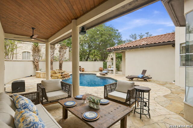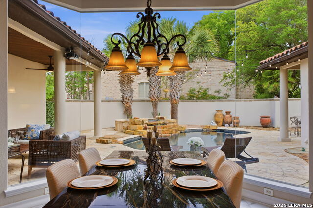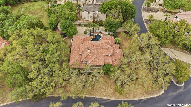 Welcome home to 1 Belcourt Place inside the Dominion! Enjoy over half an acre of mature trees and lush green space inside the highly sought after neighborhood. Host your friends at your pool equipped with the Outdoor projector and sound system entertainment package everyone will be talking about. Send your kiddos off to school with the bus route stopping right at your house. Walk out your front door and enjoy the holiday festivities on the greenbelt directly in front of your home. You even have your very own Golf Cart Garage! Seller has invested significantly in high-quality renovations throughout, including a fully updated chefs kitchen with quartz countertops, backsplash, farmhouse sink, premium faucet, new appliances, and induction cooktop with Sub-Zero refrigerator. Flooring and finishes have been upgraded across the home, creating a modern, move-in-ready luxury feel Home offers 4 bedrooms, 5 baths, Office, Three spacious living areas on the main level plus an additional upstairs living area, and a large formal dining room with direct access to the pool-perfect for large gatherings. The backyard is a private retreat with a stunning heated pool, spa, covered patio, and three palm trees-perfect for entertaining, Two balconies overlook a park, with walking access to scenic Dominion lakes and trails. Located in a highly desirable school zone. The spacious ground floor primary suite features a glamorous bathroom with dual vanities, dual closets, and a walk-through shower and soaking tub. Gorgeous hard wood flooring throughout the Master bedroom. The primary suite features a stunning wall of windows overlooking the serene park and mature trees, filling the space with natural light. Enjoy direct access to a spacious private balcony-perfect for morning coffee or unwinding in the evening surrounded by sunshine and the peaceful sounds of nature. The windows are enhanced with upgraded motorized shades, easily controlled at the touch of a button for added comfort and convenience. The breakfast area is highlighted by a dramatic wall of windows overlooking the private pool and palm trees, bringing in abundant natural light and a true indoor-outdoor living experience. This home is a rare find, ideally located directly across from a serene park, offering exceptional privacy with no homes immediately in front. The spacious main level features multiple living areas, creating an open and comfortable layout that feels both expansive and highly functional. A full bathroom with direct access from the pool area adds everyday convenience. The spacious main level features multiple living areas, creating an open and comfortable layout that feels both expansive and highly functional. This home is truly one of a kind!
