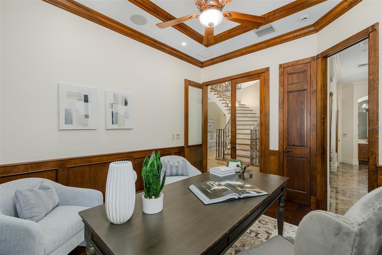 One or more photo(s) has been virtually staged. Welcome to Champions Club Where Luxury Meets an Unrivaled Setting Nestled on one of the most coveted lots in the desirable Champions Club community, this breathtaking custom Campagna home offers a rare combination of water and golf course views along the prestigious Fox Hollow Golf Course. Spanning an impressive 4,657 square feet, this architectural masterpiece delivers 4 bedrooms, 3 full baths, 2 half baths, a private study, bonus/game room, and an upstairs loft a thoughtfully designed home that effortlessly balances grand entertaining with everyday comfort. Step inside and be immediately captivated by the formal living rooms soaring ceilings, custom gas fireplace, and stunning travertine flooring. The formal dining room offers an elegant setting for entertaining, complete with an adjacent butlers pantry. The custom gourmet kitchen is a chefs dream, equipped with top-of-the-line appliances, a custom hood, 6-burner gas cooktop, and a spacious walk-in pantry. A sunny breakfast nook overlooks the sparkling pool the perfect spot to start your morning. The warm and inviting family room impresses with a custom coffered ceiling, gas fireplace, and rich hardwood flooring, creating the ideal gathering space for family and friends. The bonus/game room, adorned with gorgeous wood accents, is the ultimate hangout destination. The first-floor primary suite is a true retreat, offering a private sitting area with stunning pool and golf course views. The spa-inspired en suite bath pampers with his and her vanities, a custom shower, a relaxing soaking tub, and two spacious walk-in closets. A private study located just off the primary suite provides a seamless transition to a dedicated home office. A half bath and a roomy laundry room complete the first floor. A breathtaking wrought iron and wood staircase leads to the second floor, where three oversized bedrooms each with walk-in closets await. One features its own private en suite bath, while the other two share a well-appointed Jack & Jill bathroom. An upstairs loft with a wall of custom bookcases serves as the perfect reading nook or second office. Step outside onto the rooftop balcony and take in the sweeping views the ideal place to unwind at the end of the day. Additional highlights include a newer HVAC system, solid wood doors throughout, exceptional custom millwork and architectural detailing, and a BRAND NEW ROOF. This extraordinary home sits on one of the most premium lots in all of Champions Club, offering unobstructed water and golf course views that simply cannot be replicated. Champions Club is a Premier Golf Course Community, Conveniently Located Close to Many Shops, Restaurants, Medical Facilities, Short Drive to Many Local Beaches, Short Drive to Tampa International Airport, Clearwater/St. Pete Airport & Much More! Zoned for Excellent Trinity Schools! Trinity Elementary * Seven Springs Middle * J.W. Mitchell This is not just a home it is a lifestyle!