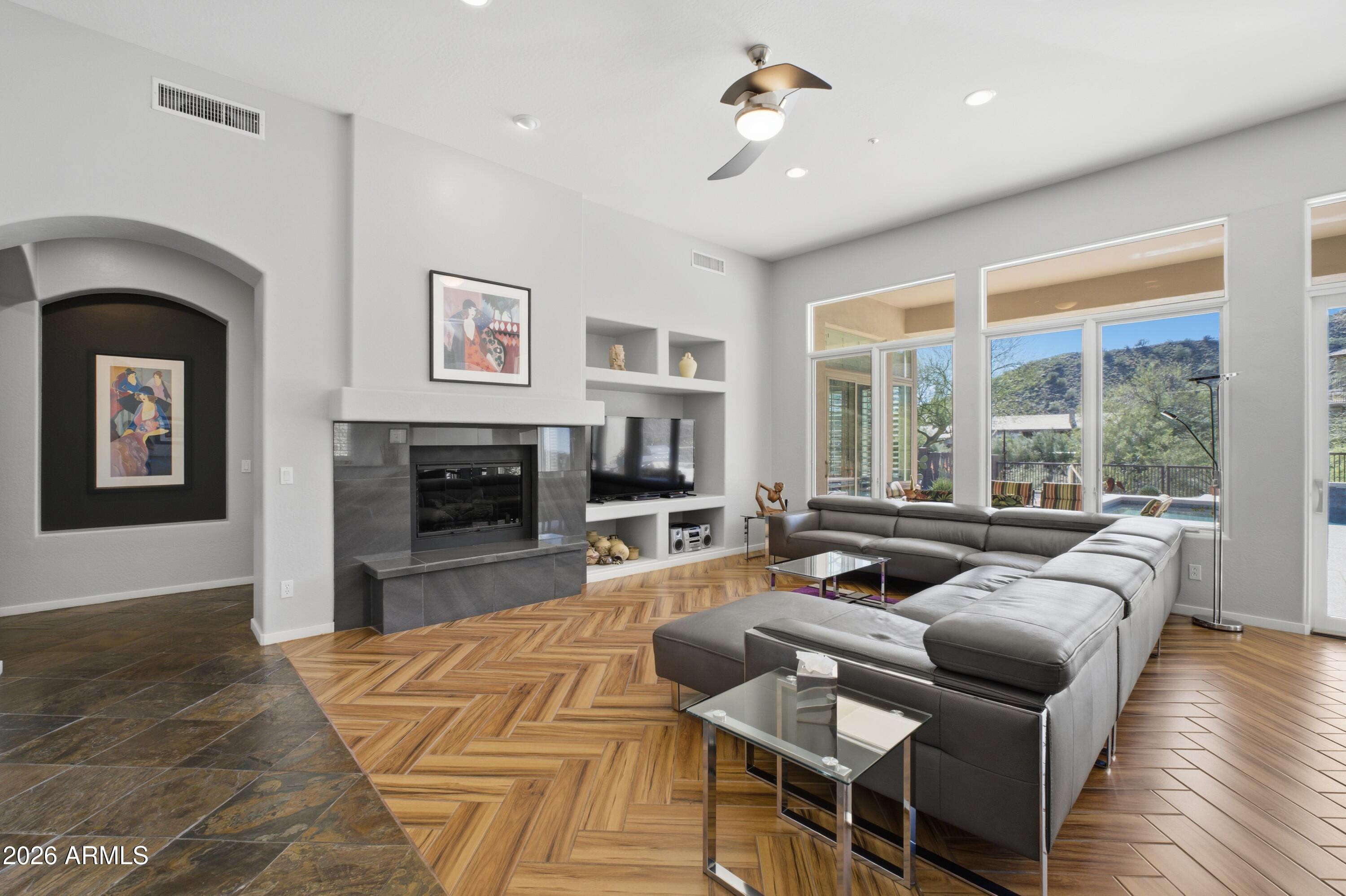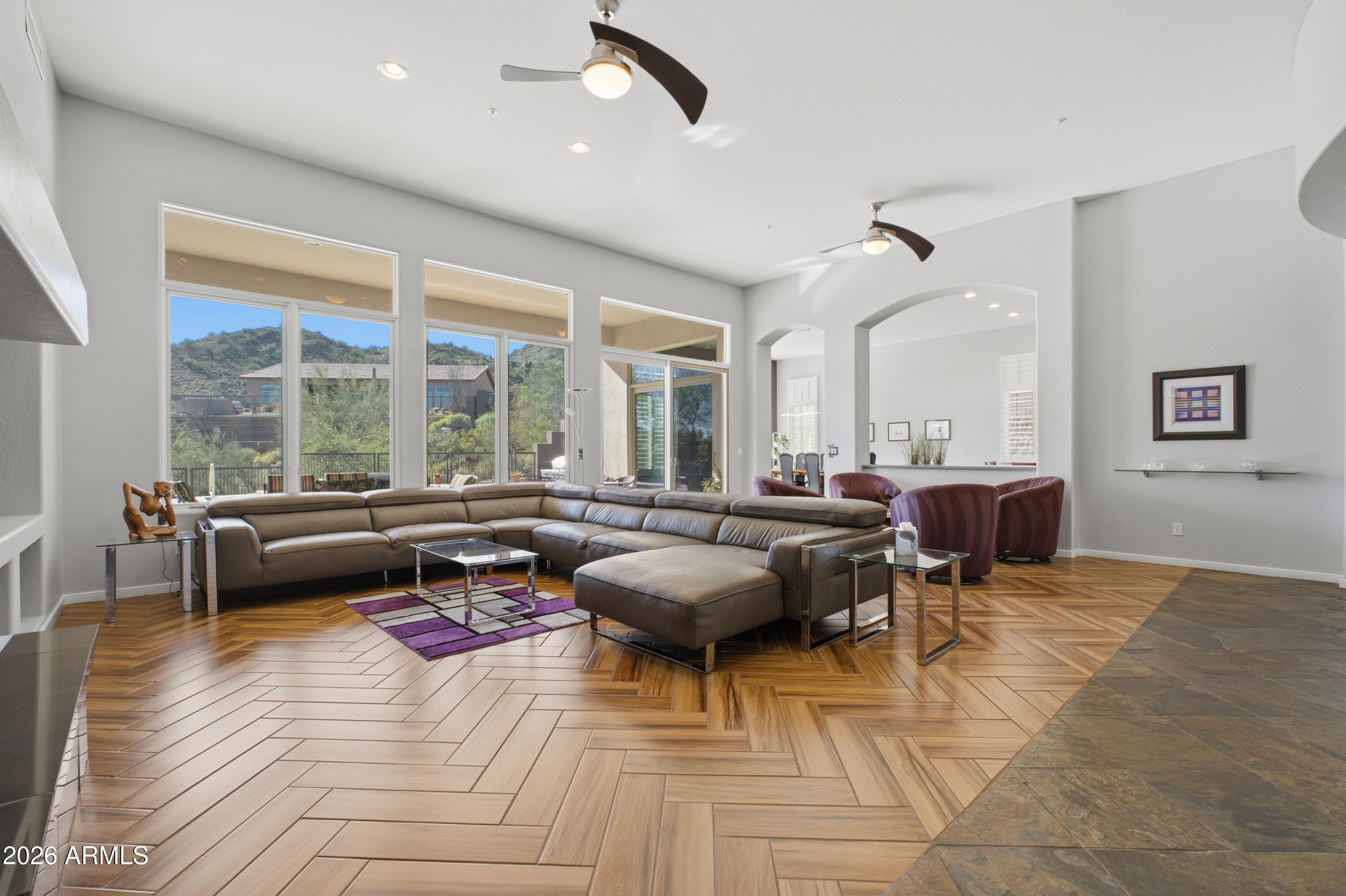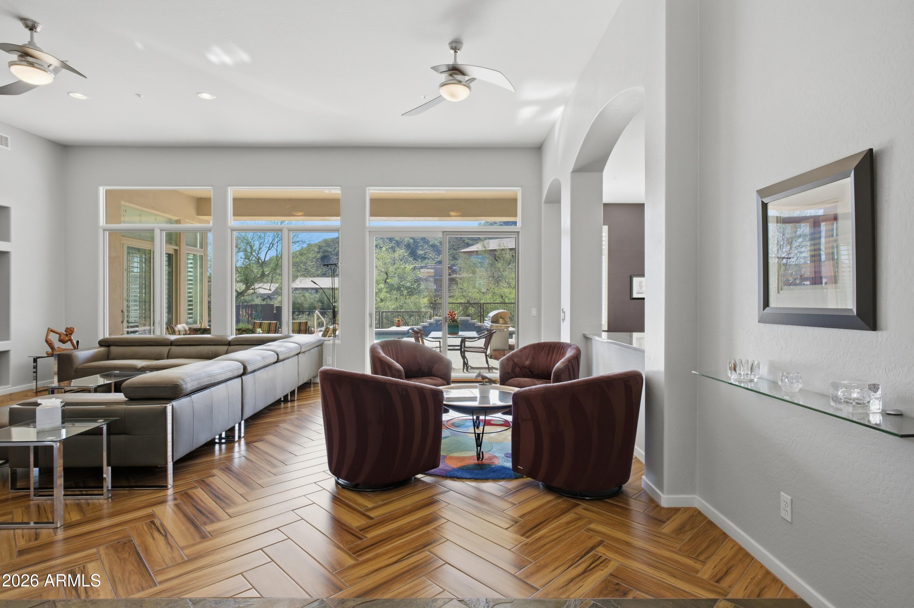 Tucked inside Hidden Hills in Scottsdale, this beautifully maintained desert retreat delivers the privacy buyers cravebacking to a natural arroyo with no homes across the street for open space, peaceful views, and true indoor/outdoor serenity. Enter through a gated courtyard into a light-filled, soaring-ceiling interior with expansive windows and an inviting open layout.The gourmet kitchen shines with quartz countertops, crisp white cabinetry, a generous island, and a Wolf gas rangetopideal for entertaining or everyday living. The expansive primary suite features a sitting area, oversized walk-in closet, and spa-style bath with soaking tub and separate shower. A flexible den/office can also serve as a 5th bedroom.Enjoy a resort-style backyard with covered patio, sparkling pool... and picturesque McDowell Mountains backdropplus nearby scenic trails for hiking and exploring. New AC, excellent upkeep, and a rare private setting make this home a standout value in a premier gated location.