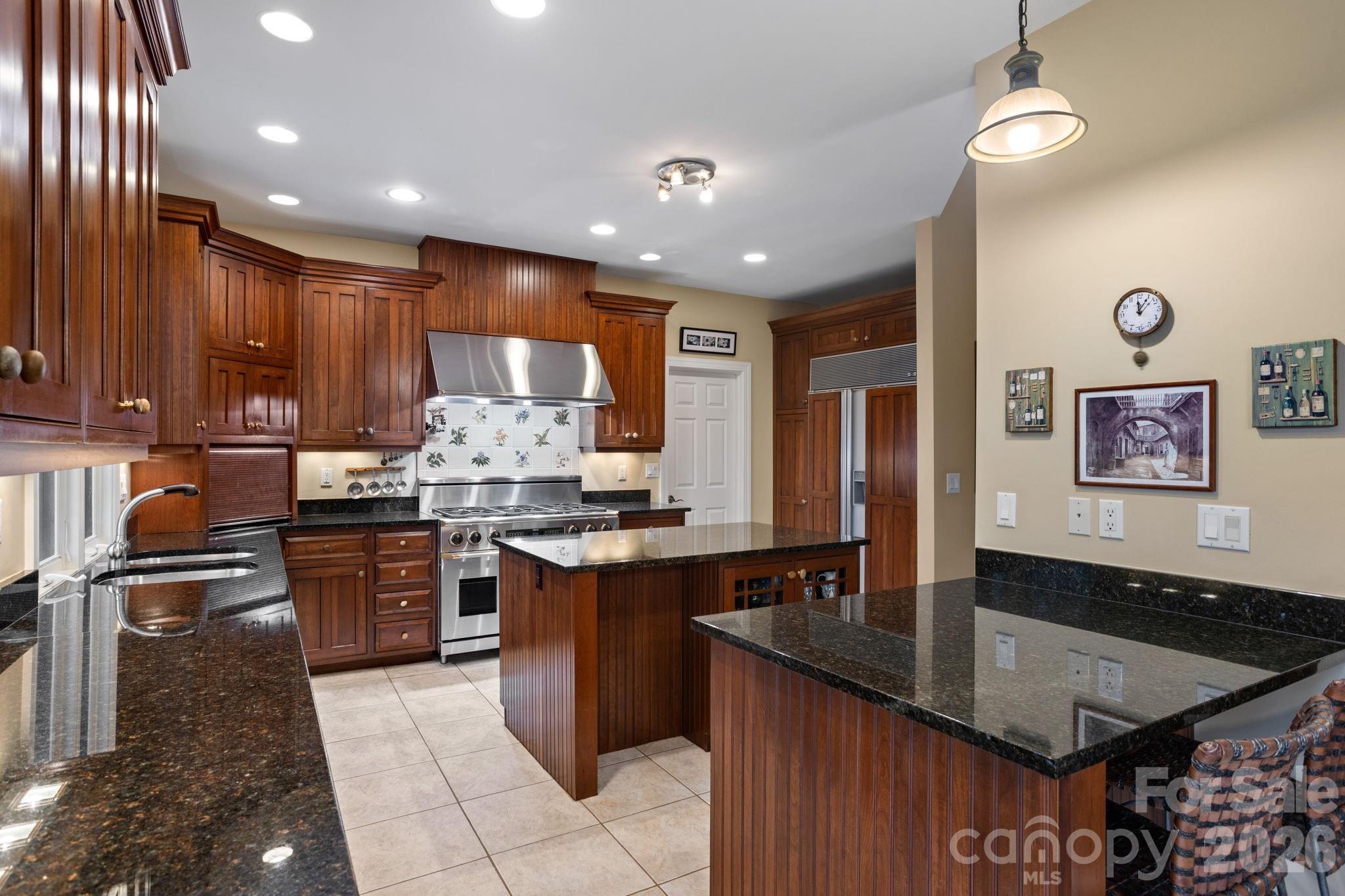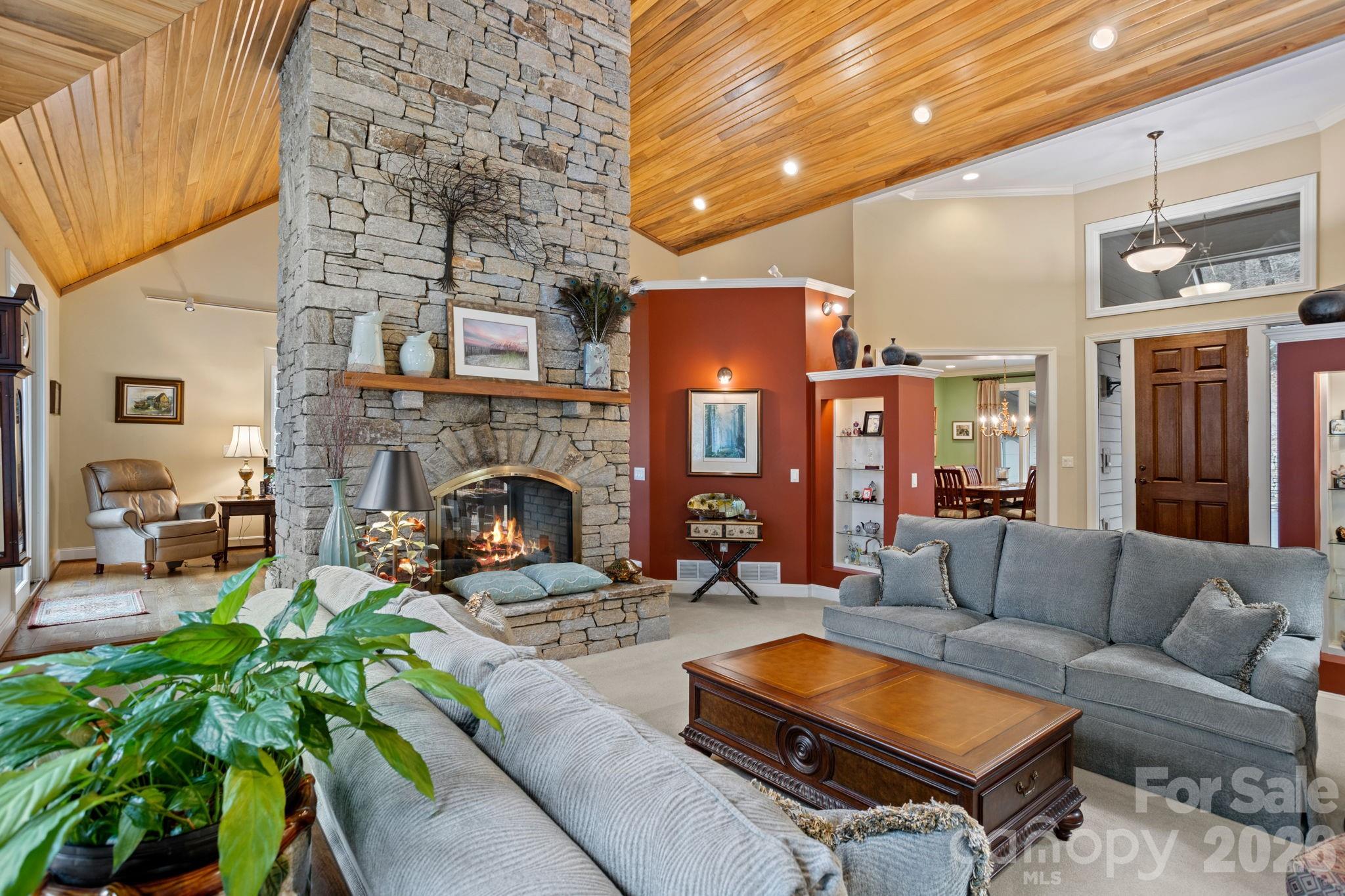 Exceptional luxury home situated on 2 private acres overlooking the signature 17th hole in prestigious Kenmure, a gated golf course community. This truly unique property is surrounded by mountain streams and cascading waterfalls that flow throughout the grounds, creating a peaceful and private mountain retreat. The main level features an outstanding great room with soaring vaulted ceilings and tongue-and-groove willow wood ceiling, complemented by an impressive floor-to-ceiling wall of windows showcasing the natural setting. A stunning stone gas fireplace anchors the space and opens seamlessly to a den/TV room with custom built-insideal for entertaining and gathering with guests. The expansive gourmet kitchen is designed for the serious chef and entertainer, offering high-end stainless steel appliances, including a Dacor six-burner gas range with double ovens and exhaust hood. The sink area is flanked by two Fisher-Paykel dishwashers, along with an Sub-Zero refrigerator/freezer, two islands (one with breakfast bar), granite countertops, and an abundance of cabinetry with unique pull-outs. A breakfast bar and additional casual breakfast space further enhance the kitchens functionality. The dining room features a wall of windows, bringing the outdoors in. The expansive primary suite is a private retreat and offers a sitting area, walk-in closet with laundry chute, washer/dryer hook-up plus addl closet and a private sunroom accessed by 2 glass French doors overlooking the serene landscape and waterfalls. The spa-like bath includes a walk-in tile shower, Jacuzzi tub, double vanity, large linen closet and vaulted ceilings. Also on the main level is a beautiful study with large picture windows, palladium accents, walk-in closet, vaulted ceiling and tongue-and-groove willow wood ceiling. A gorgeous powder room with vessel sink and custom vanity adds elegance, while the mudroom off the garage includes an additional half bath. The lower level is perfect for entertaining, featuring a large family room/recreation area with bar, sink, beverage refrigerator, and seating. A dramatic floor-to-ceiling stone wood-burning fireplace is enhanced by a convenient dumbwaiter for transporting firewood. Two guest bedrooms and two en-suite guest baths complete this level. The laundry room offers cabinetry, sink, and a convenient laundry chute from the primary suite. Additional features include a dog-washing station and planting/garden area in mudroom and a heated and cooled workshop. Outdoor living is truly exceptional with multiple levels of decking, tranquil waterfalls, flowing streams, and private walking trails throughout the property with footbridge to the golf courseall while overlooking the 17th signature hole of the golf course. Additional highlights include a three-car garage with rear golf cart access and its own driveway, new roof, whole-house generator, two HVAC systems and two water heaters. Ideally located just minutes from the entry gate and Kenmures outstanding amenities. A rare opportunity to own a luxury mountain home offering privacy, views, and an unparalleled natural setting.