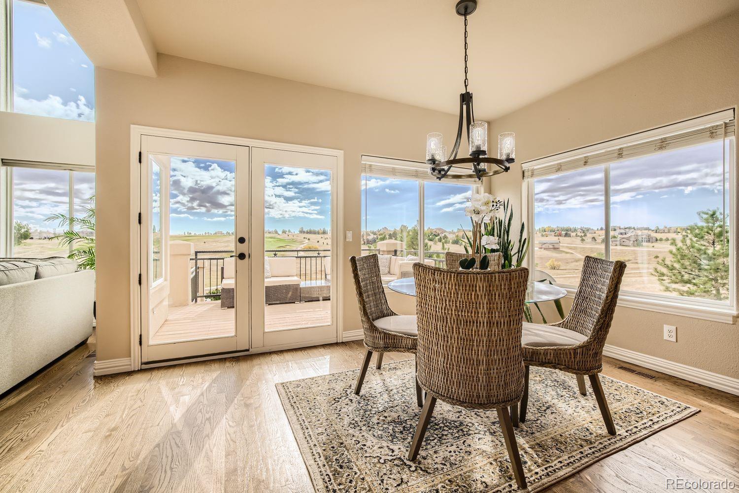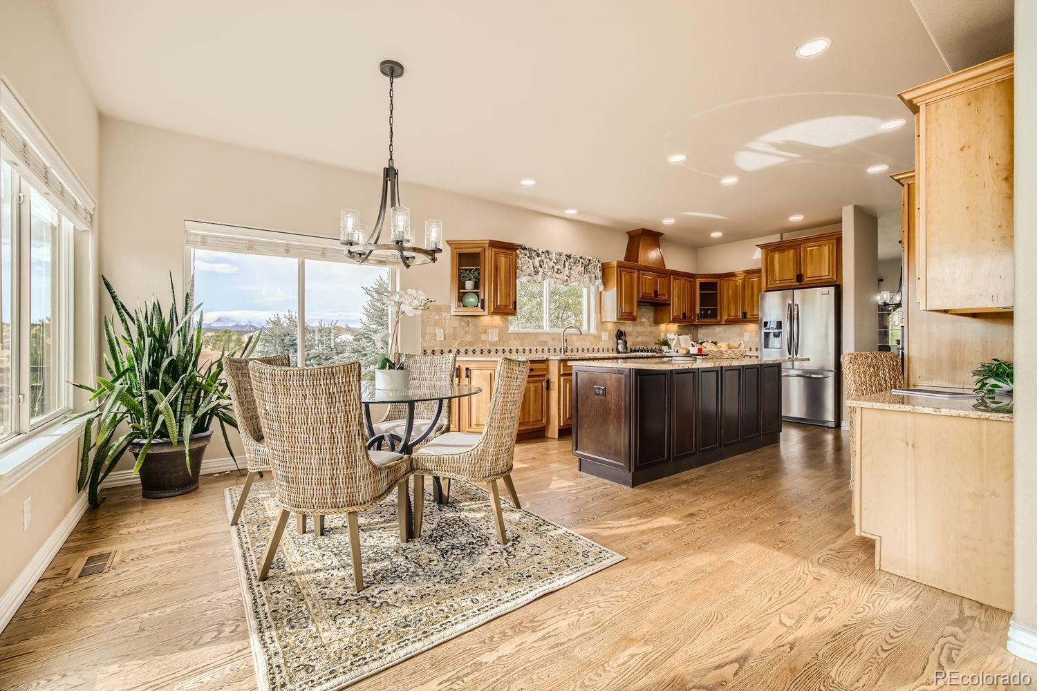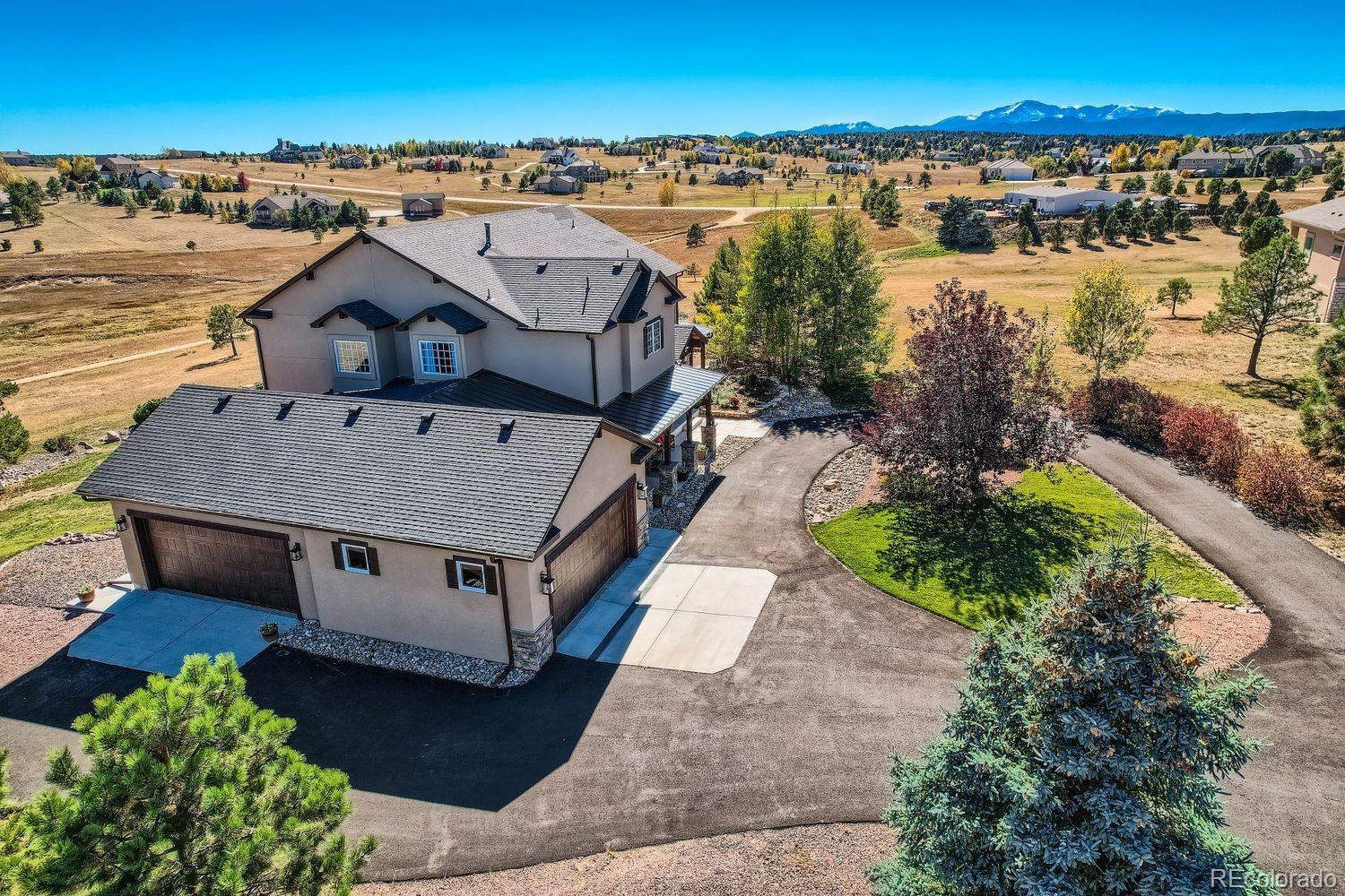 Enjoy this exceptional Colorado living experience on 2.5 acres with beautiful mountain views. Situated on the 18th tee box of Kings Deer Golf course lot in cul-de sac! Located in the highly sought after Kings Deer neighborhood and in the Lewis Palmer School District 38! Stunning views from every window. When you enter through the front door you will notice the impressive stair case & beautiful wood floors and lofty ceilings. This home has 6 bedrooms, 4 bathrooms and a 7-car garage! This gourmet kitchen is a chefs dream. Beautiful granite countertops & custom cherry wood cabinets, equipped with stainless steel appliances, a reverse Osmosis water system and plenty of space to spread out. Also, you will find a spacious eating area with amazing views and a walk-in pantry, formal dining room and private bath on main. Upstairs you will find the large primary suite with French doors, luxurious 5-piece bath, soaking tub, and a generous walk-in-closets and remote controlled blinds. In addition you will find 4 private bedrooms each with a bath & walk-in-closet. The fully finished basement is made for entertaining, featuring a home theater, antique bar, & a dedicated wine room. Theres also an additional suite with ample space for visitors. Outdoor living is just as inviting, with a large composite deck supported by elegant stucco columns & a lower-level patio pre-wired for a hot tub. Both spaces are ideal for entertaining, all while enjoying unparalleled views of Pikes Peak & golf course. Recently enhanced newly completed garage addition, offering space for 7 vehicles. The garage wall organization system comes with cabinets and wall mounted system for extra storage areas, custom epoxy floor, pre-wiring for electric vehicle & generator. So many updates have been made that make this home better than new! Easy access to I-25, COS & Denver. Dont miss this opportunity to own this one-of-a-kind property!