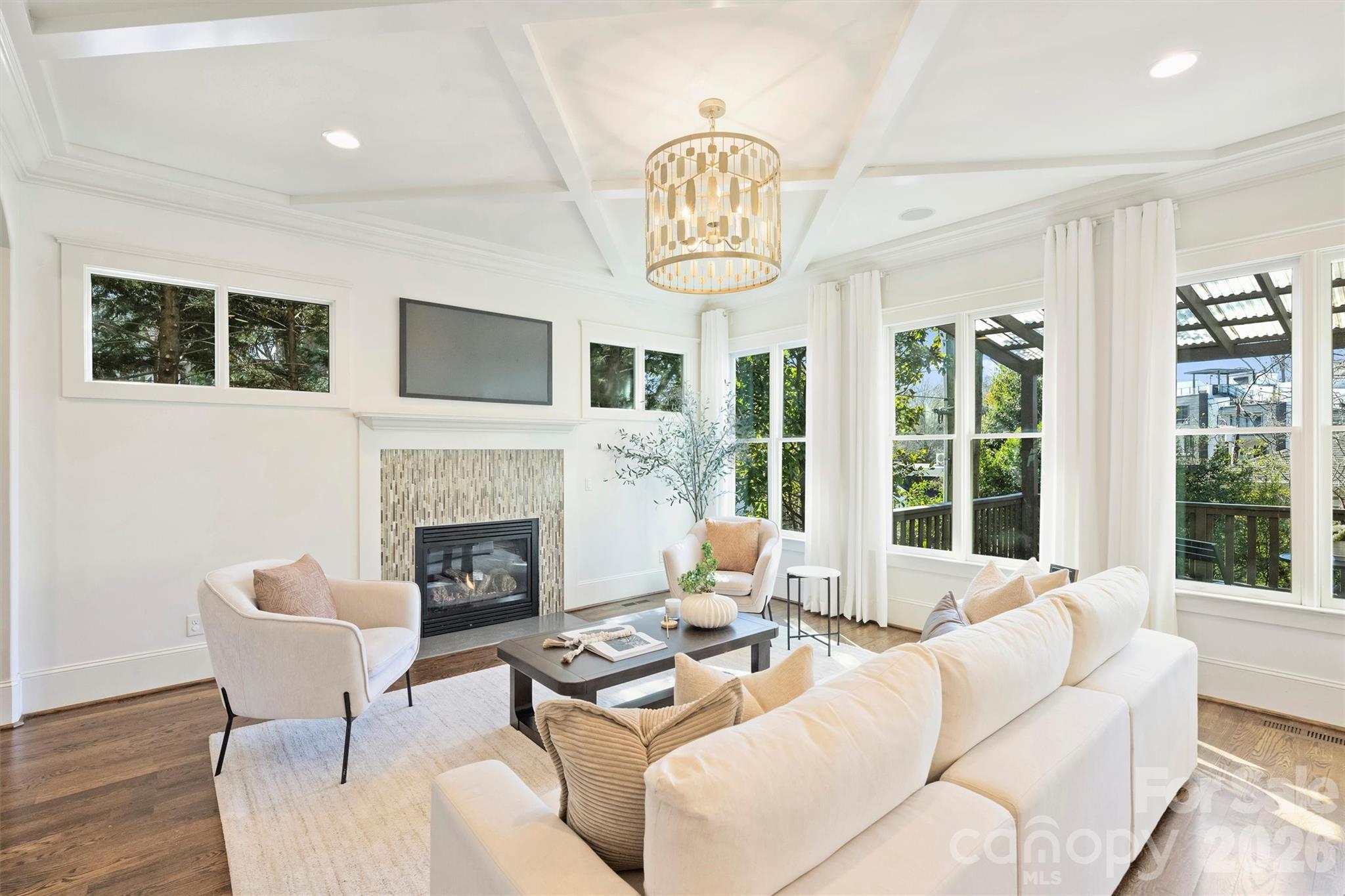 Custom-built by Grandfather Homes and ideally located just off Queens Road in the historic Cherry neighborhood, this stunning home offers quality craftsmanship, thoughtful design, and one of the best in-town locations in Charlotte!An inviting front porch opens to a spacious dining room and expansive main living area with hardwood floors and high ceilings.