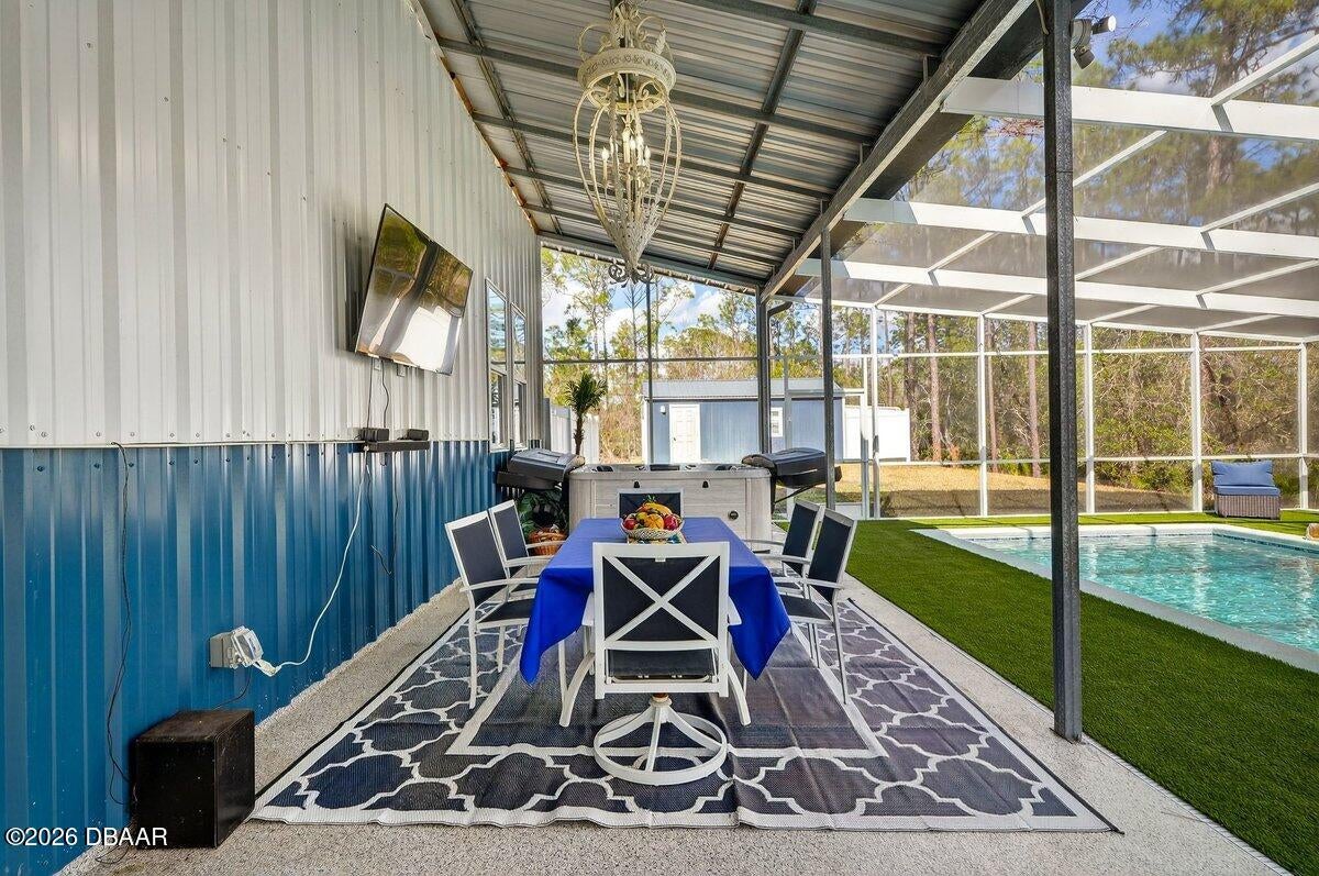 This 3000 square foot sprawling Barndominium is a must-see at 108 Conifer Lane, Ormond Beach, Florida. Blending rustic charm with modern flair on almost four acres, it boasts a heated saltwater pool, 36x36 oversized garage, perfect for all your toys, vaulted ceilings, huge windows, a peaceful pond out front, a massive lanai patio--entertainers delight.