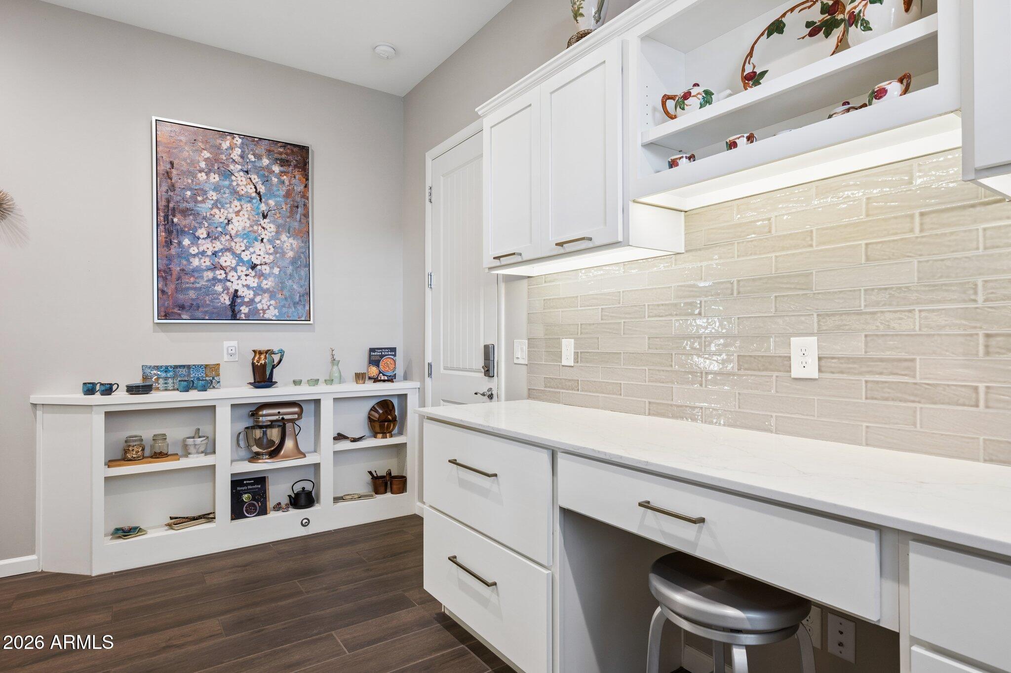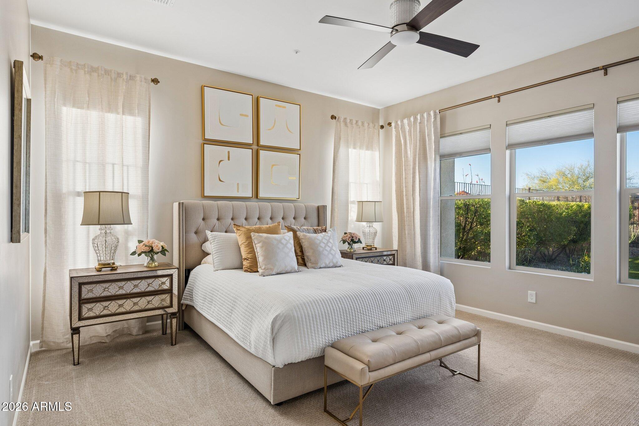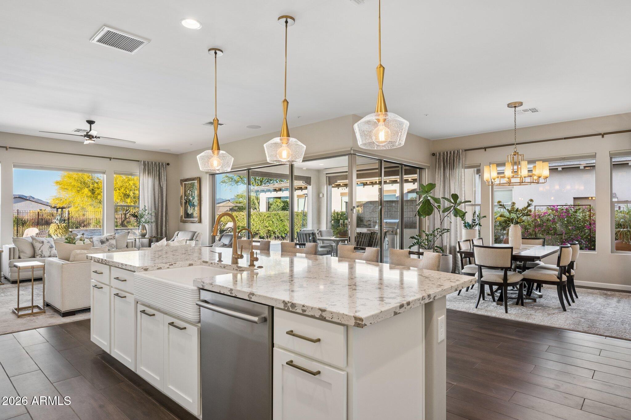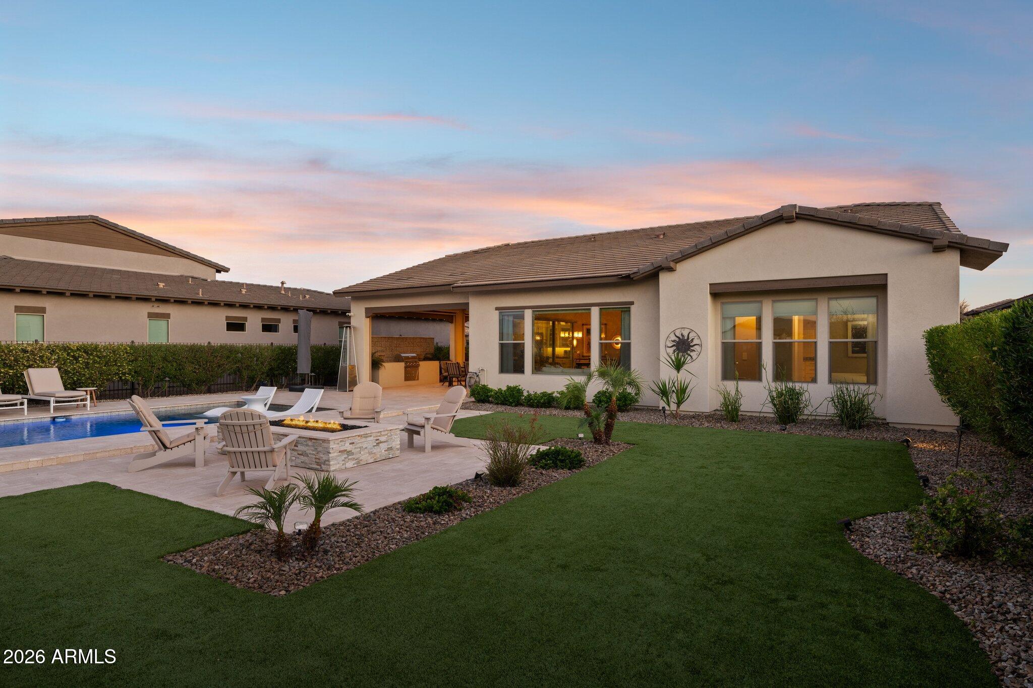 Welcome to a home that truly has it all--style, function, and impressive attention to detail from the moment you arrive. An inviting courtyard entry with a tranquil water feature sets the tone for this exceptional property, offering seamless indoor-outdoor living on an oversized, private lot.This thoughtfully designed home features 3 bedrooms, including a private casita, 3.5 baths, and a versatile den, all wrapped in a timeless neutral color palette and complemented by Levolor blinds throughout. The gourmet kitchen is a chefs dream, showcasing GE Monogram stainless steel appliances, ceiling-height cabinetry, designer lighting, and a hands-free faucet. The great room is anchored by a custom stone feature wall with floating shelves, built-in cabinetry, quartz surfaces, and an electric fireplace, creating a warm yet modern focal point. The den impresses with double doors, custom built-ins with quartz countertops, and a striking feature wall, making it ideal for a home office or flex space. The primary suite is a true retreat, offering generous space, custom closet systems, designer tile, and a luxurious freestanding tub. Guest accommodations are equally refined, highlighted by a beautifully updated bathroom featuring designer tile, a floating glass shower door, and LED mirror.The casita is a standout, complete with a wet bar, undercounter beverage fridge, full-size refrigerator, and a walk-in closet--perfect for guests or multigenerational living. Step outside and experience Arizona living at its finest. An expanded corner sliding glass door opens to a stunning backyard oasis featuring a built-in BBQ with privacy wall, sparkling pool with Baja shelf, firepit, automated sun shades, and an expansive stone patio--all set on a large, deep lot with serene mountain views and added privacy, including snake fencing. The air-conditioned 3-car garage is fully outfitted with epoxy flooring, ceiling storage racks, and built-in cabinetry, along with added conveniences like a reverse osmosis system and water softener. This is more than a home--its a lifestyle. Come see it before its gone.Trilogy at Verde River is a resort-style community featuring something for everyone! Golf, tennis, pickleball, bocce ball, heated lap pool and swimming pool, hot tub, fitness center, demonstration kitchen, and a 7.5-acre dog park. The community center has casual and fine dining, a luxury spa, and an events center. Trilogy at Verde River is adjacent to the Tonto National Forest and is situated in the middle of miles and miles of hiking and biking trails. Live like youre on vacation!