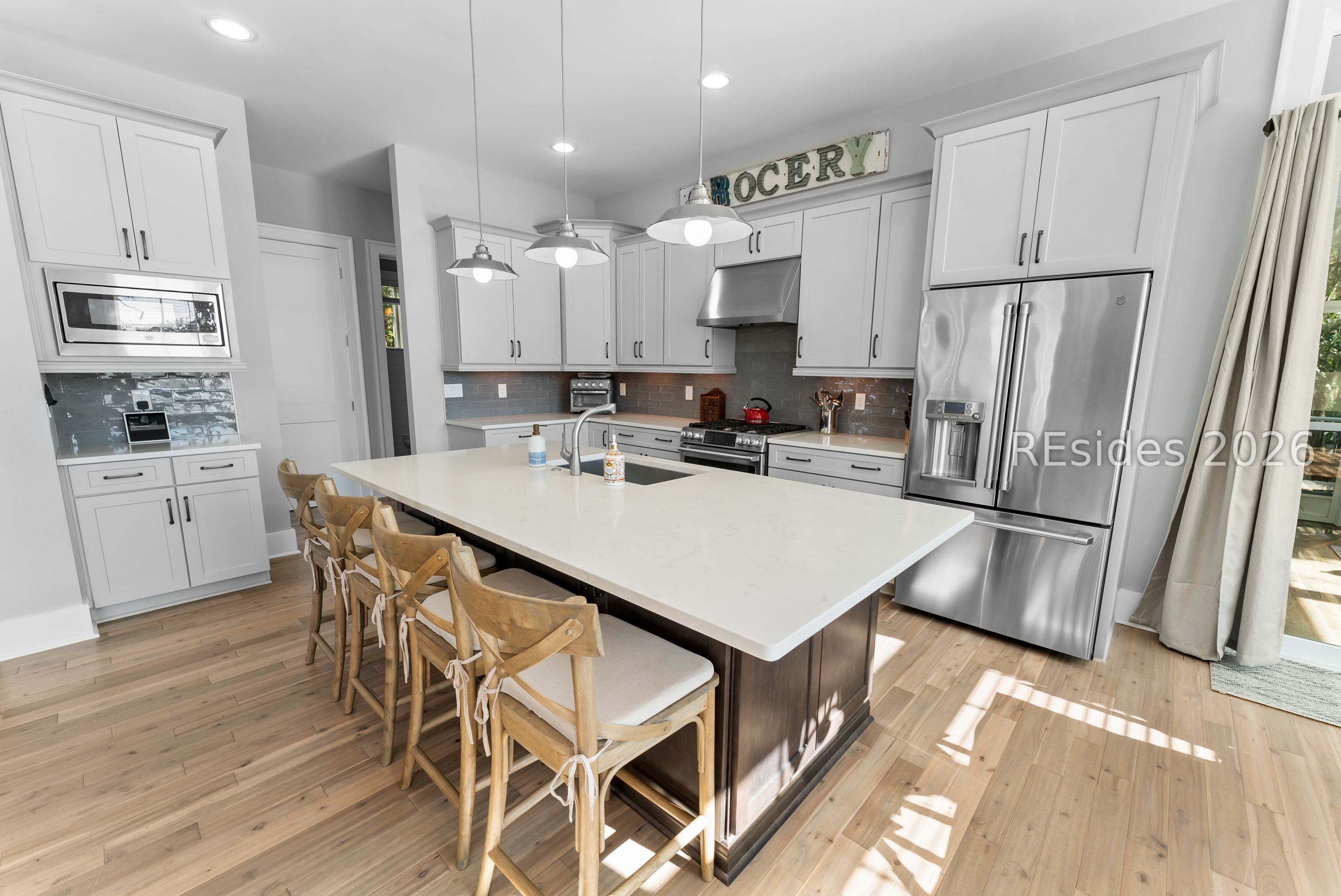 Positioned within the private gates of Shearwater on Hilton Head Island, this exceptional 4-bedroom, 4.5-bath coastal residence offers over 3,000 square feet of thoughtfully designed living space framed by serene marsh views and Lowcountry beauty. Designed to balance architectural elegance with everyday functionality, the home features expansive living areas, soaring ceilings, and abundant natural light throughout. Rich hardwood flooring anchors the open-concept main level, while oversized windows capture the surrounding landscape and create a seamless connection between indoor and outdoor spaces.The chefs kitchen is both refined and highly functional, showcasing custom cabinetry, quartz surfaces, premium appliances, and meticulous detailing. It flows effortlessly into the main living and