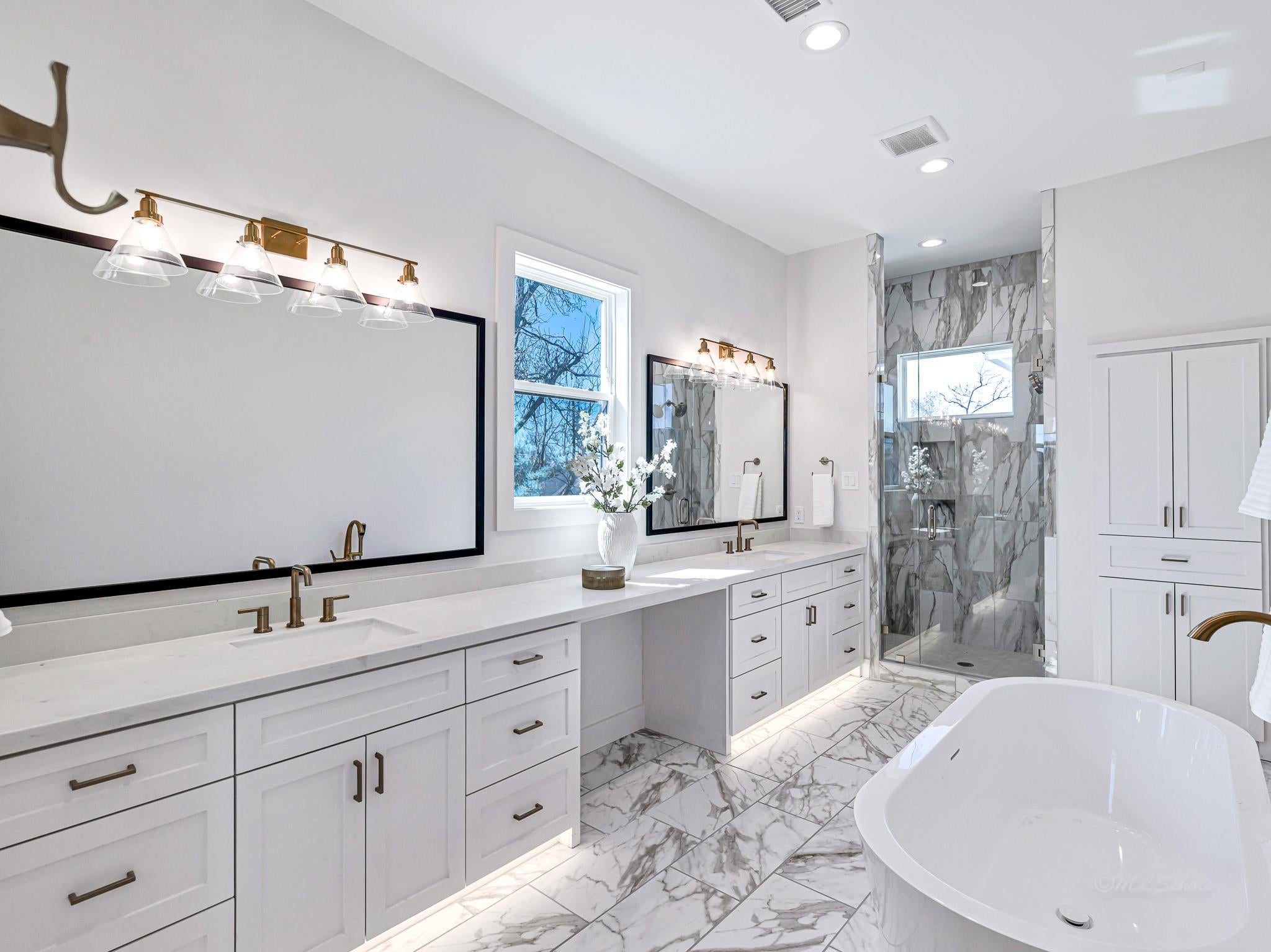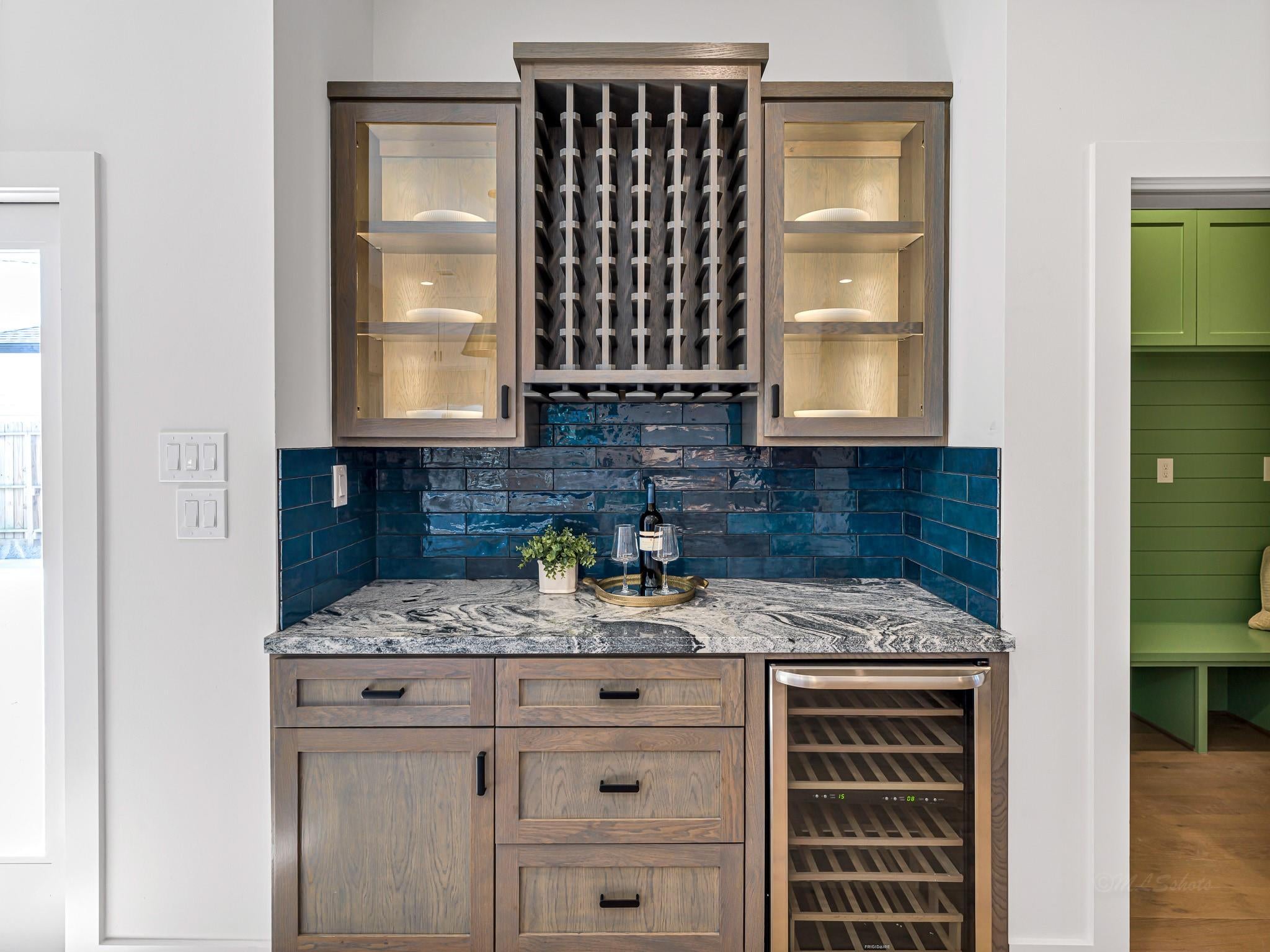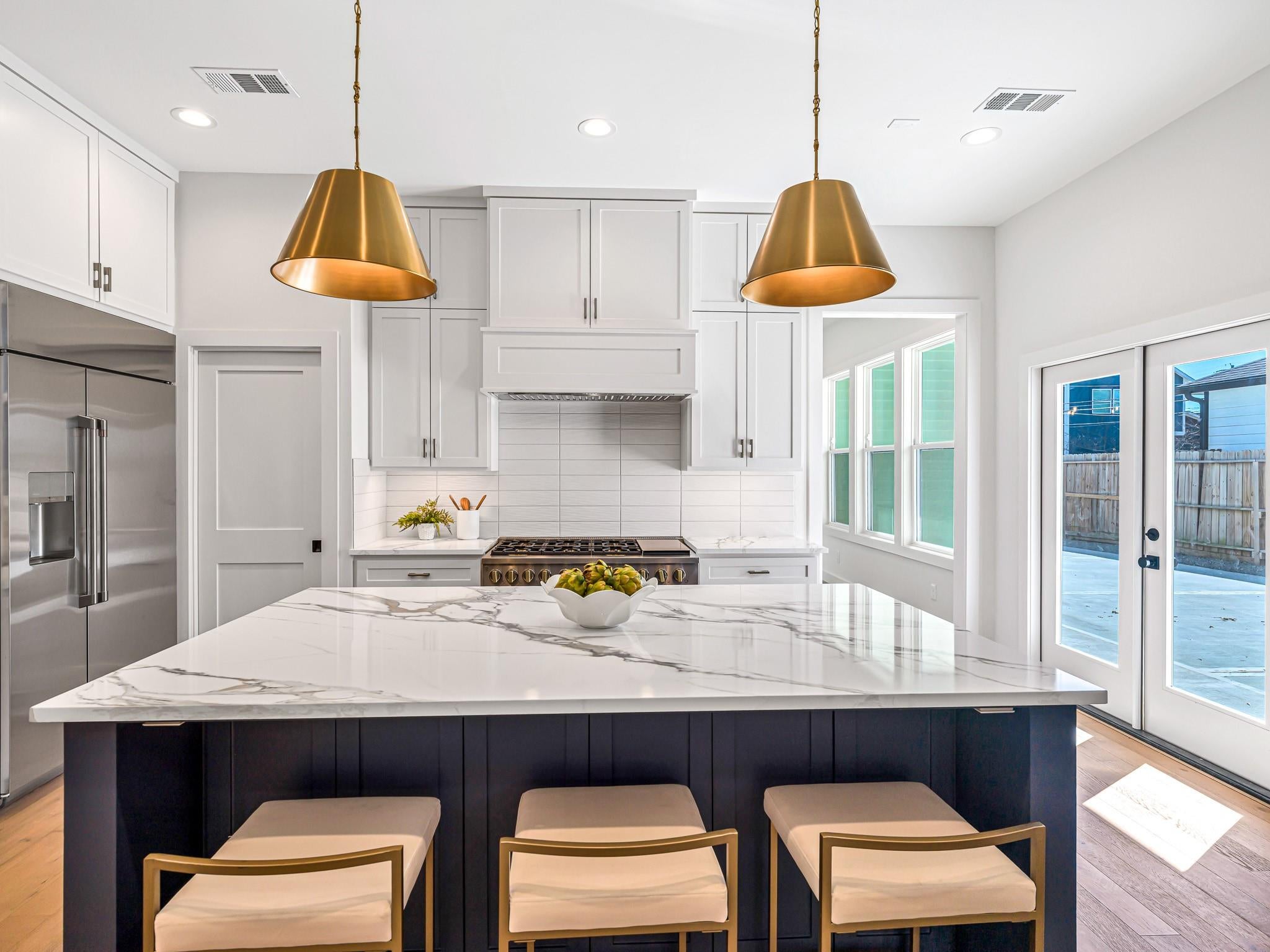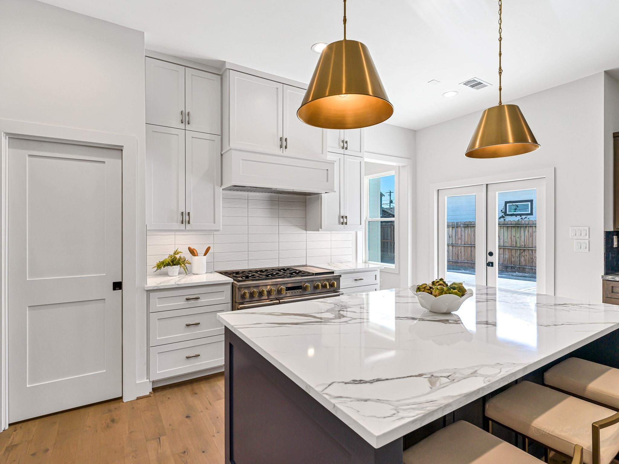 Welcome to 1207 Tabor St. in the heart of Houston Heights. This stunning Craftsman-style new construction offers 5 bedrooms and 4 full baths in a light-filled, open-concept layout. A soaring entry with statement chandelier sets the tone. Engineered oak floors and custom cabinetry run throughout. The first-floor bedroom with full bath also serves as a private office. Formal dining features large windows. The chefs kitchen includes a spacious island, 48 double-oven range with 6 burners and griddle, 42 built-in refrigerator/freezer, under-cabinet lighting, and a custom wine bar with beverage fridge. A mudroom off the 2-car garage opens to the elegant living area. Upstairs offers 4 bedrooms, 3 baths, utility room with sink, and a large game room. The primary suite boasts a spa-like bath, soaking tub, walk-in shower, and oversized custom closet. Covered patio with gas line and automatic driveway gate complete the home.