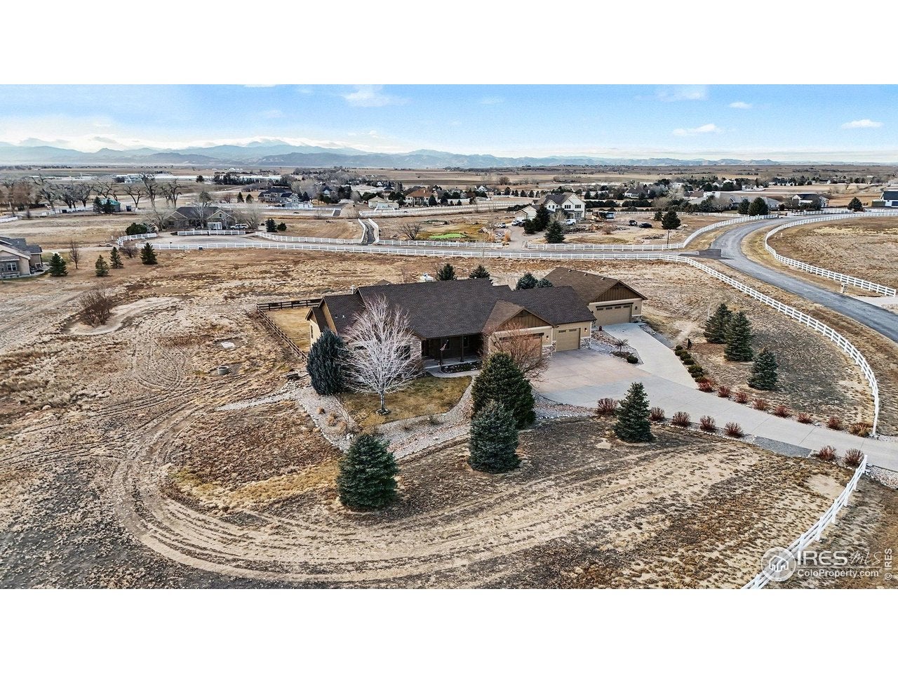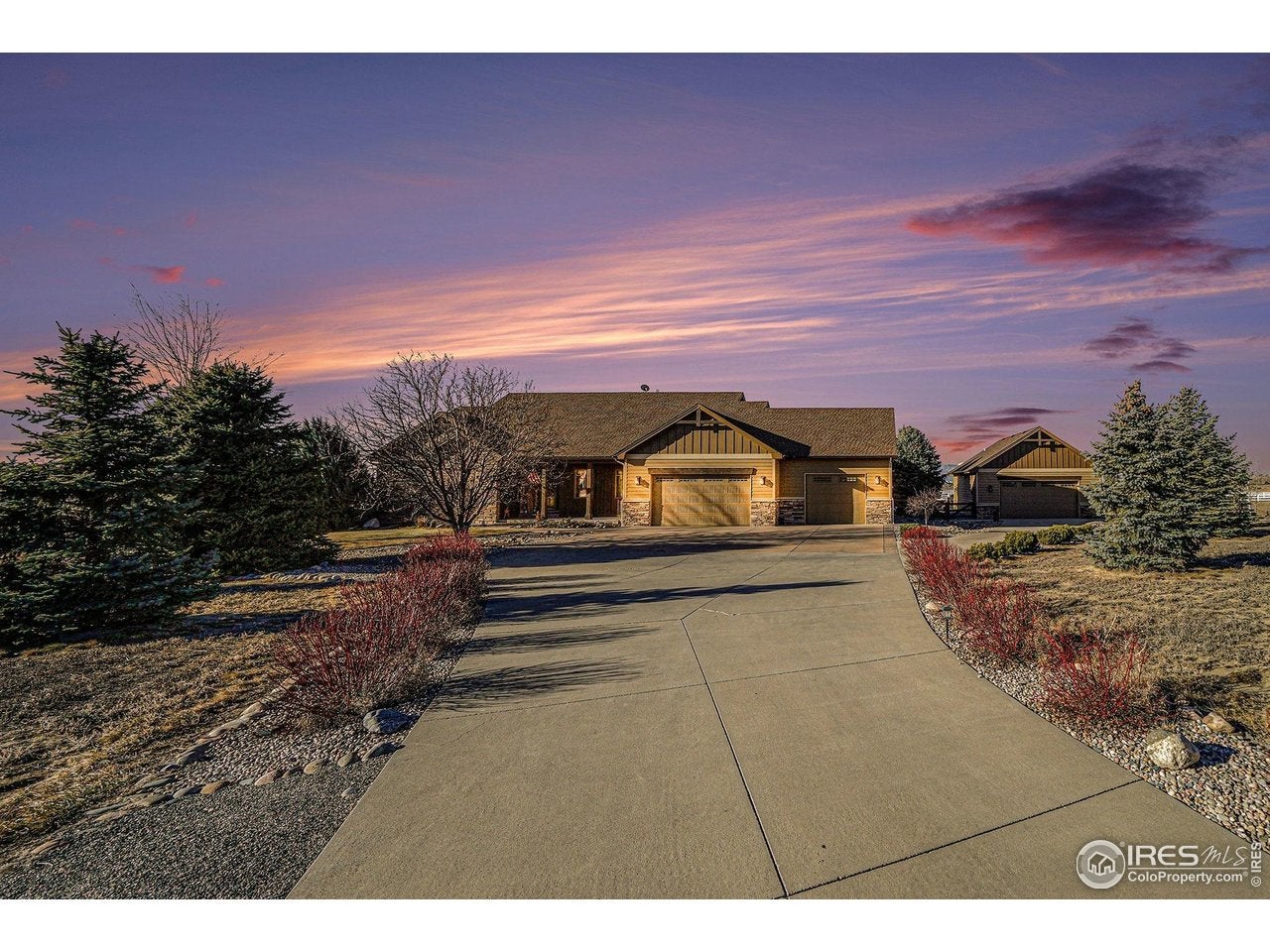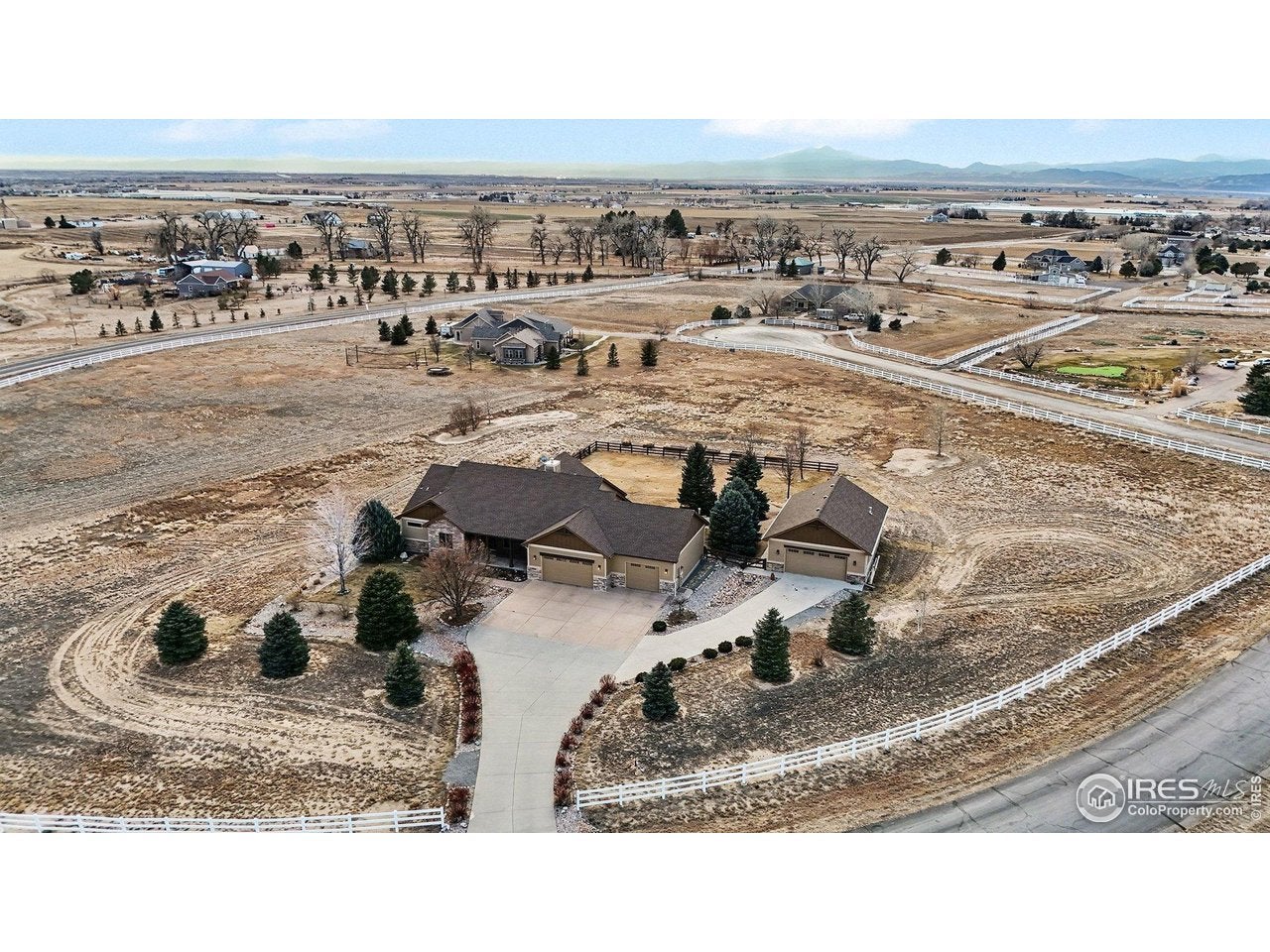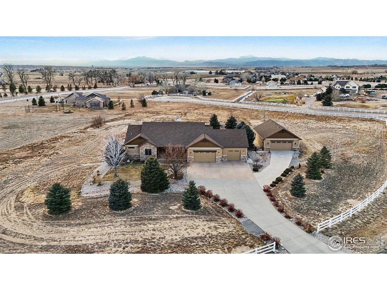Positioned on 3.7 acres in the gated Belmont Farms community, this custom ranch with walkout basement captures expansive Front Range views and true Colorado privacy-just minutes from I-25 and free of metro district taxes.Designed with intentional sightlines and natural light, the great room showcases floor-to-ceiling windows, hardwood flooring, and a striking three-sided fireplace that anchors the open living space. The kitchen flows seamlessly into the main living area and features granite countertops, stainless appliances, ample cabinetry, and a generous pantry-ideal for gathering and entertaining.The primary suite offers a private retreat with its own fireplace, sitting area, and spa-inspired bath with an oversized walk-in shower. A second main-level bedroom and laundry room provide flexibility and convenience.The finished walkout basement adds substantial living space with a large recreation area, wet bar, additional fireplace, two bedrooms, full bath, and extensive storage-well suited for guests, hobbies, or multi-generational living.Outdoor living is equally impressive with mature landscaping, a covered deck, and a walkout patio that frame the surrounding mountain views. The attached heated three-car garage is complemented by a detached heated shop with high doors and its own bathroom-ideal for vehicles, equipment, or workshop use.Acreage, views, gated setting, and functional outbuildings-properties like this rarely become available in Belmont Farms.