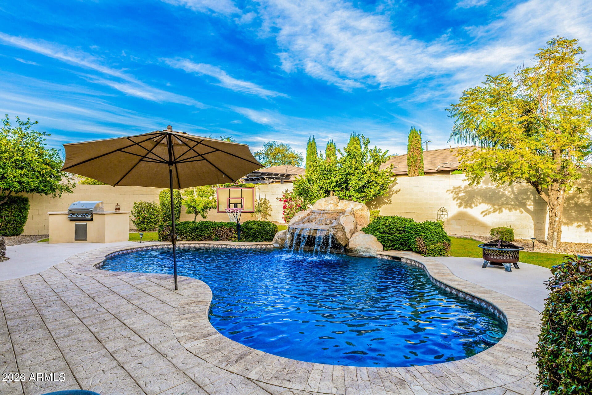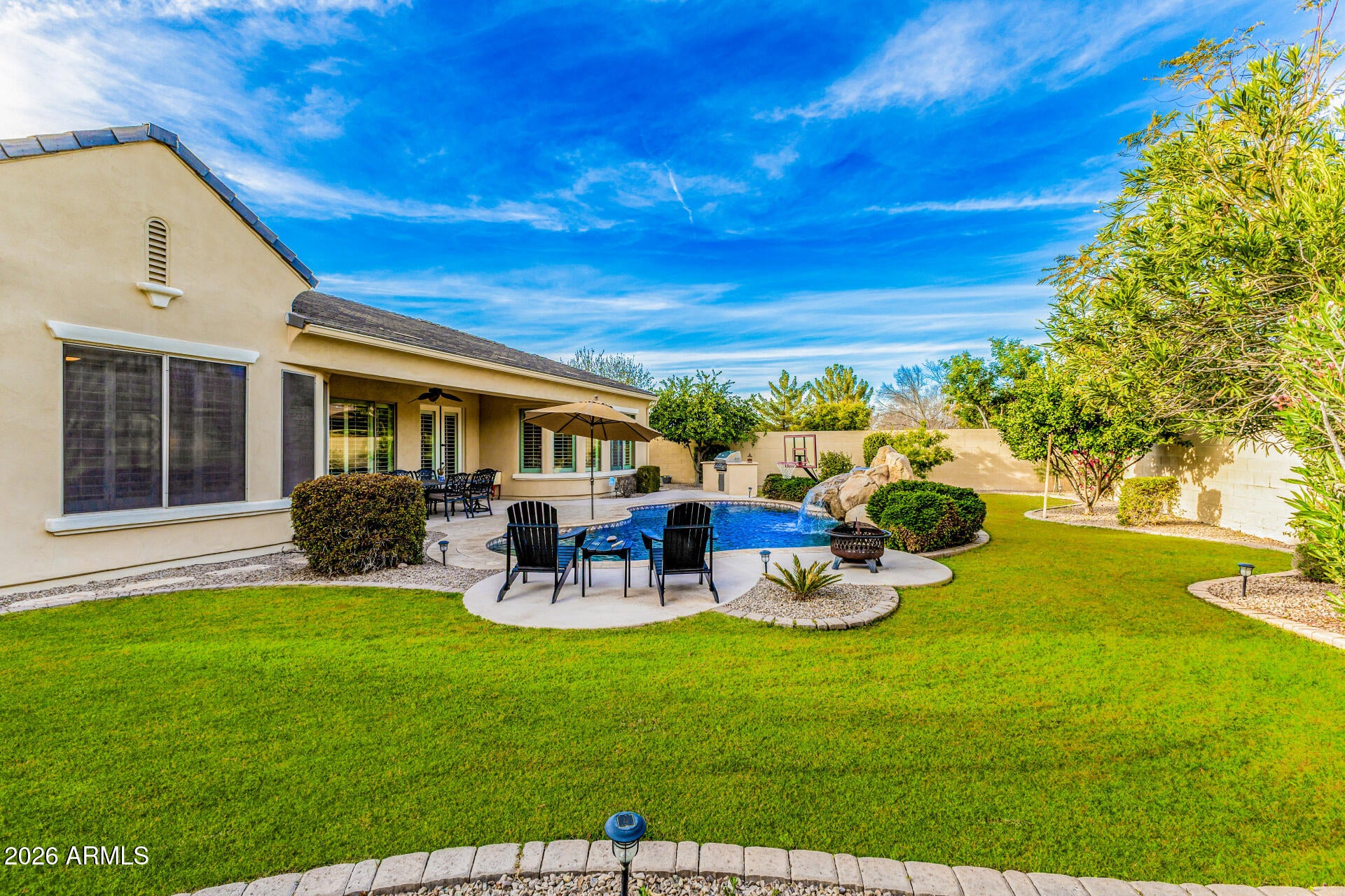 Welcome to your dream home! This remarkable estate perfectly blends timeless elegance w/modern luxury! Manicured landscape, stone accents, & a courtyard elevate its curb appeal. Discover impeccable craftsmanship & meticulous attention to detail throughout. Circular foyer, tile flooring, archways, plantation shutters, fire sprinklers, & bountiful natural light create a bright, airy ambiance. Large living & dining room, along w/the impressive great room highlighted by a cozy fireplace, are thoughtfully designed for both entertaining & everyday relaxation. Well-appointed kitchen boasts recessed lighting, white shaker cabinetry adorned w/crown moulding, tile backsplash, SS appliances, butlers service area, granite counters, a prep island w/a breakfast bar, & a breakfast nook. Grand owners retreat shines w/plush carpet, direct outdoor access, & an ensuite comprised of a soaking tub w/a glass block window & a walk-in closet. Additional highlights include a 2nd main bedroom, sizable den, & a HUGE bonus room in the basement. Venture to the stunning backyard oasis, where every day feels like a vacation. Enjoy a covered patio, a built-in BBQ, & a sparkling pool w/a rock waterfall. Live your best life in this exceptional haven!