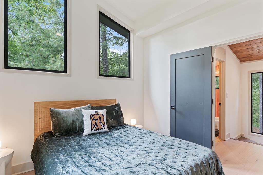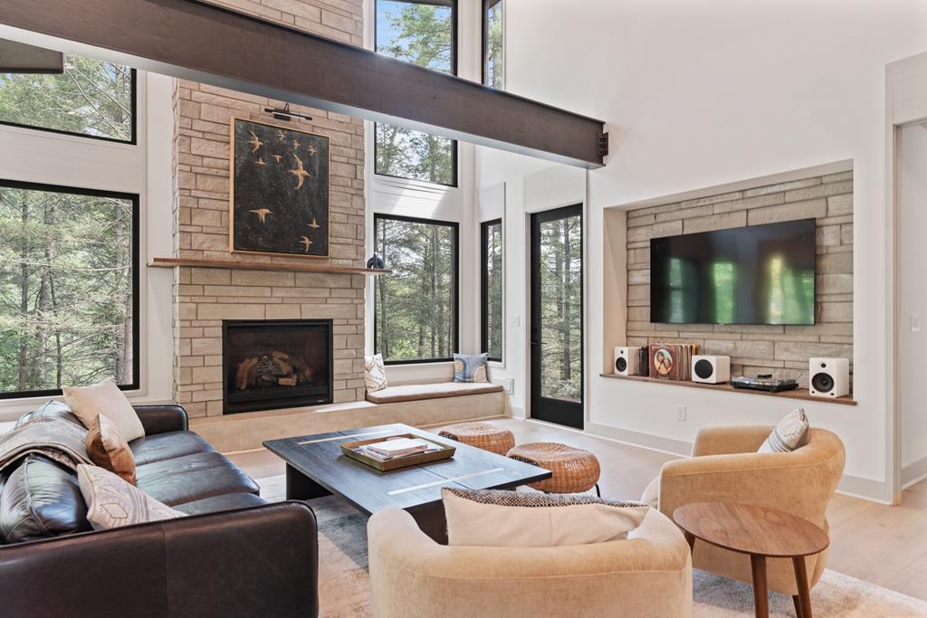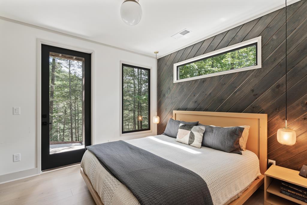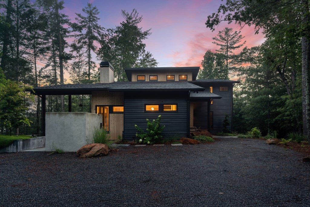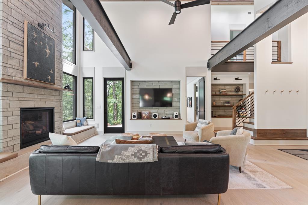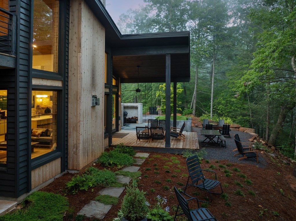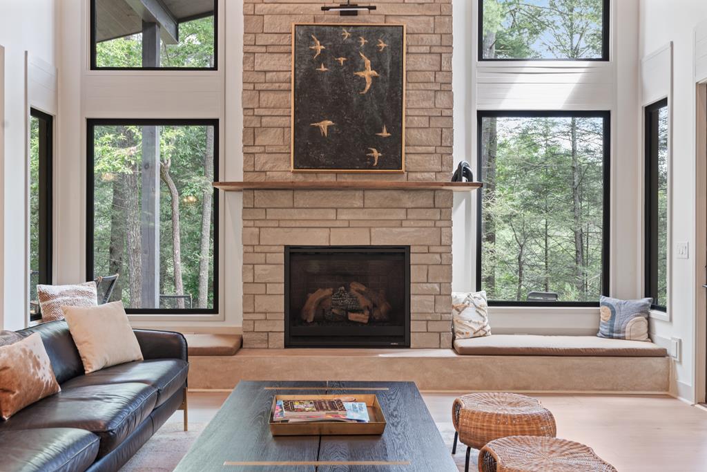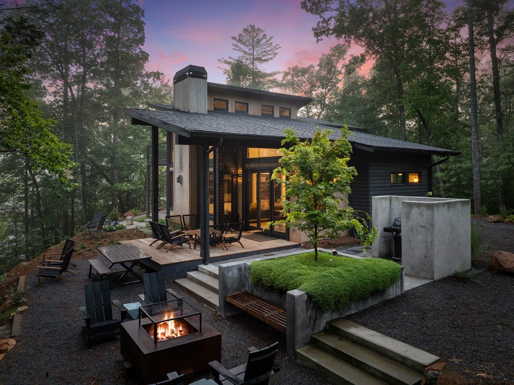 Wake up to the sound of your own private waterfall! Perched above a cascading mountain creek, this striking modern retreat delivers an experience defined by moving water, clean architectural lines, and total immersion in nature. Fall asleep to rushing water and enjoy morning coffee overlooking the falls from your private mountain sanctuary. This thoughtfully designed 4-bedroom, 3-bathroom home blends mid-century inspired architecture with warm wood tones, expansive glass, and crisp modern finishes. Large windows frame the forest canopy and flowing creek below, filling the open-concept living space with natural light. A dramatic fireplace anchors the main level, while the luxury kitchen features custom cabinetry, generous prep space, and a gas rangeperfect for entertaining after a day outdoors. The primary suite offers a true retreat, complete with a custom walk-in tile shower featuring double shower heads, creating a spa-like experience. The additional bedrooms and baths are equally well-appointed with contemporary finishes and thoughtful design. Outdoor living is where this property truly shines. Expansive gathering spaces are positioned to capture the sights and sounds of the waterfall. Soak in the hot tub, relax in the oversized hammock, gather around the fire pit, or step down to the creek for fly fishing in stocked trout waters within the Watersong community. Located just minutes from the renowned Pinhoti and Bear Creek trail systems, offering some of the best mountain biking and hiking in North Georgia, this home delivers rare access to adventure while maintaining exceptional privacy. A design-forward mountain retreat where modern luxury meets cascading water and year-round outdoor living.