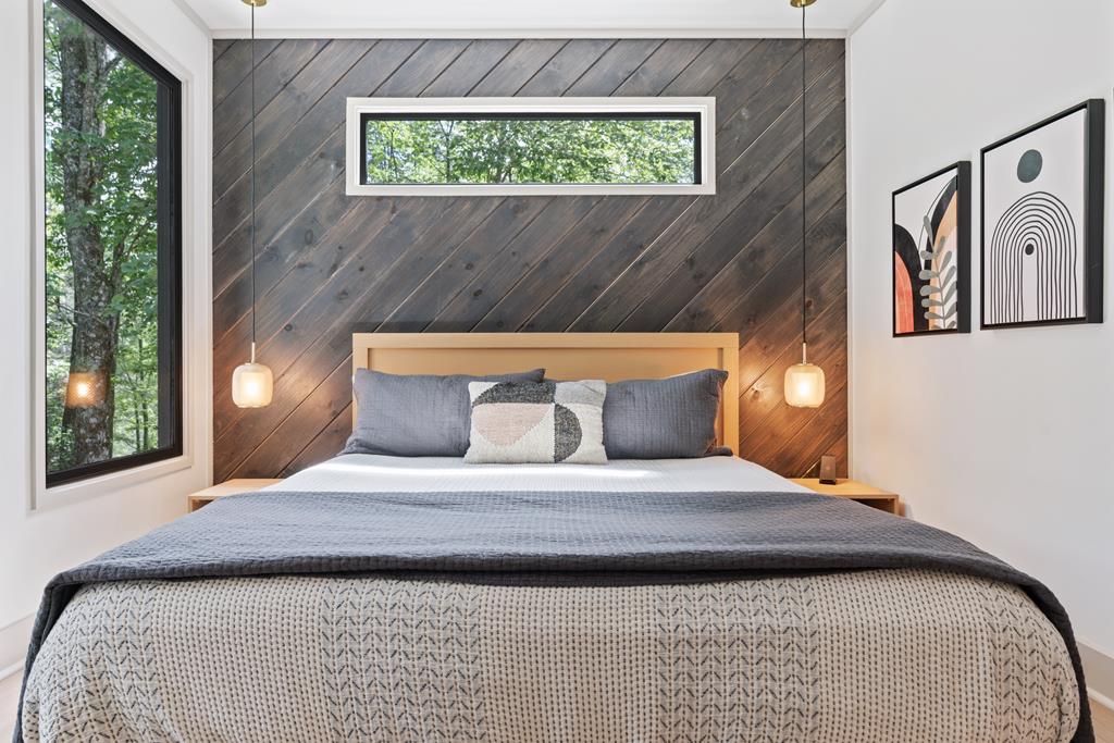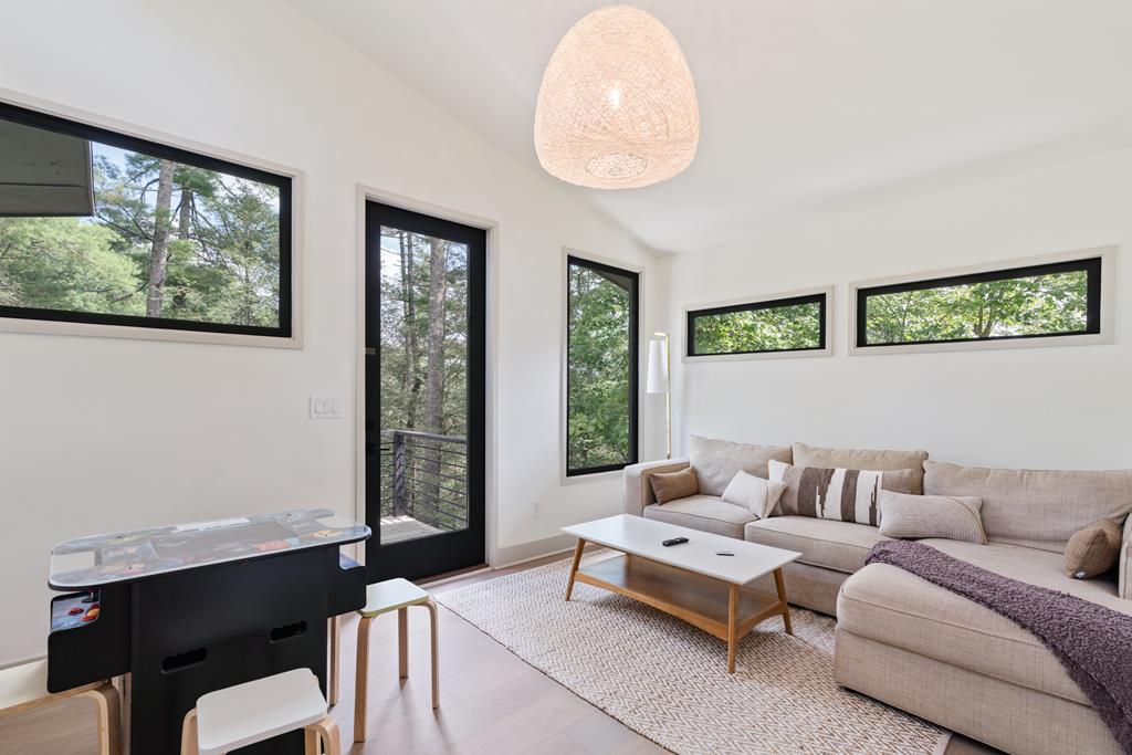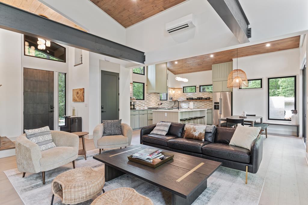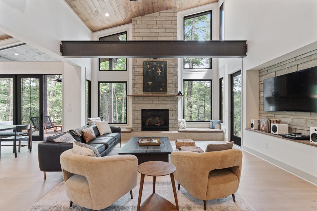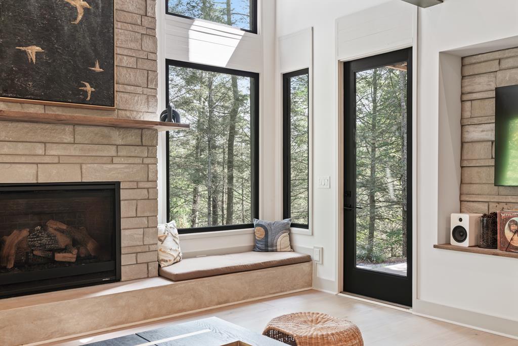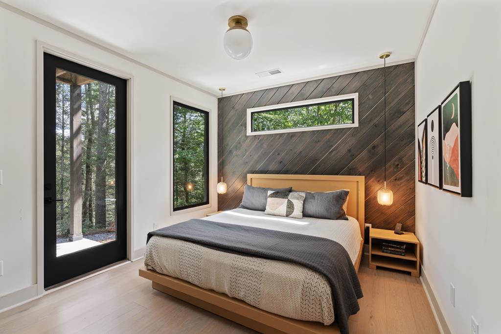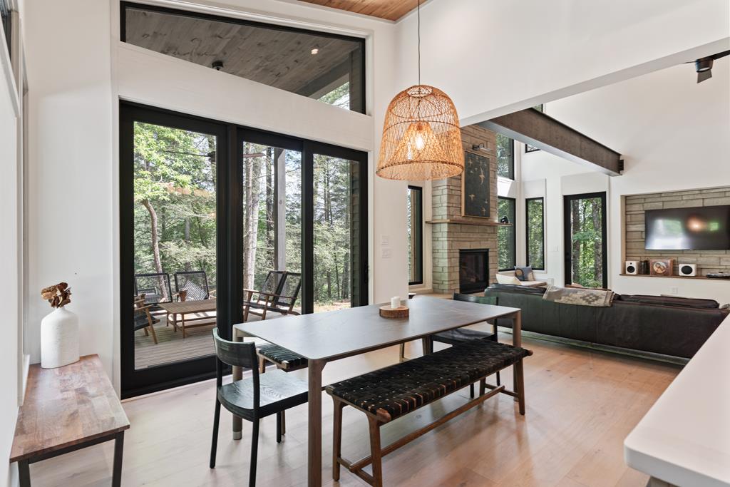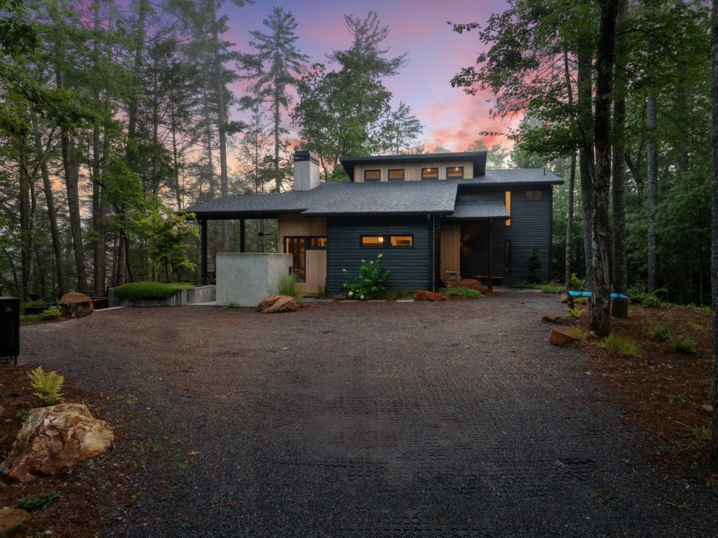 Wake up to the sound of your own private waterfall! Perched above a cascading mountain creek, this striking modern retreat delivers an experience defined by moving water, clean architectural lines, and total immersion in nature. Fall asleep to rushing water and enjoy morning coffee overlooking the falls from your private mountain sanctuary. This thoughtfully designed 4-bedroom, 3-bathroom home blends mid-century inspired architecture with warm wood tones, expansive glass, and crisp modern finishes. Large windows frame the forest canopy and flowing creek below, filling the open-concept living space with natural light. A dramatic fireplace anchors the main level, while the luxury kitchen features custom cabinetry, generous prep space, and a gas rangeperfect for entertaining after a day outdoors. The primary suite offers a true retreat, complete with a custom walk-in tile shower featuring double shower heads, creating a spa-like experience. The additional bedrooms and baths are equally well-appointed with contemporary finishes and thoughtful design. Outdoor living is where this property truly shines. Expansive gathering spaces are positioned to capture the sights and sounds of the waterfall. Soak in the hot tub, relax in the oversized hammock, gather around the fire pit, or step down to the creek for fly fishing in stocked trout waters within the Watersong community. Located just minutes from the renowned Pinhoti and Bear Creek trail systems, offering some of the best mountain biking and hiking in North Georgia, this home delivers rare access to adventure while maintaining exceptional privacy. A design-forward mountain retreat where modern luxury meets cascading water and year-round outdoor living.
