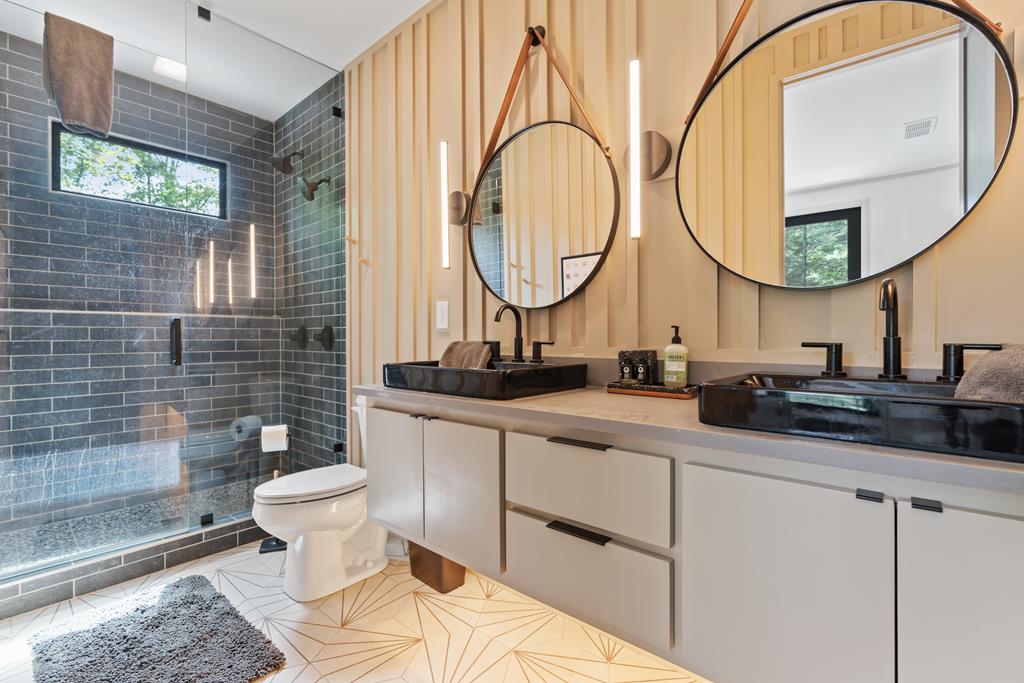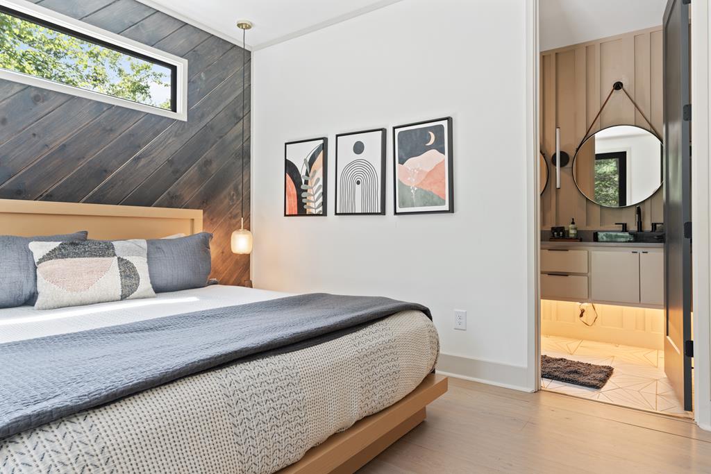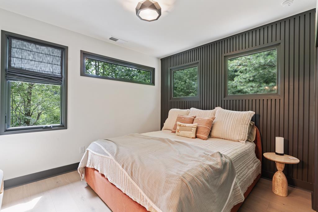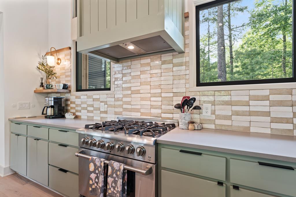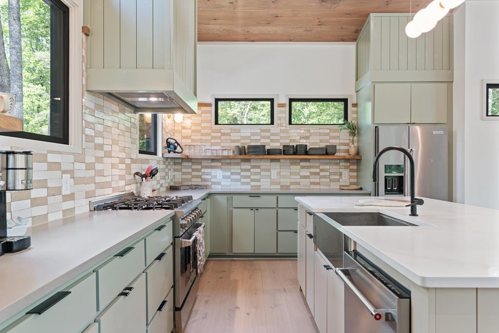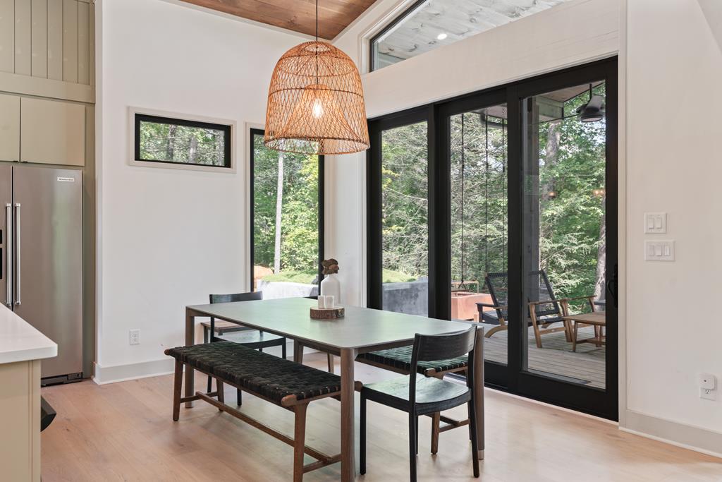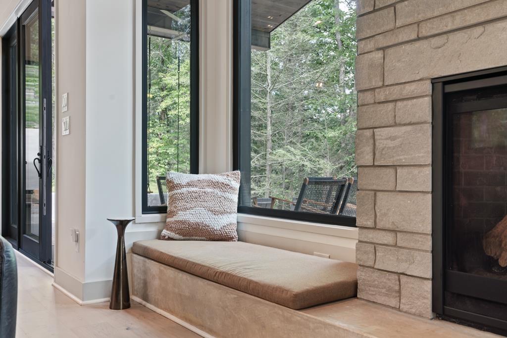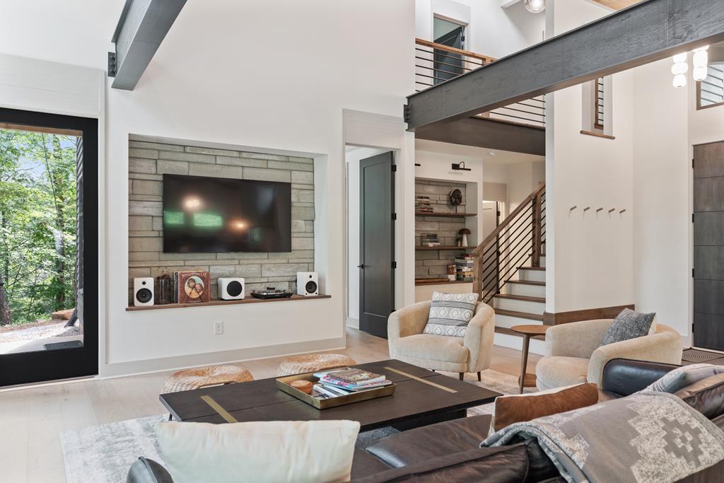 Wake up to the sound of your own private waterfall! Perched above a cascading mountain creek, this striking modern retreat delivers an experience defined by moving water, clean architectural lines, and total immersion in nature. Fall asleep to rushing water and enjoy morning coffee overlooking the falls from your private mountain sanctuary. This thoughtfully designed 4-bedroom, 3-bathroom home blends mid-century inspired architecture with warm wood tones, expansive glass, and crisp modern finishes. Large windows frame the forest canopy and flowing creek below, filling the open-concept living space with natural light. A dramatic fireplace anchors the main level, while the luxury kitchen features custom cabinetry, generous prep space, and a gas rangeperfect for entertaining after a day outdoors. The primary suite offers a true retreat, complete with a custom walk-in tile shower featuring double shower heads, creating a spa-like experience. The additional bedrooms and baths are equally well-appointed with contemporary finishes and thoughtful design. Outdoor living is where this property truly shines. Expansive gathering spaces are positioned to capture the sights and sounds of the waterfall. Soak in the hot tub, relax in the oversized hammock, gather around the fire pit, or step down to the creek for fly fishing in stocked trout waters within the Watersong community. Located just minutes from the renowned Pinhoti and Bear Creek trail systems, offering some of the best mountain biking and hiking in North Georgia, this home delivers rare access to adventure while maintaining exceptional privacy. A design-forward mountain retreat where modern luxury meets cascading water and year-round outdoor living.