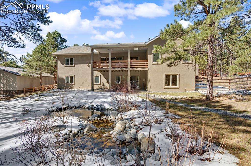 Tucked into a quiet, serene setting, this exceptional home offers the perfect blend of privacy, comfort, and modern luxuryall on 1.3 beautifully treed acres just minutes from Fox Run Regional Park. Boasting approximately 4,700 sqft, this thoughtfully designed ranch-style home with a walk-out basement features 5 spacious bdrms, 3 baths, 3 cozy fireplaces and ALL NEW CARPET. The open, light-filled floor plan creates an inviting atmosphere, ideal for both everyday living and entertaining. No detail has been overlooked. Enjoy high-end finishes throughout, including granite countertops, rich hardwood flooring and a stunning stucco exterior accented with wood and stone. French doors open to a flexible space for a guest bedroom, home office or study to suit your lifestyle. The gourmet kitchen, which features stainless steel appliances, a movable granite island and a double oven, flows seamlessly into the main living areas. Step outside to a covered deck overlooking a beautiful mix of mature trees, open space and a landscaped pond with a waterfall feature and putting green. The Primary bedroom located on the Main Level is the ultimate retreat with an ensuite 5-piece bath w/ jetted tub, fireplace and heated floors. The fully finished walk-out basement offers additional living space complete with a pool table, fireplace, wet bar and media/bonus room. Perfect for entertaining! Each bathroom offers an added touch of luxury with individual thermostats for radiant heated tile floors. The basement level walks out to a covered, concrete patio in a private, treed setting - pre-wired for a hot tub. Additional highlights include a circular driveway w/gates, a finished attached 3 car garage, fully fenced back yard, storage shed w/dog kennels, a chicken coop and a fabulous 36x40 Barn for additional vehicles, RV parking and more! This is a rare opportunity to enjoy peaceful, private living without sacrificing convenience. Truly a one-of-a-kind property - come experience it for yourself!