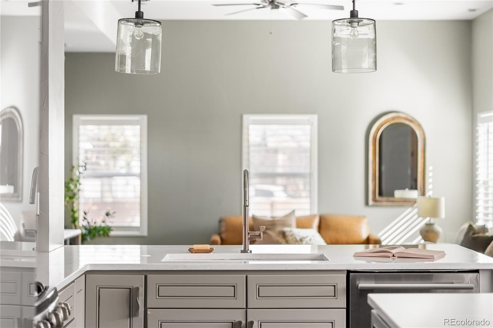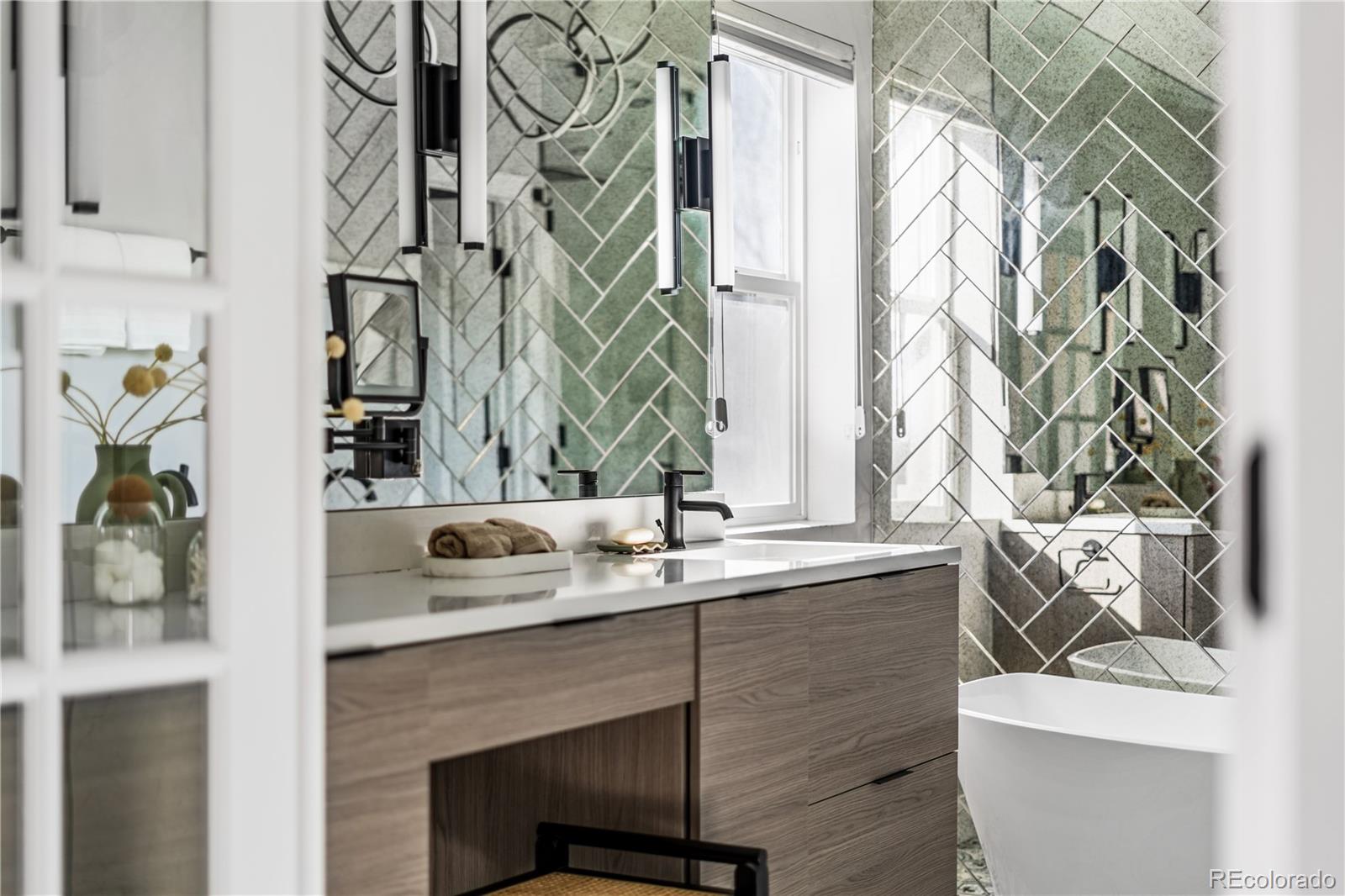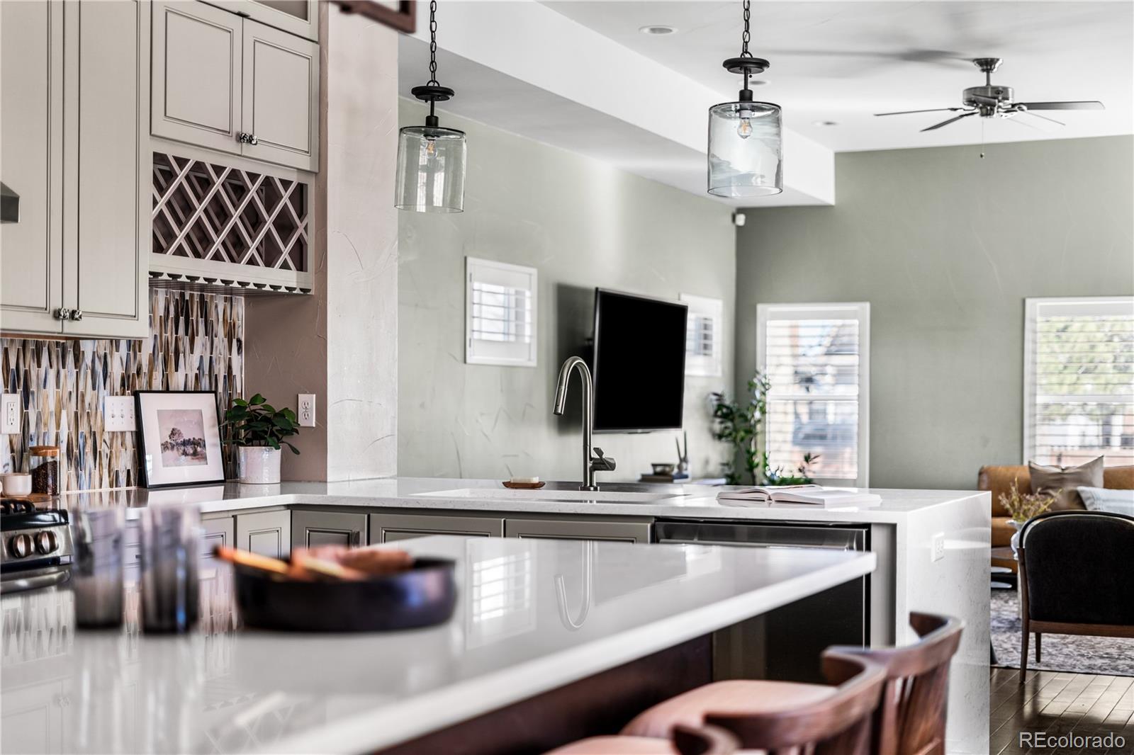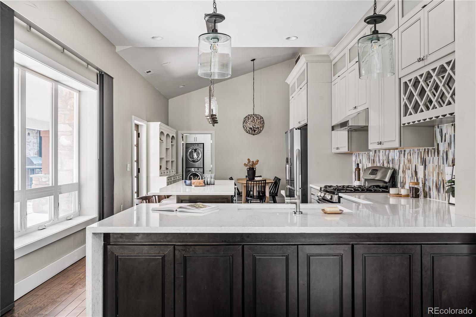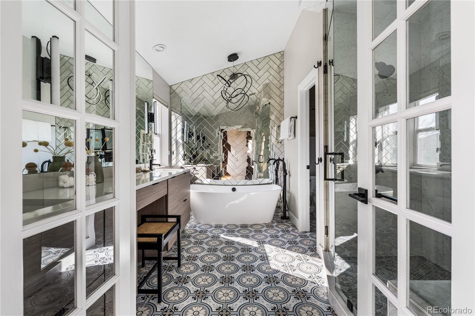 Welcome to this updated home in the heart of Denvers Sunnyside neighborhood. This thoughtfully designed residence offers 3 bedrooms, 3 bathrooms, & a 2-car attached garage, blending modern comfort with stylish finishes & indoor-outdoor living. Popped-top & renovated down to the studs in 2012, the home offers the benefits of newer construction while maintaining neighborhood charm. The main level features an open layout with high ceilings, natural light, & hardwood floors. The living room flows into the dining area & kitchen, creating an ideal space for everyday living & entertaining. The kitchen showcases quartz countertops, stainless steel appliances, updated 42 cabinets with uppers, & a large island with seating, while an included hutch & dining area add character & functionality. The main level is completed by a renovated mudroom with newer washer/dryer, an office area with custom built-in cabinets, & a powder room with vibrant wallpaper. Upstairs, the primary suite with wood accent wall serves as a retreat with vaulted ceilings & refined finishes. The remodeled spa-inspired ensuite bathroom features a freestanding soaking tub against a glass herringbone tile accent wall. The space is finished with decorative tile flooring, a dual-sink vanity with makeup vanity, & a steam shower with built-in speakers & an integrated essential oil diffusing system. Completing the suite is a custom walk-in closet with built-in organization. Two additional bedrooms & a full bathroom upstairs provide accommodations for family, guests, or a home office. Additional updates include sewer line replacement with exterior access points & AC replacement with regular HVAC servicing. Step outside to a private backyard oasis designed for Colorado living. The fenced yard features professional landscaping, a pergola-covered patio, retractable awning, built-in Lynx grill, fire pit, & putting green. Located minutes from parks, restaurants, coffee shops, & all that Sunnyside & the Highlands offer.