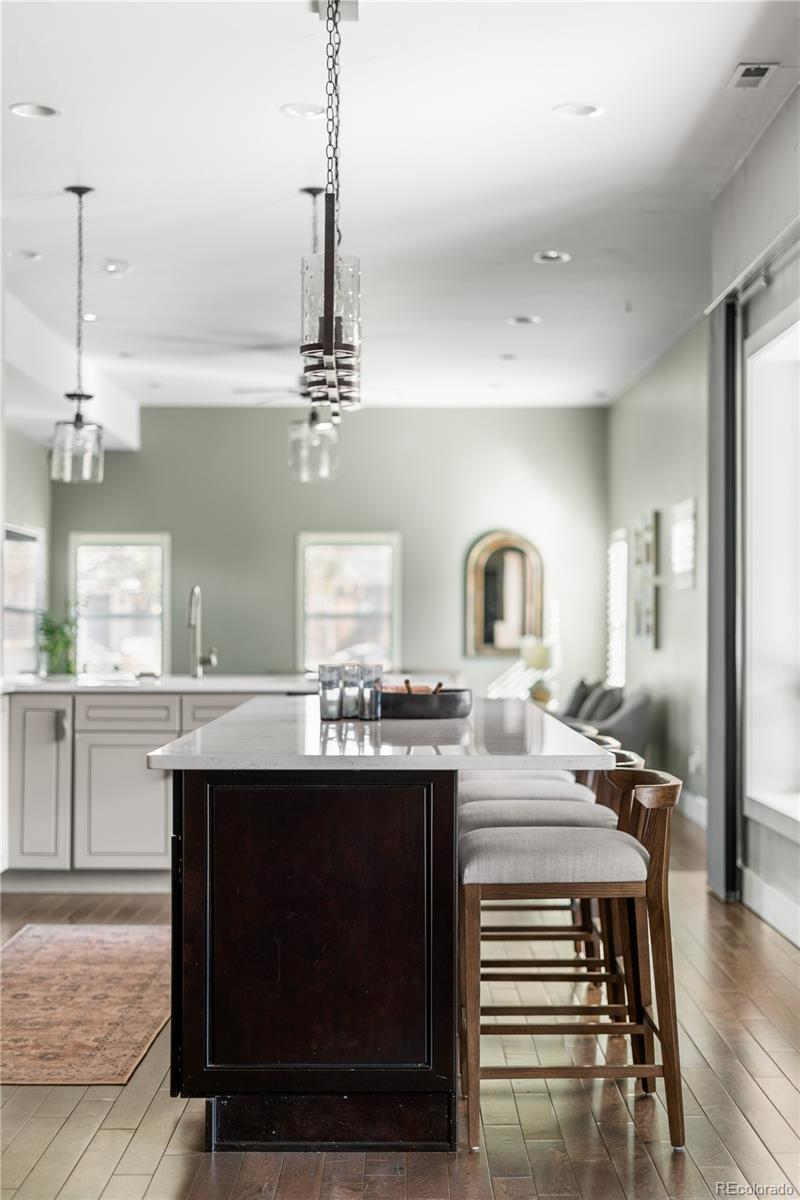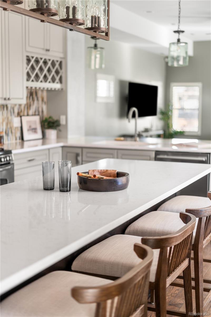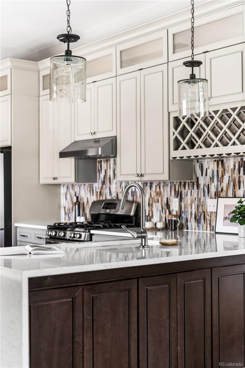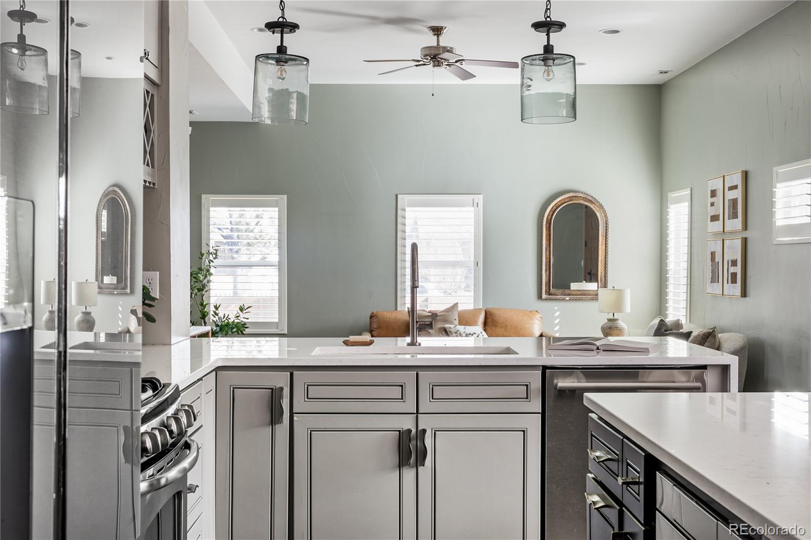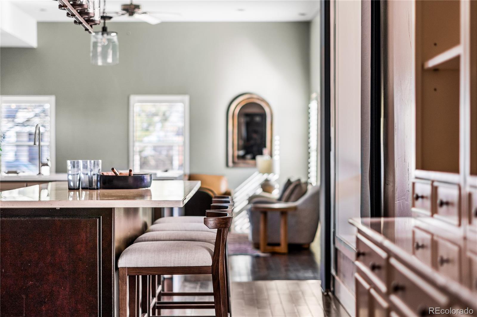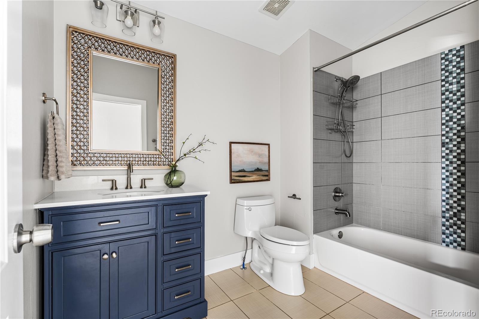 Welcome to this updated home in the heart of Denvers Sunnyside neighborhood. This thoughtfully designed residence offers 3 bedrooms, 3 bathrooms, & a 2-car attached garage, blending modern comfort with stylish finishes & indoor-outdoor living. Popped-top & renovated down to the studs in 2012, the home offers the benefits of newer construction while maintaining neighborhood charm. The main level features an open layout with high ceilings, natural light, & hardwood floors. The living room flows into the dining area & kitchen, creating an ideal space for everyday living & entertaining. The kitchen showcases quartz countertops, stainless steel appliances, updated 42 cabinets with uppers, & a large island with seating, while an included hutch & dining area add character & functionality. The main level is completed by a renovated mudroom with newer washer/dryer, an office area with custom built-in cabinets, & a powder room with vibrant wallpaper. Upstairs, the primary suite with wood accent wall serves as a retreat with vaulted ceilings & refined finishes. The remodeled spa-inspired ensuite bathroom features a freestanding soaking tub against a glass herringbone tile accent wall. The space is finished with decorative tile flooring, a dual-sink vanity with makeup vanity, & a steam shower with built-in speakers & an integrated essential oil diffusing system. Completing the suite is a custom walk-in closet with built-in organization. Two additional bedrooms & a full bathroom upstairs provide accommodations for family, guests, or a home office. Additional updates include sewer line replacement with exterior access points & AC replacement with regular HVAC servicing. Step outside to a private backyard oasis designed for Colorado living. The fenced yard features professional landscaping, a pergola-covered patio, retractable awning, built-in Lynx grill, fire pit, & putting green. Located minutes from parks, restaurants, coffee shops, & all that Sunnyside & the Highlands offer.
