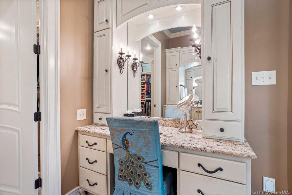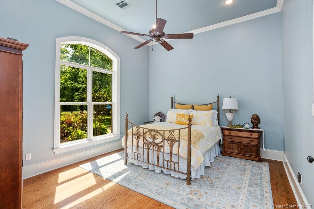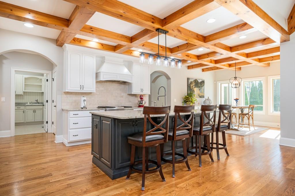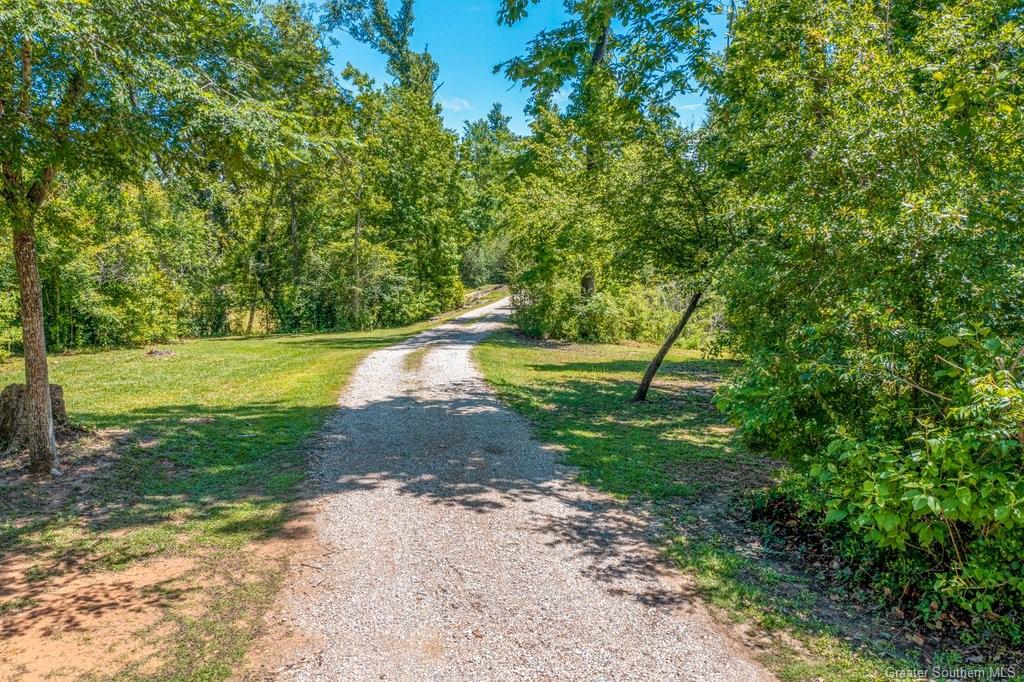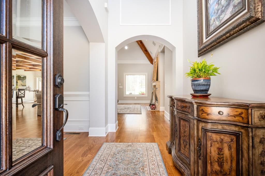 Nestled in the cul de sac, this custom-built French country home exudes elegance and PRIVACY. A magnificent WROUGHT IRON GATE marks the entrance, leading to a WINDING DRIVEWAY that meanders through the woods, setting the scene for the secluded 7 ACRES in a park-like setting. WALKING AND RIDING TRAILS carve through the land, offering peaceful escapes into nature.