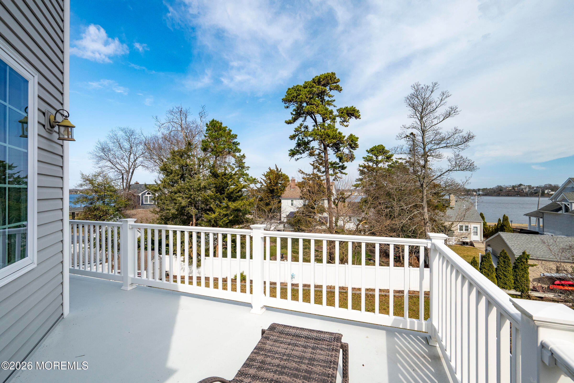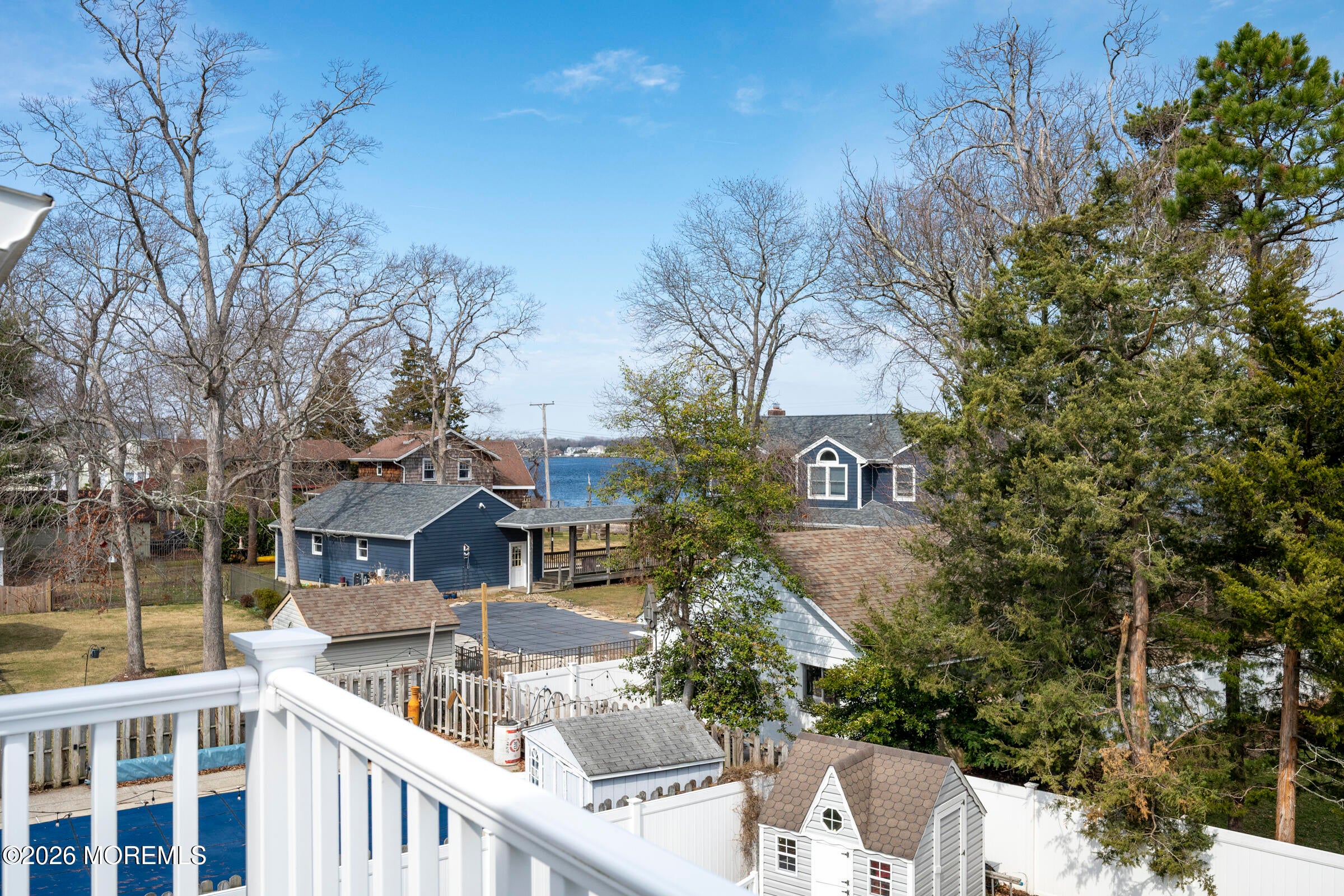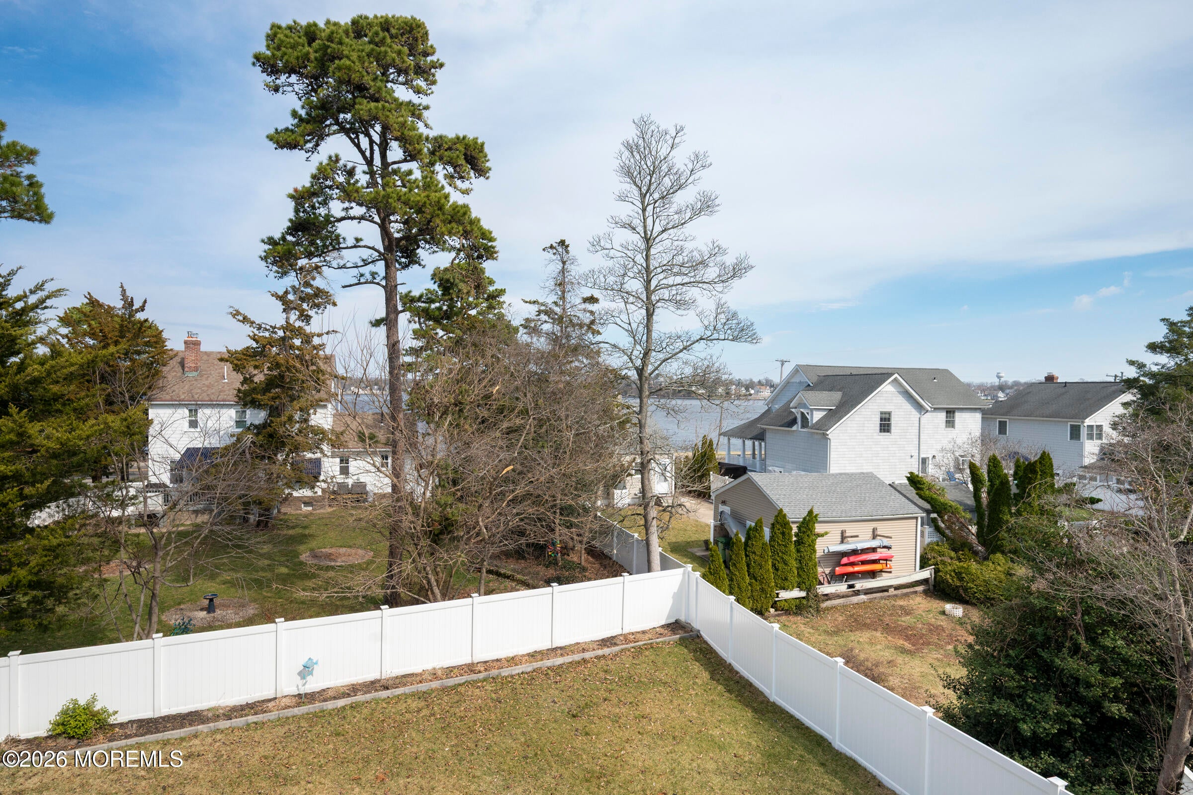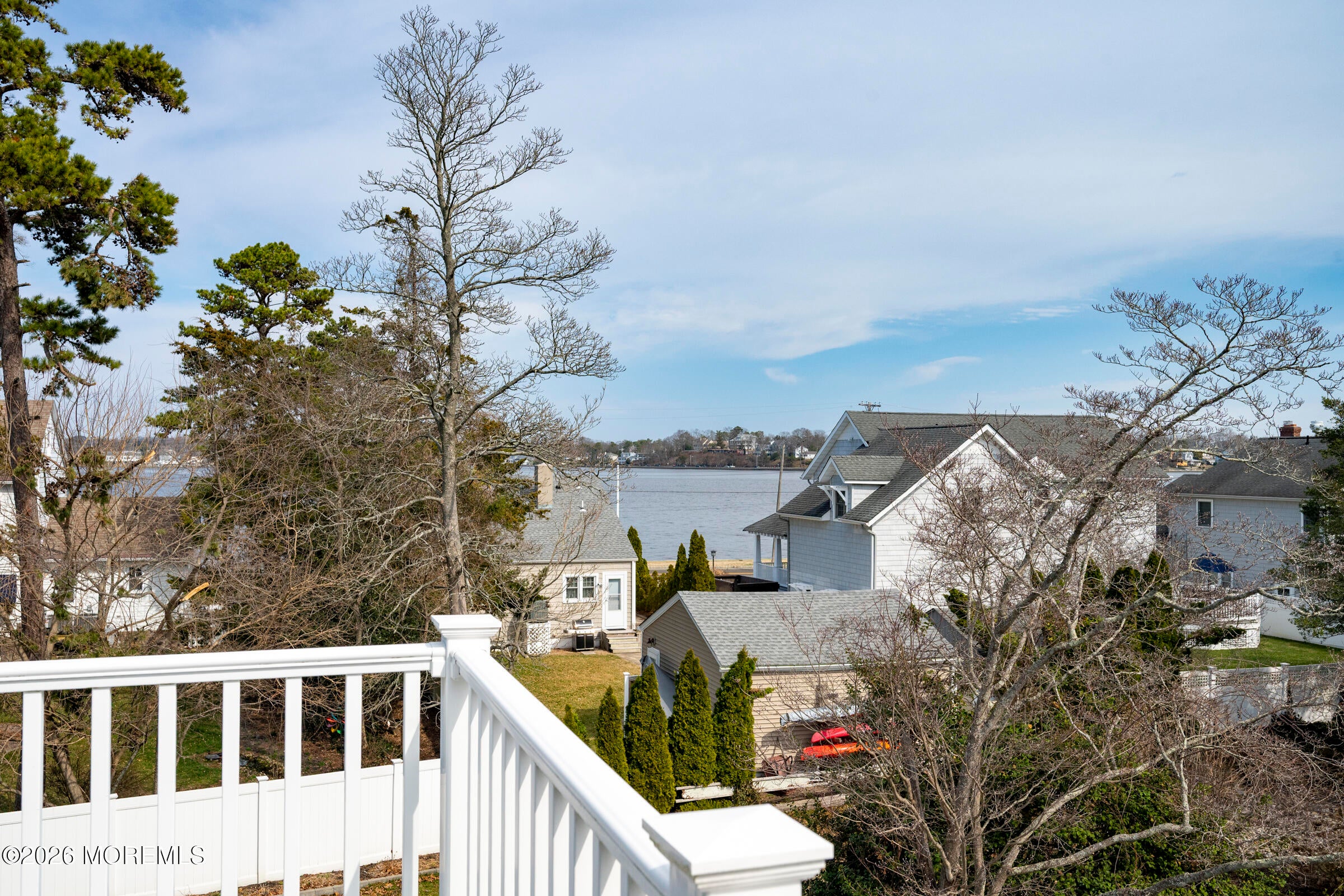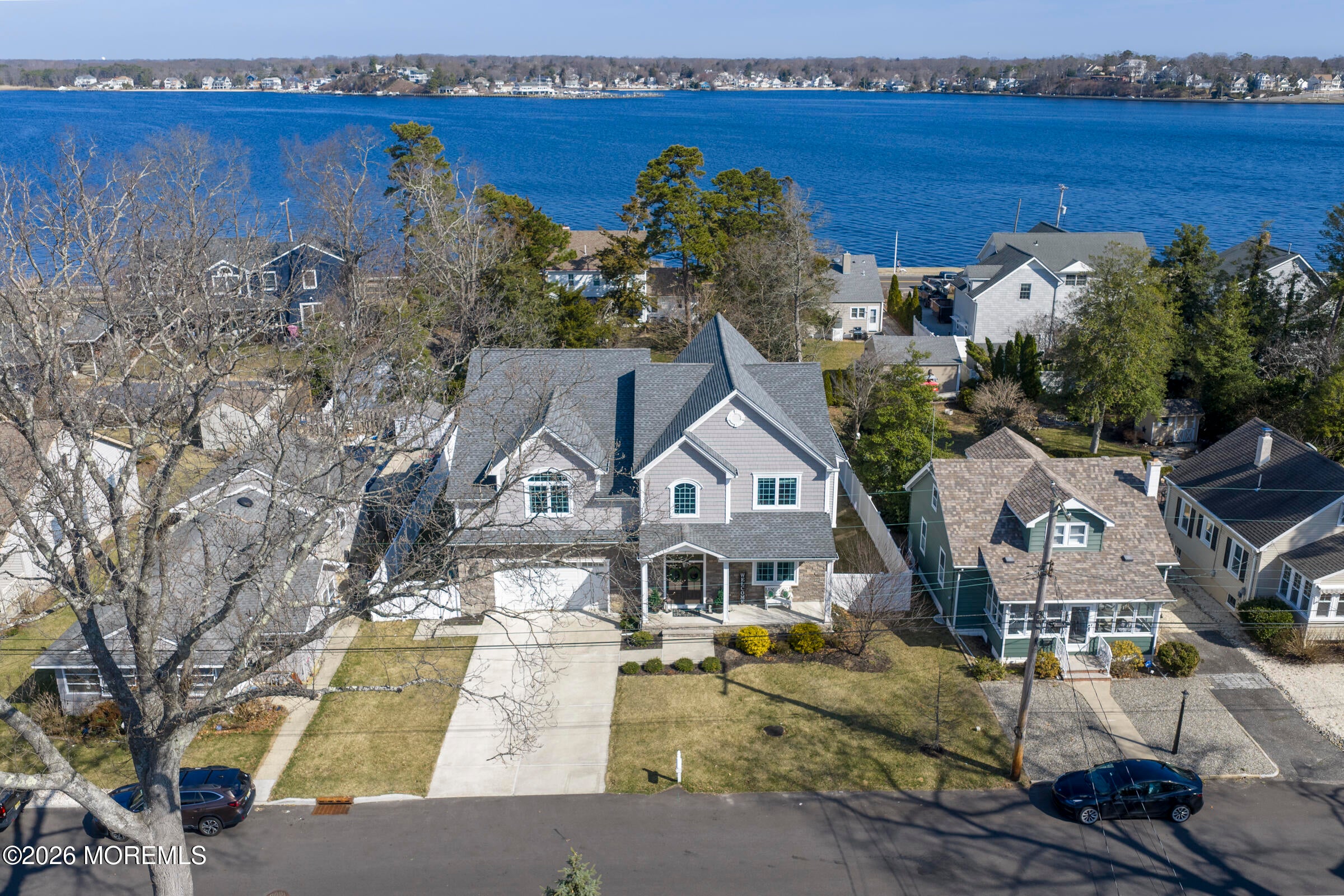 Welcome to this stunning custom-built residence in the highly desirable Eagles Pointe section of Pine Beach, perfectly positioned just one home from the water with beautiful views of the Toms River! Built in 2018 with exceptional attention to detail, this 4-bedroom, 4 full bath home offers 3,348 sq ft of thoughtfully designed living space on a 10,400 sq ft lot.An elegant entry welcomes you with custom millwork, detailed trim, a transom window, and a dramatic two-story foyer leading into the main living area featuring wainscoting and a custom illuminated wall niche. The main level boasts soaring 14-foot ceilings, refined finishes, and Cortex luxury vinyl plank flooring throughout. A spacious first-floor bedroom with French doors and a walk-in closet sits beside a full bath, ideal for guests or multigenerational living.The expansive open-concept living area is anchored by a family room showcasing a custom tray ceiling with architectural beam accents, crown molding, recessed lighting, and a beautiful fireplace framed by nearly floor-to-ceiling windows. The space flows seamlessly to a spectacular 25 x 11 covered Trex deck with recessed lighting, overlooking the landscaped backyard complete with vinyl fencing, a paver patio with fire pit, walkway from the side yard, underground sprinklers, and a charming shed.The gourmet kitchen features quartz countertops, an oversized center island, built-in GE Profile double ovens, and KitchenAid stainless steel appliances including a refrigerator and dishwasher just two years old. Large windows above the sink capture water views and fill the space with natural light. A thoughtfully designed mudroom and walk-in pantry with custom shelving provide excellent storage and direct access to the oversized nearly 3-car garage.Upstairs, 12-foot ceilings enhance the spacious feel. Two generously sized junior en-suite bedrooms each offer walk-in closets and private baths, while a laundry room with additional storage sits conveniently in the hallway.The luxurious primary suite is a private retreat with French doors, two walk-in closets, and a spa-inspired bath featuring a jacuzzi soaking tub, double vanity, and walk-in shower with pebble mosaic flooring and built-in niche.The third level offers incredible flexibility with additional living space, a coffee bar area, and a bonus room. Sliding Andersen Windows & Doors doors open to a private third-story balcony with tranquil water views, while a walk-up attic provides even more storage.Offering luxury coastal living in one of the areas most sought-after communities, this exceptional home showcases premium craftsmanship and thoughtful design throughout!