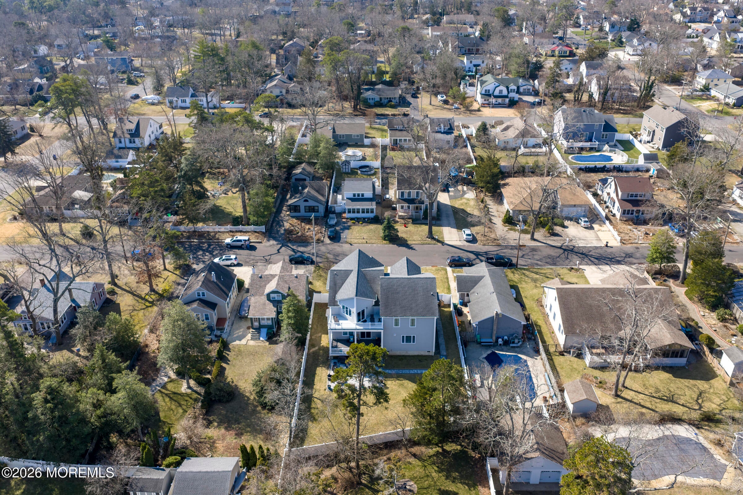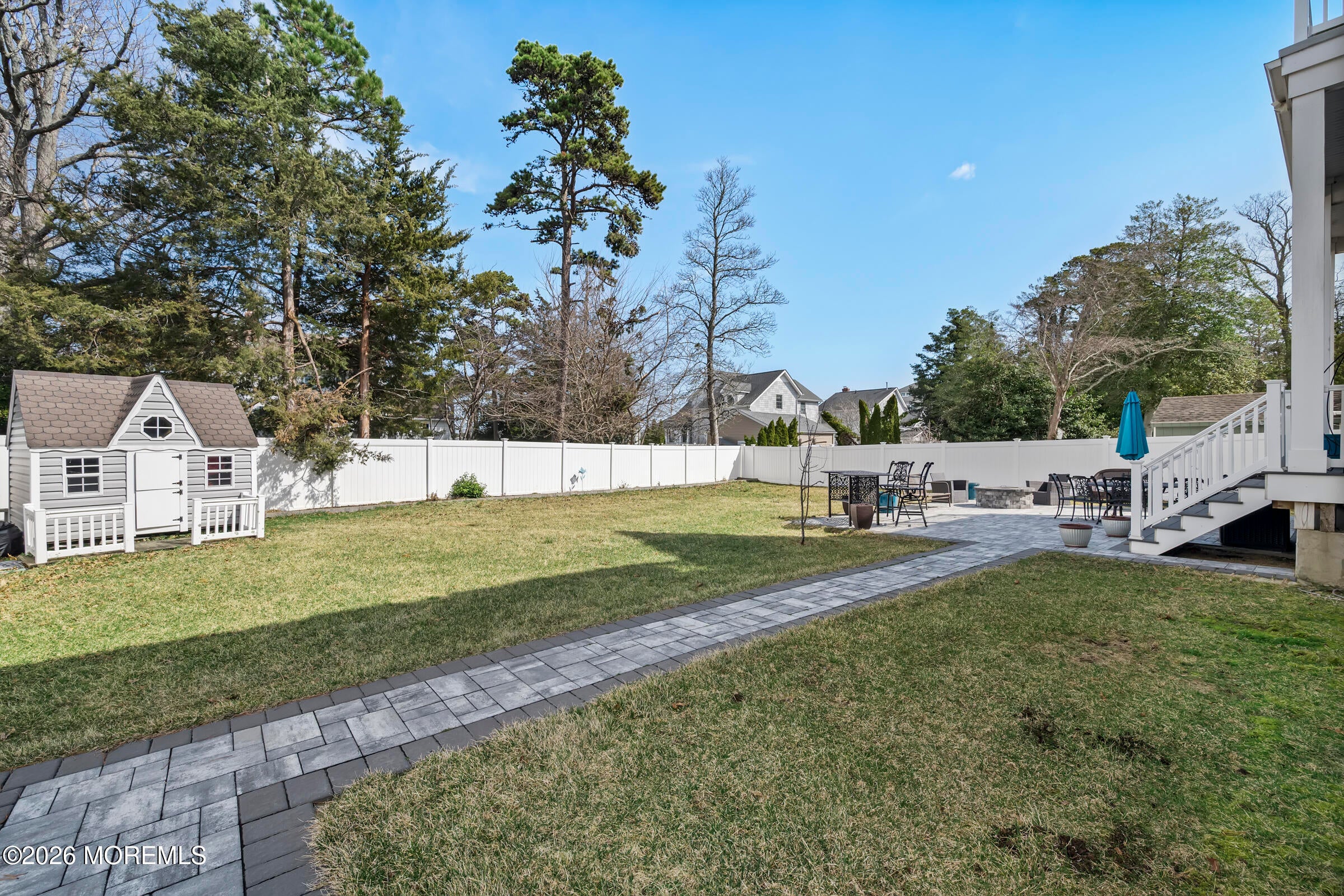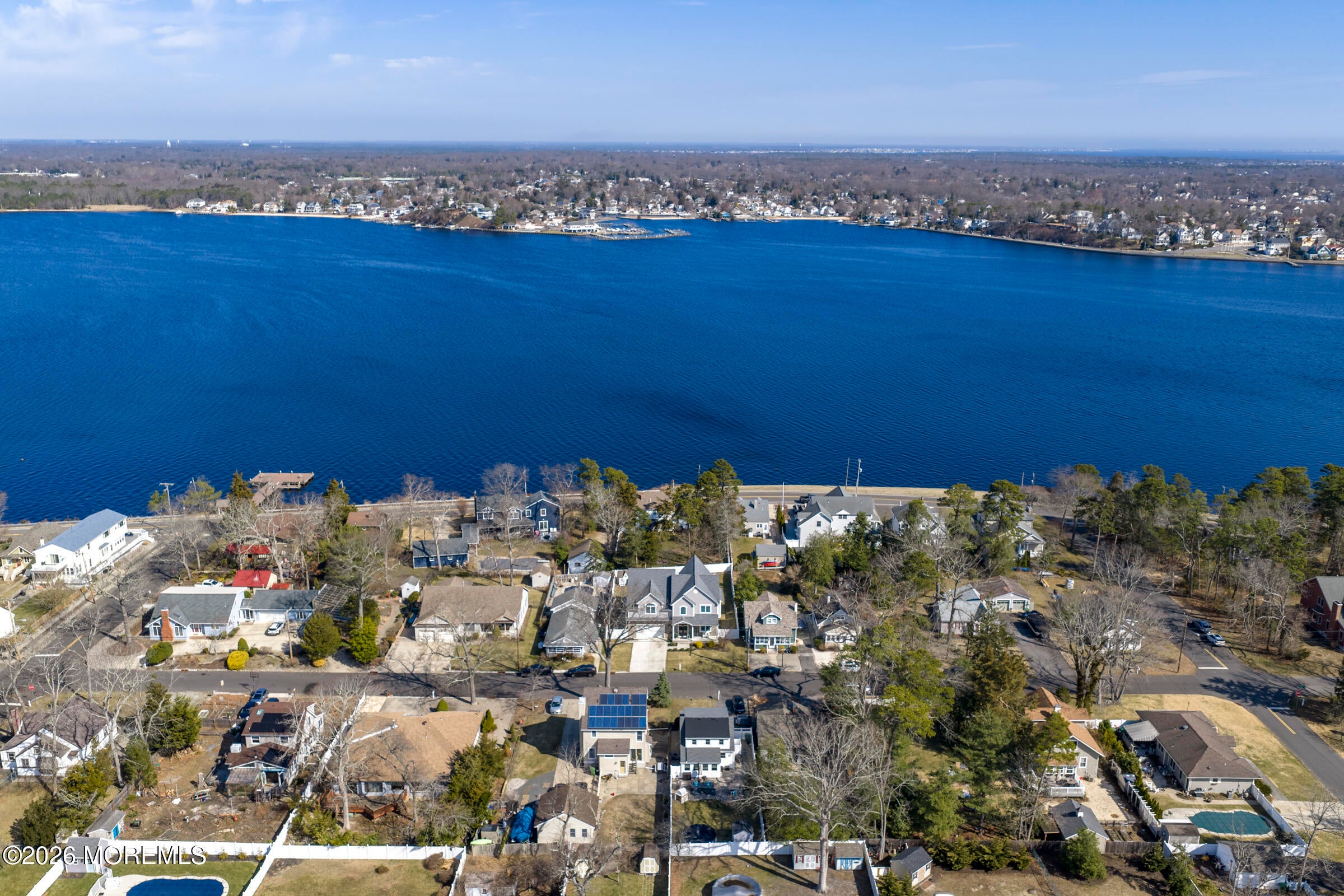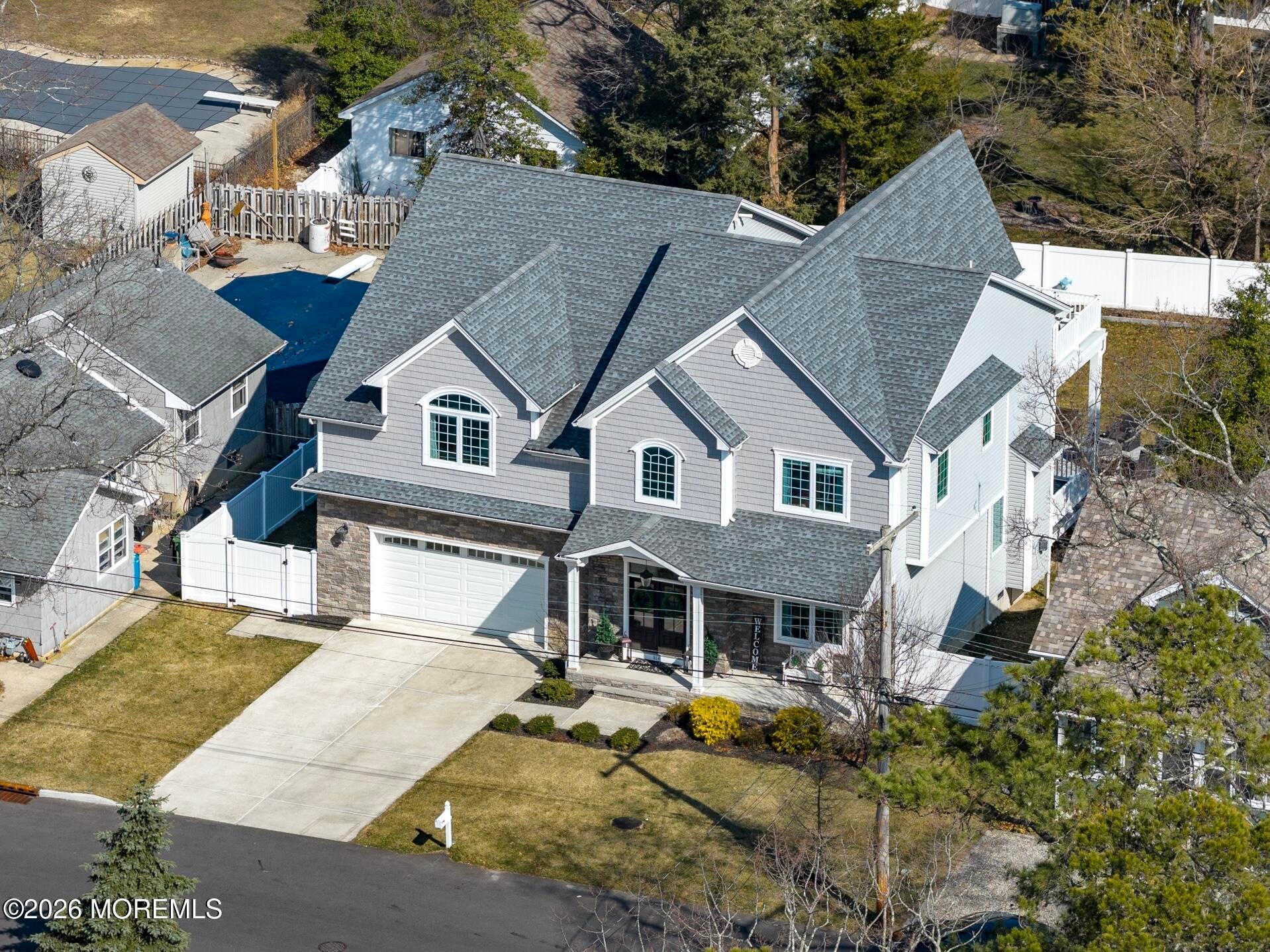 Welcome to this stunning custom-built residence in the highly desirable Eagles Pointe section of Pine Beach, perfectly positioned just one home from the water with beautiful views of the Toms River! Built in 2018 with exceptional attention to detail, this 4-bedroom, 4 full bath home offers 3,348 sq ft of thoughtfully designed living space on a 10,400 sq ft lot.An elegant entry welcomes you with custom millwork, detailed trim, a transom window, and a dramatic two-story foyer leading into the main living area featuring wainscoting and a custom illuminated wall niche. The main level boasts soaring 14-foot ceilings, refined finishes, and Cortex luxury vinyl plank flooring throughout. A spacious first-floor bedroom with French doors and a walk-in closet sits beside a full bath, ideal for guests or multigenerational living.The expansive open-concept living area is anchored by a family room showcasing a custom tray ceiling with architectural beam accents, crown molding, recessed lighting, and a beautiful fireplace framed by nearly floor-to-ceiling windows. The space flows seamlessly to a spectacular 25 x 11 covered Trex deck with recessed lighting, overlooking the landscaped backyard complete with vinyl fencing, a paver patio with fire pit, walkway from the side yard, underground sprinklers, and a charming shed.The gourmet kitchen features quartz countertops, an oversized center island, built-in GE Profile double ovens, and KitchenAid stainless steel appliances including a refrigerator and dishwasher just two years old. Large windows above the sink capture water views and fill the space with natural light. A thoughtfully designed mudroom and walk-in pantry with custom shelving provide excellent storage and direct access to the oversized nearly 3-car garage.Upstairs, 12-foot ceilings enhance the spacious feel. Two generously sized junior en-suite bedrooms each offer walk-in closets and private baths, while a laundry room with additional storage sits conveniently in the hallway.The luxurious primary suite is a private retreat with French doors, two walk-in closets, and a spa-inspired bath featuring a jacuzzi soaking tub, double vanity, and walk-in shower with pebble mosaic flooring and built-in niche.The third level offers incredible flexibility with additional living space, a coffee bar area, and a bonus room. Sliding Andersen Windows & Doors doors open to a private third-story balcony with tranquil water views, while a walk-up attic provides even more storage.Offering luxury coastal living in one of the areas most sought-after communities, this exceptional home showcases premium craftsmanship and thoughtful design throughout!