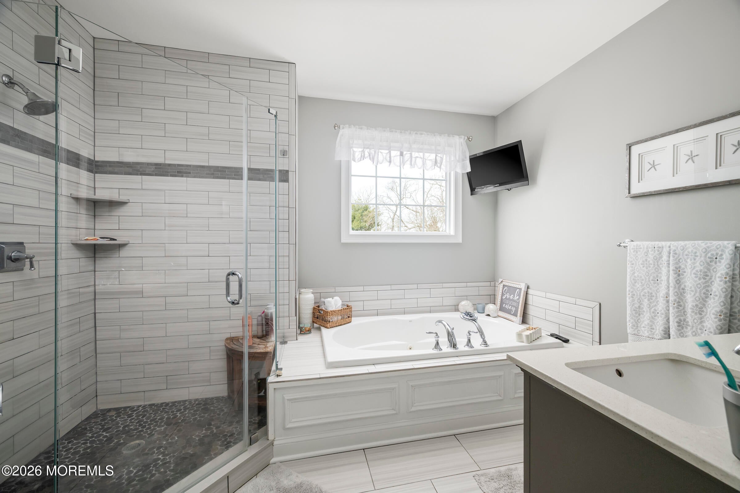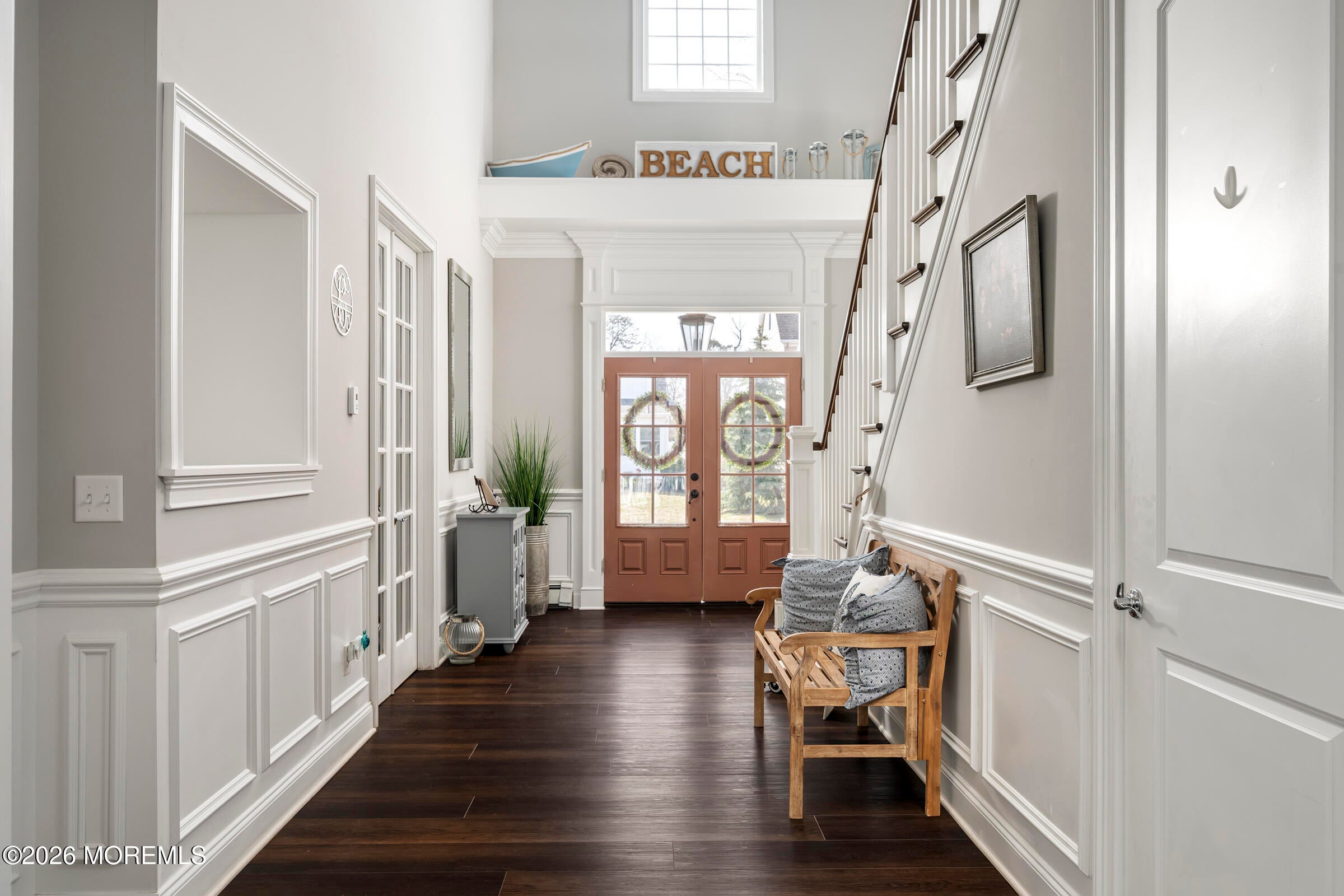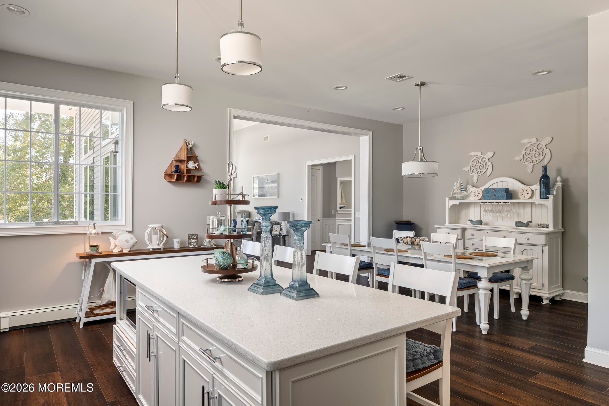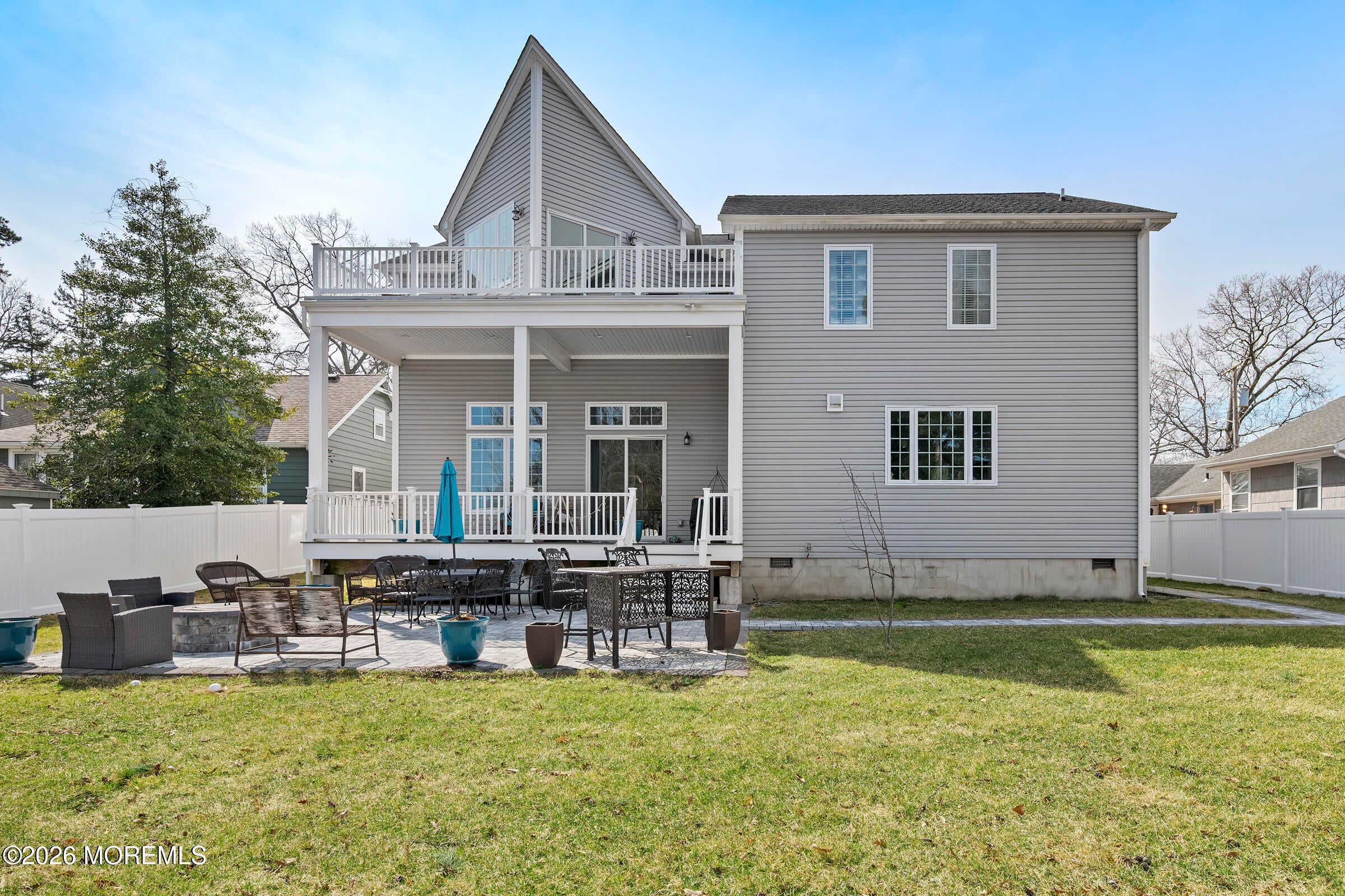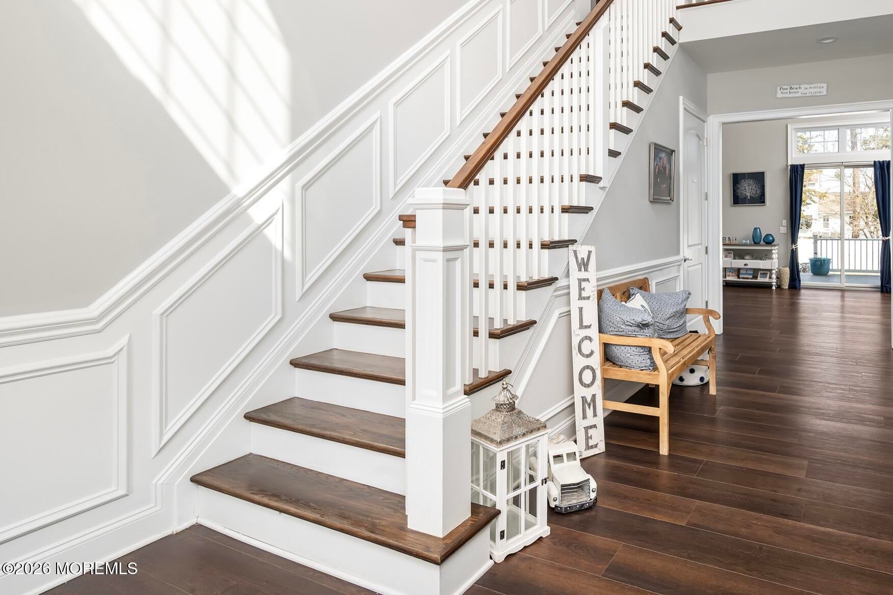 Welcome to this stunning custom-built residence in the highly desirable Eagles Pointe section of Pine Beach, perfectly positioned just one home from the water with beautiful views of the Toms River! Built in 2018 with exceptional attention to detail, this 4-bedroom, 4 full bath home offers 3,348 sq ft of thoughtfully designed living space on a 10,400 sq ft lot.An elegant entry welcomes you with custom millwork, detailed trim, a transom window, and a dramatic two-story foyer leading into the main living area featuring wainscoting and a custom illuminated wall niche. The main level boasts soaring 14-foot ceilings, refined finishes, and Cortex luxury vinyl plank flooring throughout. A spacious first-floor bedroom with French doors and a walk-in closet sits beside a full bath, ideal for guests or multigenerational living.The expansive open-concept living area is anchored by a family room showcasing a custom tray ceiling with architectural beam accents, crown molding, recessed lighting, and a beautiful fireplace framed by nearly floor-to-ceiling windows. The space flows seamlessly to a spectacular 25 x 11 covered Trex deck with recessed lighting, overlooking the landscaped backyard complete with vinyl fencing, a paver patio with fire pit, walkway from the side yard, underground sprinklers, and a charming shed.The gourmet kitchen features quartz countertops, an oversized center island, built-in GE Profile double ovens, and KitchenAid stainless steel appliances including a refrigerator and dishwasher just two years old. Large windows above the sink capture water views and fill the space with natural light. A thoughtfully designed mudroom and walk-in pantry with custom shelving provide excellent storage and direct access to the oversized nearly 3-car garage.Upstairs, 12-foot ceilings enhance the spacious feel. Two generously sized junior en-suite bedrooms each offer walk-in closets and private baths, while a laundry room with additional storage sits conveniently in the hallway.The luxurious primary suite is a private retreat with French doors, two walk-in closets, and a spa-inspired bath featuring a jacuzzi soaking tub, double vanity, and walk-in shower with pebble mosaic flooring and built-in niche.The third level offers incredible flexibility with additional living space, a coffee bar area, and a bonus room. Sliding Andersen Windows & Doors doors open to a private third-story balcony with tranquil water views, while a walk-up attic provides even more storage.Offering luxury coastal living in one of the areas most sought-after communities, this exceptional home showcases premium craftsmanship and thoughtful design throughout!