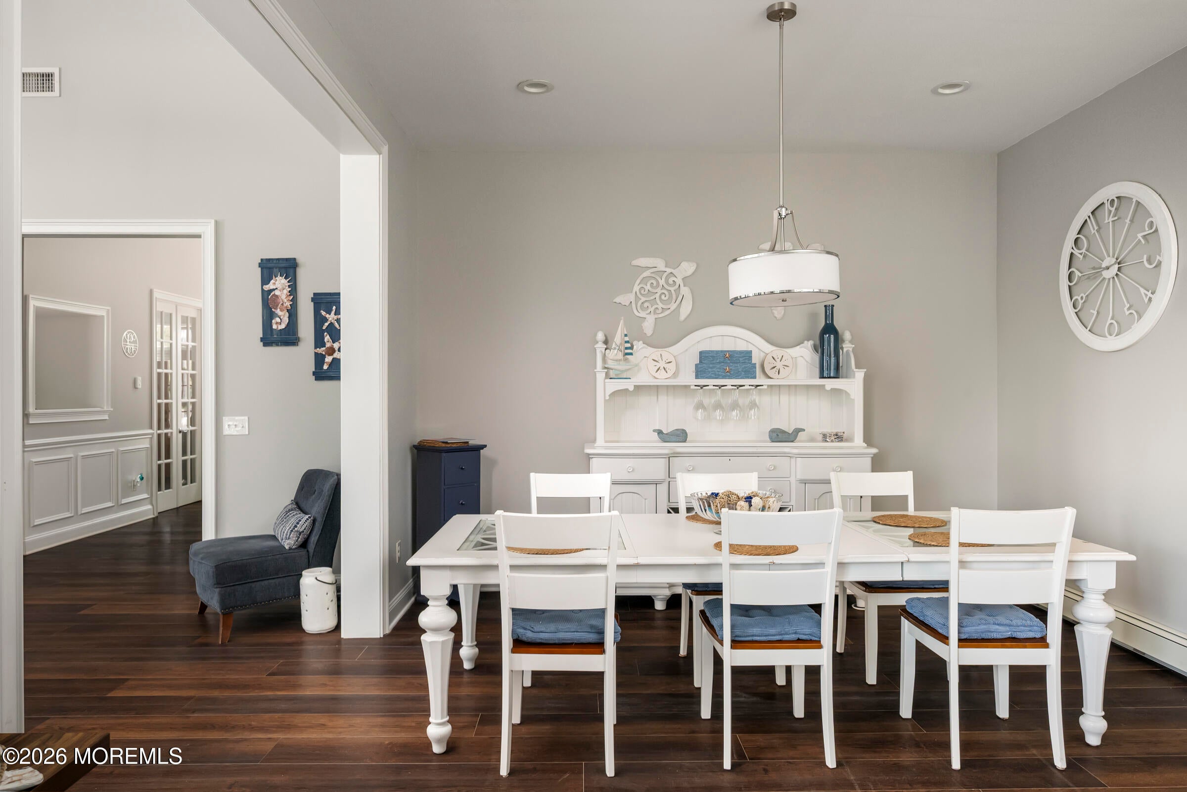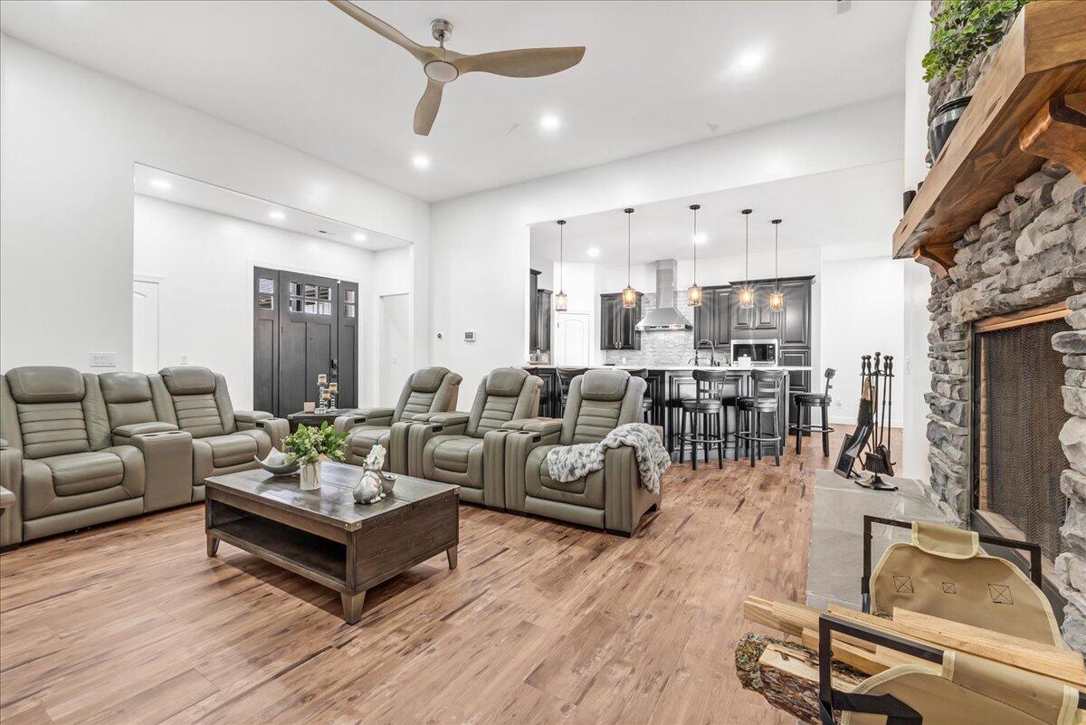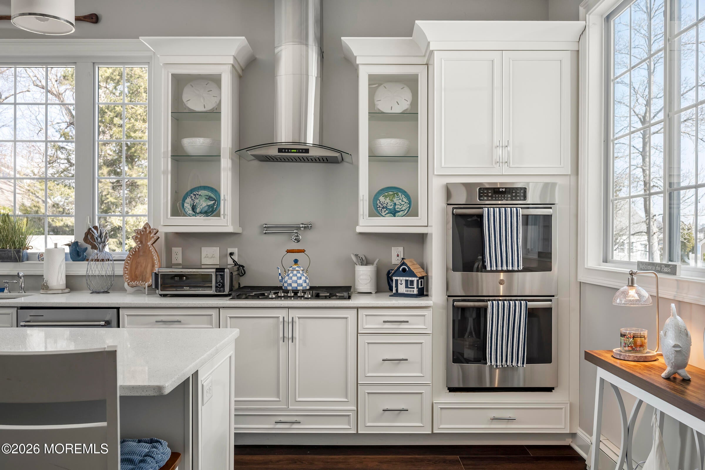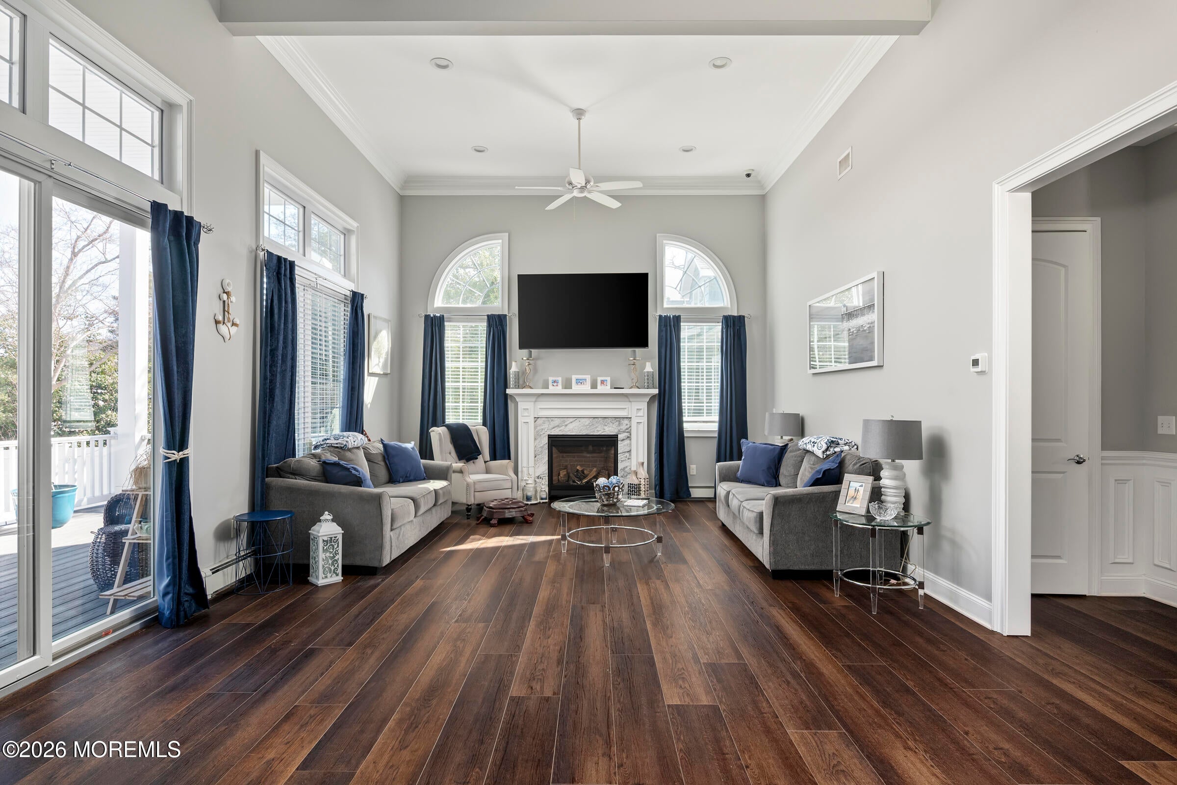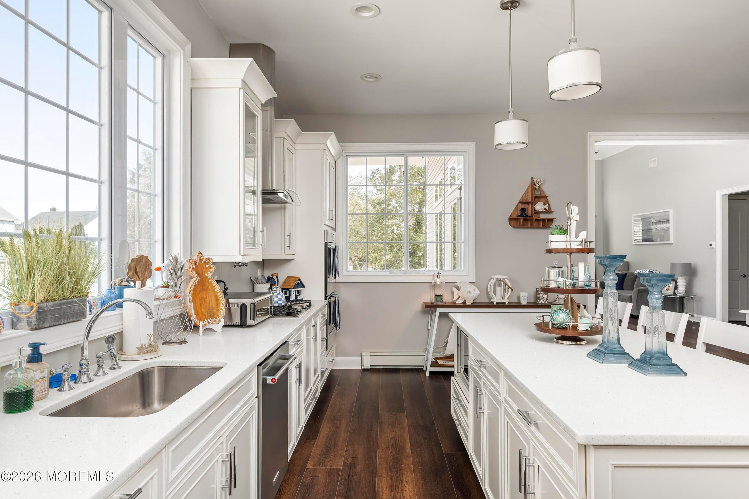 Welcome to this stunning custom-built residence in the highly desirable Eagles Pointe section of Pine Beach, perfectly positioned just one home from the water with beautiful views of the Toms River! Built in 2018 with exceptional attention to detail, this 4-bedroom, 4 full bath home offers 3,348 sq ft of thoughtfully designed living space on a 10,400 sq ft lot.An elegant entry welcomes you with custom millwork, detailed trim, a transom window, and a dramatic two-story foyer leading into the main living area featuring wainscoting and a custom illuminated wall niche. The main level boasts soaring 14-foot ceilings, refined finishes, and Cortex luxury vinyl plank flooring throughout. A spacious first-floor bedroom with French doors and a walk-in closet sits beside a full bath, ideal for guests or multigenerational living.The expansive open-concept living area is anchored by a family room showcasing a custom tray ceiling with architectural beam accents, crown molding, recessed lighting, and a beautiful fireplace framed by nearly floor-to-ceiling windows. The space flows seamlessly to a spectacular 25 x 11 covered Trex deck with recessed lighting, overlooking the landscaped backyard complete with vinyl fencing, a paver patio with fire pit, walkway from the side yard, underground sprinklers, and a charming shed.The gourmet kitchen features quartz countertops, an oversized center island, built-in GE Profile double ovens, and KitchenAid stainless steel appliances including a refrigerator and dishwasher just two years old. Large windows above the sink capture water views and fill the space with natural light. A thoughtfully designed mudroom and walk-in pantry with custom shelving provide excellent storage and direct access to the oversized nearly 3-car garage.Upstairs, 12-foot ceilings enhance the spacious feel. Two generously sized junior en-suite bedrooms each offer walk-in closets and private baths, while a laundry room with additional storage sits conveniently in the hallway.The luxurious primary suite is a private retreat with French doors, two walk-in closets, and a spa-inspired bath featuring a jacuzzi soaking tub, double vanity, and walk-in shower with pebble mosaic flooring and built-in niche.The third level offers incredible flexibility with additional living space, a coffee bar area, and a bonus room. Sliding Andersen Windows & Doors doors open to a private third-story balcony with tranquil water views, while a walk-up attic provides even more storage.Offering luxury coastal living in one of the areas most sought-after communities, this exceptional home showcases premium craftsmanship and thoughtful design throughout!