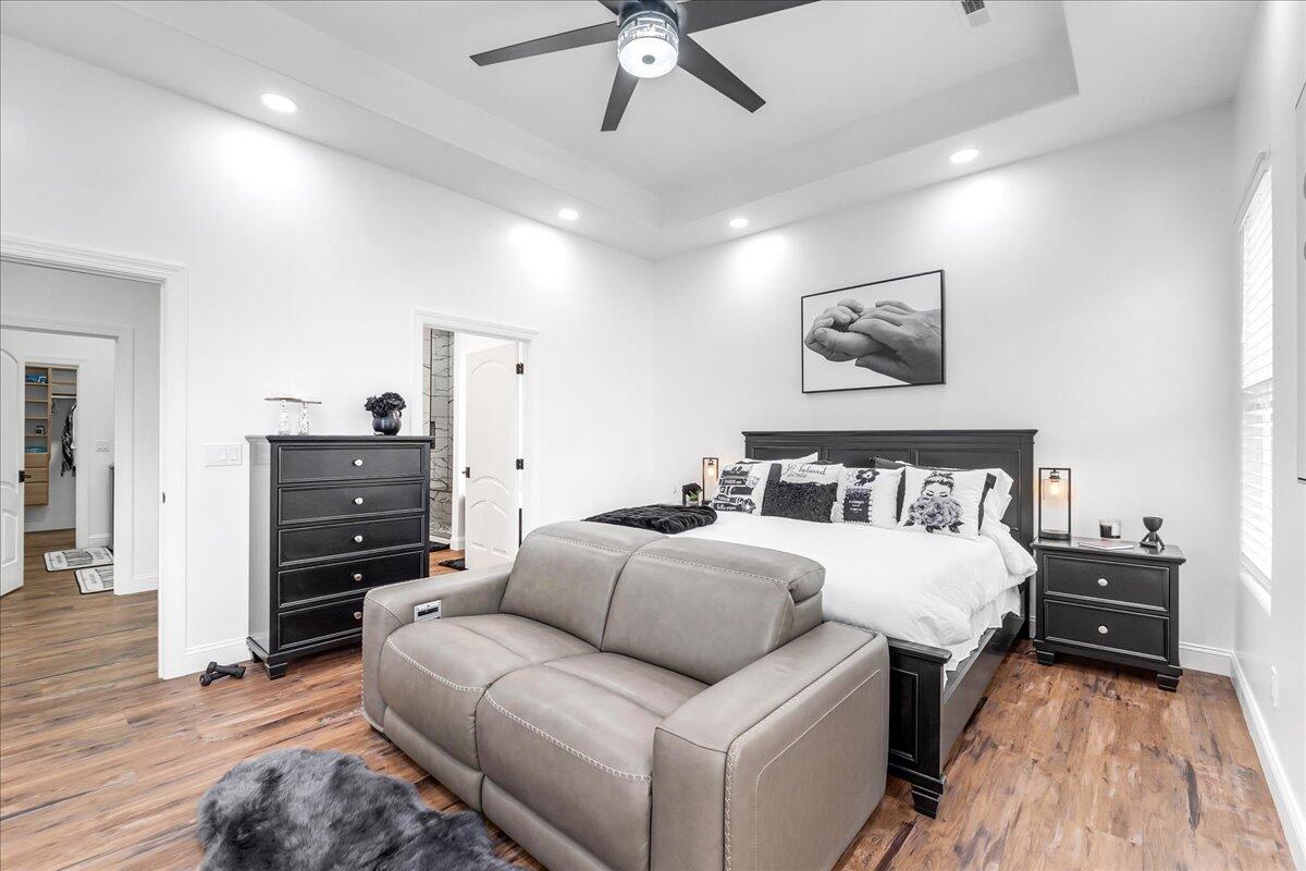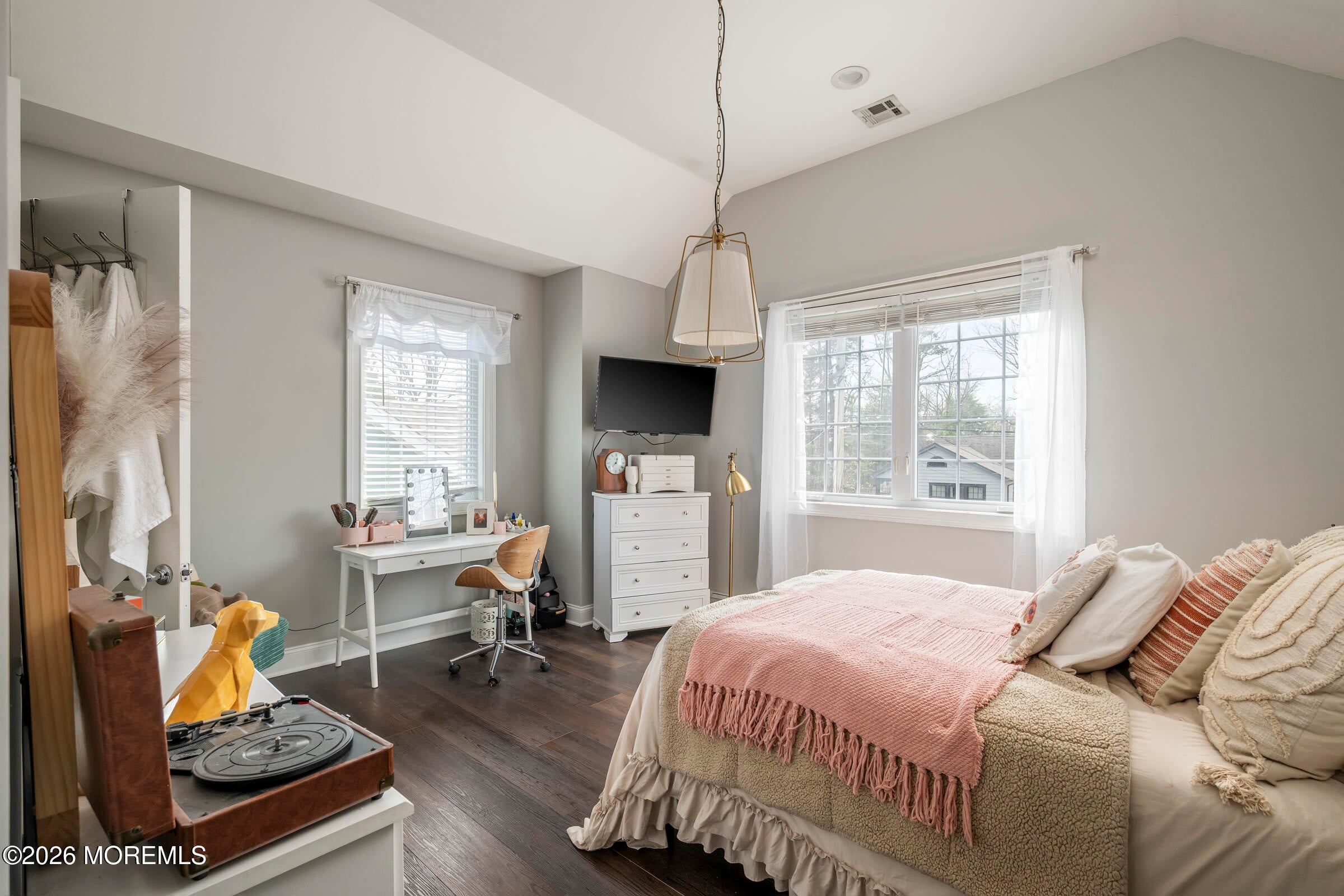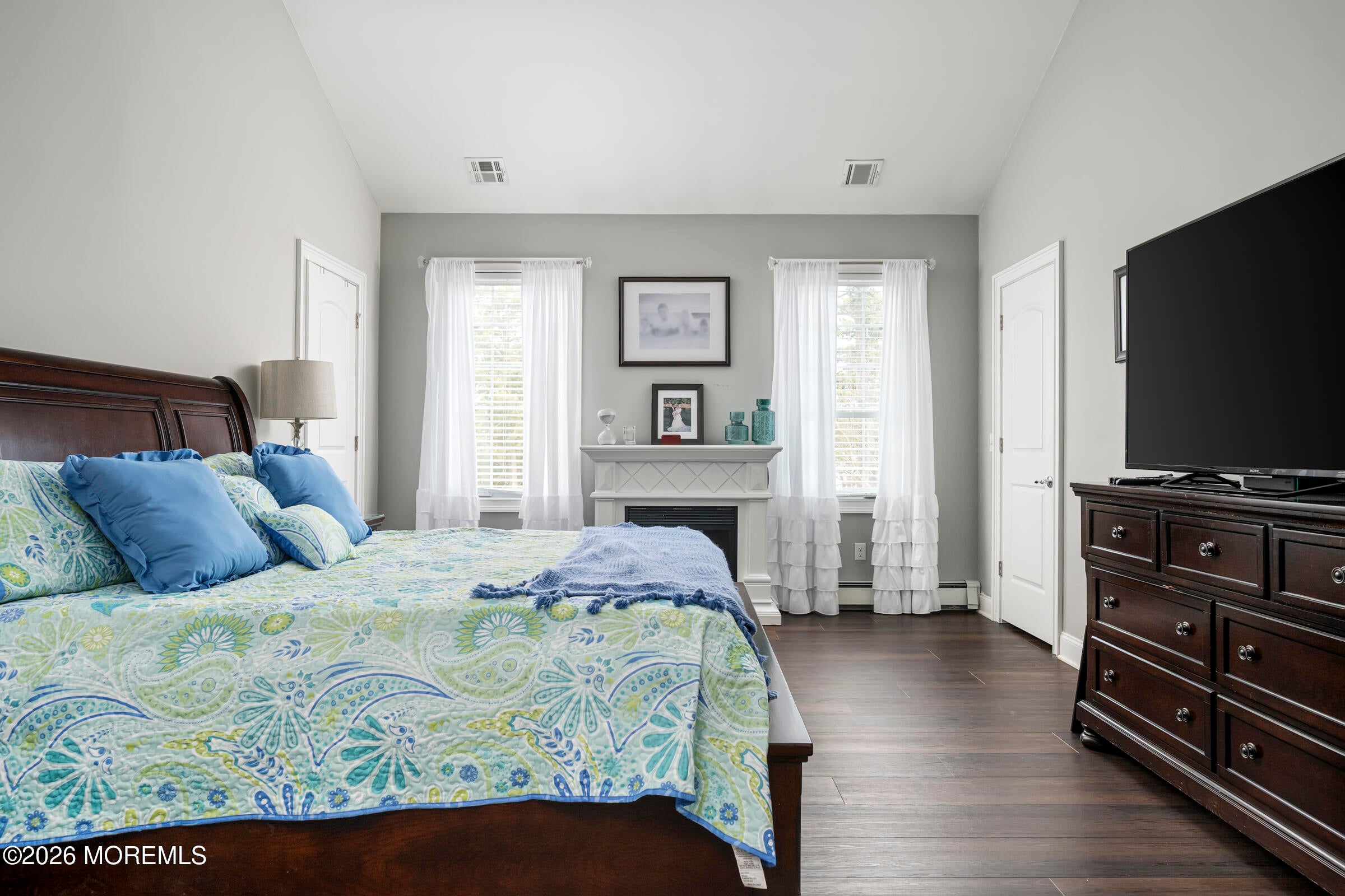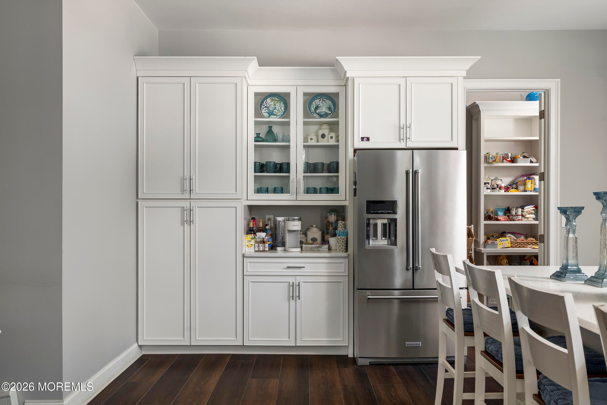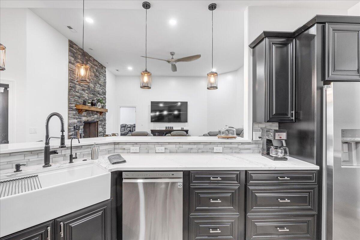 Welcome to this stunning custom-built residence in the highly desirable Eagles Pointe section of Pine Beach, perfectly positioned just one home from the water with beautiful views of the Toms River! Built in 2018 with exceptional attention to detail, this 4-bedroom, 4 full bath home offers 3,348 sq ft of thoughtfully designed living space on a 10,400 sq ft lot.An elegant entry welcomes you with custom millwork, detailed trim, a transom window, and a dramatic two-story foyer leading into the main living area featuring wainscoting and a custom illuminated wall niche. The main level boasts soaring 14-foot ceilings, refined finishes, and Cortex luxury vinyl plank flooring throughout. A spacious first-floor bedroom with French doors and a walk-in closet sits beside a full bath, ideal for guests or multigenerational living.The expansive open-concept living area is anchored by a family room showcasing a custom tray ceiling with architectural beam accents, crown molding, recessed lighting, and a beautiful fireplace framed by nearly floor-to-ceiling windows. The space flows seamlessly to a spectacular 25 x 11 covered Trex deck with recessed lighting, overlooking the landscaped backyard complete with vinyl fencing, a paver patio with fire pit, walkway from the side yard, underground sprinklers, and a charming shed.The gourmet kitchen features quartz countertops, an oversized center island, built-in GE Profile double ovens, and KitchenAid stainless steel appliances including a refrigerator and dishwasher just two years old. Large windows above the sink capture water views and fill the space with natural light. A thoughtfully designed mudroom and walk-in pantry with custom shelving provide excellent storage and direct access to the oversized nearly 3-car garage.Upstairs, 12-foot ceilings enhance the spacious feel. Two generously sized junior en-suite bedrooms each offer walk-in closets and private baths, while a laundry room with additional storage sits conveniently in the hallway.The luxurious primary suite is a private retreat with French doors, two walk-in closets, and a spa-inspired bath featuring a jacuzzi soaking tub, double vanity, and walk-in shower with pebble mosaic flooring and built-in niche.The third level offers incredible flexibility with additional living space, a coffee bar area, and a bonus room. Sliding Andersen Windows & Doors doors open to a private third-story balcony with tranquil water views, while a walk-up attic provides even more storage.Offering luxury coastal living in one of the areas most sought-after communities, this exceptional home showcases premium craftsmanship and thoughtful design throughout!