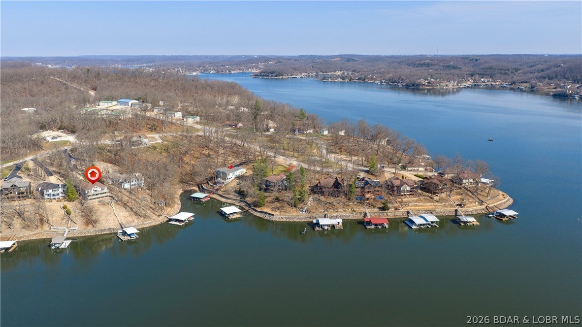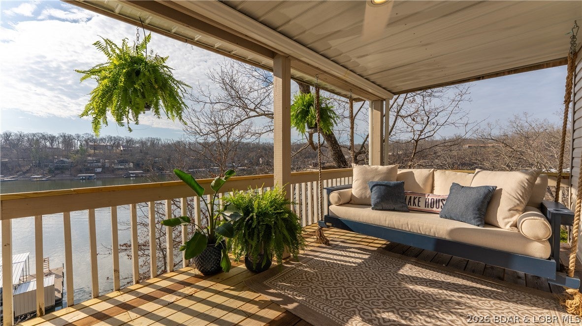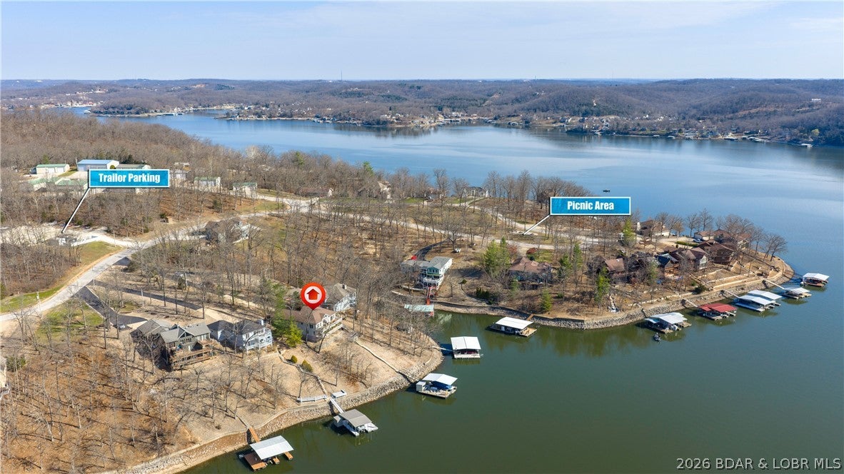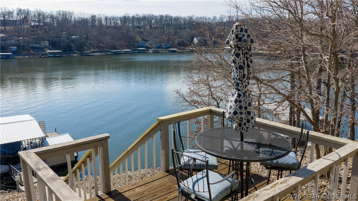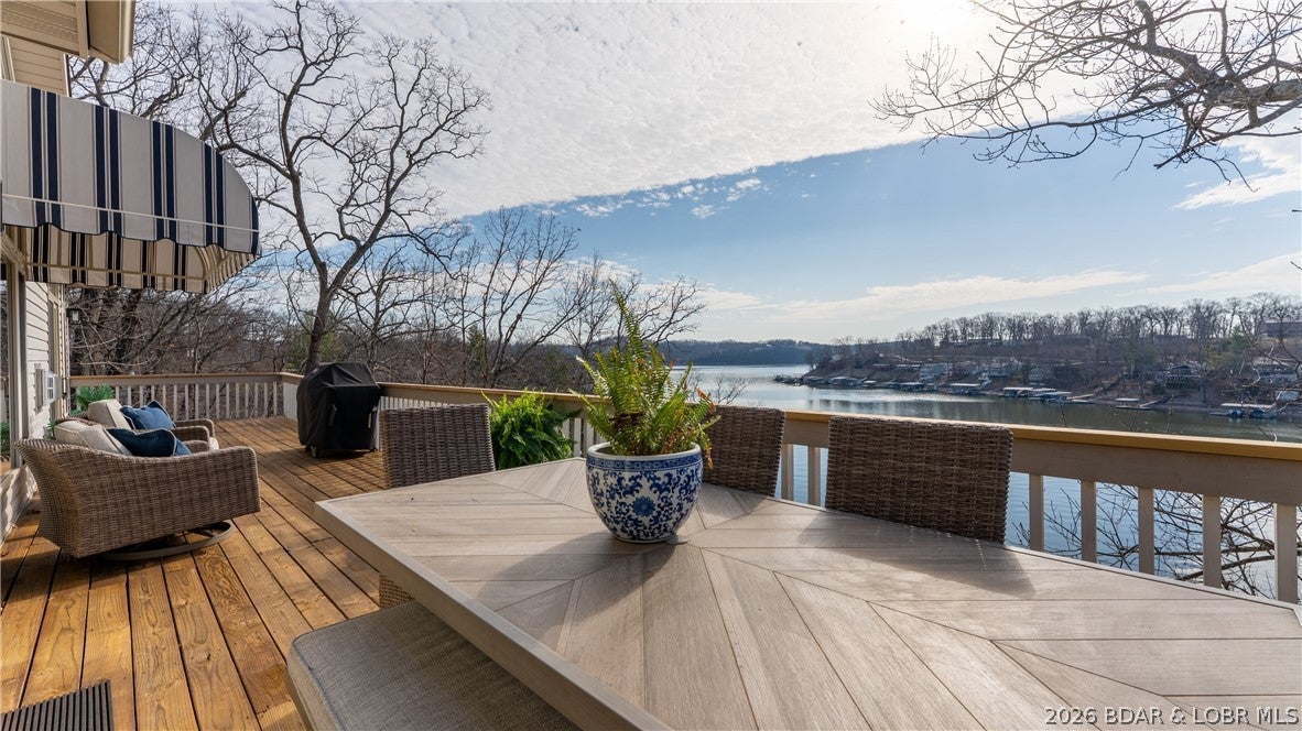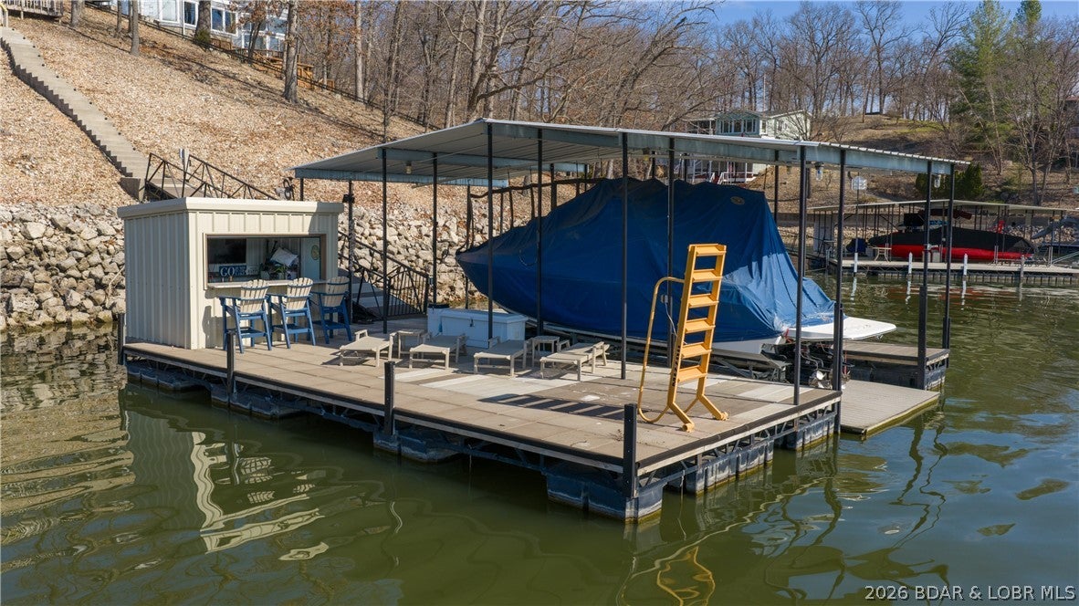 No wake cove at the 34-mile marker of the Osage, this 4-bed, 4.5 bath lakefront home offers rare privacy, space, and main channel views. Step inside to an open main level designed for easy living and entertaining, where the updated kitchen flows into the living area and out to expansive lake views. Primary suite, guest bedroom, full bath, laundry room, and bath create comfortable main-level living. The lower level is set up for hosting with a second living area, wet bar, a second ensuite, 4th bedroom, and another full bath, giving family and guests their own space. Outdoor living continues with open and covered decking, an awning for shade, and an easy walk to the dock. The 12x32 slip includes a 10,000 lb Polylift with remote, Wet Steps ladder, PWC port in calm, deep water. Numerous curated designer upgrades throughout (property highlights sheet), newer HVAC systems, and a well-maintained interior make this move-in ready. Attached 2-car garage with epoxy floors and extra storage. Assessment fee covers water, sewer, trash, street lights, park area, and trailer parking. Close to Captain Rons, Bulldogs Beach House, and Stewarts on the Water. Furniture package available.