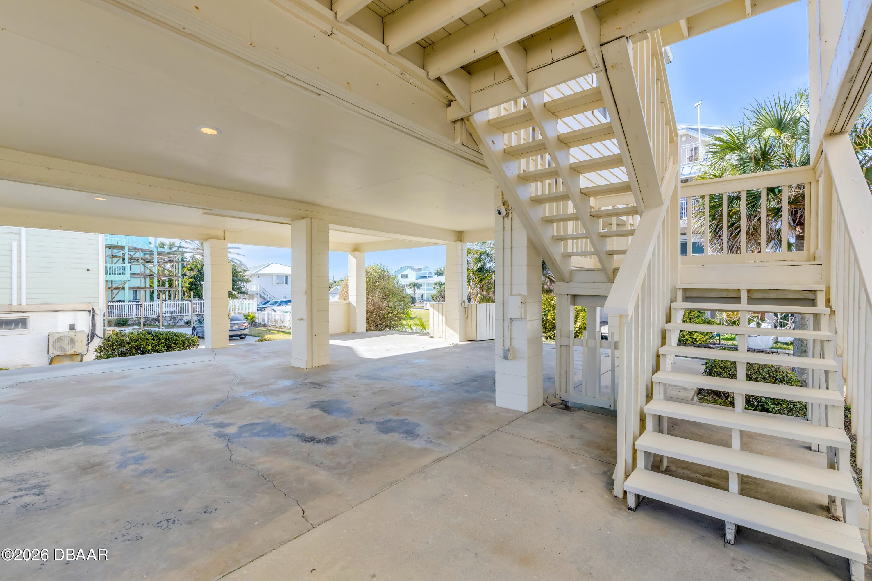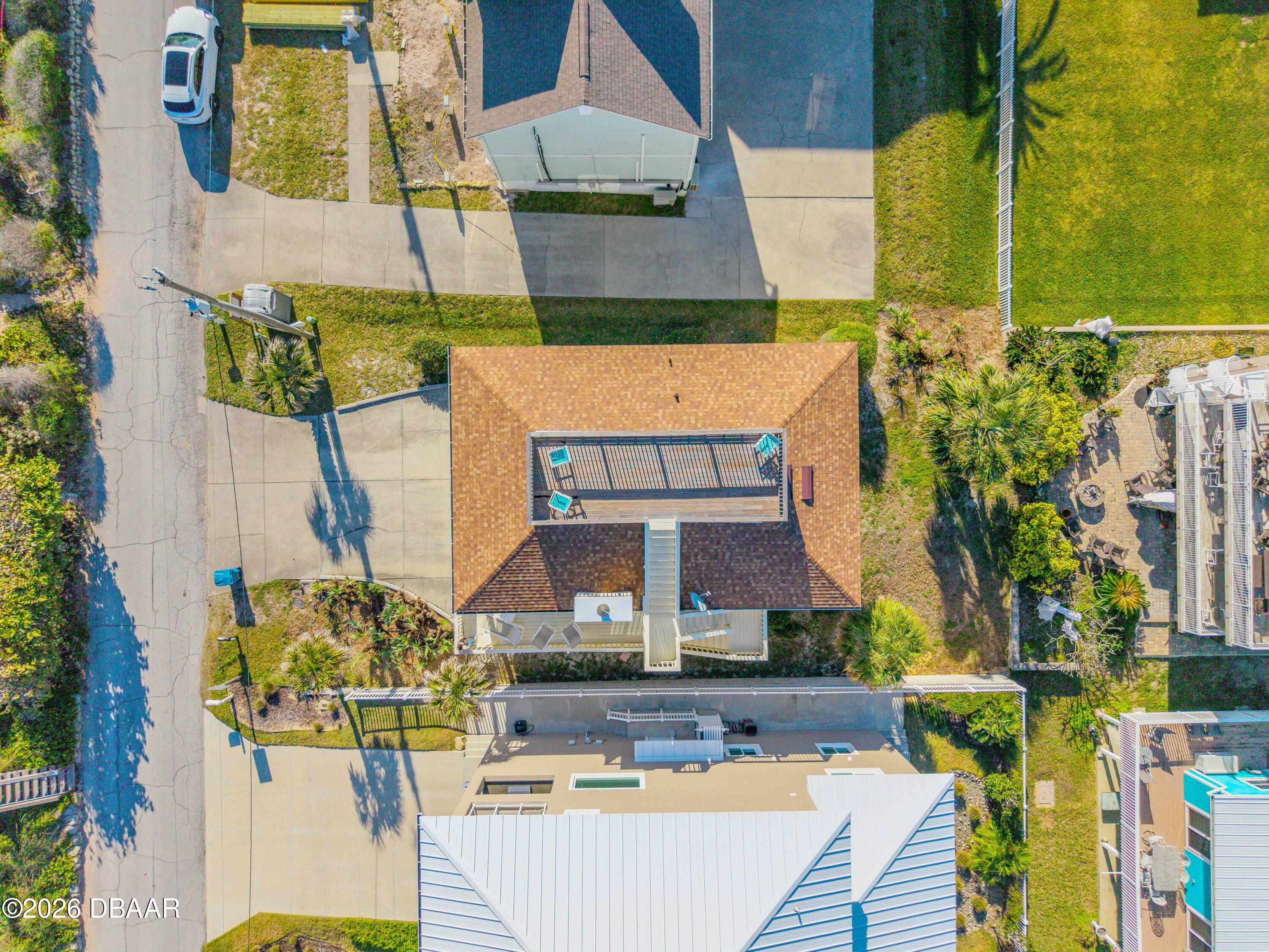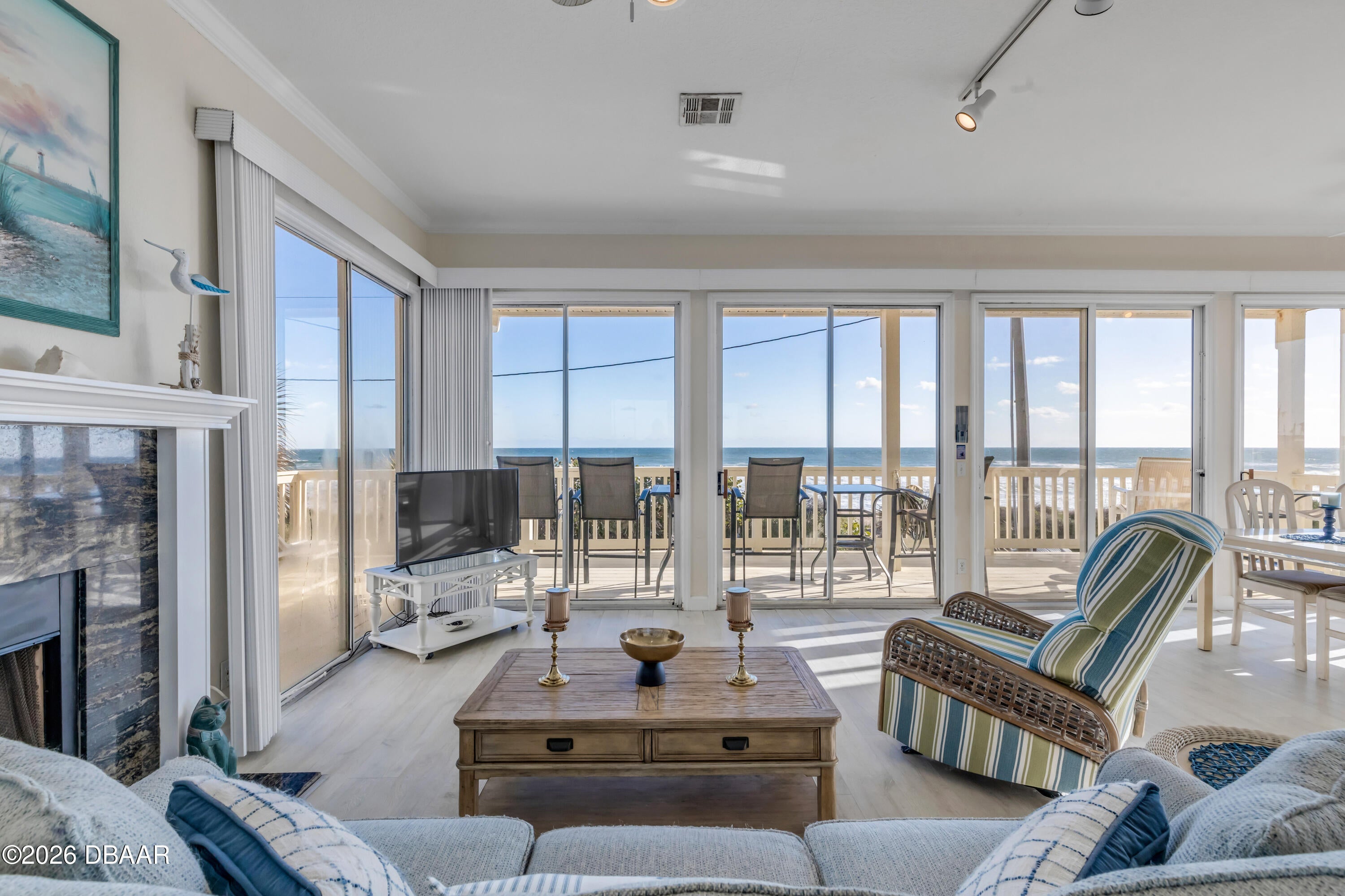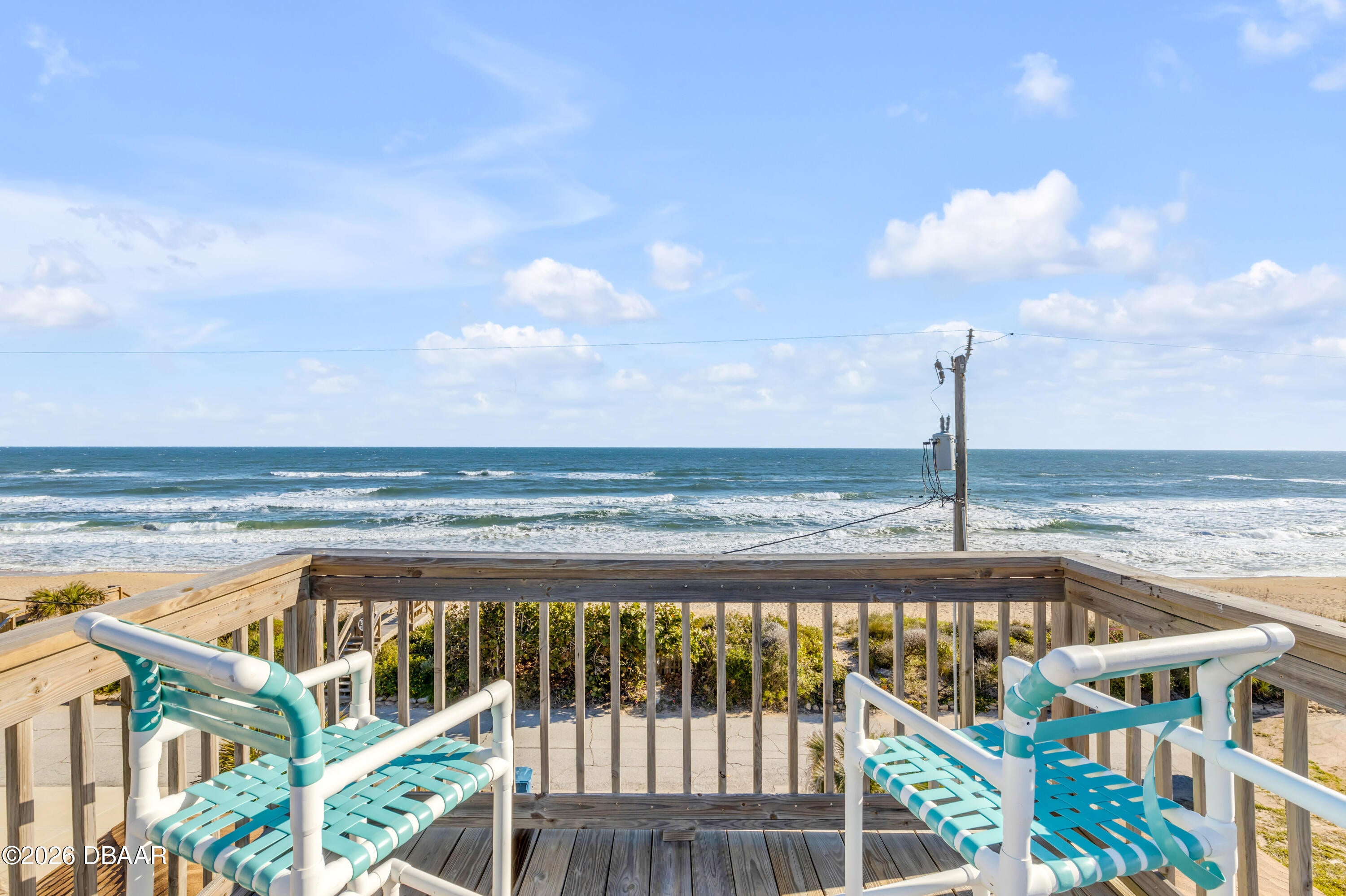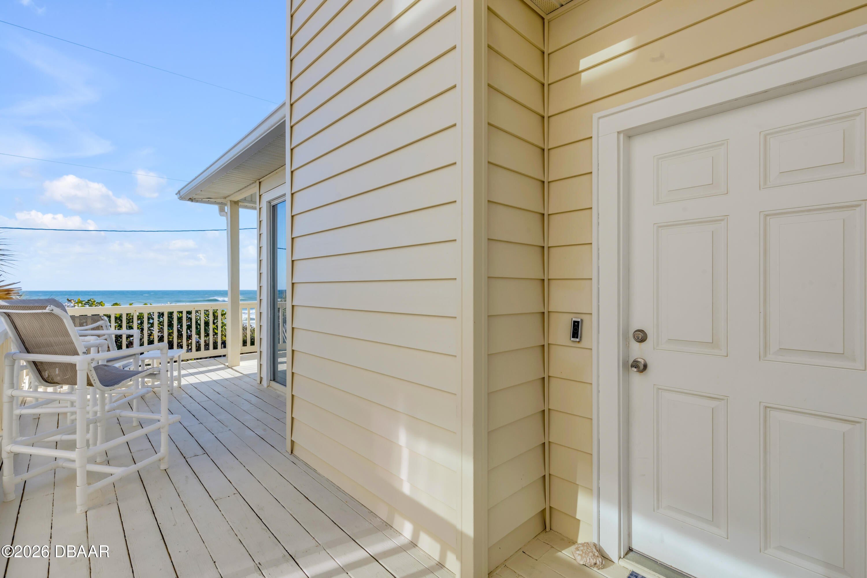 Wake up to glowing ocean sunrises in Bethune Beach, one of New Smyrna Beachs most cherished coastal communities. This direct oceanfront two-bedroom, two-bath home features an east-facing design that captures sweeping Atlantic views from every main living space. Wall-to-wall sliding glass doors span the living room, dining area, and kitchen, creating a stunning 180-degree ocean backdrop and opening to a wraparound covered deck where sea breezes become part of daily life. Inside, the home offers a spacious living room with cozy fireplace, kitchen and dining area with eat in bar and a flexible layout ready for your personal updates. 2 bedrooms each with their own attached en-suite baths offers comfort and privacy. Lots of closet space and built in laundry as well. Recent improvements provide peace of mind, including a new roof in 2024 and a new HVAC system in 2025. Above it all, an oversized sky deck delivers elevated views of both the ocean and the estuaryideal for sunrise mornings, sunset evenings, or quiet moments under the stars. Parking is effortless with an oversized covered carport and a spacious driveway for guests. Your very own personal and private beach access is just outside your door. And youre conveniently close to the Canaveral National Seashore, JBs Fish Camp, and the shops and restaurants of Flagler Avenue and Canal Street. This Bethune Beach home presents a rare opportunity to create your own oceanfront retreat in a truly special setting.