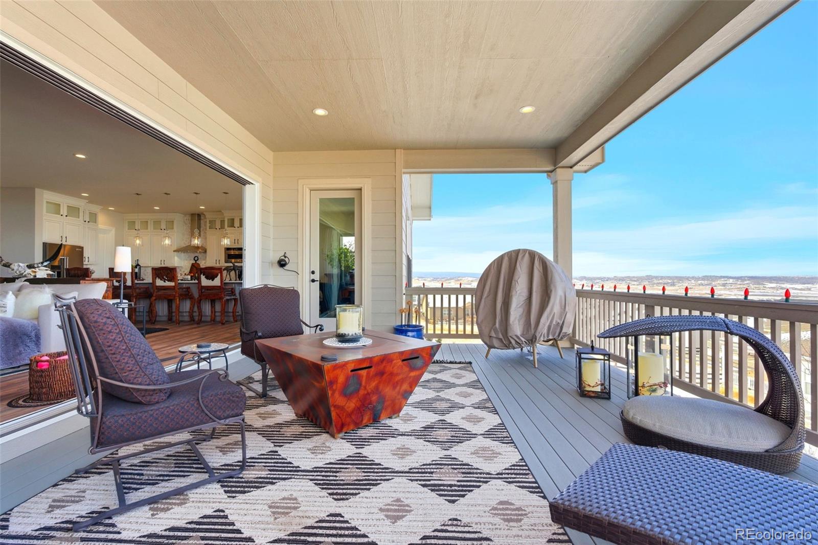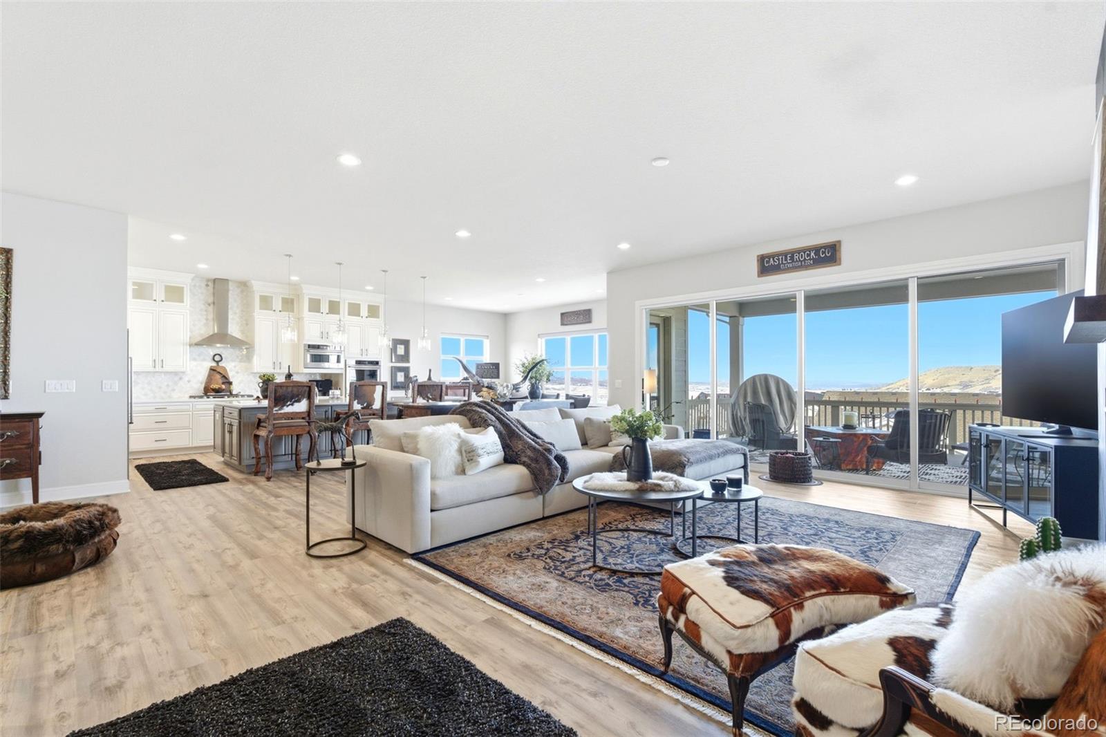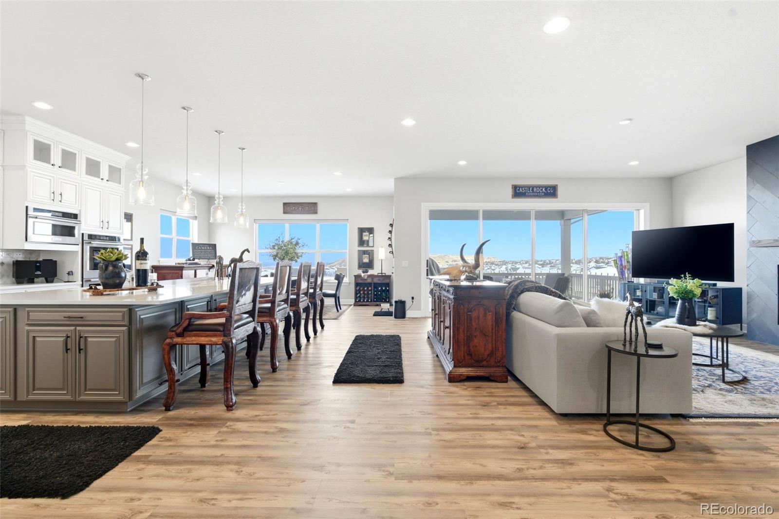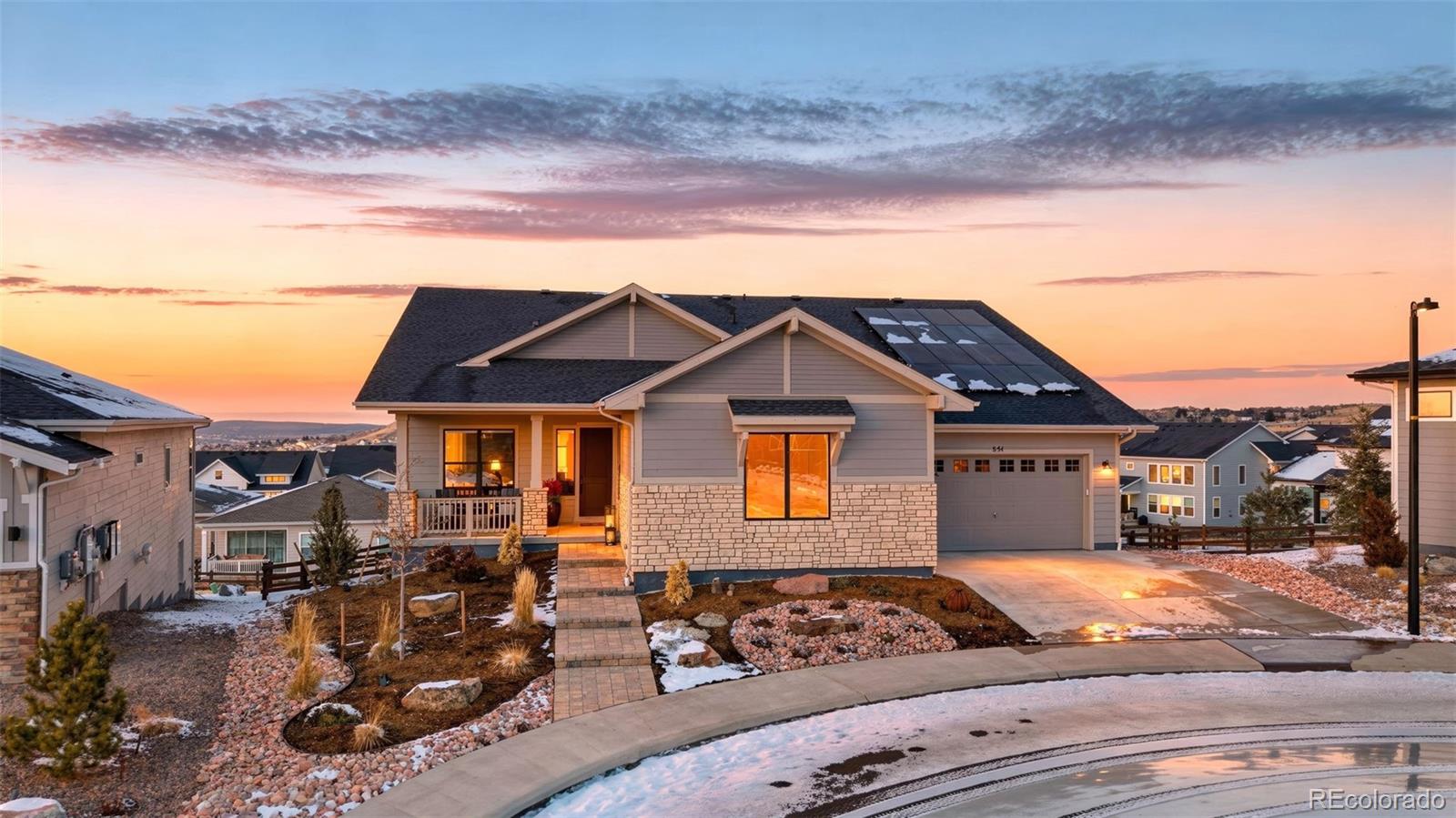 Welcome to effortless main-level living in Montaines sought-after Regency Collection, Castle Rocks premier 55 luxury community. Set in a friendly cul-de-sac where neighbors connect through holiday gatherings and everyday support, this home offers the peace of mind that comes from living among people who truly care. The open-concept floor plan is filled with natural light and features high ceilings, wide plank flooring, and a stunning great room with front range views, gas fireplace and large nesting sliding glass doors, creating a seamless indoor-outdoor flow perfect for entertaining. Electronic window coverings throughout the home add modern convenience and a polished finish.The gourmet kitchen is the heart of the home, showcasing an oversized island, custom cabinetry, quartz and granite countertops, double ovens, walk-in pantry, and generous prep spaceideal for both everyday living and hosting.The primary suite is a private retreat, complete with its own gas fireplace, radiant heated floors in the spa-inspired five-piece bath, and a spacious walk-in closet. A secondary bedroom with ensuite bath and a dedicated home office provide flexibility for guests, hobbies, or work-from-home needs. Convenient main-level laundry enhances ease of living.Step outside to the covered composite deck and enjoy open views and peaceful surroundings. The south-facing driveway naturally melts snow, a thoughtful Colorado convenience. Additional highlights include owned solar panels, central A/C, an oversized 3-car garage with EV hookup, and a level, professionally landscaped lot.The walk-out basement is unfinished and ready for future expansion.Montaine offers a true resort lifestyle with pickleball, tennis, bocce, lap and lounge pool, spa, clubhouse, fitness center, and over 13 miles of trails across 548 acres of open space. Snow removal and trash are included.This is downsizing done rightluxury, comfort, and community in one exceptional home.